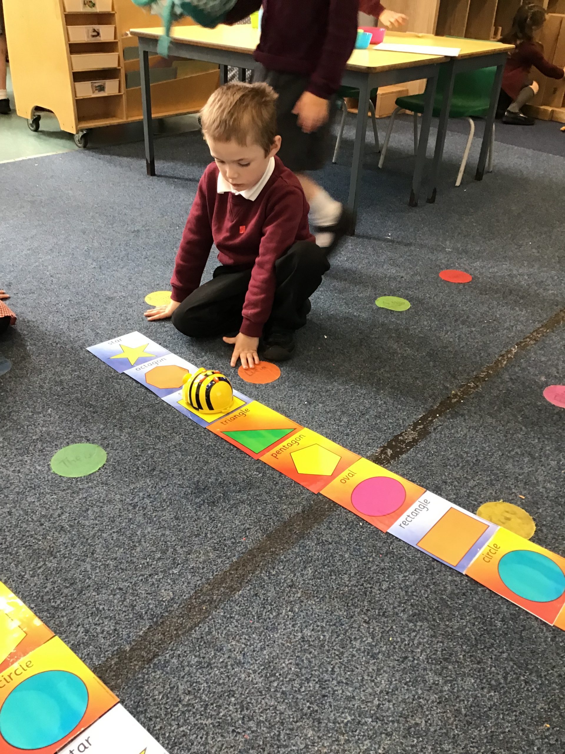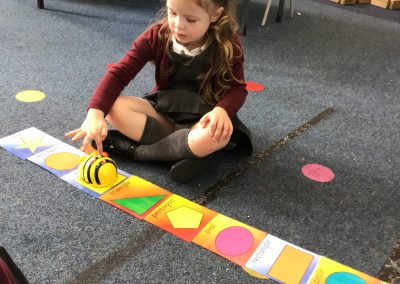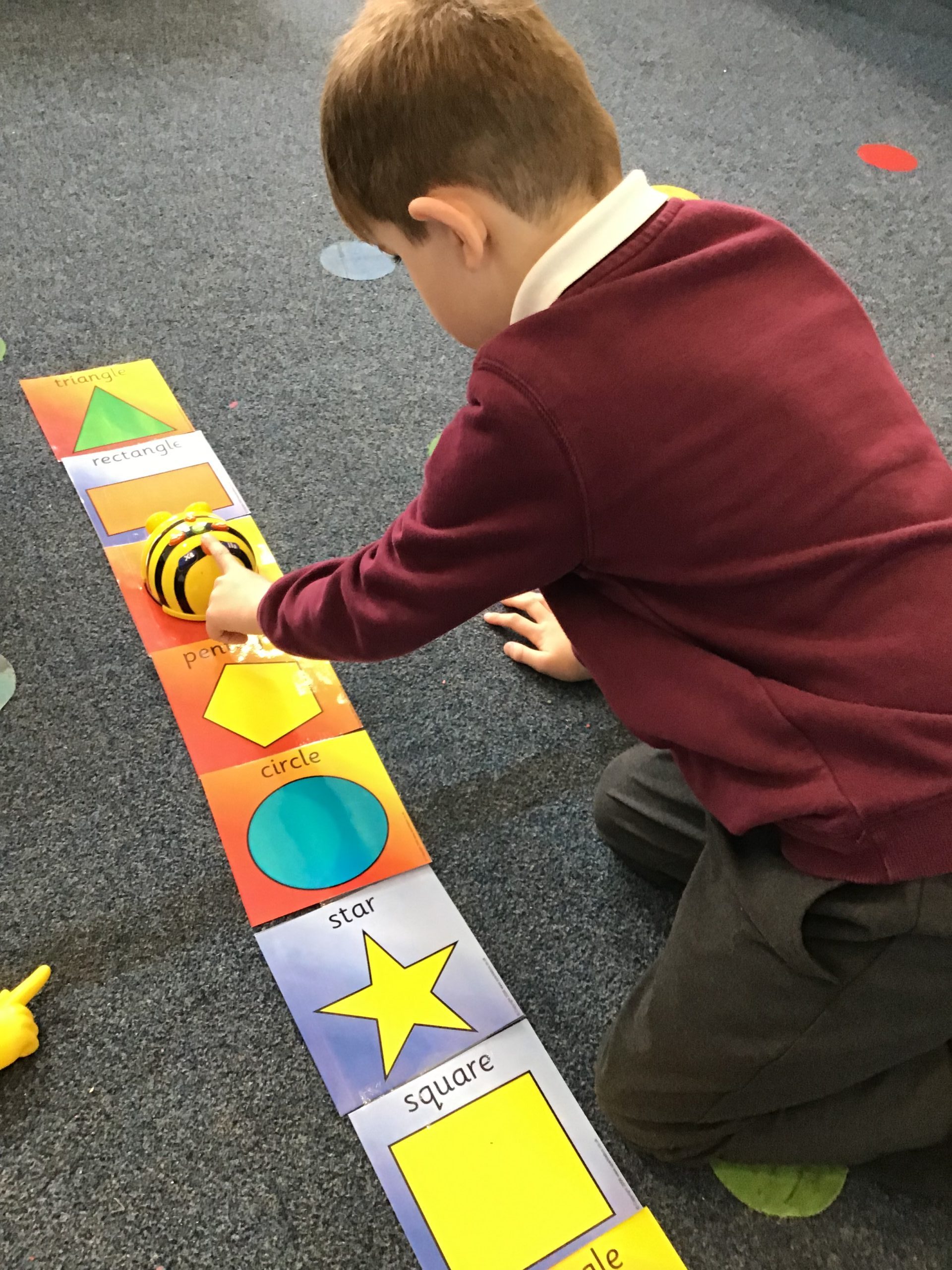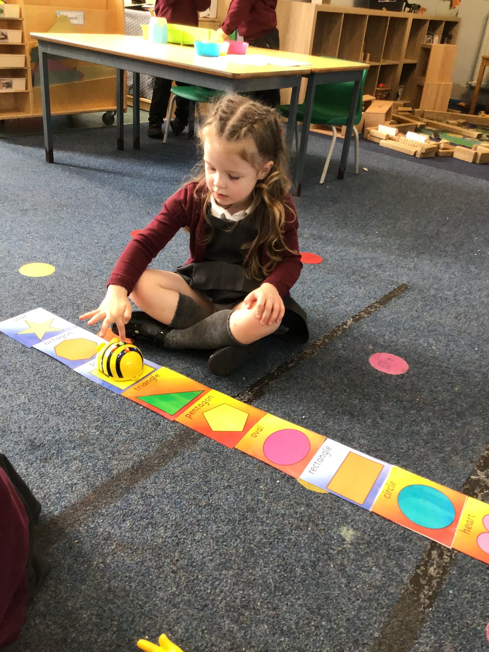 We have been exploring shape and space in Maths. The children can name lots of different 2D shapes. They had fun with the Beebots, using forwards and backwards commands to make them move to different shapes.