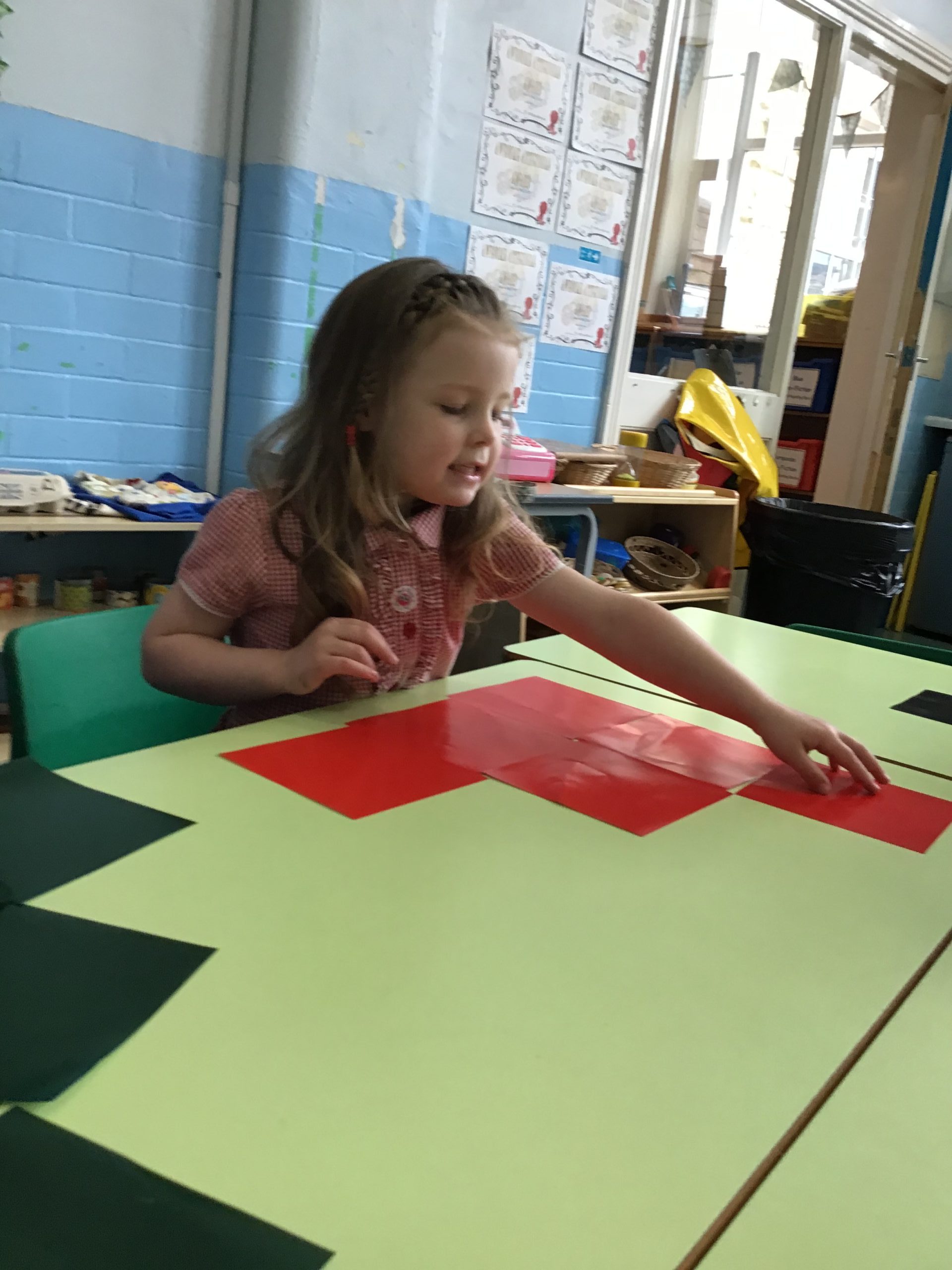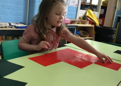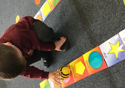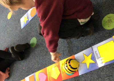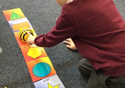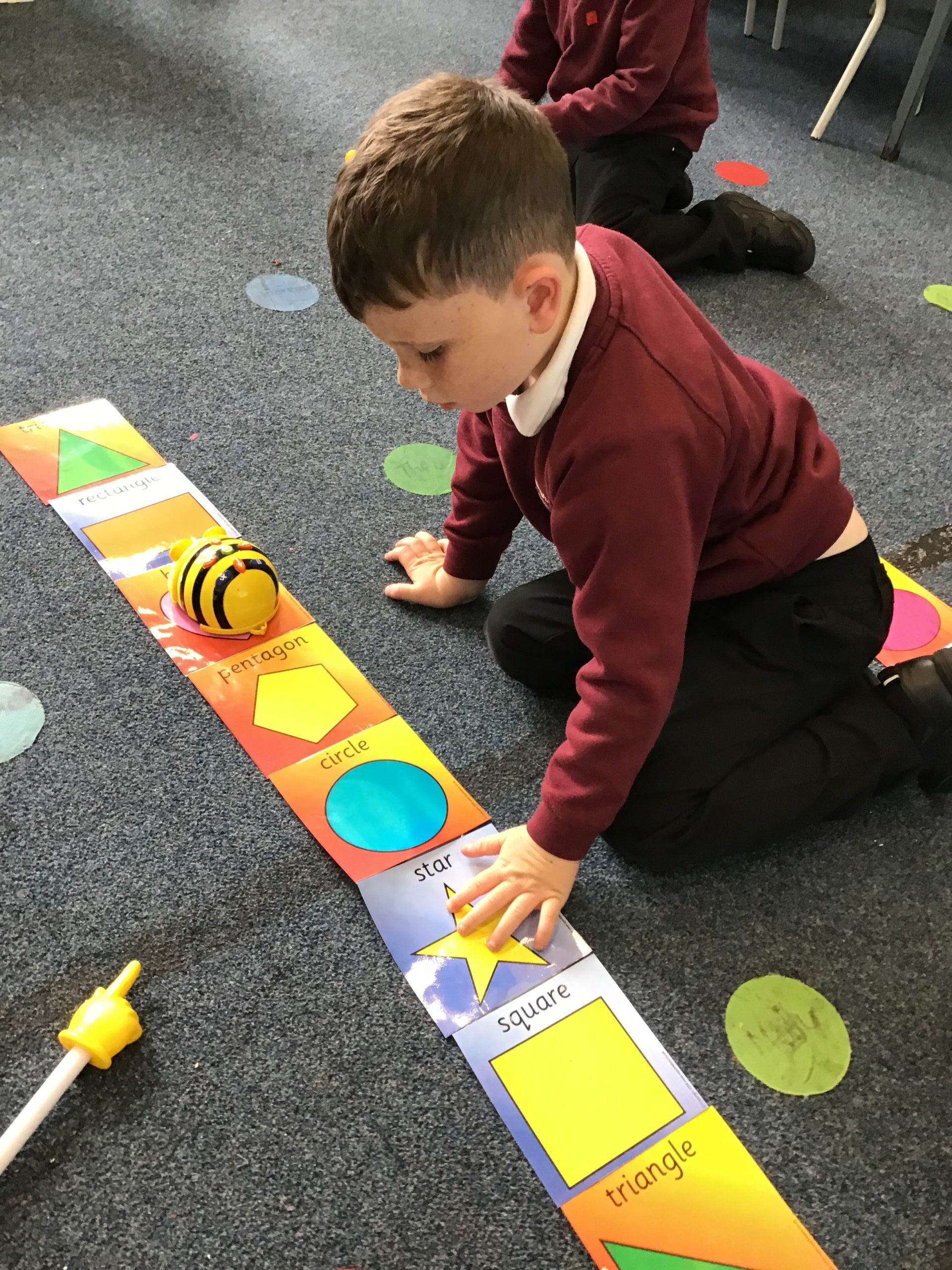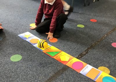 We have been exploring shape and space in Maths. The children can name lots of different 2D shapes. They had fun with the Beebots, using forwards and backwards commands to make them move to different shapes.