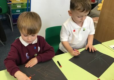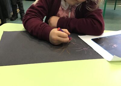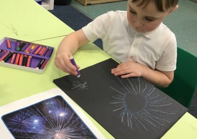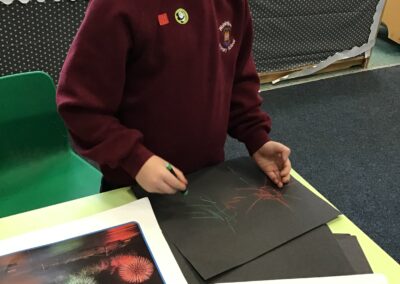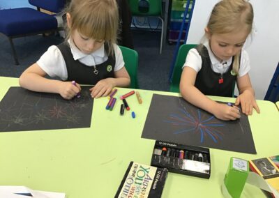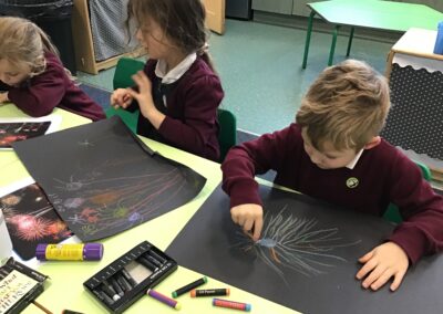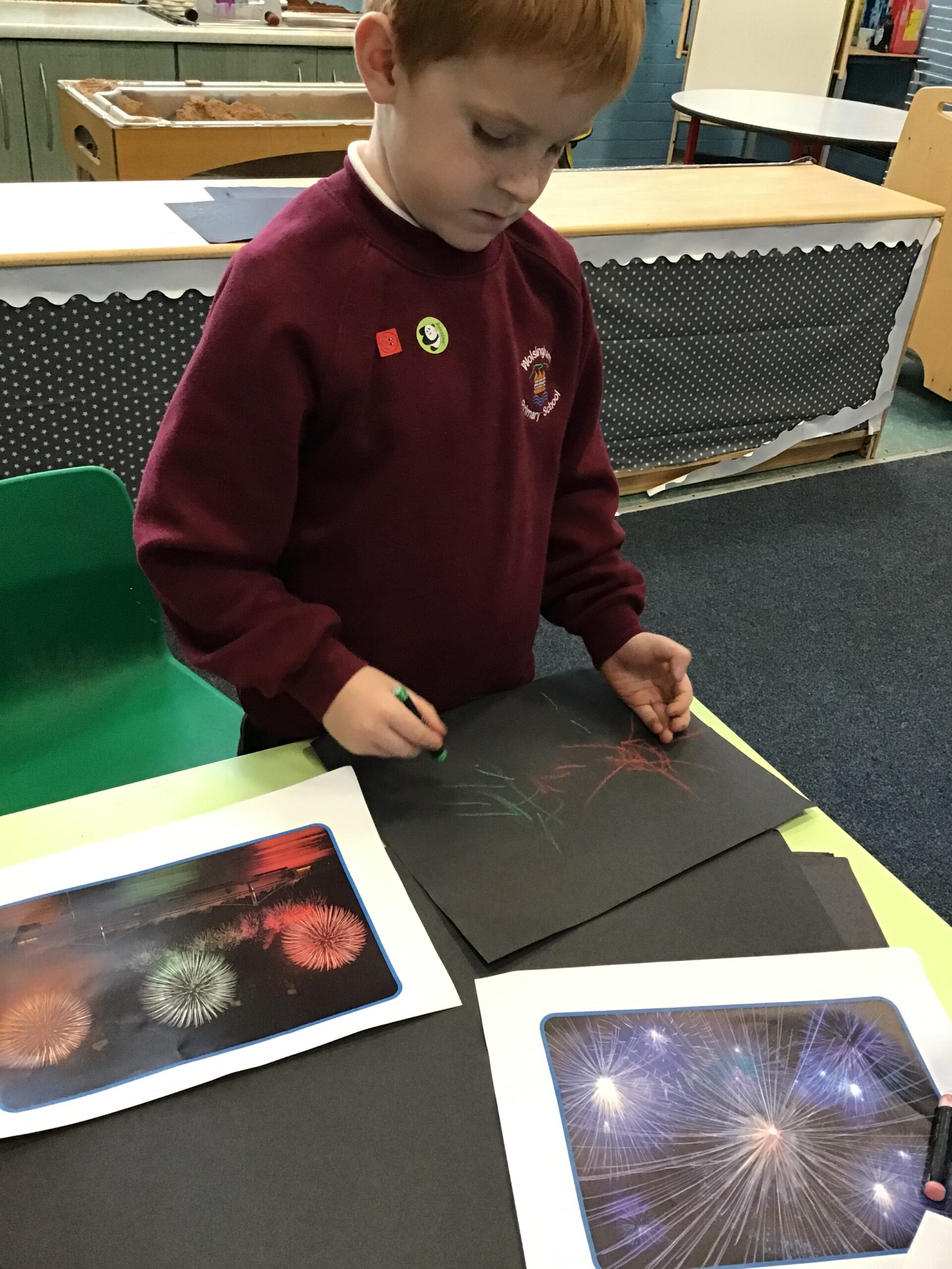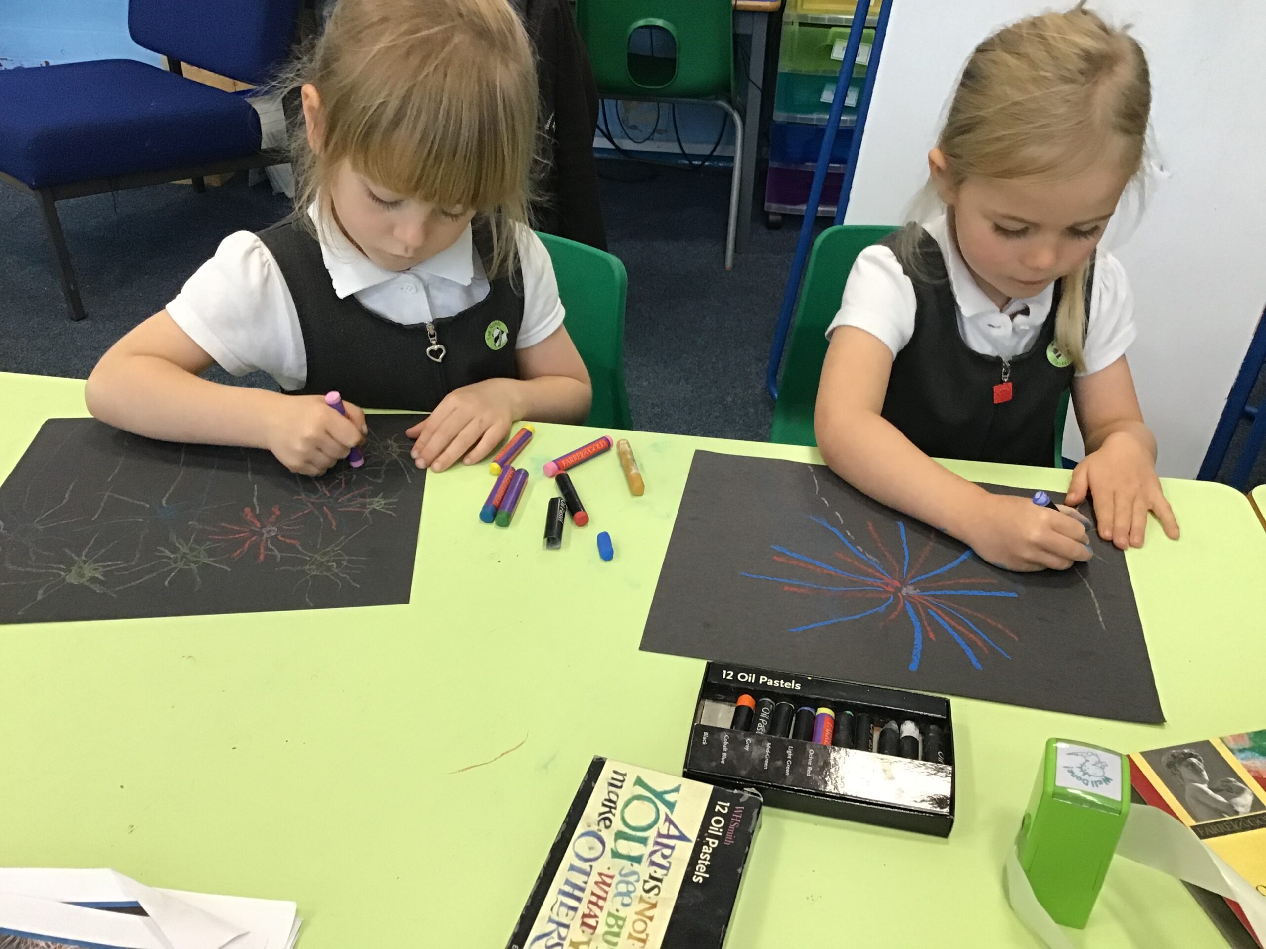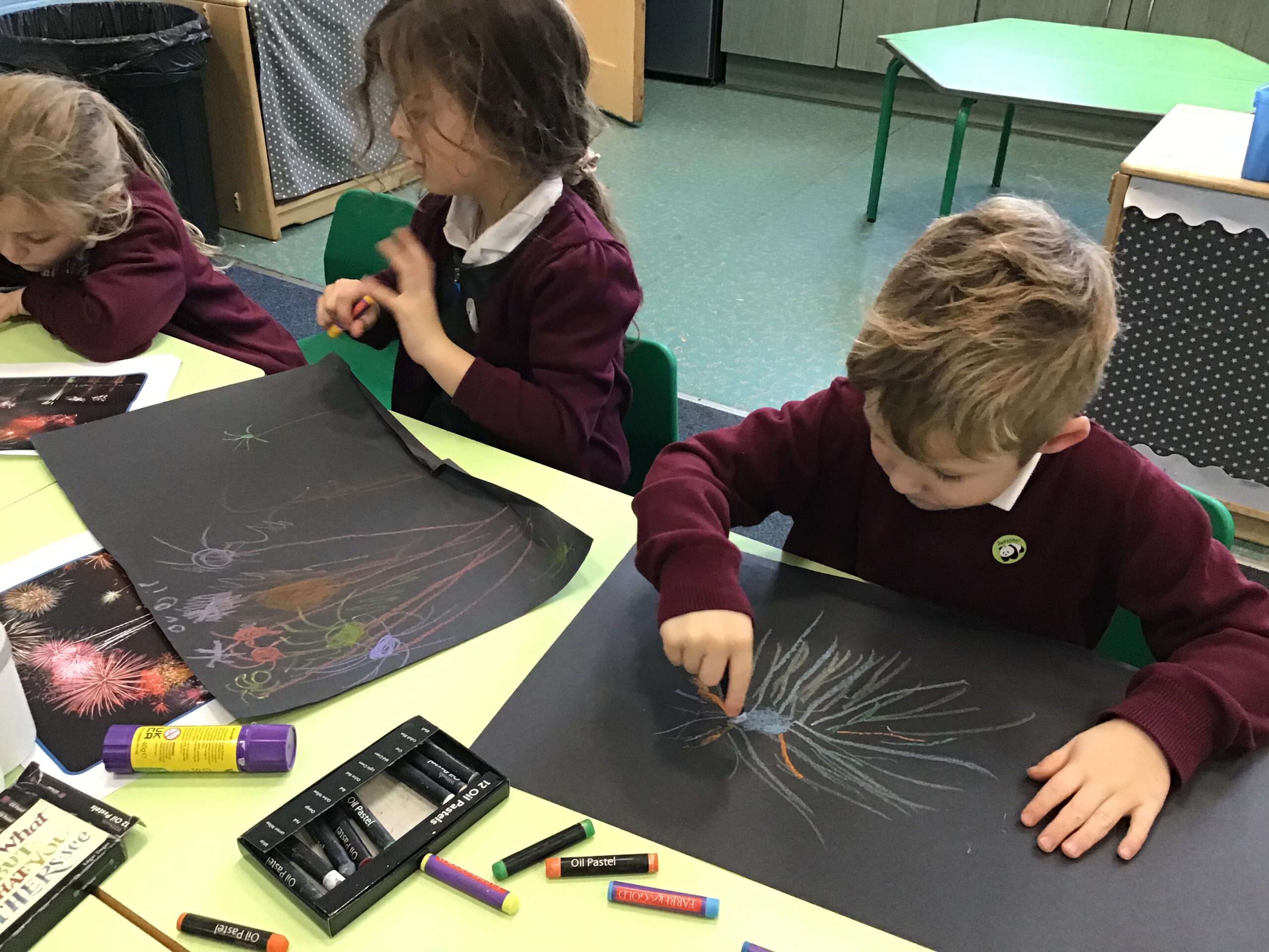 Reception Class enjoyed learning about Bonfire Night and why it is celebrated. The children talked about their own experiences of seeing fireworks, bonfires and holding sparklers. They used oil pastels to draw their own firework pictures, making sure the pictures were bright and colourful.