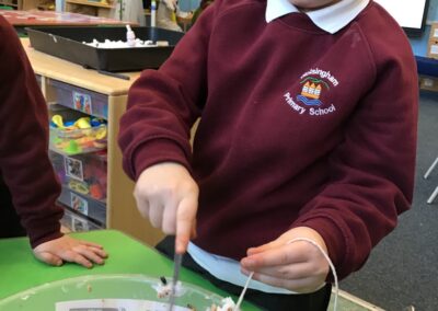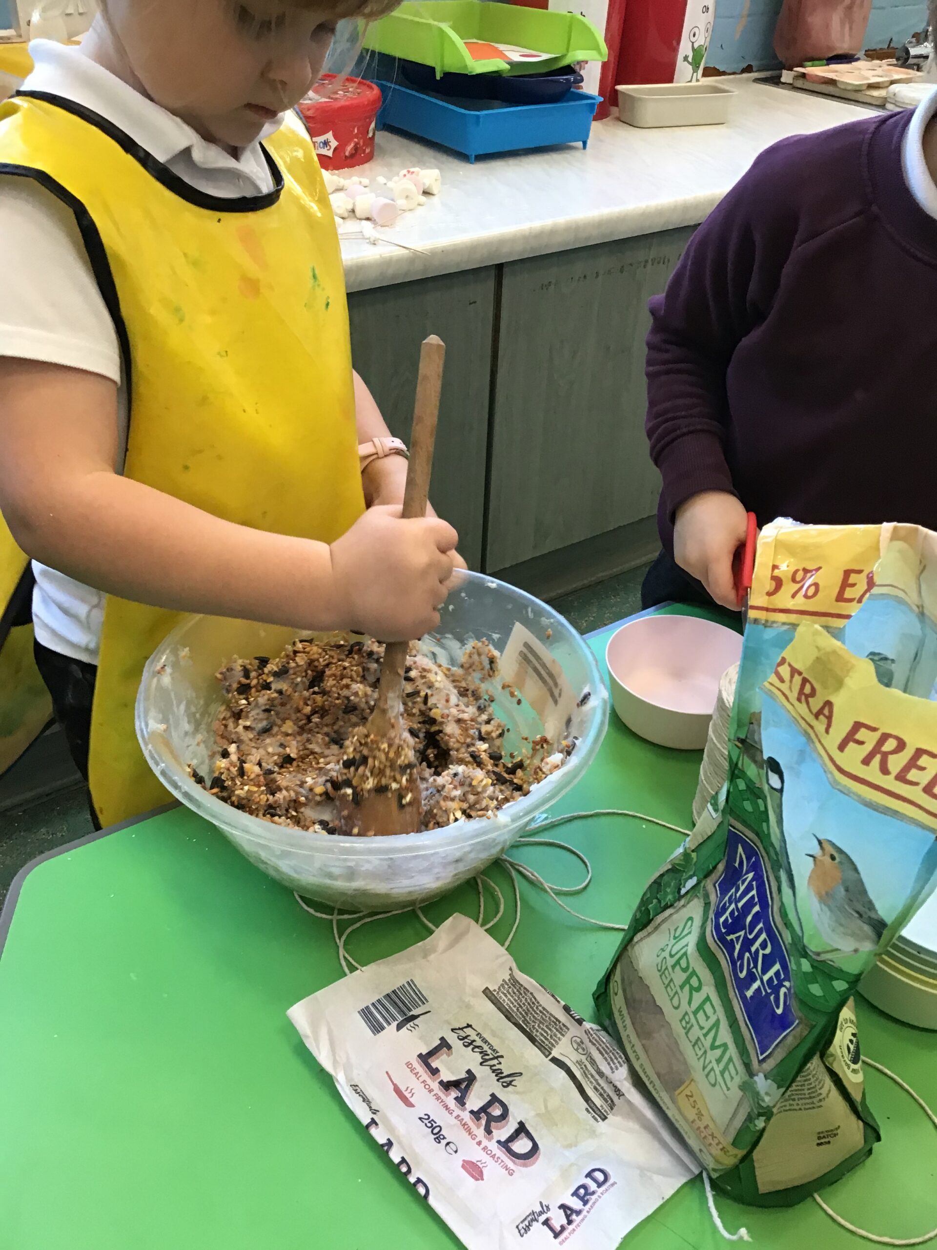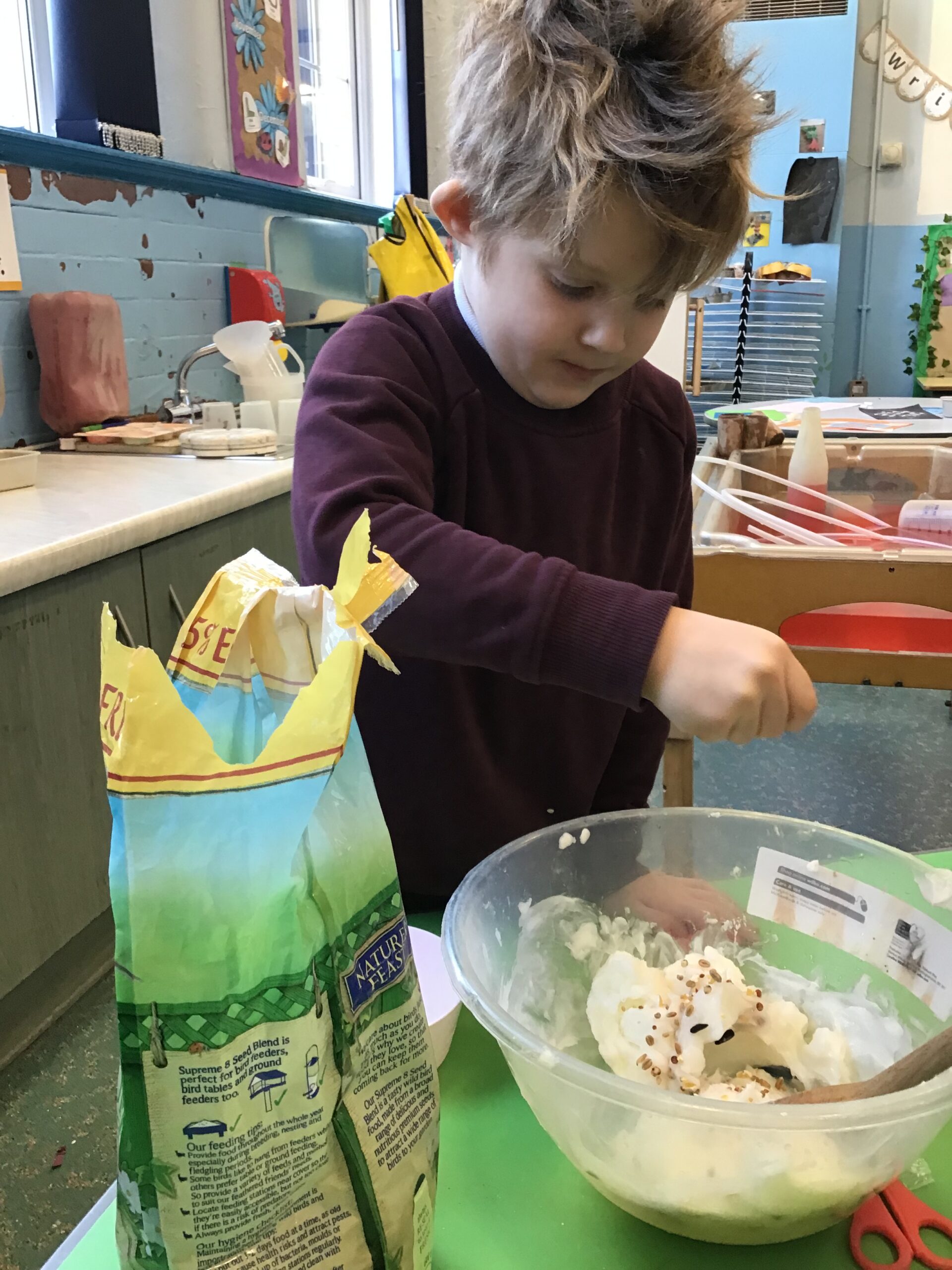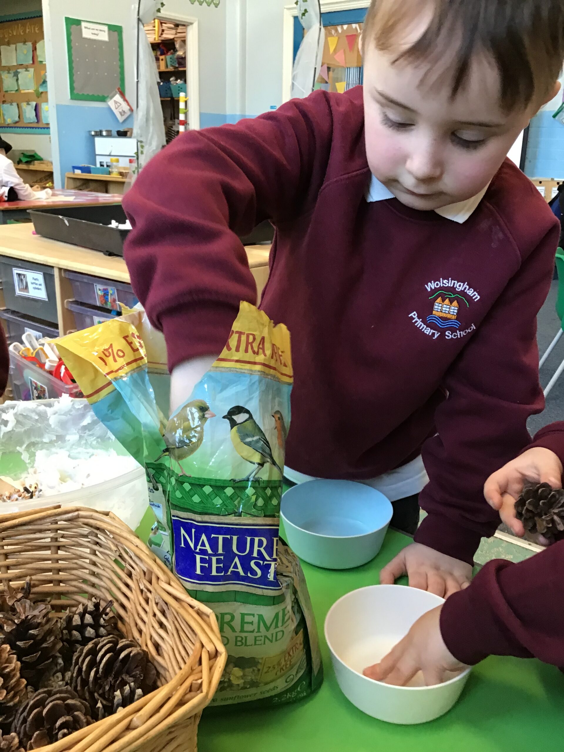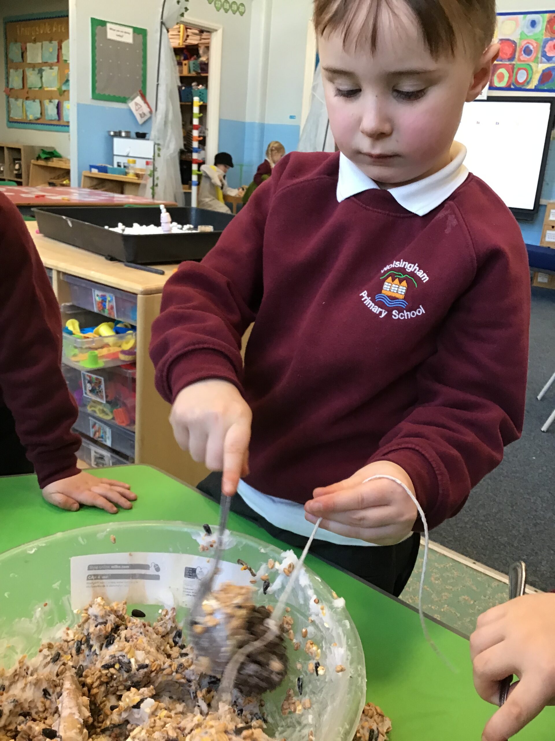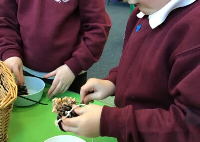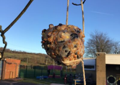 As part of our topic work on winter, we learnt about how the cold, icy weather makes life difficult for some animals, particularly birds. We decided to make some bird feeders and hang them up in the outdoor area to help the birds. We mixed some bird seed and lard together and then covered pine cones with the mixture. We put some string on the pine cones too so we could hang them up. The children enjoyed making the bird feeders and hanging them up on the trees and fences. Hopefully we will see lots of birds visiting the outdoor area and enjoying the food.