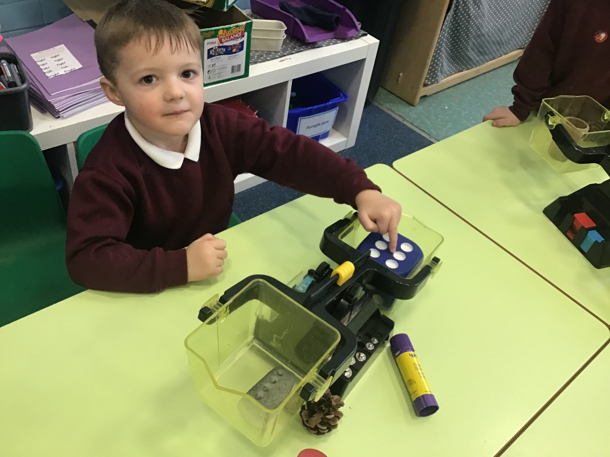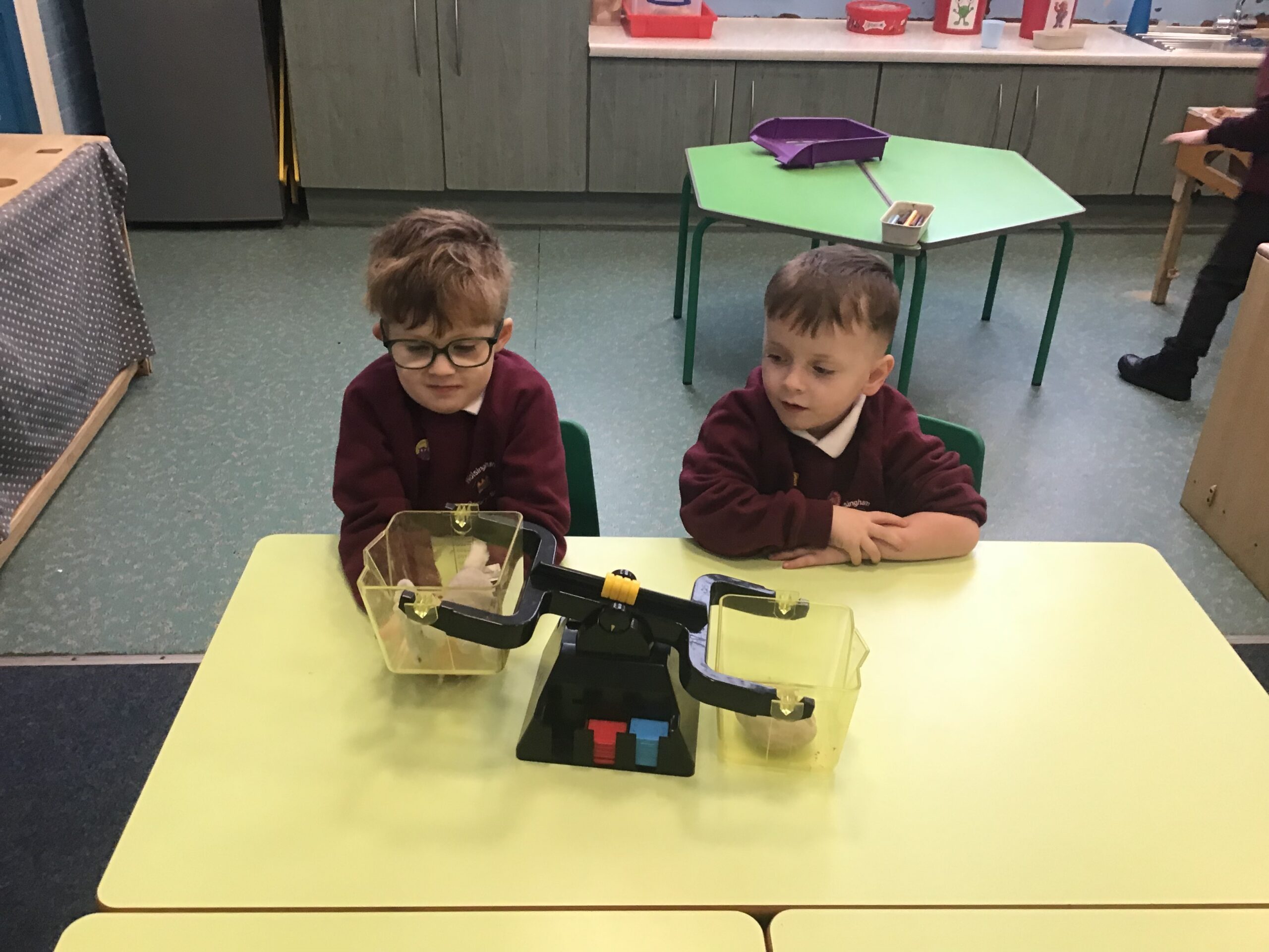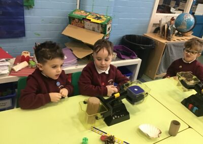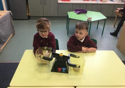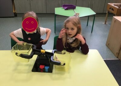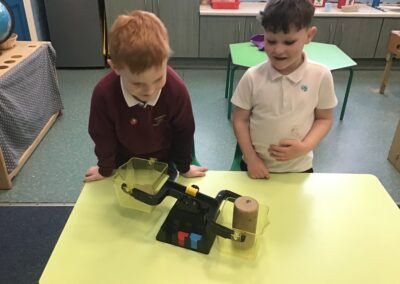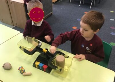 In maths we did some measuring work and used balance scales to compare the mass of two objects. The children knew that the object that went down was heavier than the object that went up. They worked with a partner and chose items from the classroom, working out whether an item was heavier or lighter.