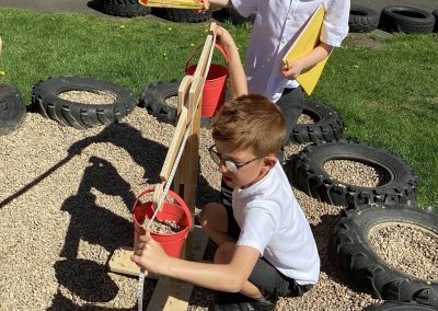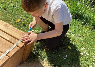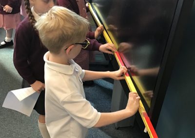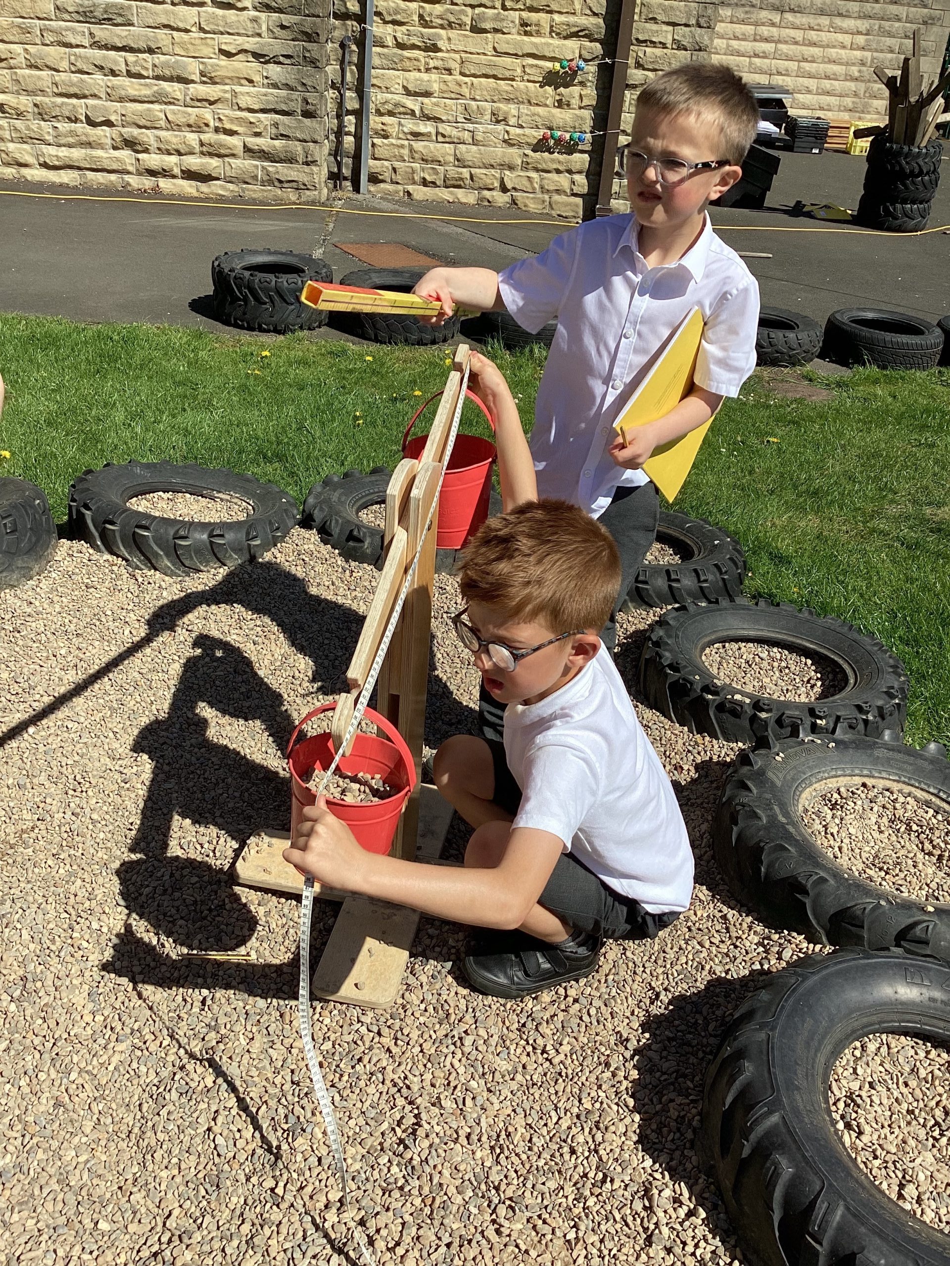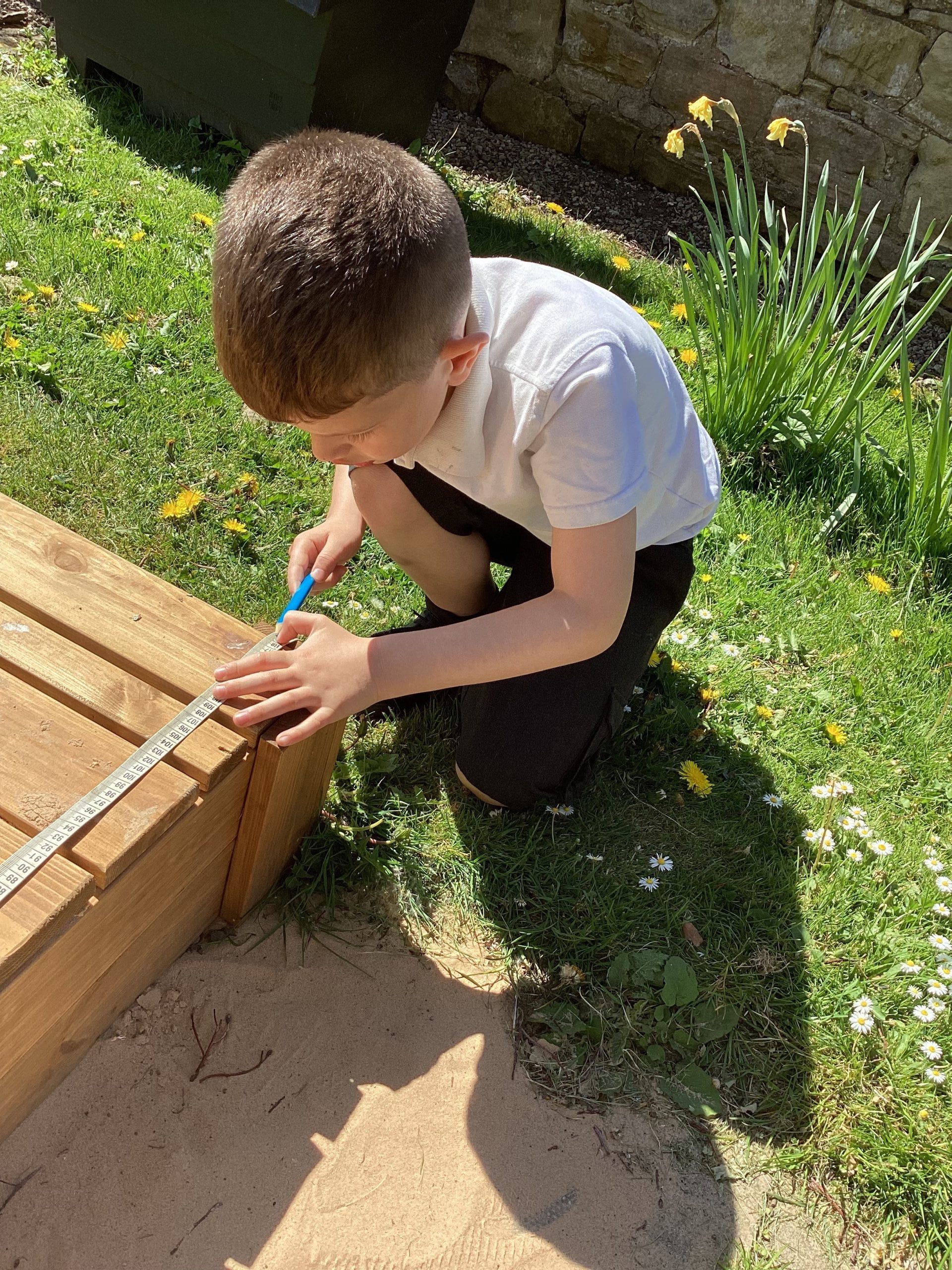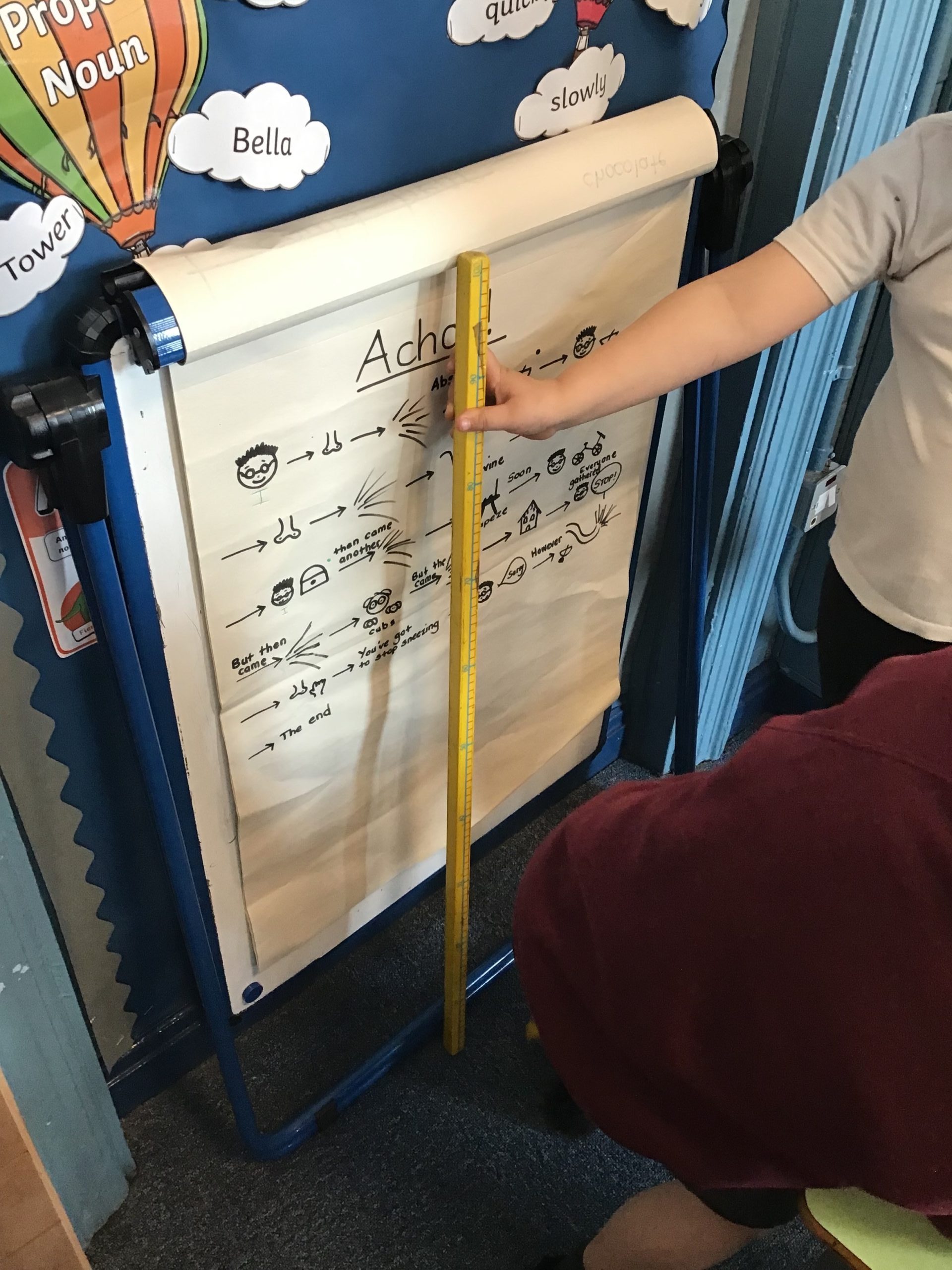 In maths today, we used metre sticks, tape measures and trundle wheels to measure different lengths. We talked about what each piece of equipment would be best suited to measure and then set off around the classroom and outside measuring different objects including chairs, doors, plant pots and even the length of the yard.