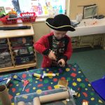 In nursery we spent the week talking about pirates, pirate ships and shipwrecks. The children enjoyed staining paper with coffee to make their own authentic pirate treasure maps, they made biscuit treasure coins, practised subitising with pirate coins, made telescopes and even walked the plank, into a pool full of crocodiles!