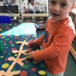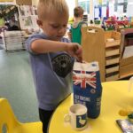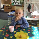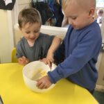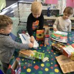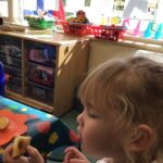 In nursery we have been learning all about harvest and the role farmers play in this. We made scarecrow pictures, practicing tearing paper, played co-operation shopping games, learning to take turns, followed positional language instructions when playing with the farm animals, weighed grain exploring heavy and light, cut Weetabix with tools and made our own bread.