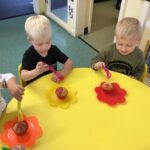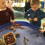 Nursery children have been learning all about Autumn including the changes that happen in the Autumn. They went for a walk to collect conkers and leaves, noticing lots of differences between the different shapes and coloured leaves, after sorting them into categories. The natural items they collected then turned into artwork, creating leaf rubbing pictures, and natural art picture frames outside. The children enjoyed rolling the conkers down the guttering, measuring to see who’s travelled the furthest.