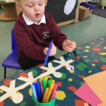 We have been learning about knights and castles so this week we had a St George’s Day party. Some children came dressed up. We even had a dragon! We drew castles, made St George’s flags and pretended to be knights. We made our own jam sandwiches and decorated a cake to have for out St George’s Day banquet. It was great fun, especially eating our food and playing with swords as knights.