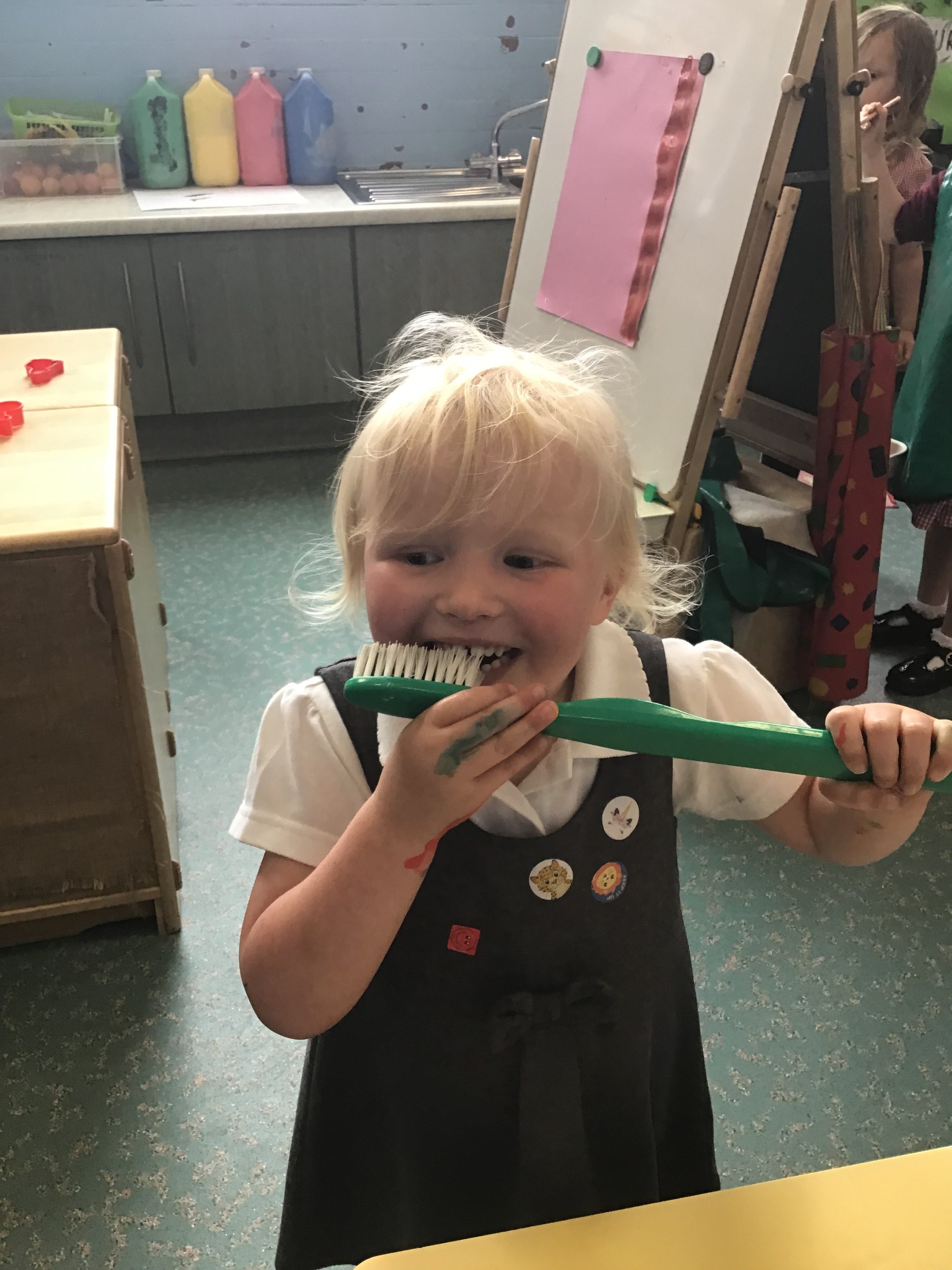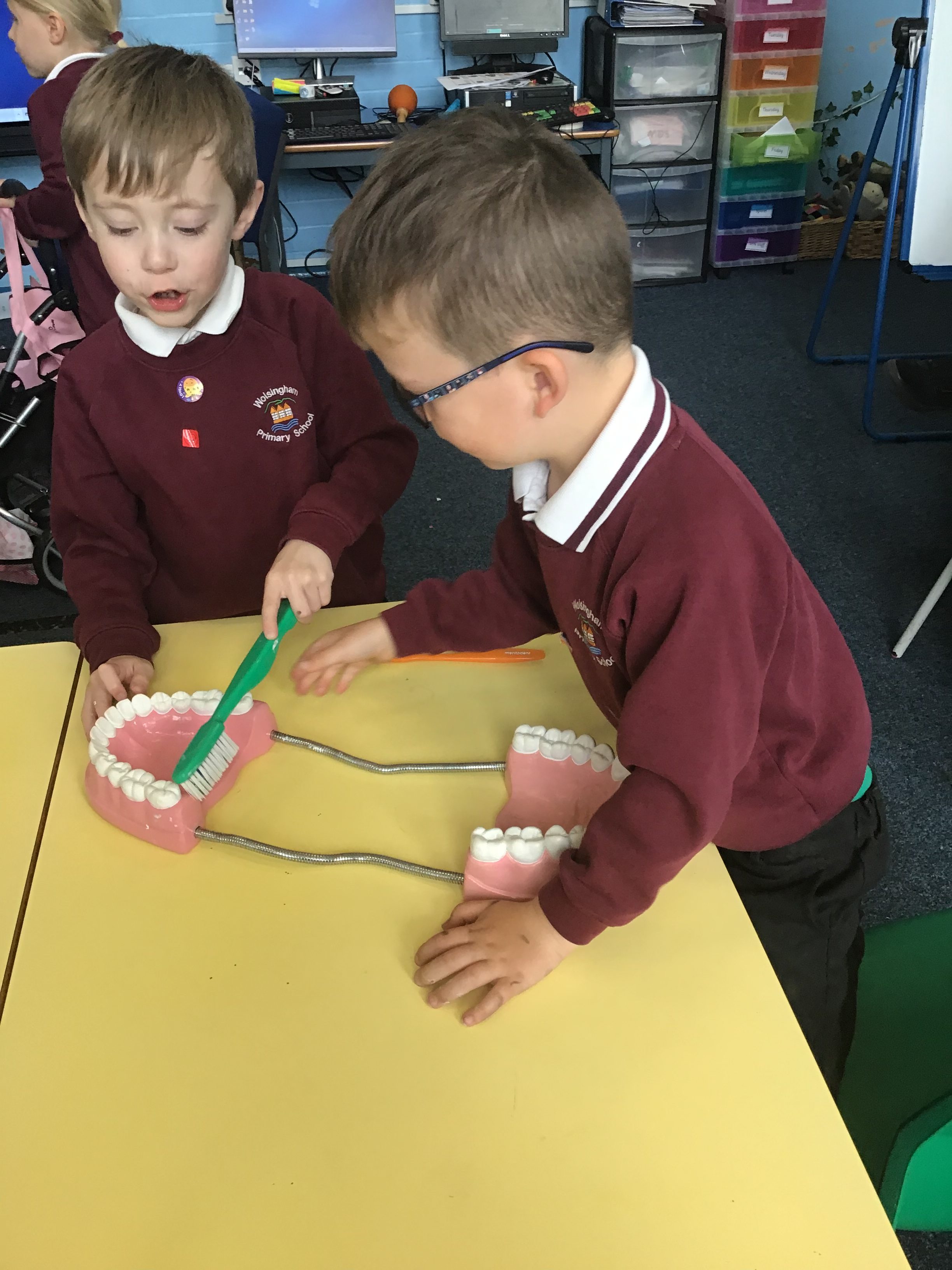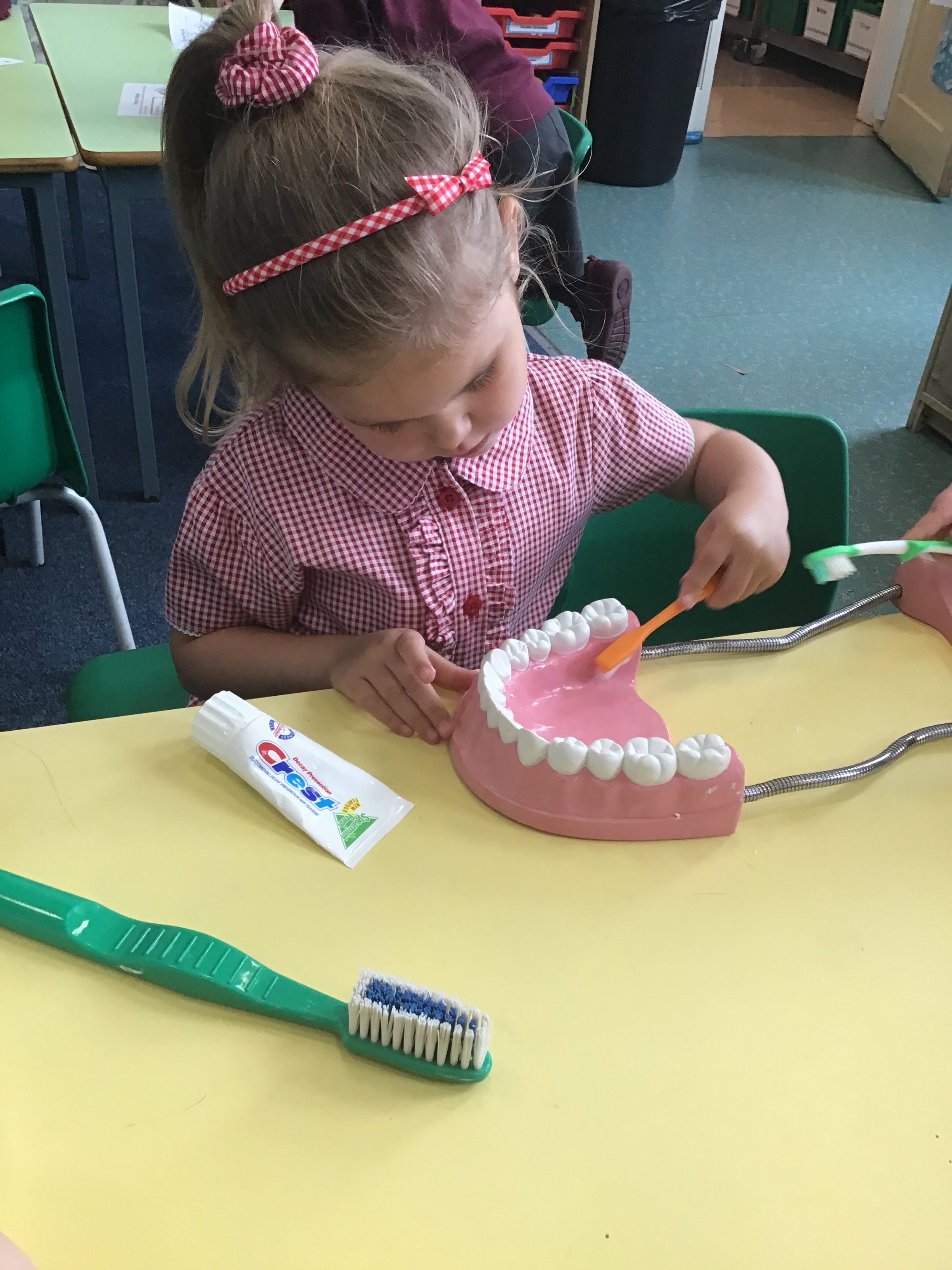 Reception Class learnt about how dentists help us and the importance of looking after our teeth. They know it is important to clean their teeth twice a day and to go to the dentist regularly for check-ups. The children enjoyed using the large model teeth and toothbrush to practise cleaning teeth.