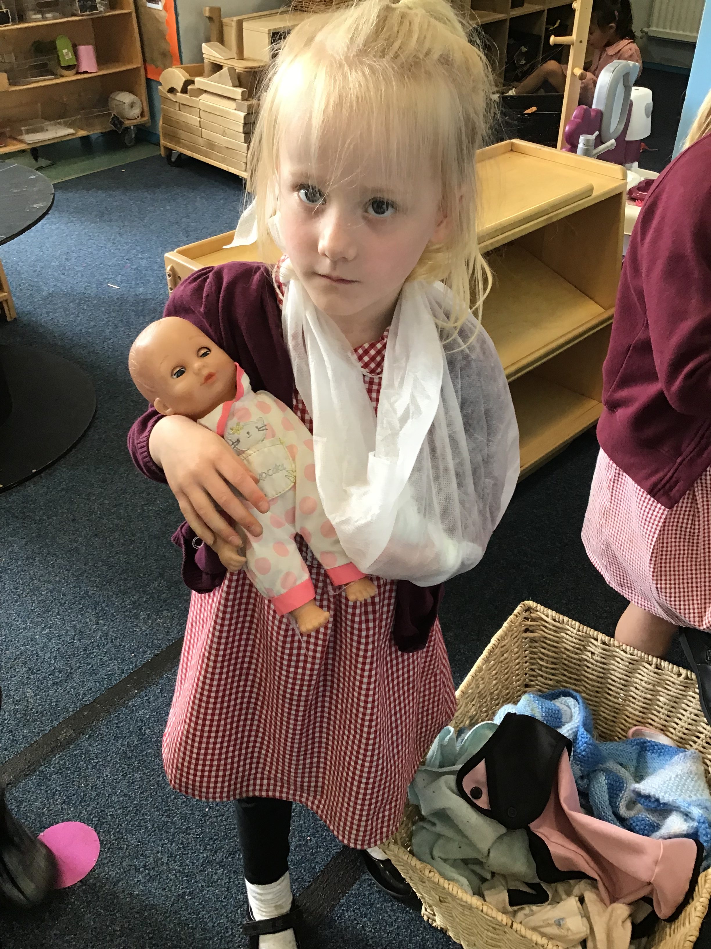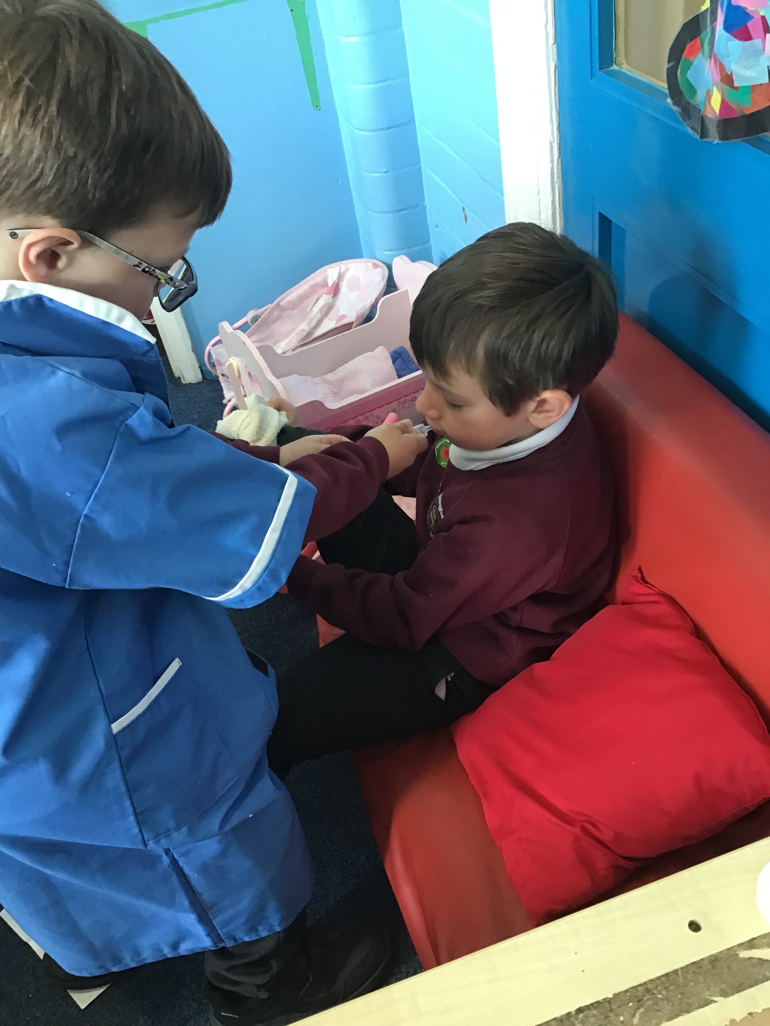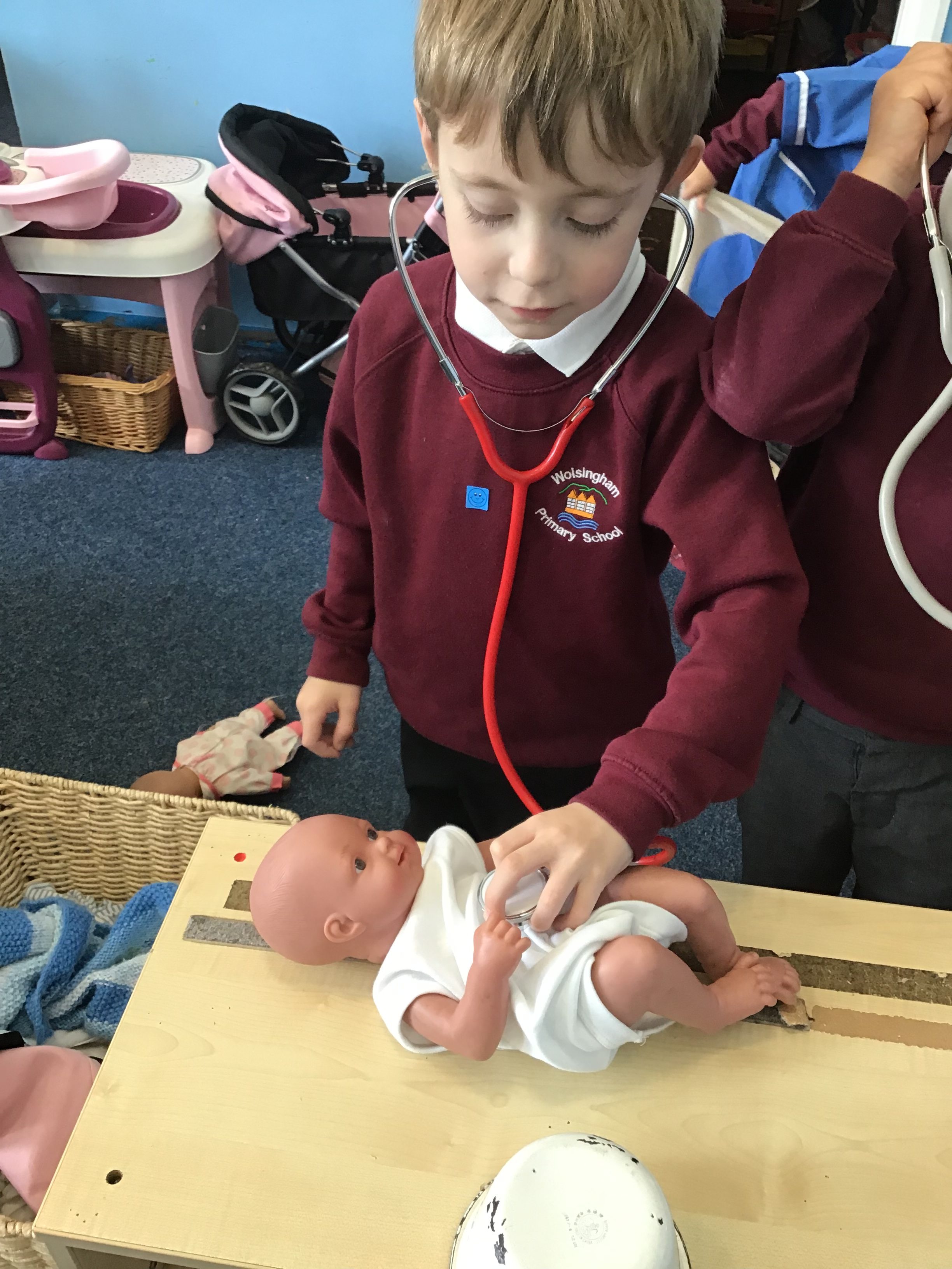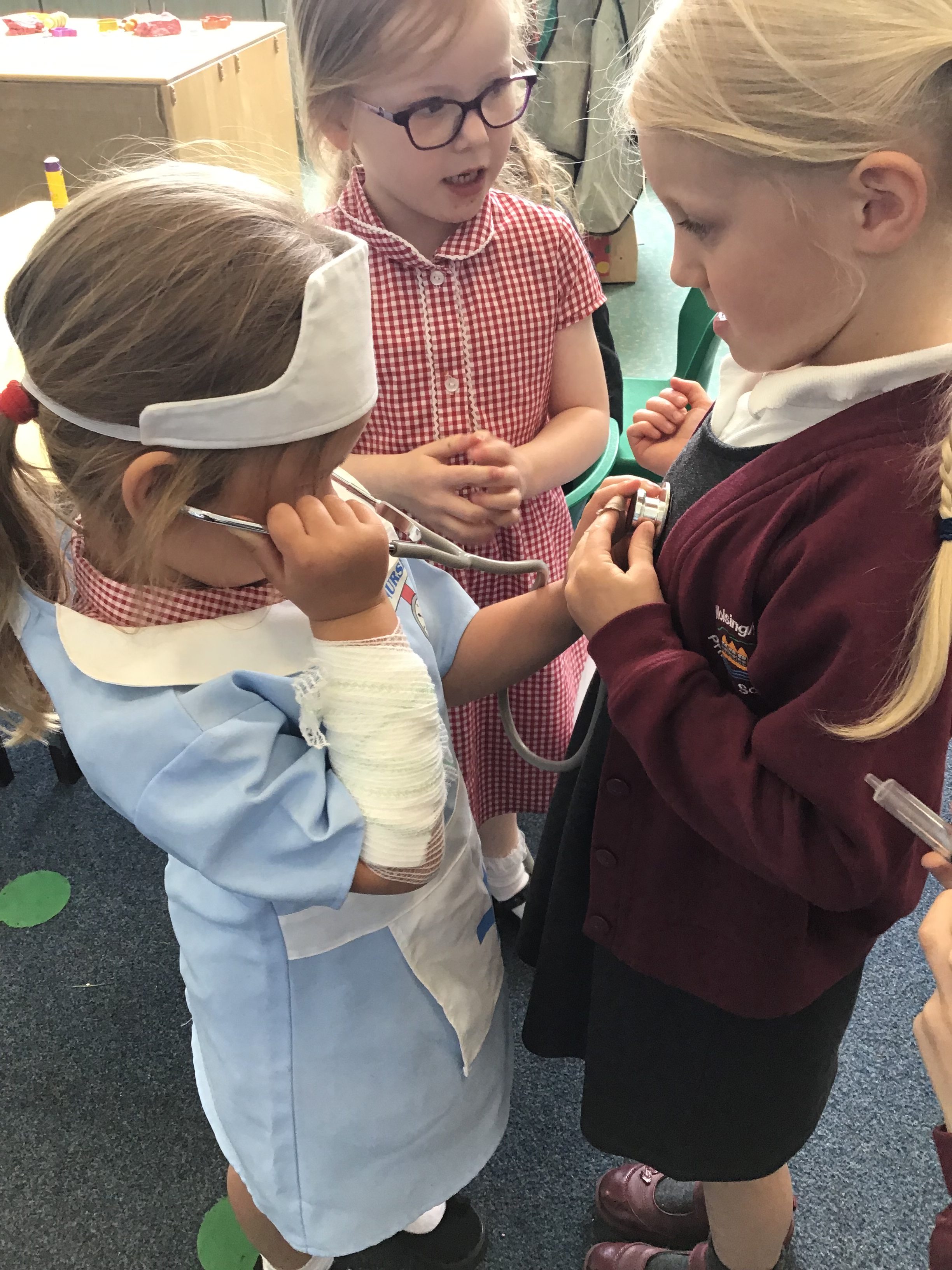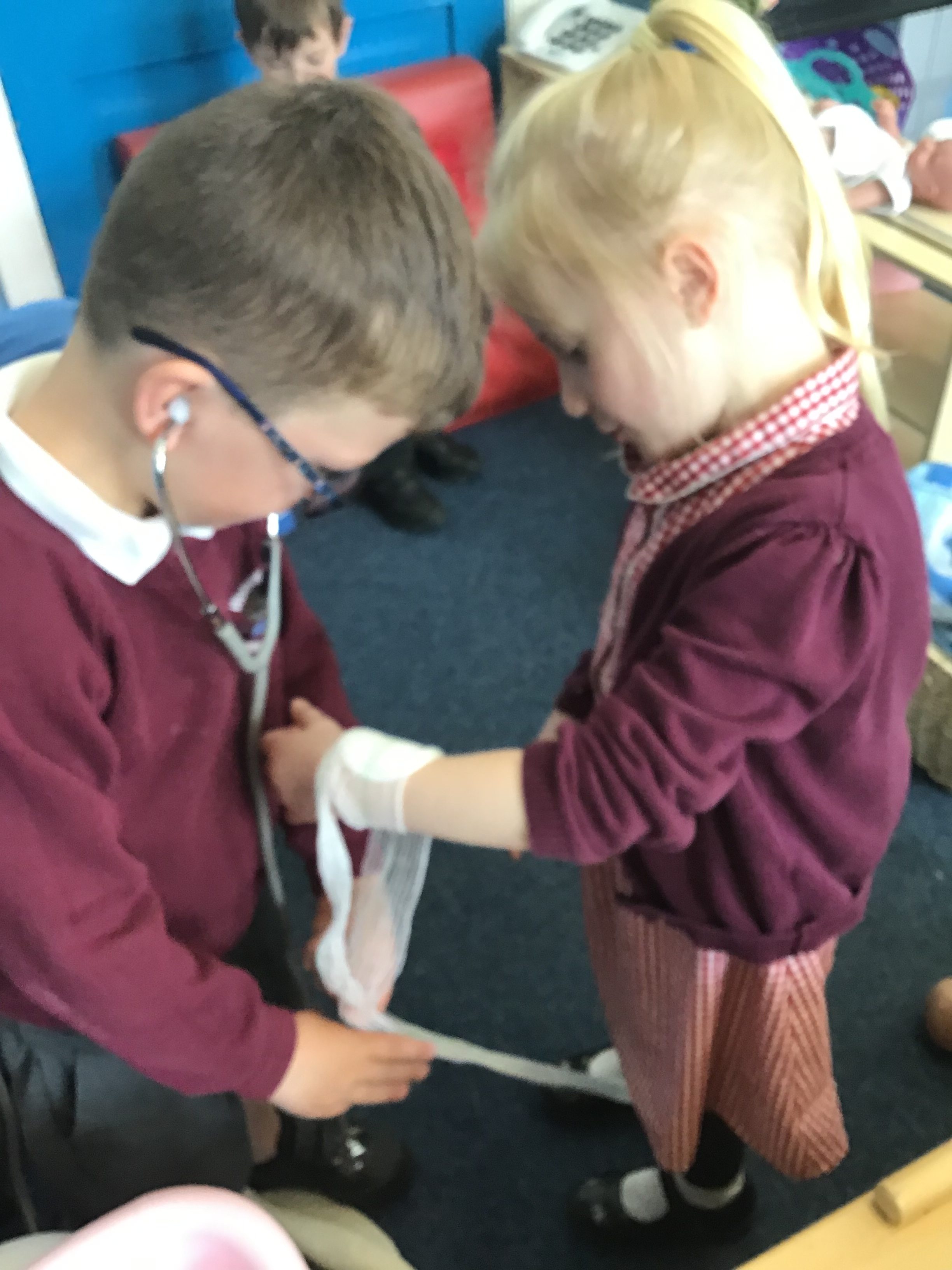 As part of the topic ‘People Who Help Us’, Reception Class learnt about doctors and nurses and how they help people. In the role play area they looked at x-rays, used stethoscopes and thermometers, and practised putting bandages on people. They talked about making an appointment to go and see the GP if they were ill and about going to hospital for x-rays and operations.