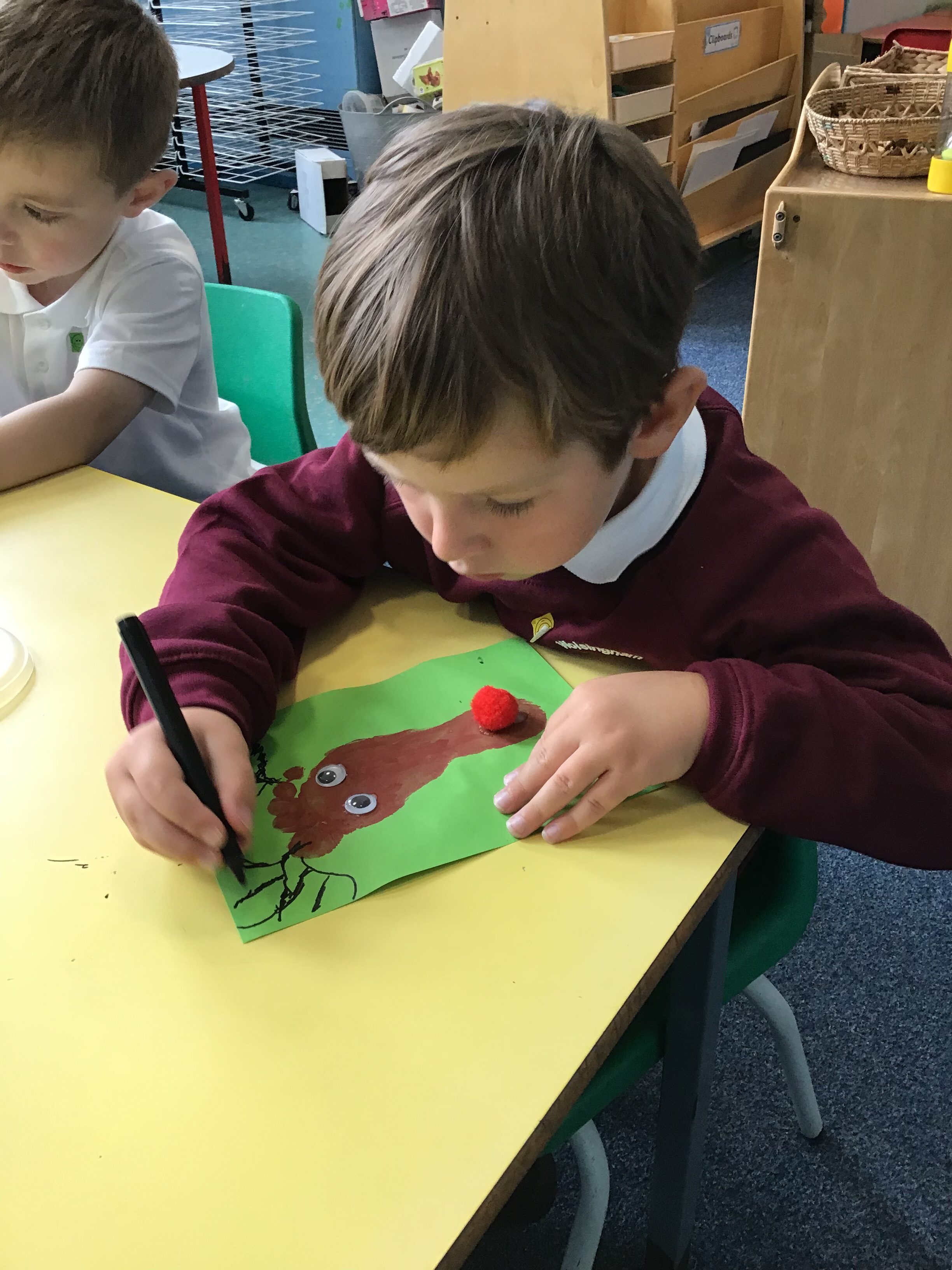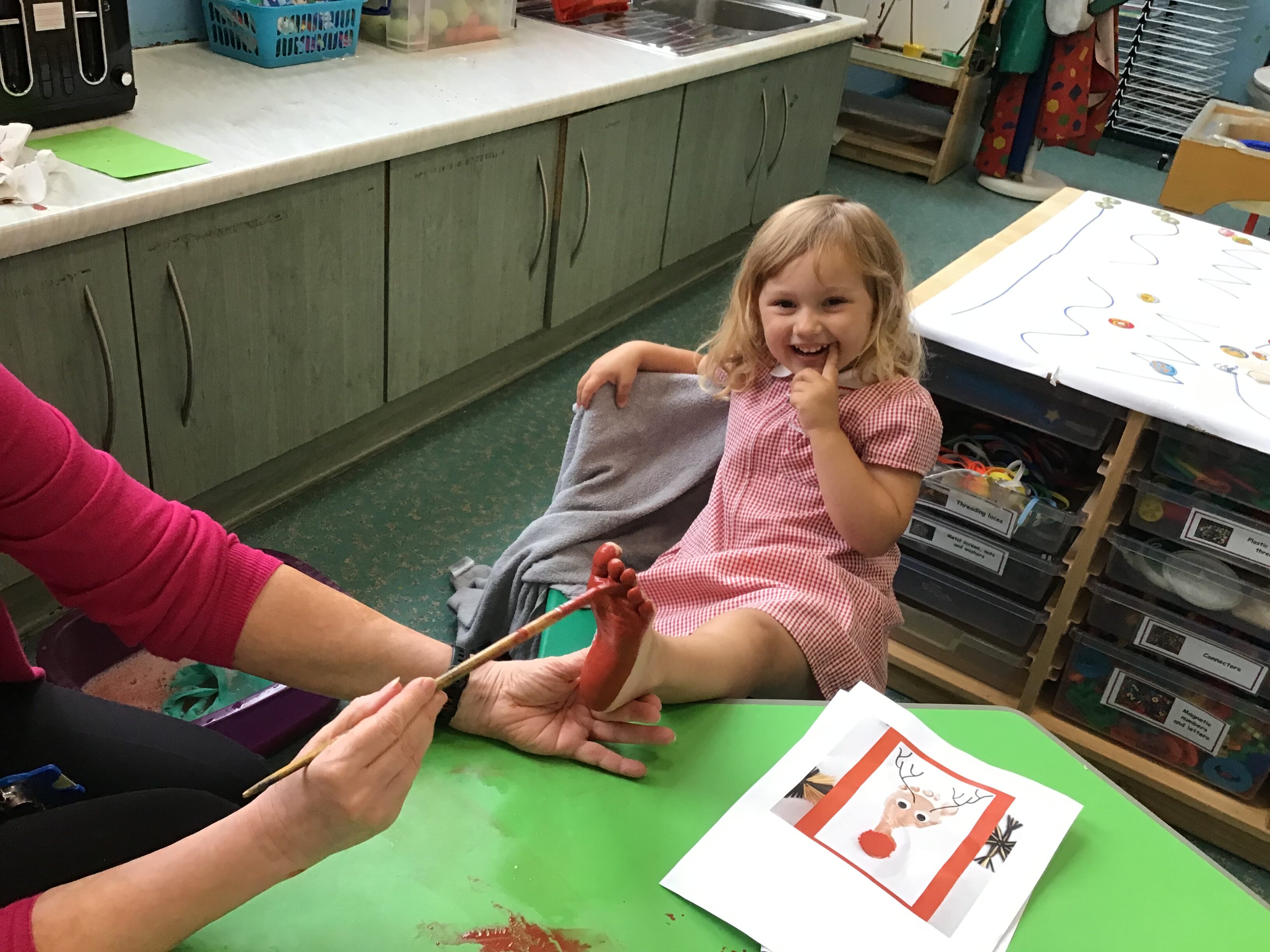 Some of the children found it very ticklish having their feet painted! They stuck on eyes and a red nose before showing their mark-making skills when drawing on the antlers.