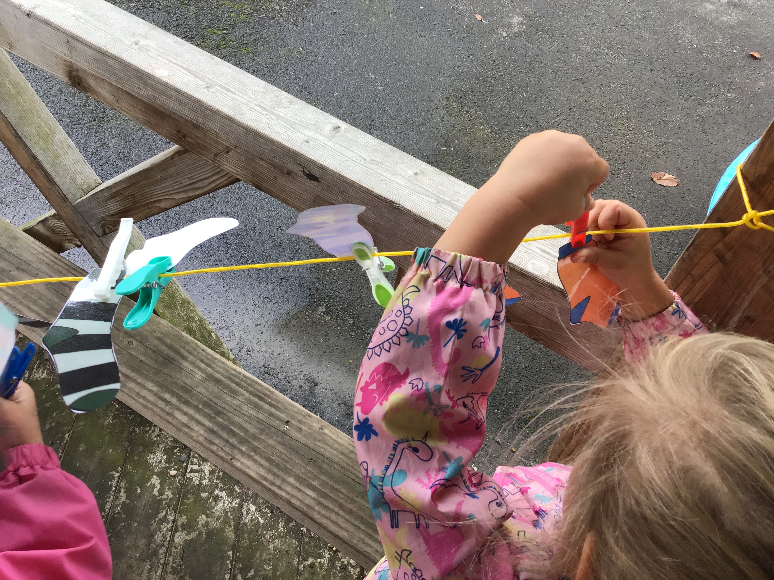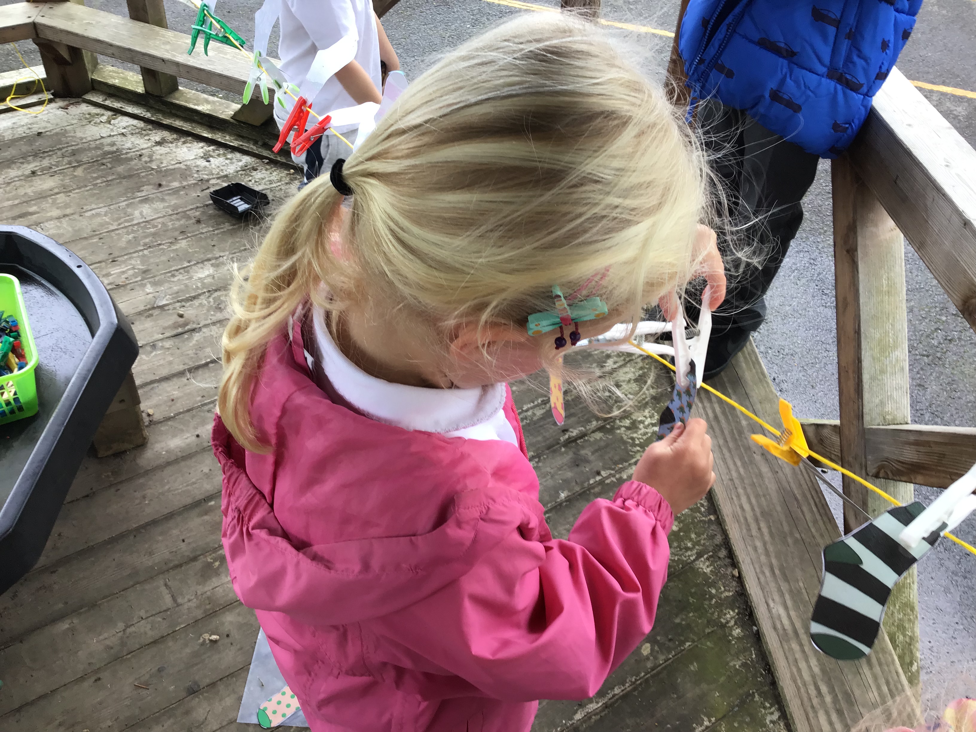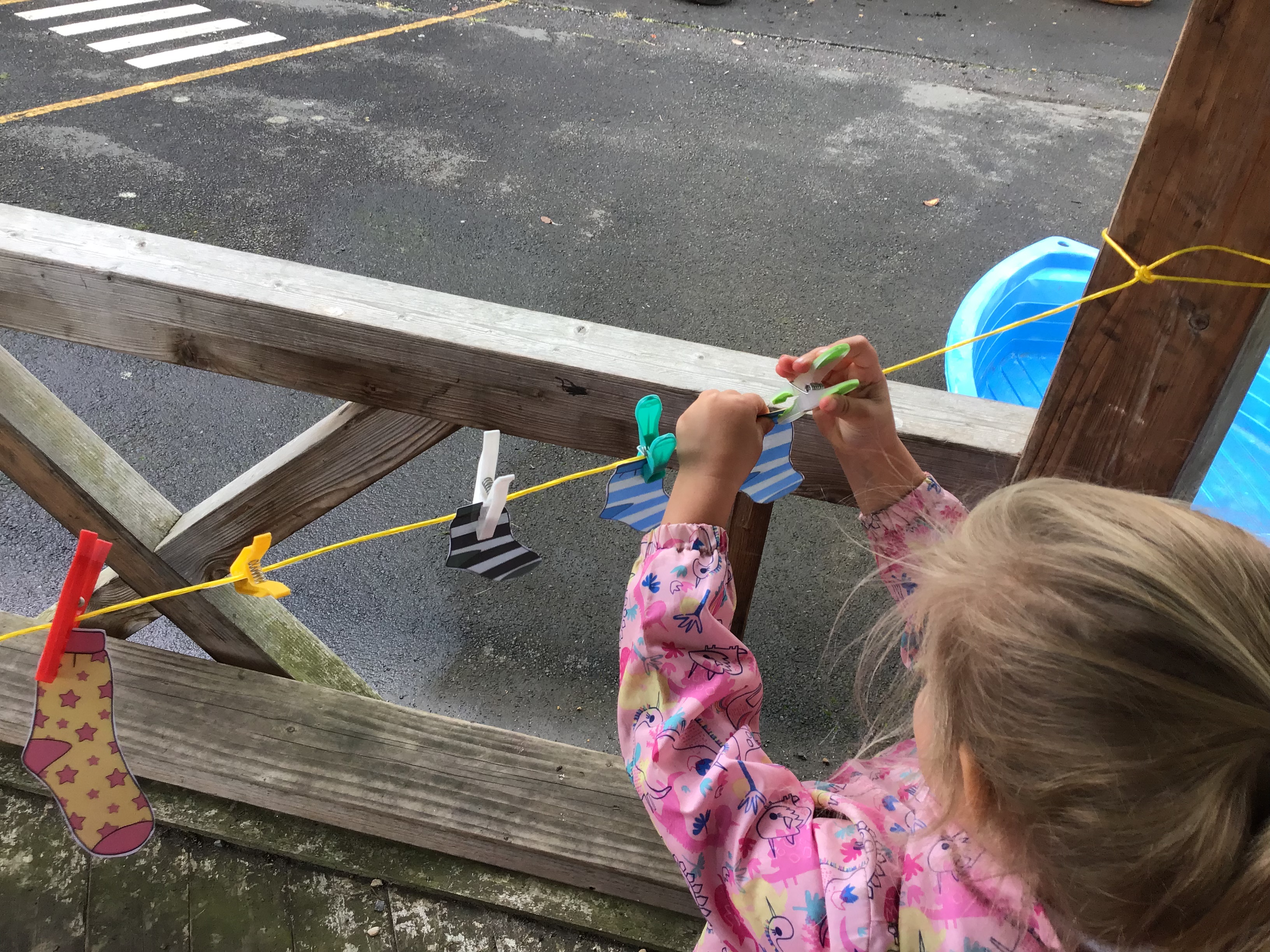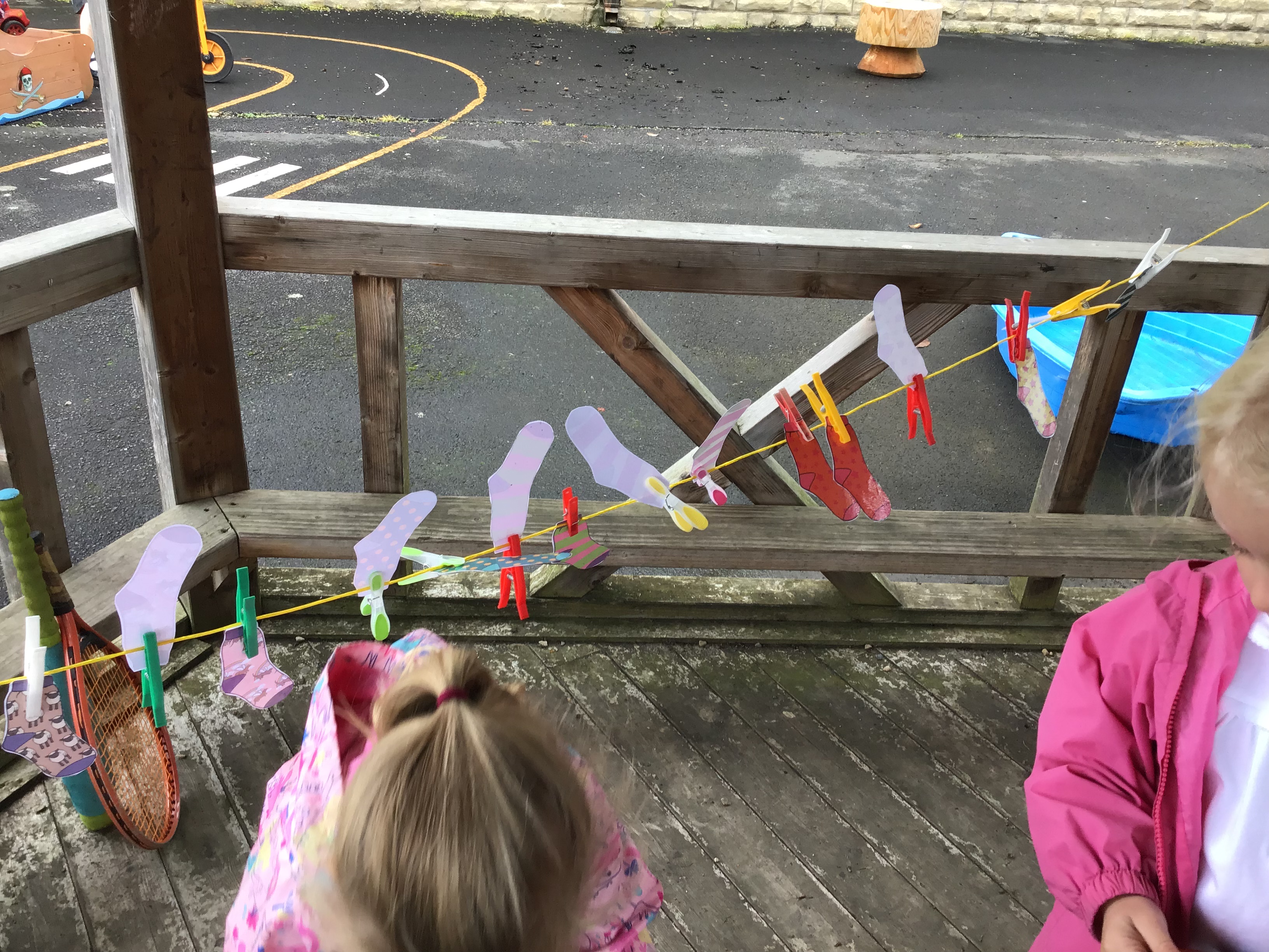 A lot of Maths in Early Years is based on the children noticing things. We are focusing on finding things that are the same. The children helped Miss Stoker sort the mixed-up socks. When they found 2 socks the same they hung them on the washing line (using pegs is very good for their fine motor skills and will help to build the strength in their fingers ready for writing).