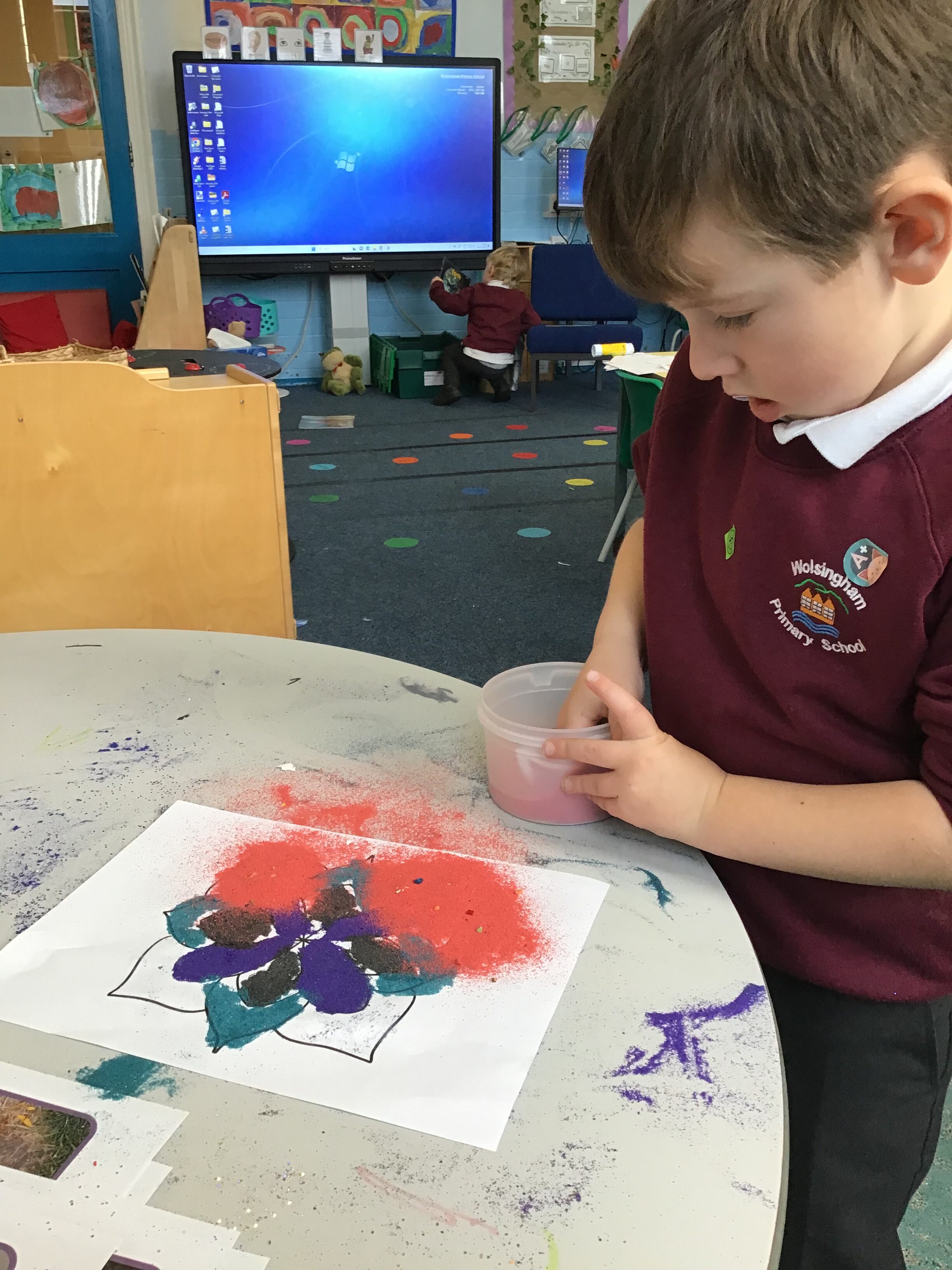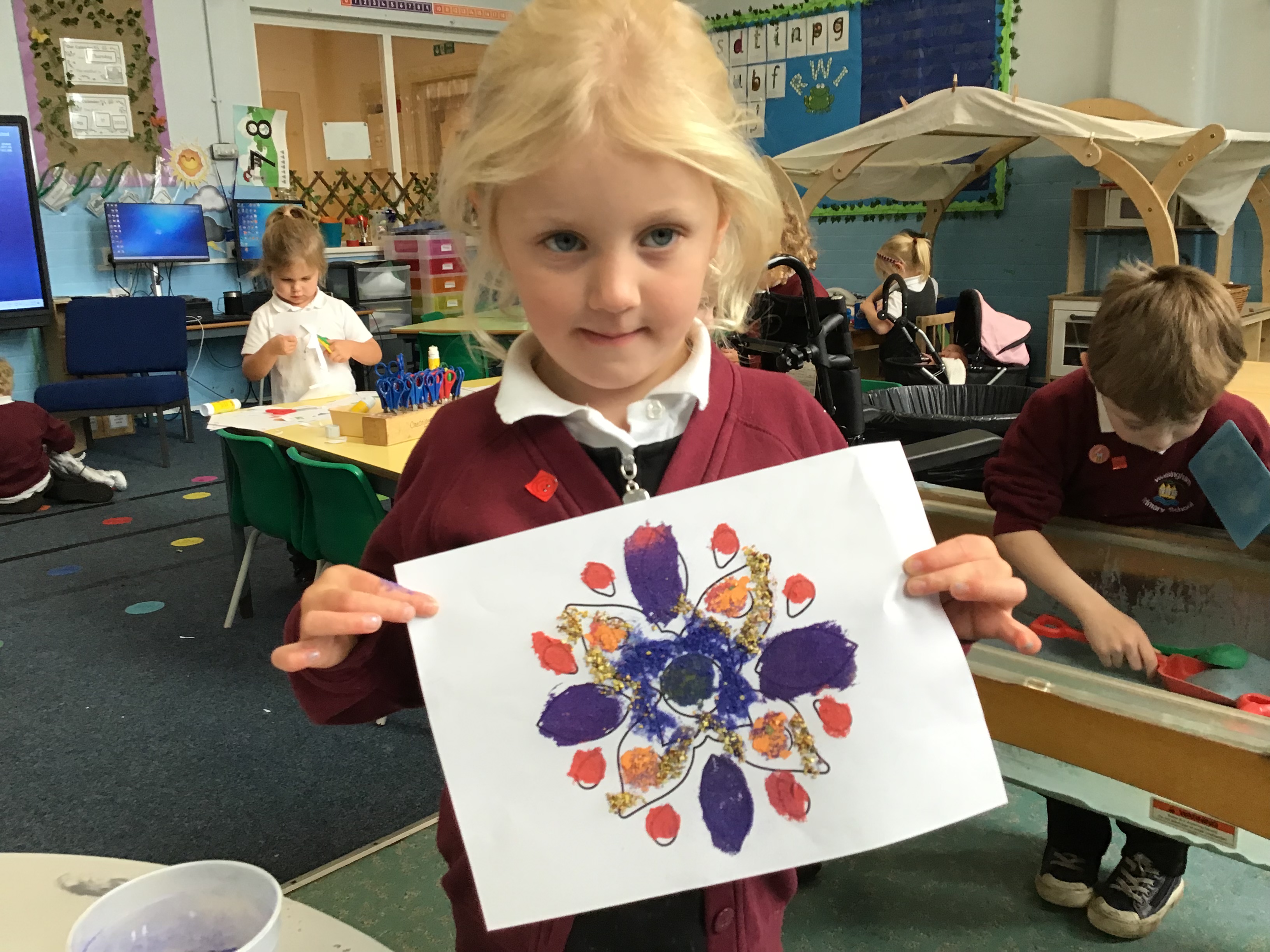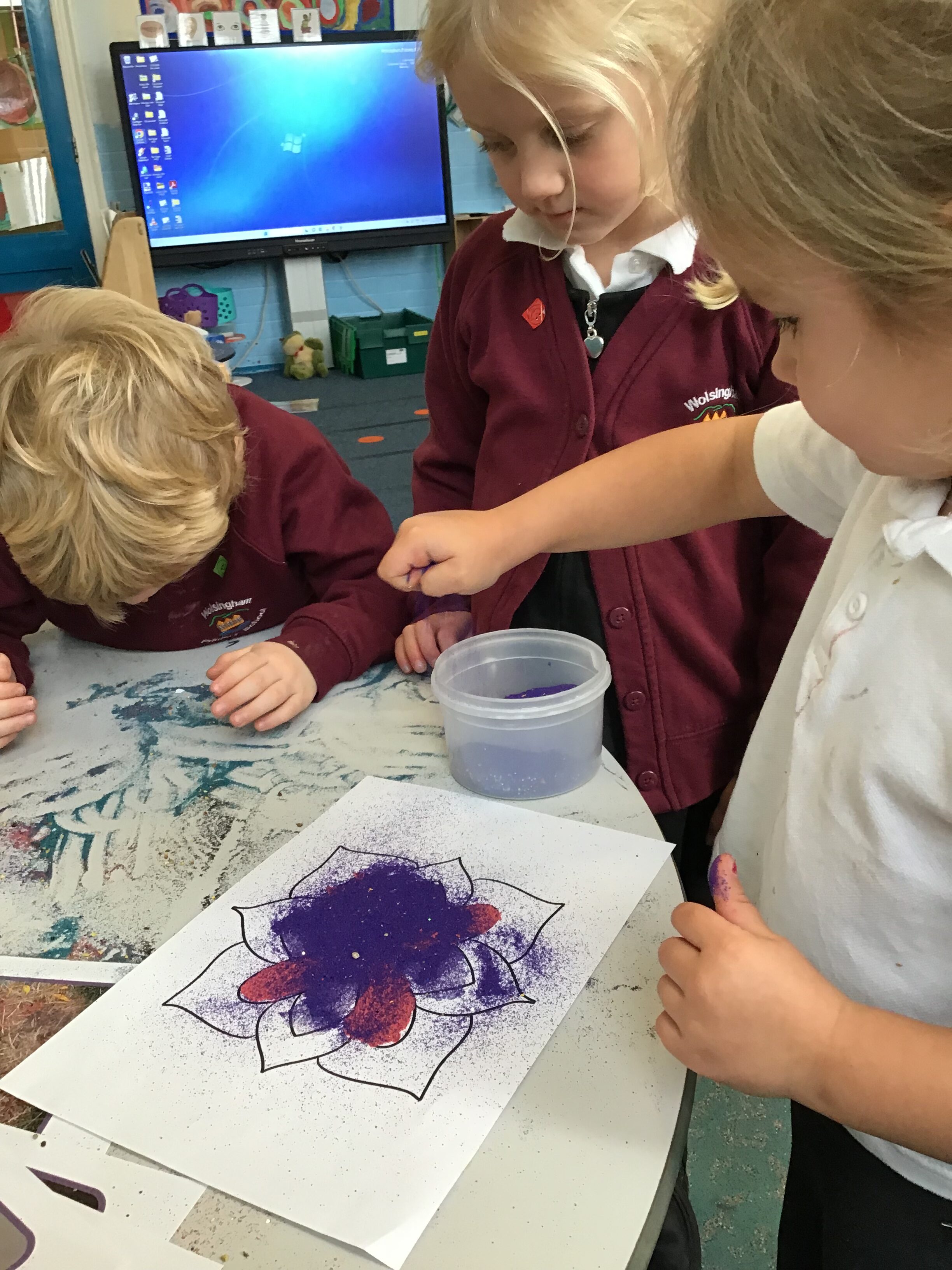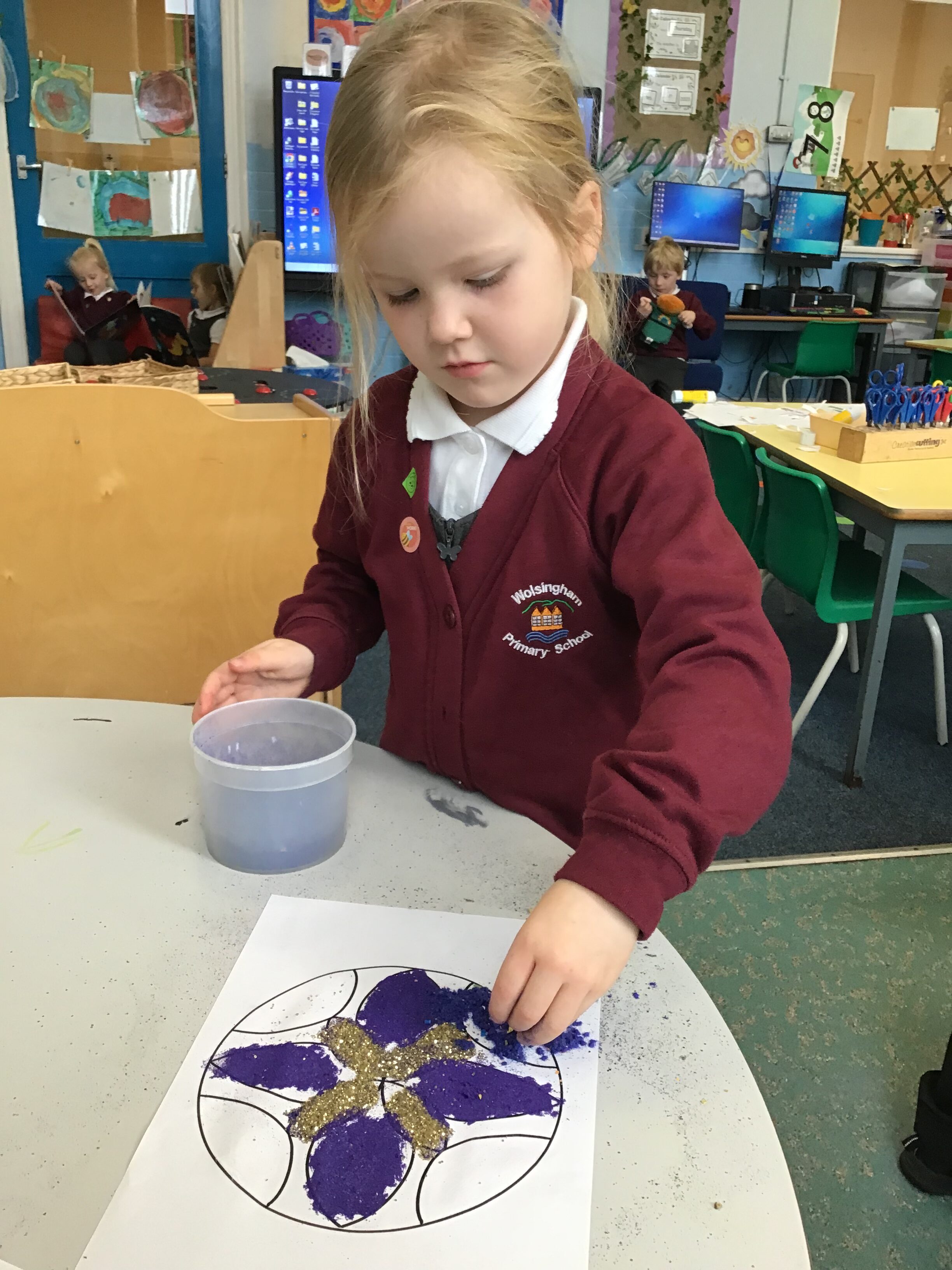 We looked at Rangoli patterns and talked about how they are used to decorate houses during Diwali. We used collage techniques to make a Rangoli pattern. The children choose different materials and colours to create their patterns. They sprinkled the materials carefully and pressed them down so that they stuck to the glue.