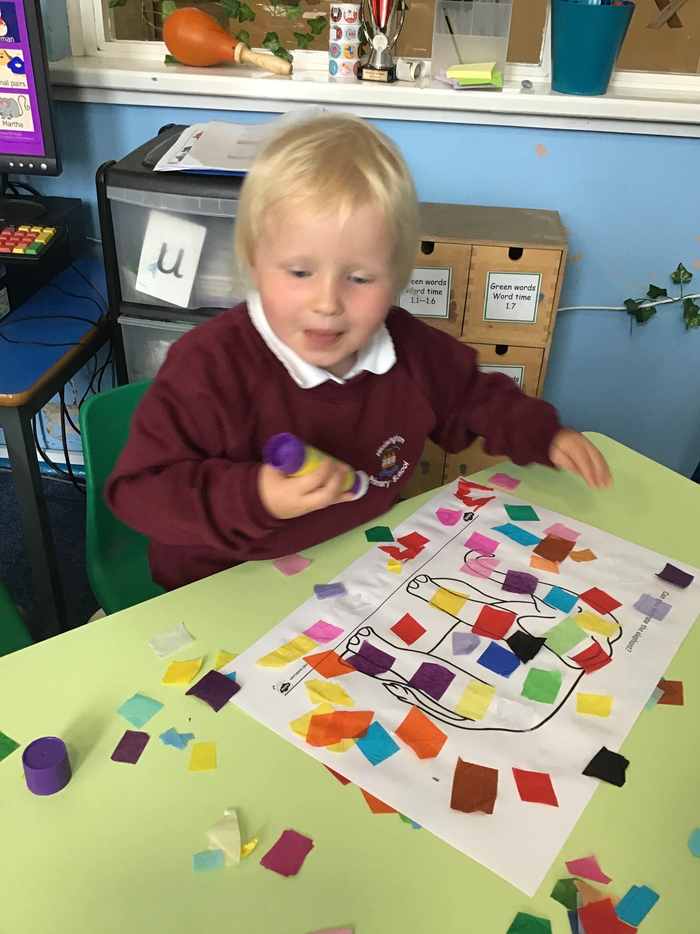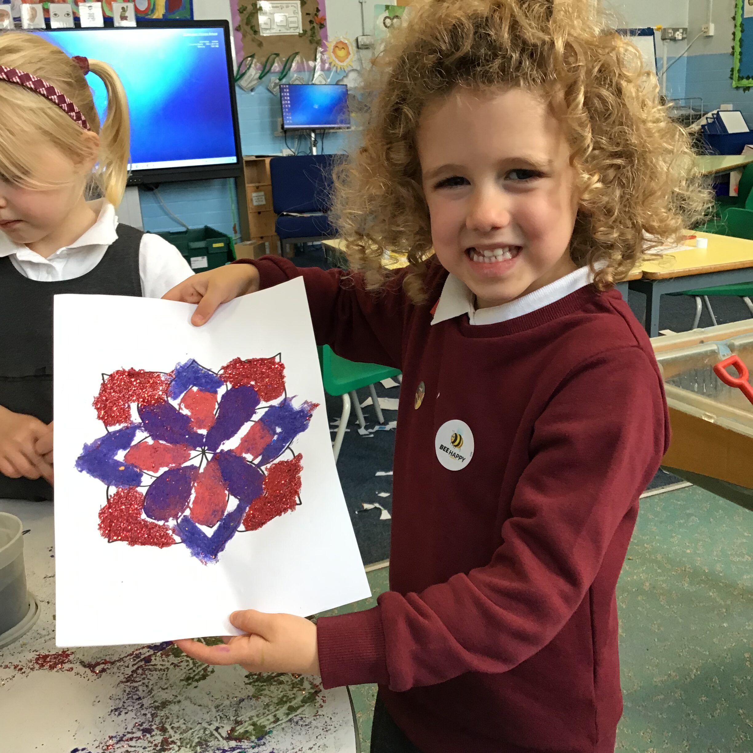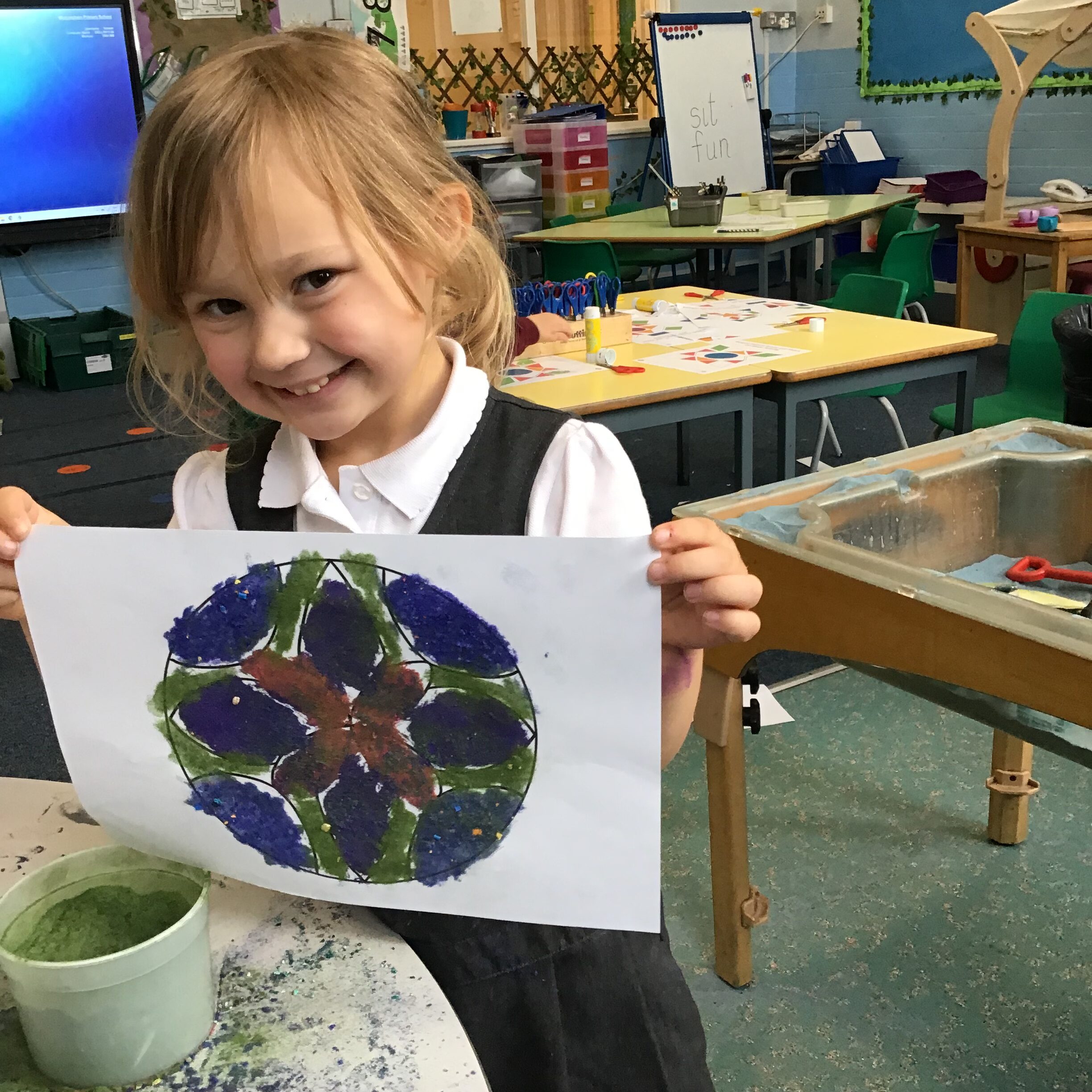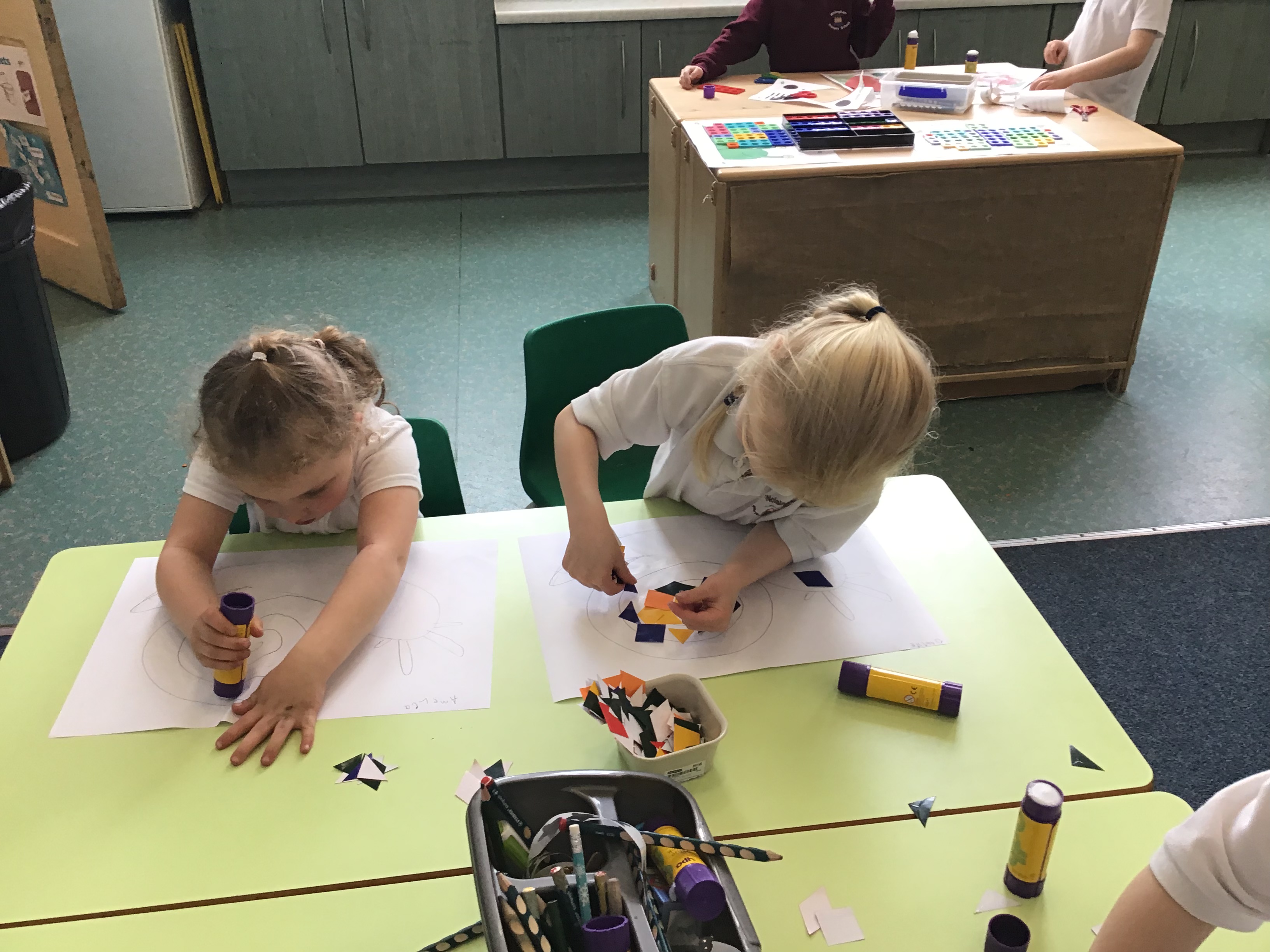 We looked at Rangoli patterns and talked about how they are used to decorate houses during Diwali. We used collage techniques to make a Rangoli pattern. The children choose different materials and colours to create their patterns. They sprinkled the materials carefully and pressed them down so that they stuck to the glue.