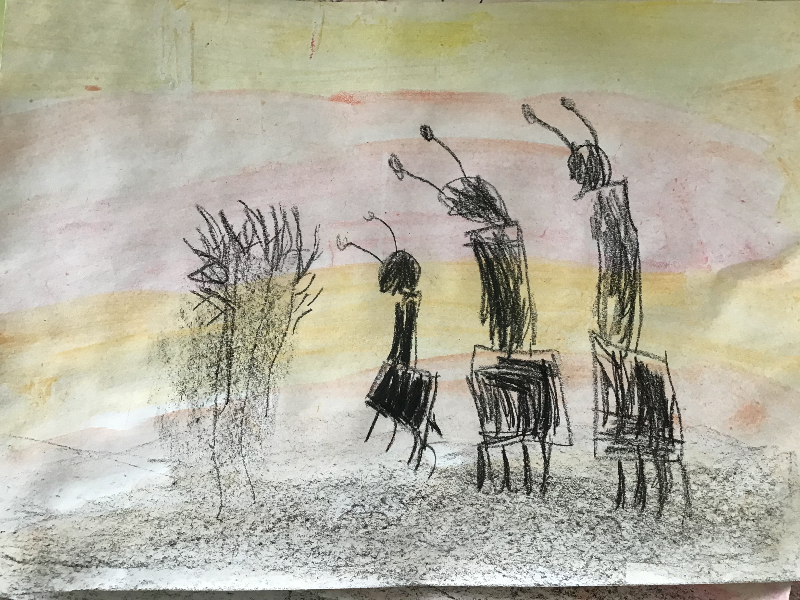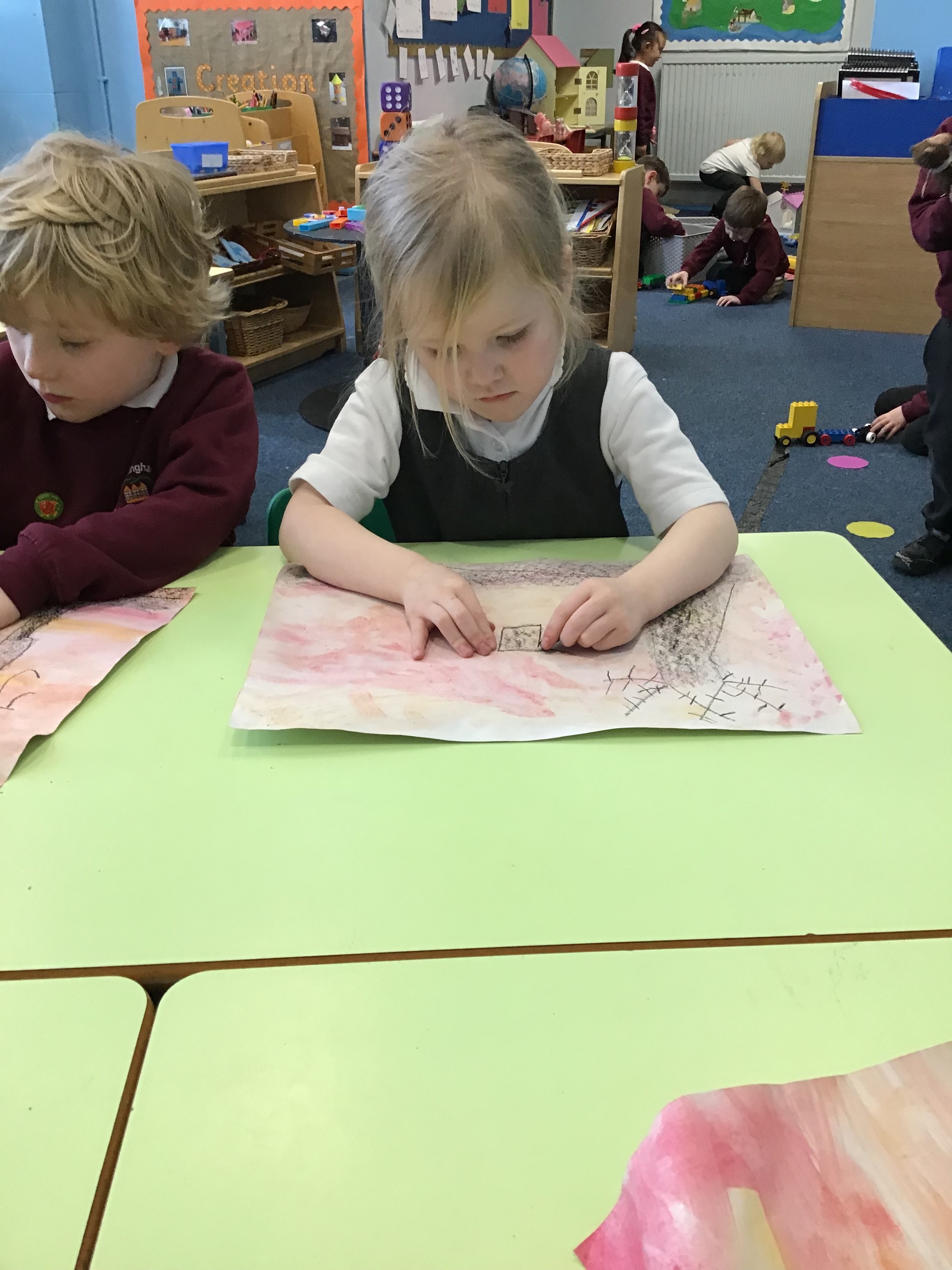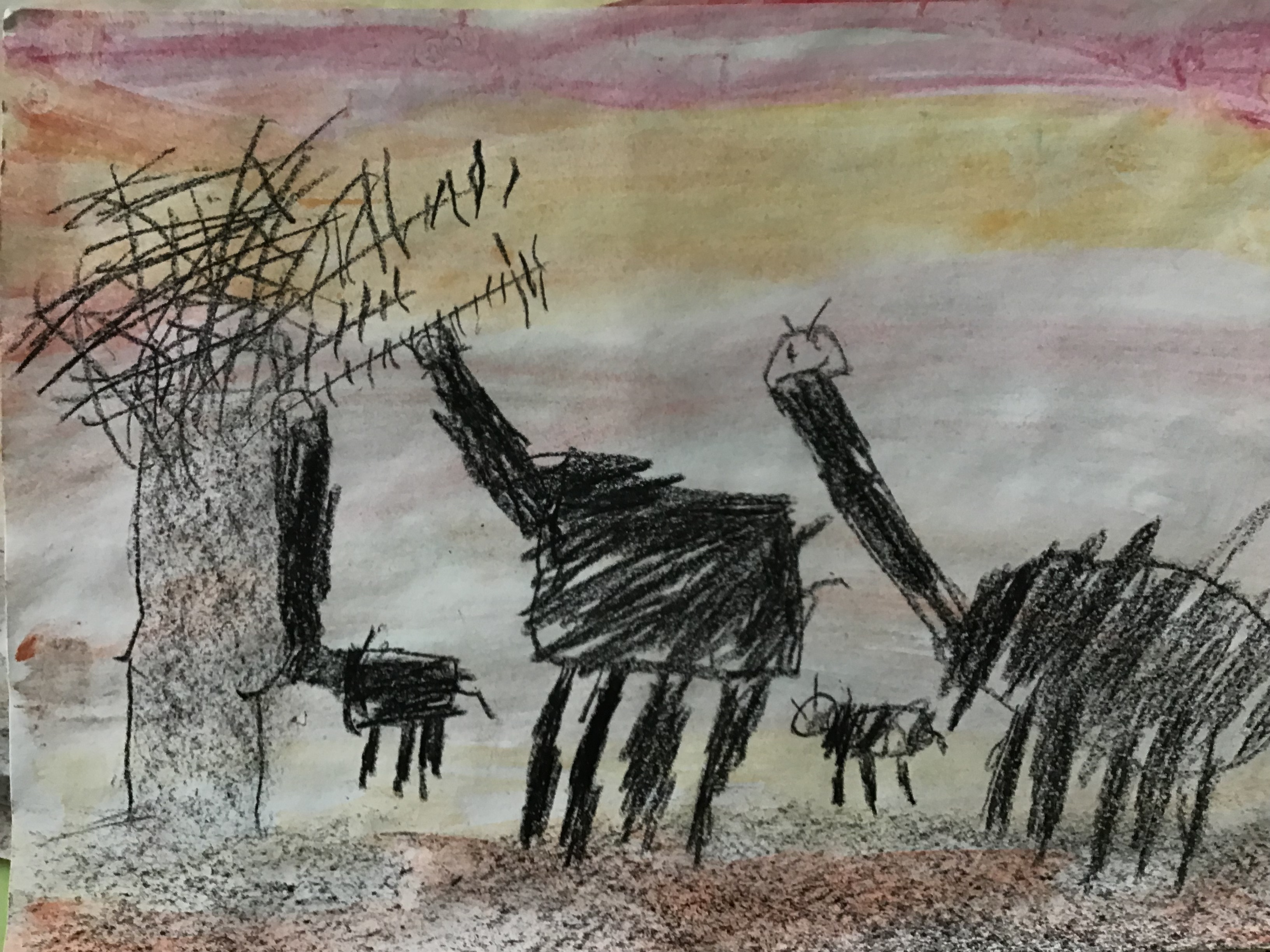 We are learning about hot places on Earth and have learnt about Africa and the types of animals that live there. We looked at images of the sun setting in Africa and decided to try and make our own African sunset pictures. We used watercolour paints to paint the background, choosing warm colours such as red, orange and yellow. Then we drew trees and giraffes with black wax crayon, thinking about the shapes and types of line we needed to use.