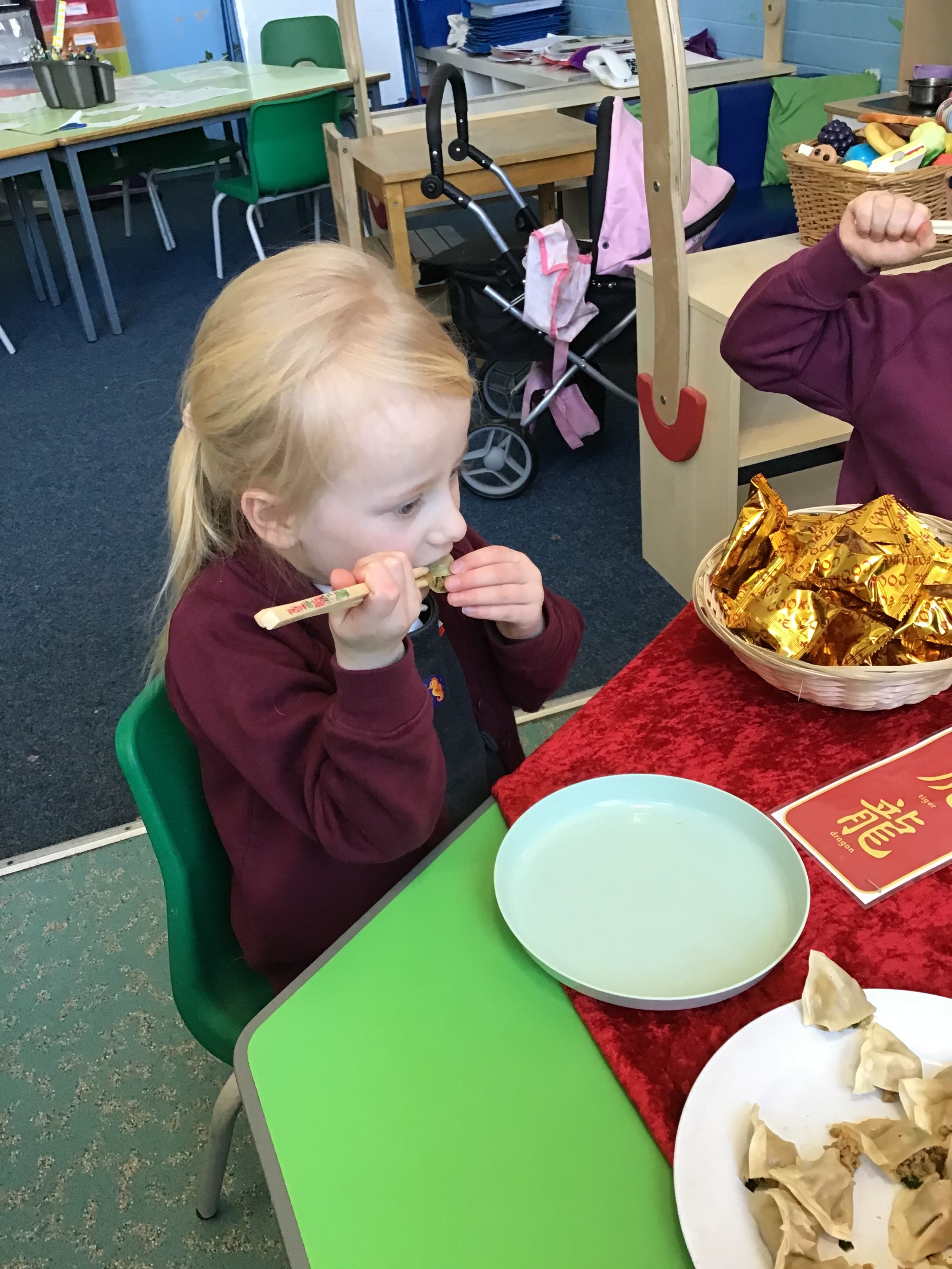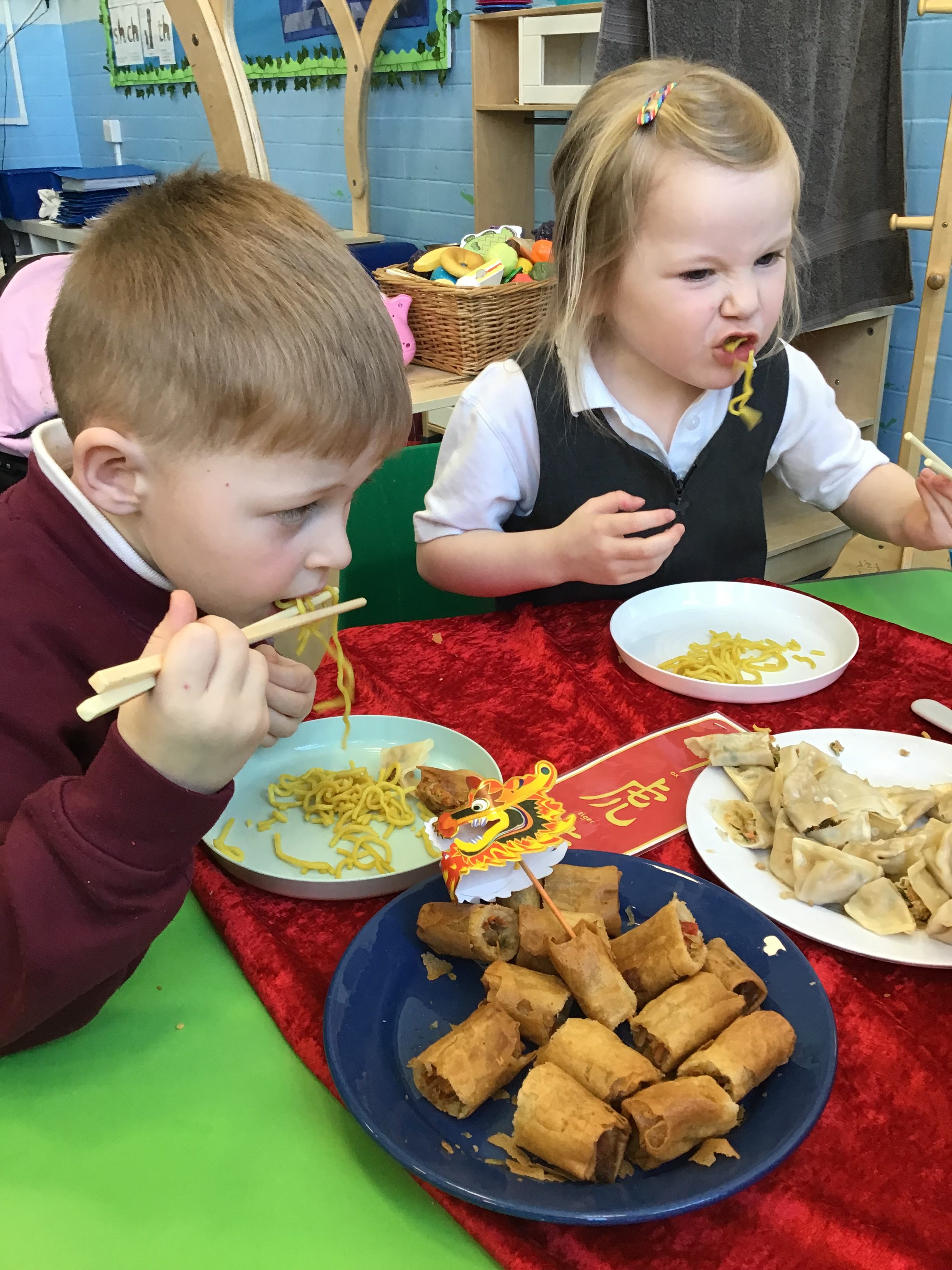 Reception Class enjoyed a banquet of Chinese foods to celebrate Chinese New Year. They had spring rolls, prawn crackers, noodles and dumplings. The children enjoyed tasting the foods and all had a try at using chopsticks to pick up the food.