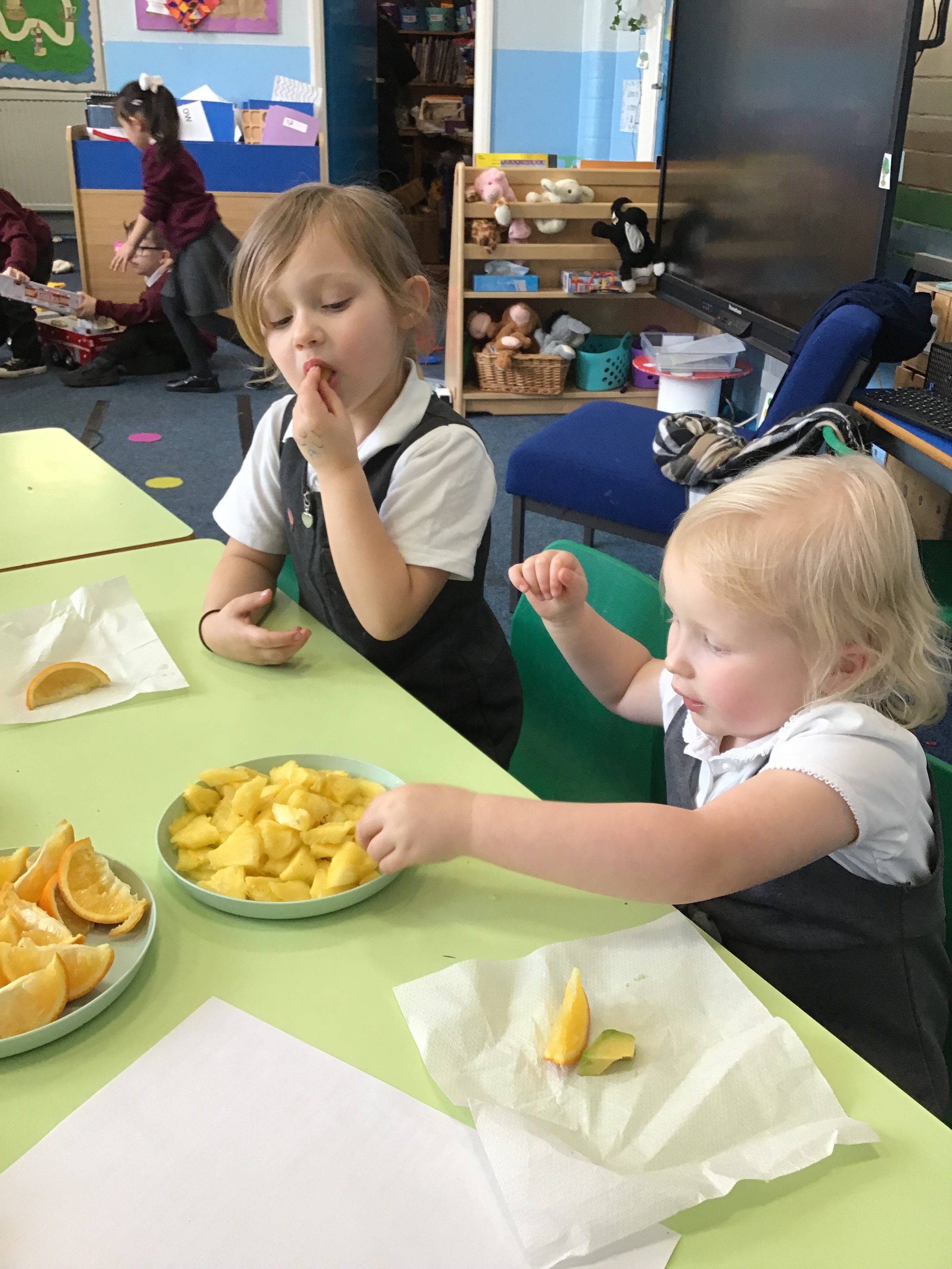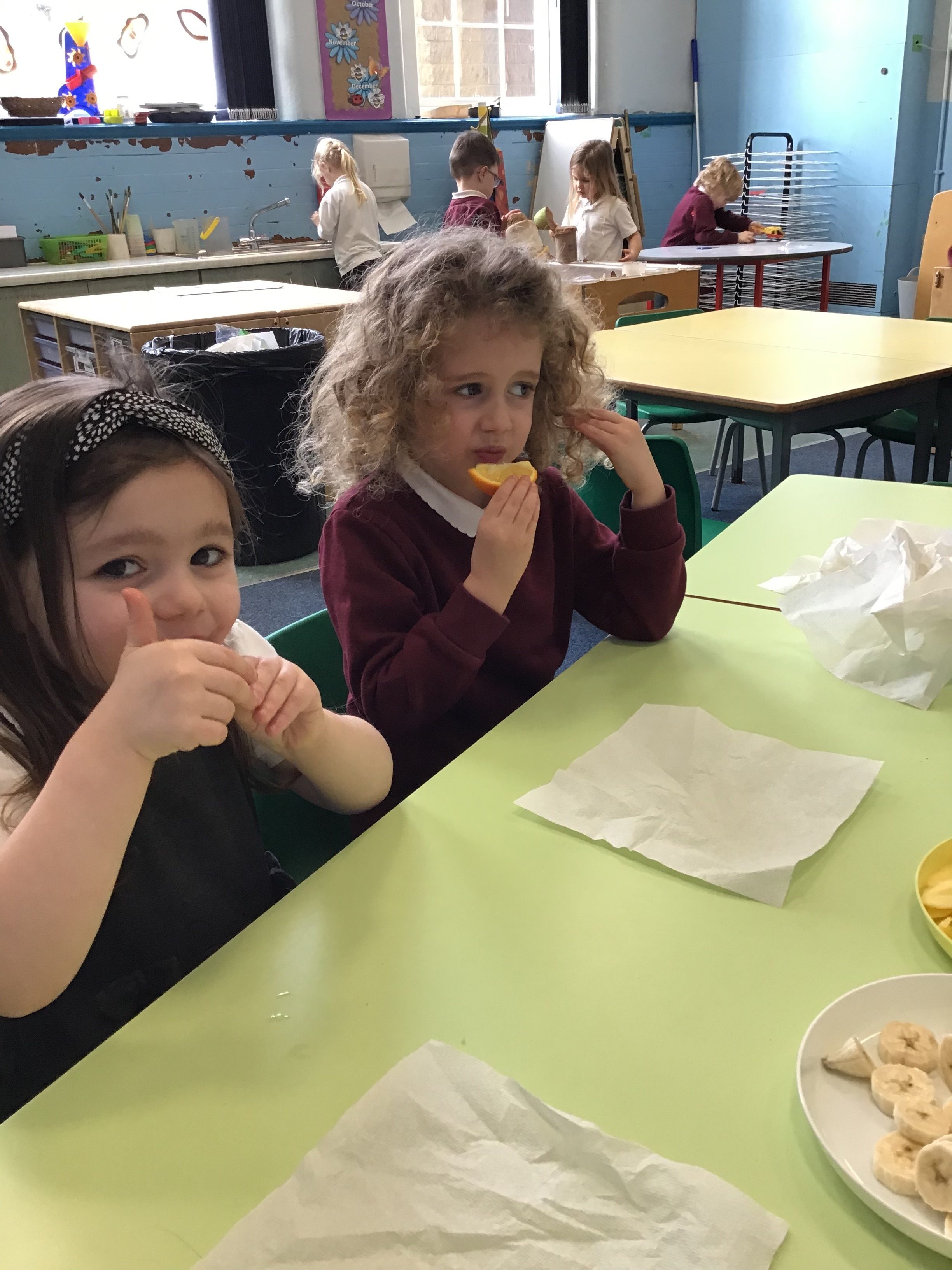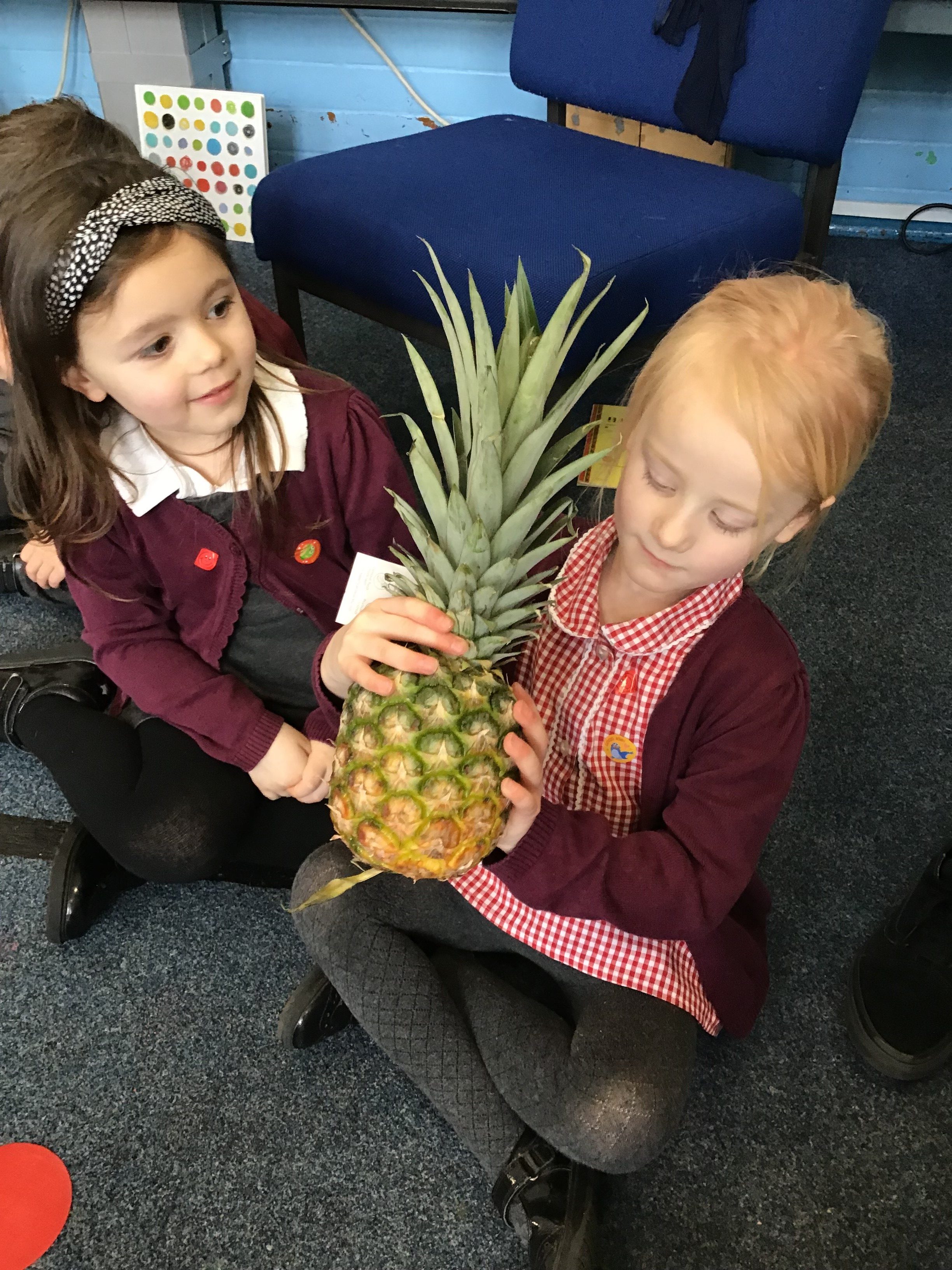 This week we have been reading the story of Handa’s Surprise. In the story, Handa sets off to deliver 7 tropical fruits to her friend. We looked at, handled and tasted the fruits from the story. The children all got involved and they tasted pineapple, banana, avocado, orange, mango and passion fruit. The children described the colours, textures and flavours of the different fruits.