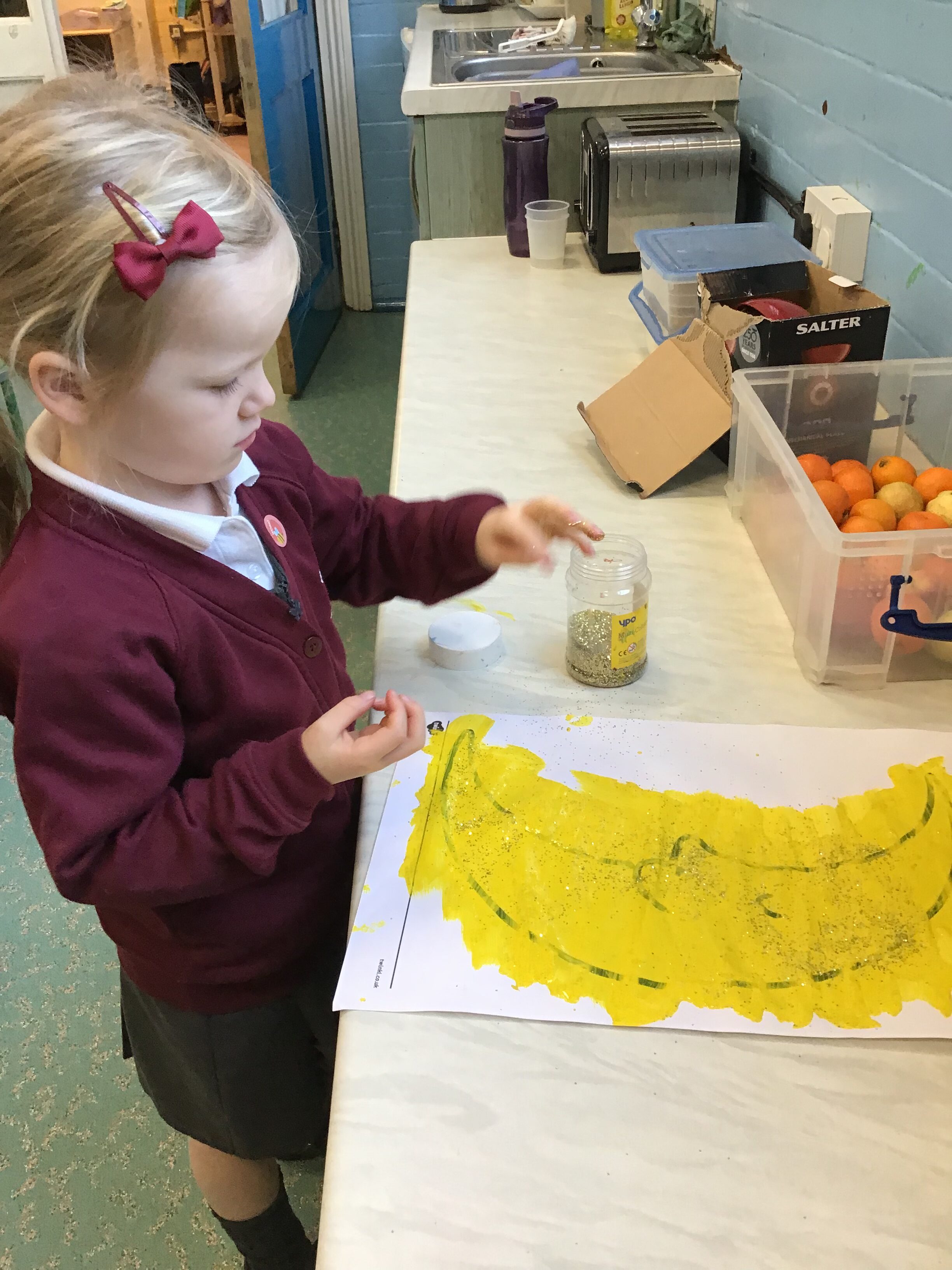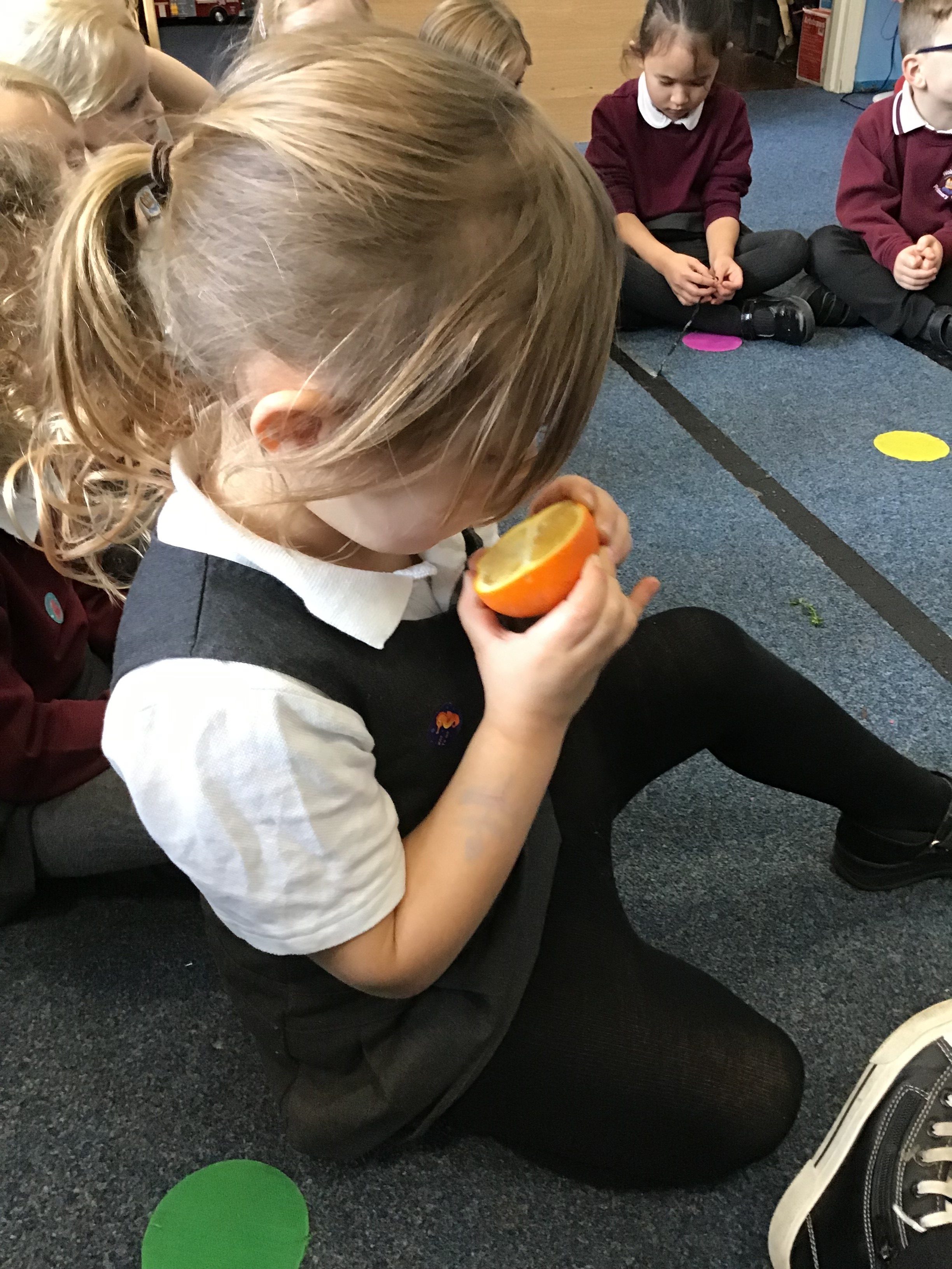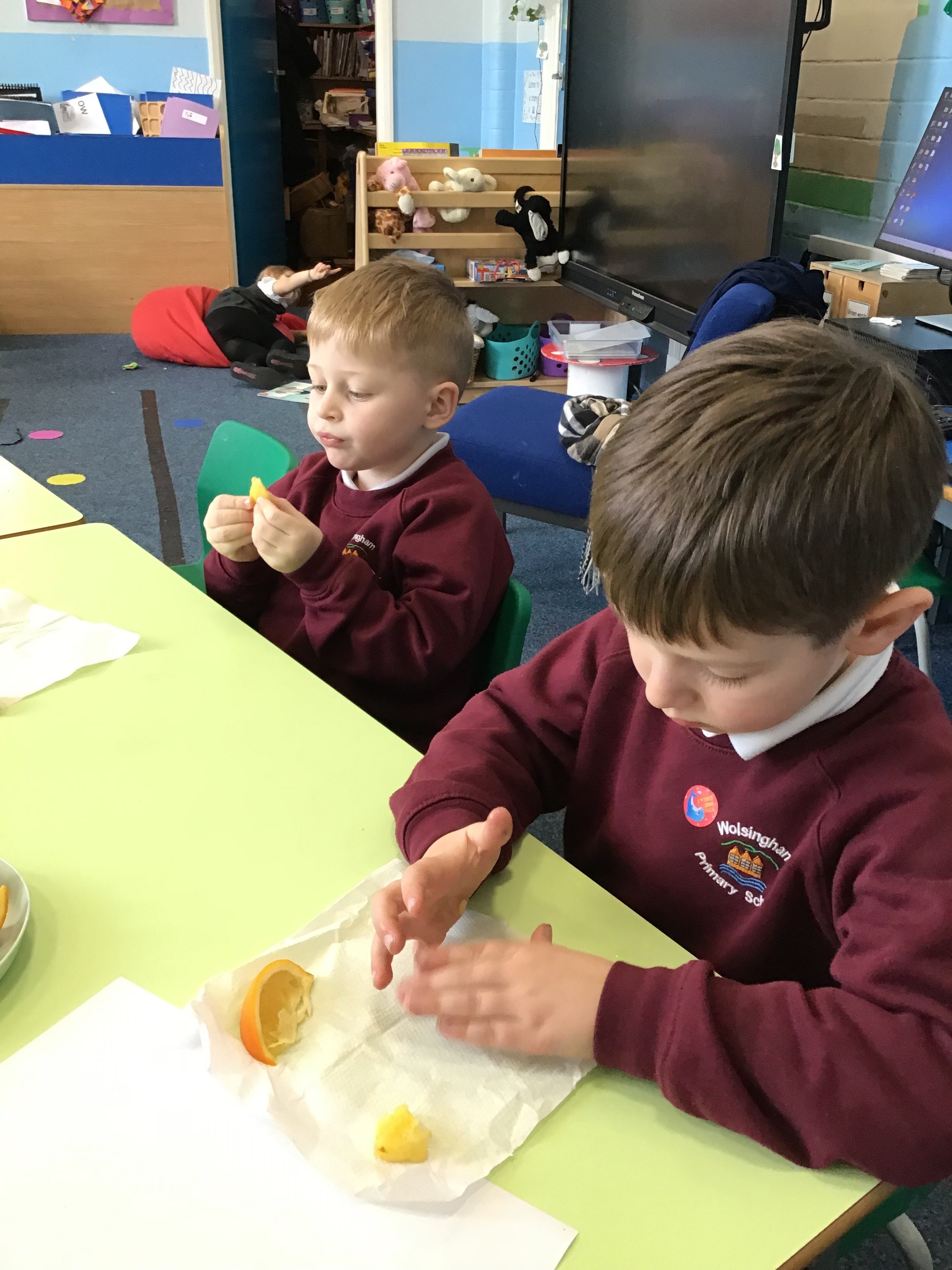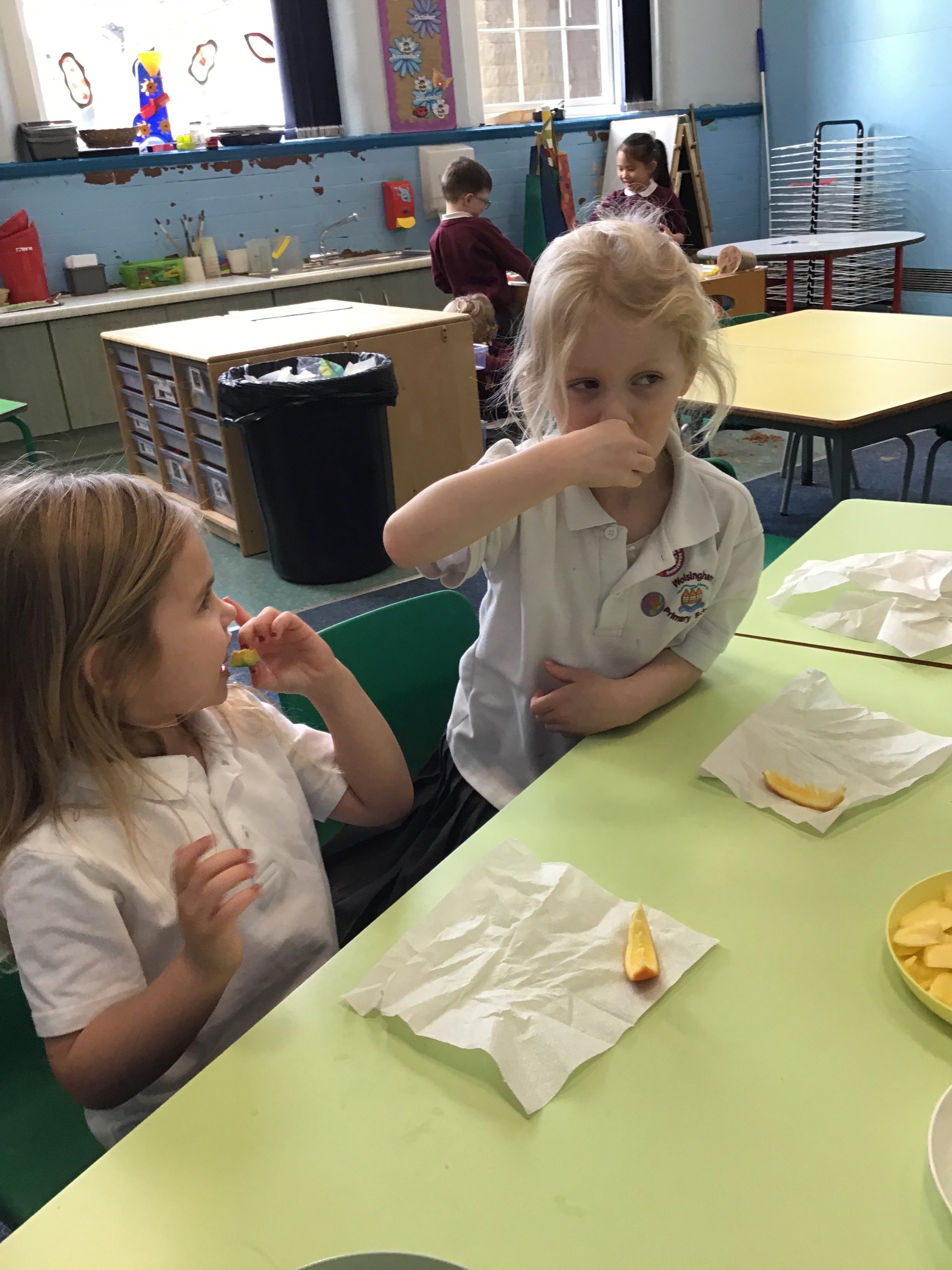 This week we have been reading the story of Handa’s Surprise. In the story, Handa sets off to deliver 7 tropical fruits to her friend. We looked at, handled and tasted the fruits from the story. The children all got involved and they tasted pineapple, banana, avocado, orange, mango and passion fruit. The children described the colours, textures and flavours of the different fruits.