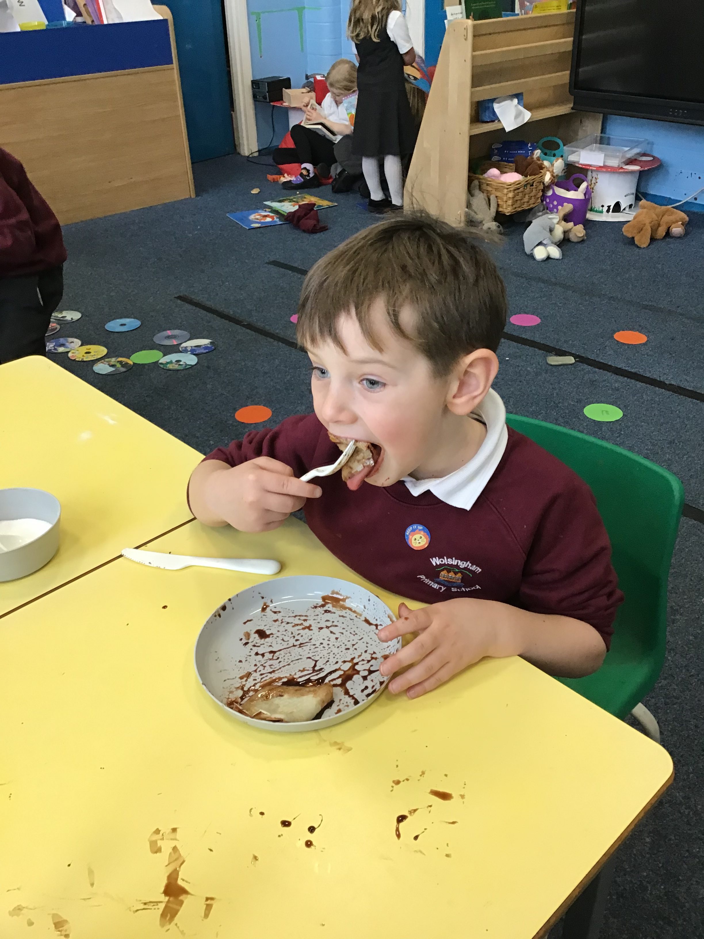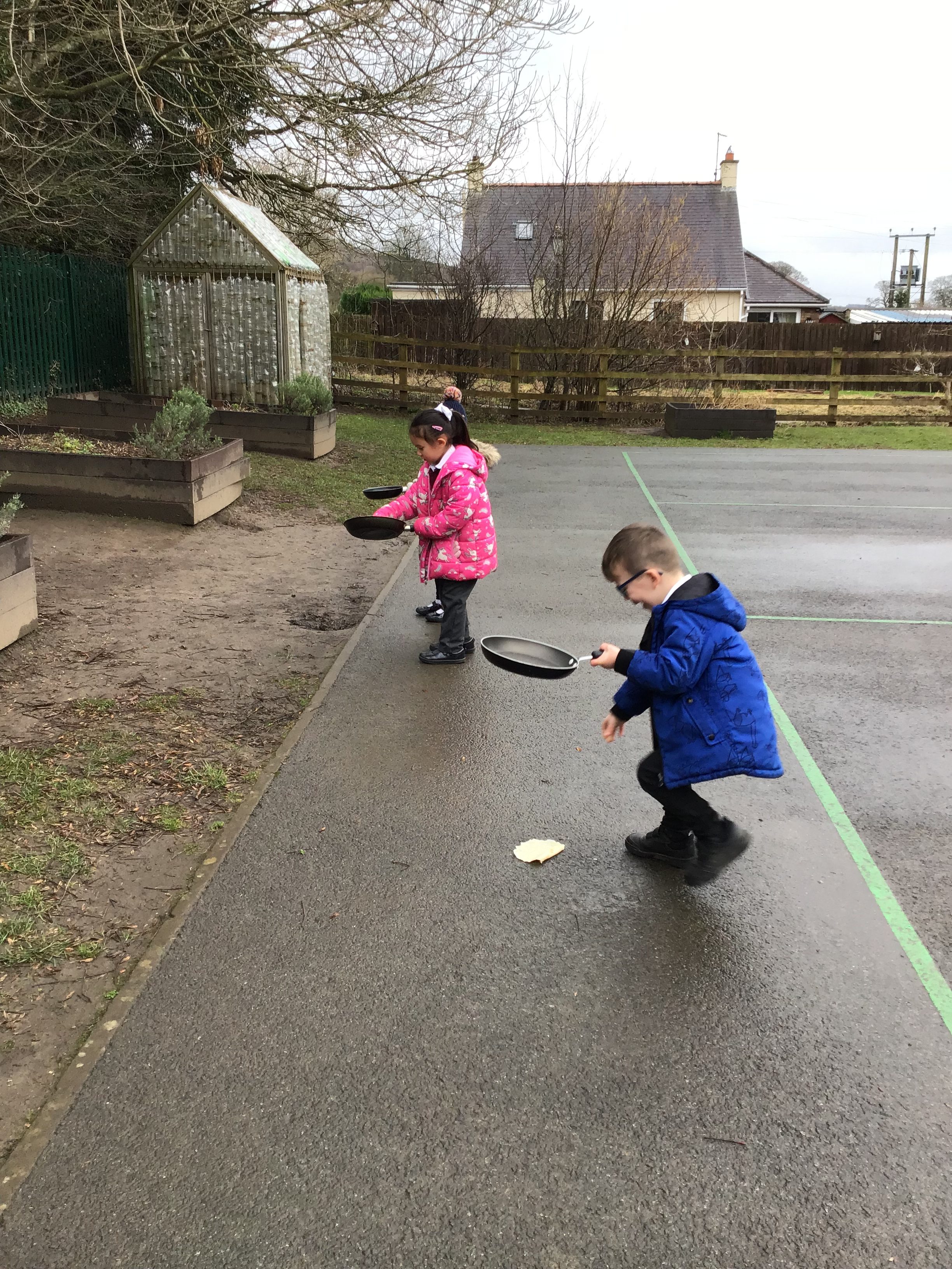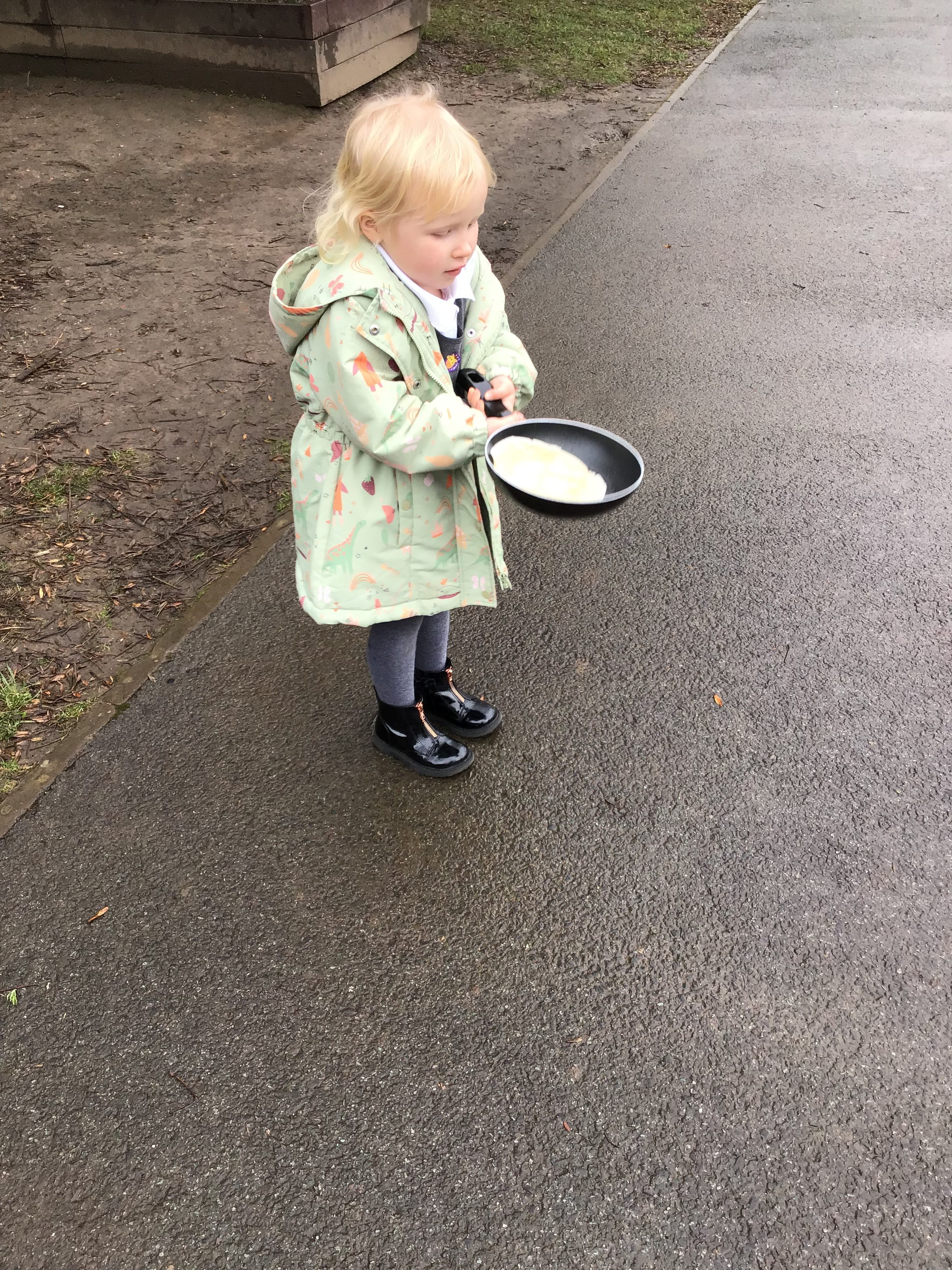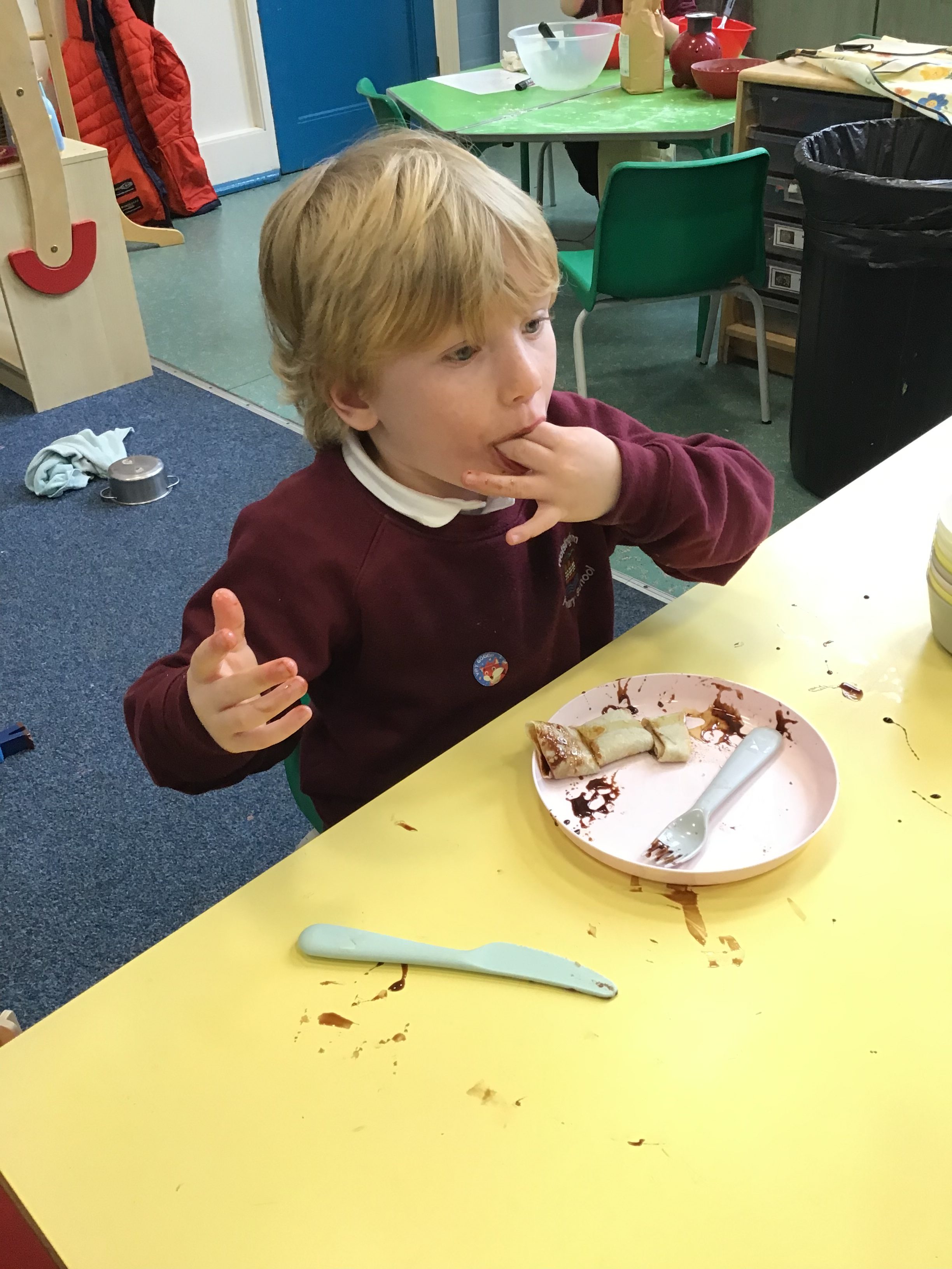 We celebrated Pancake Day by making pancakes. The children mixed together flour, eggs and milk to make the batter. Once the pancakes were cooked the children could choose what toppings they wanted. The pancakes were delicious! Then we went outside to have pancake races. The children ran across the playground, flipped a pancake and ran back again. It was great fun!
