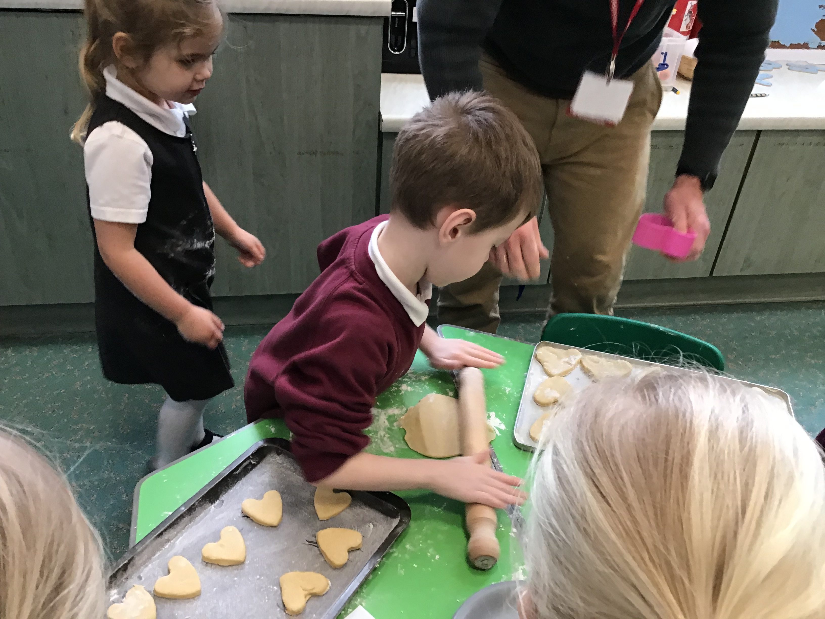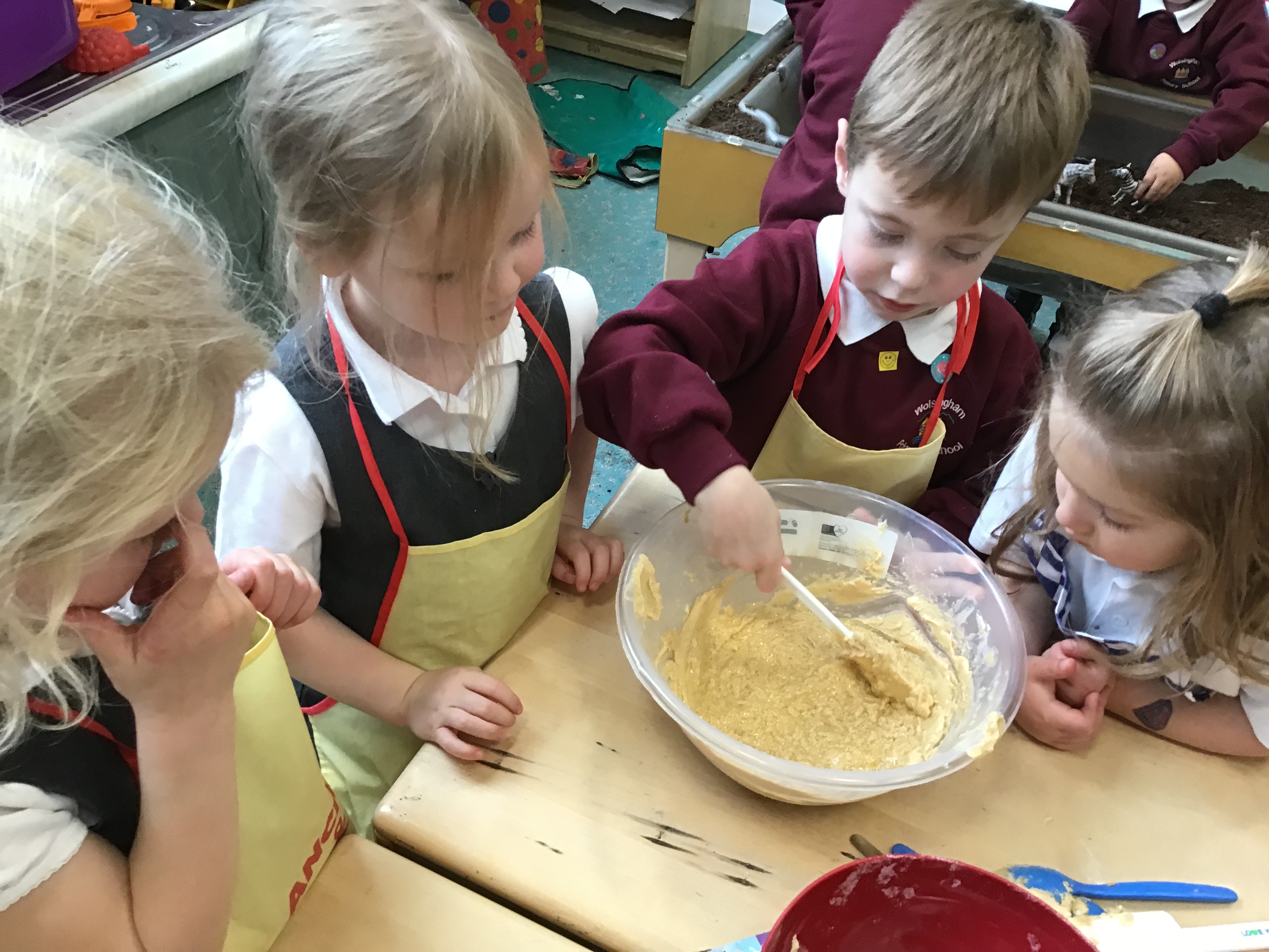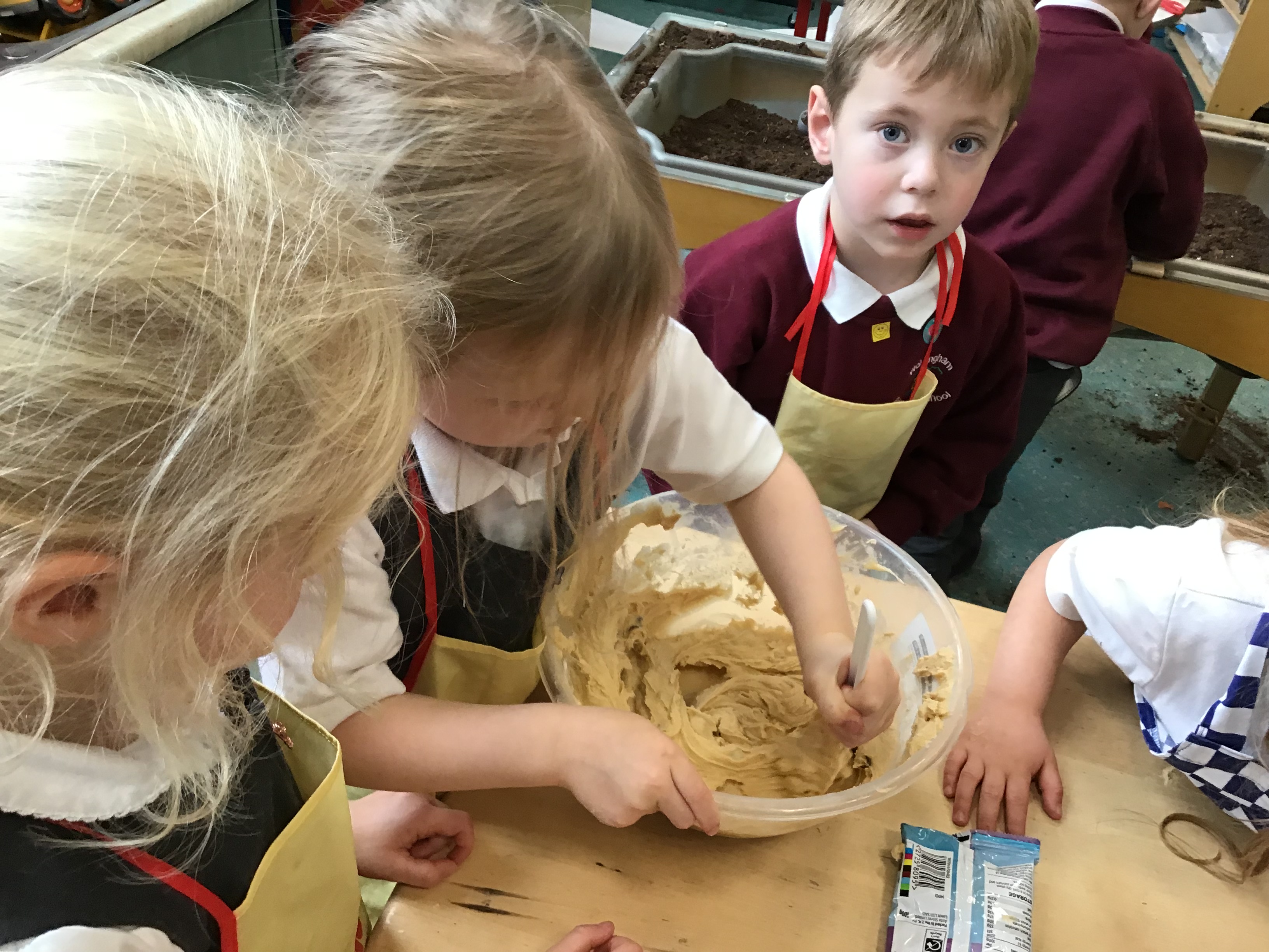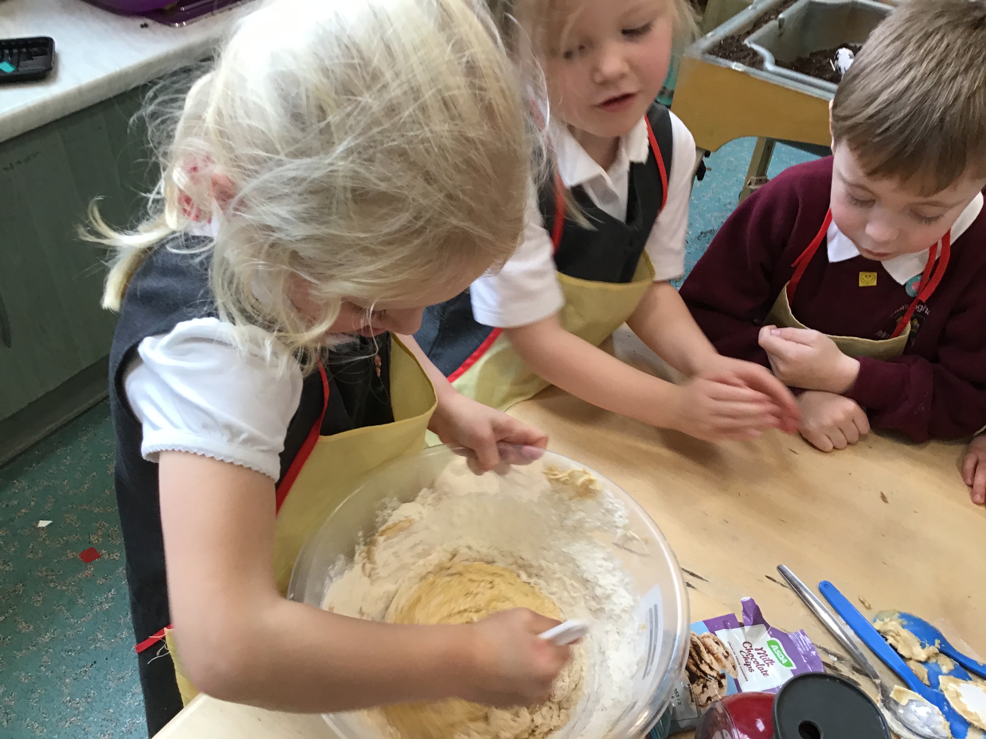 While baking, the children were using lots of maths and language skills. They had lots of fun and are looking forward to eating the cookies for snack tomorrow.