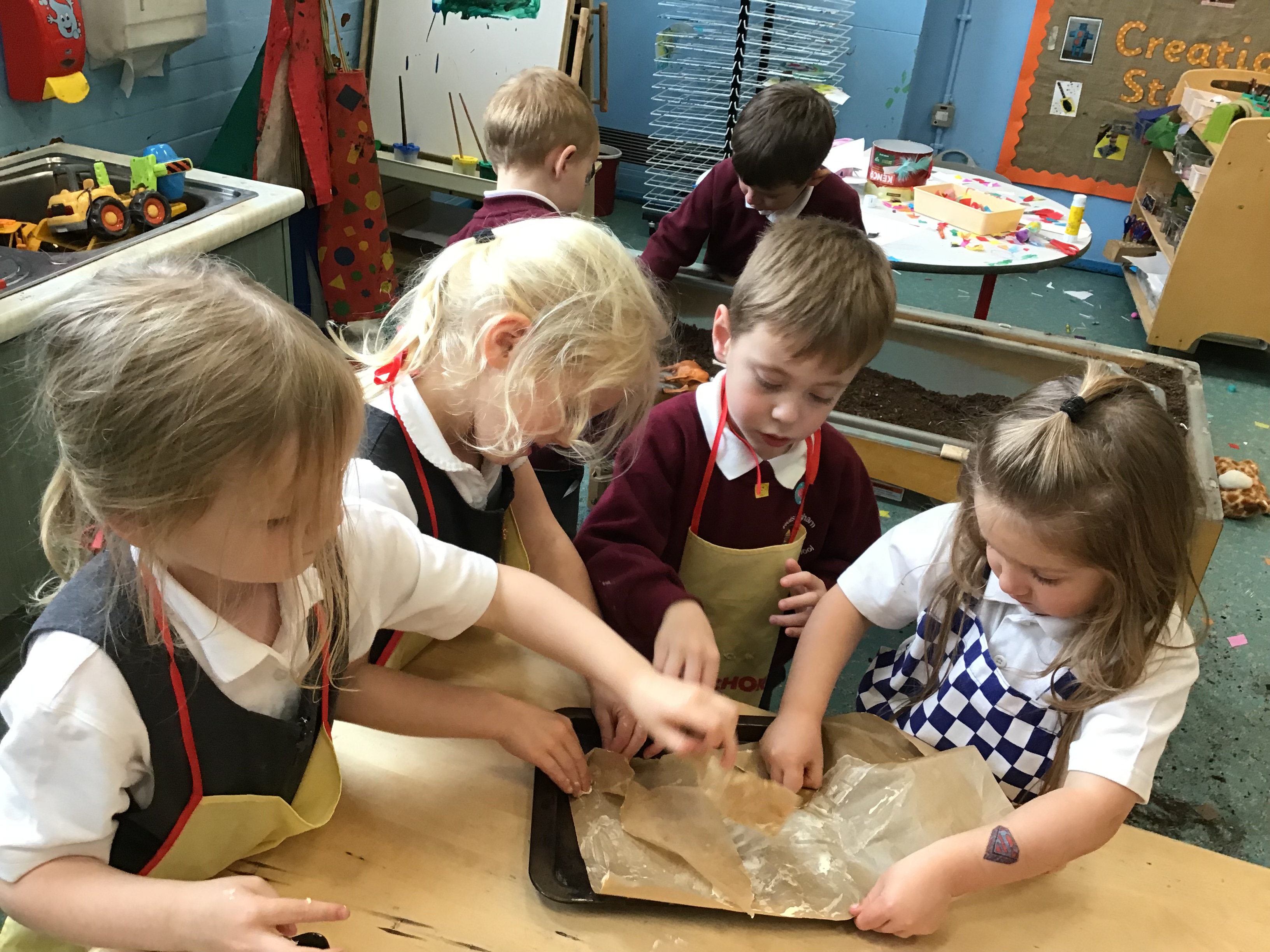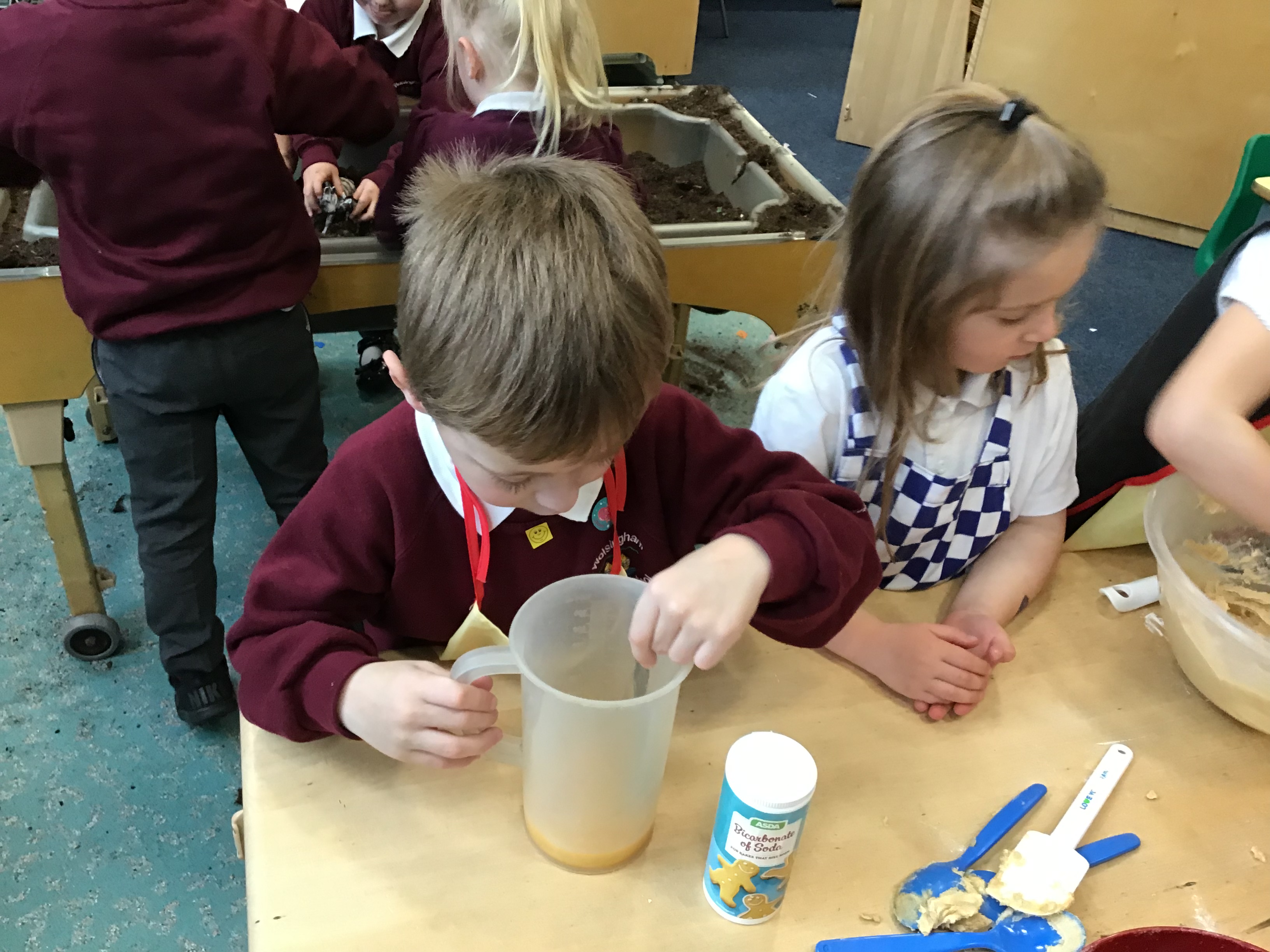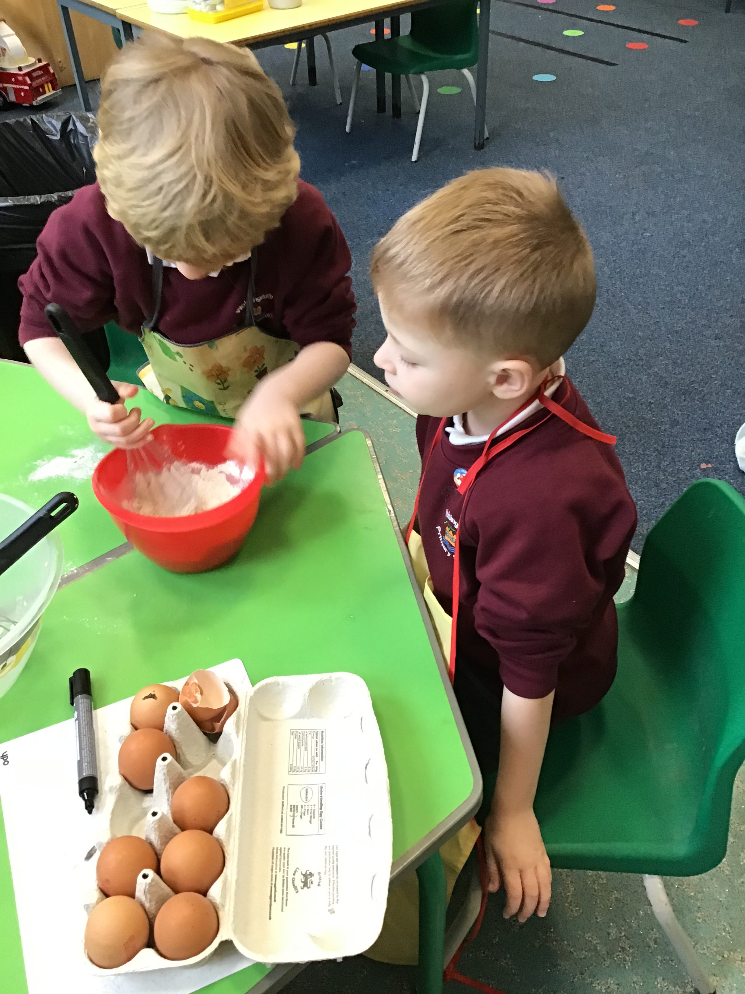While baking, the children were using lots of maths and language skills. They had lots of fun and are looking forward to eating the cookies for snack tomorrow.
