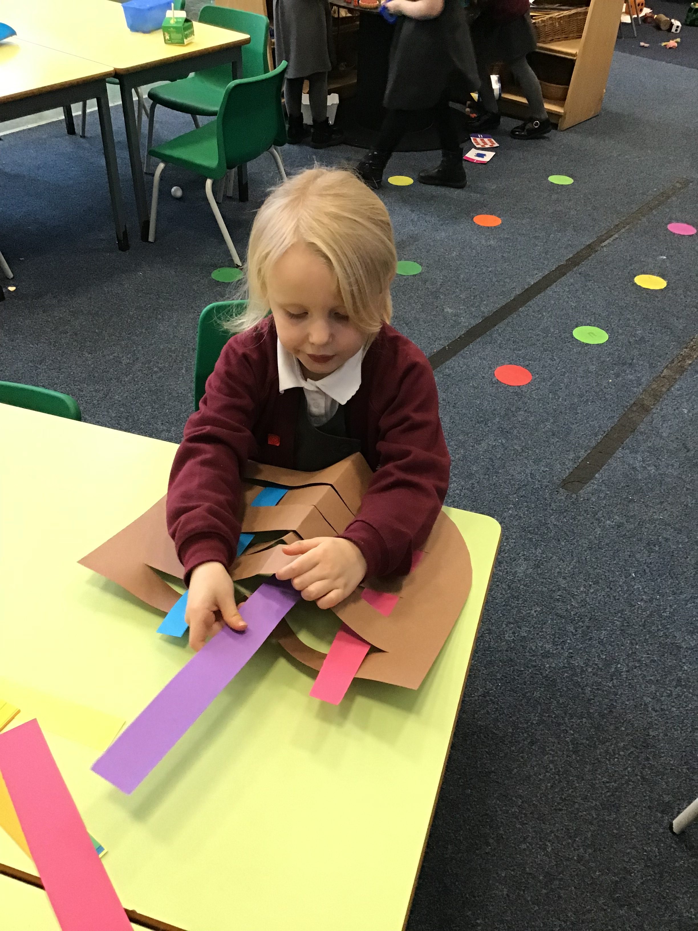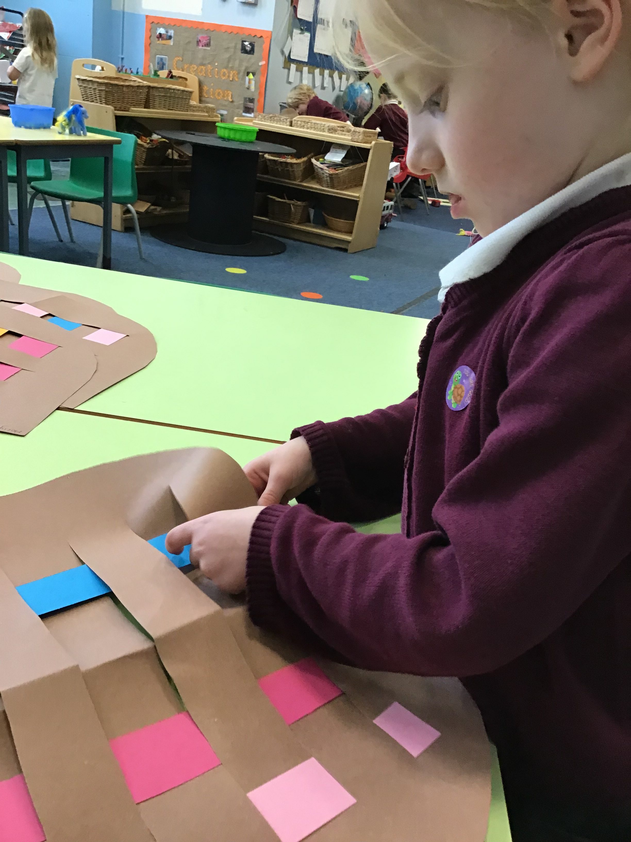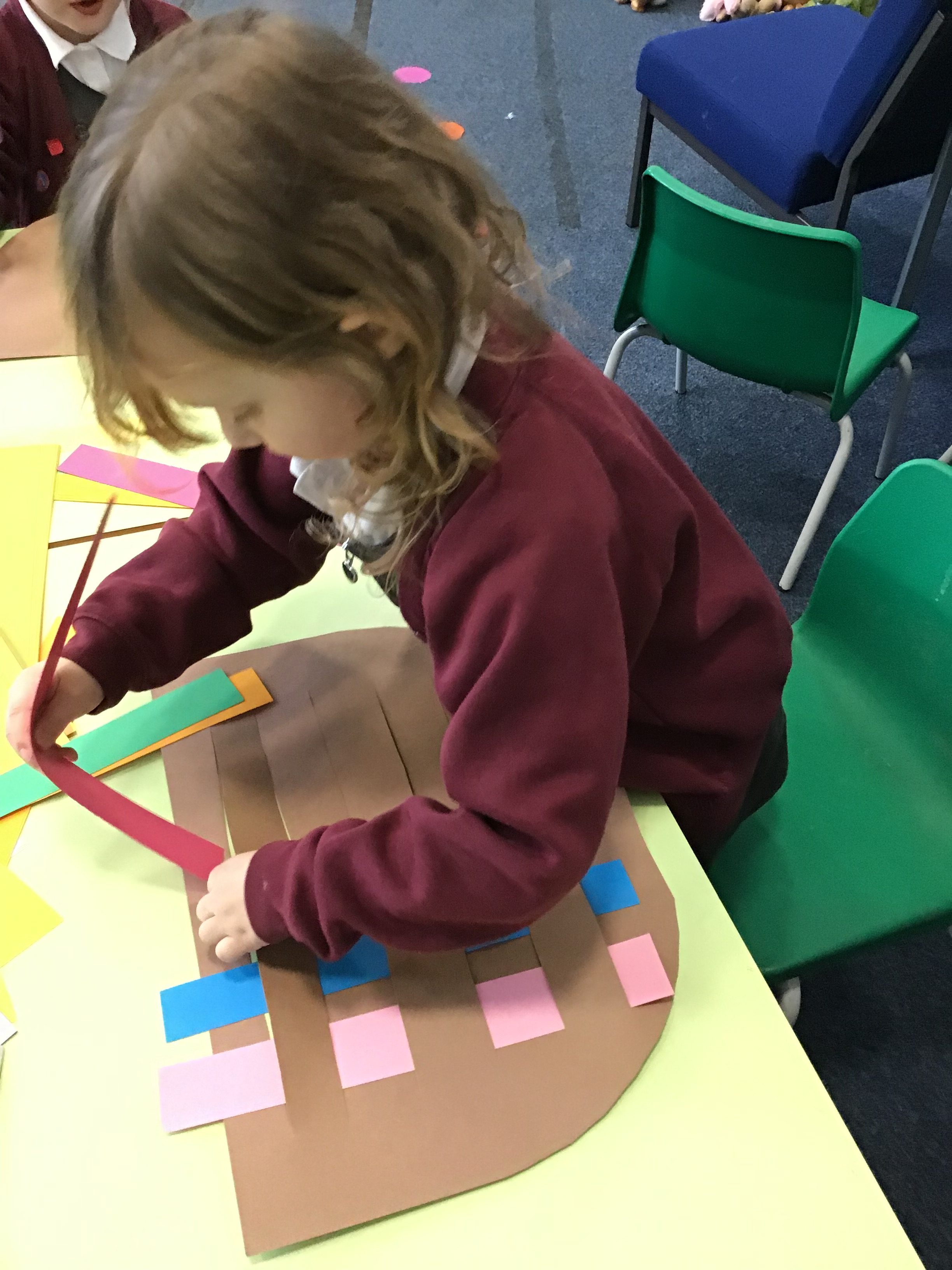 The children had a go at paper weaving to make baskets after reading ‘Handa’s Surprise’. They weaved the strips of paper in and out, going over and under to make colourful baskets.