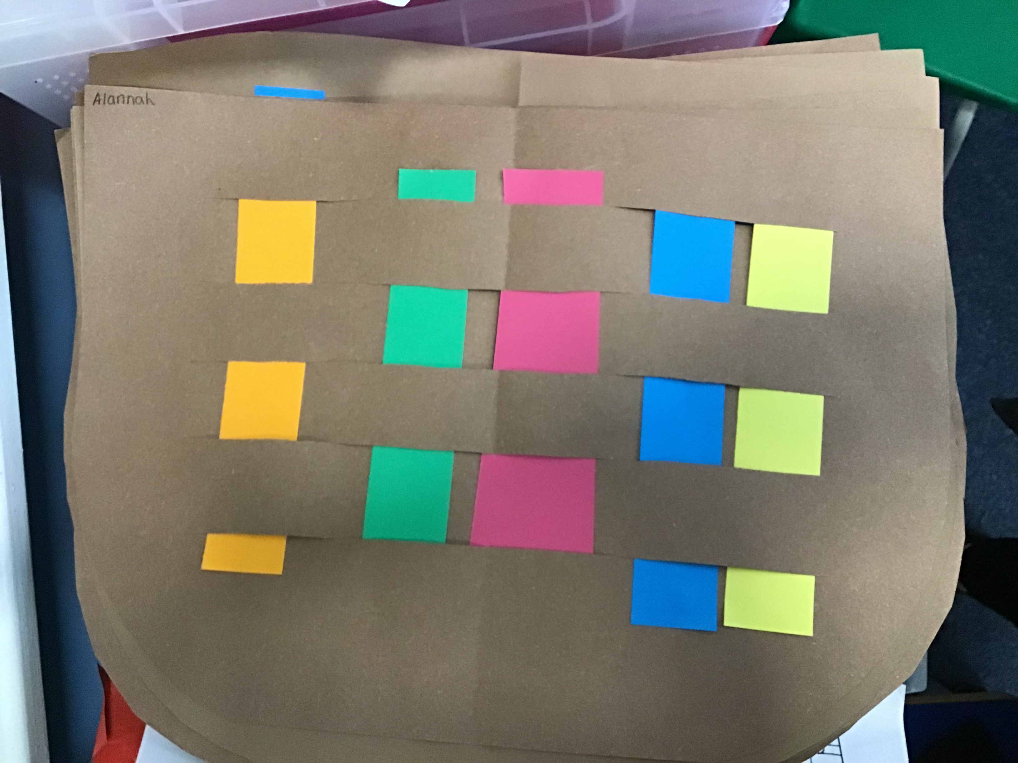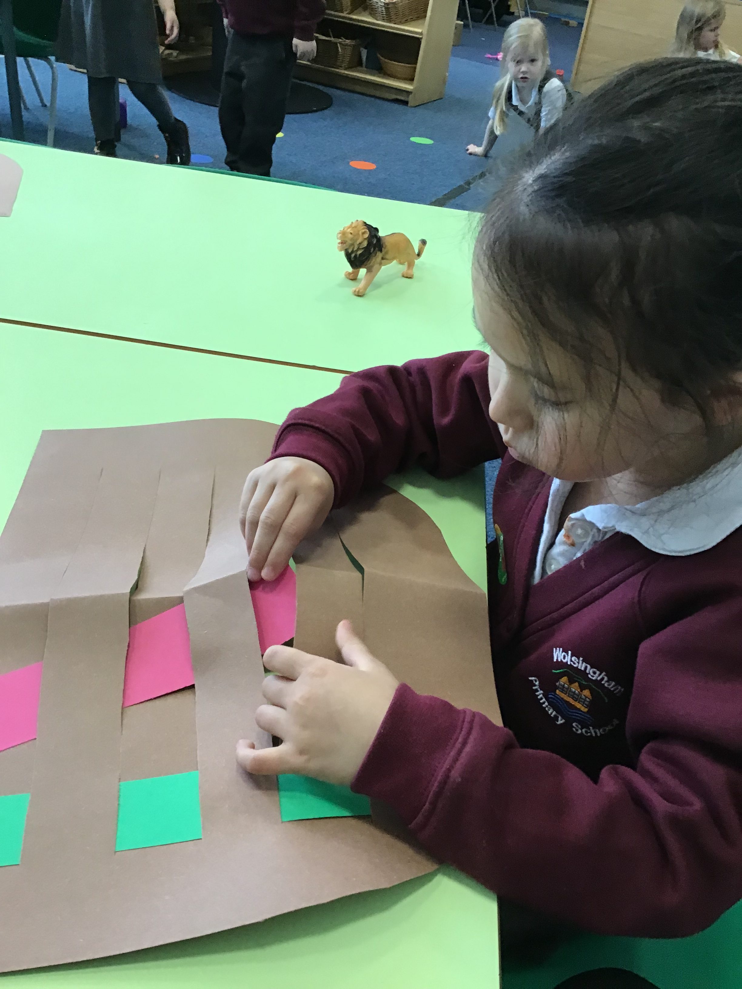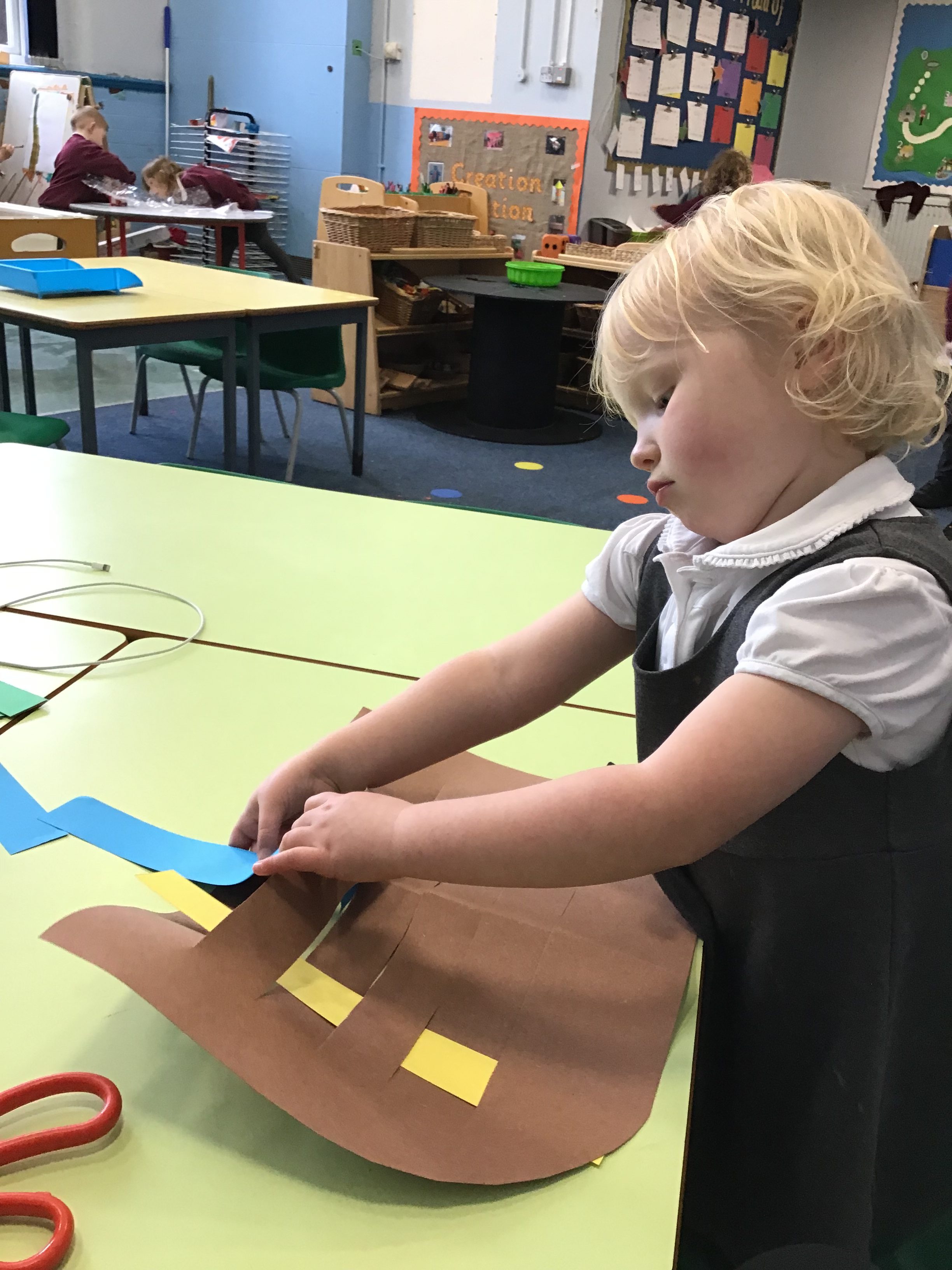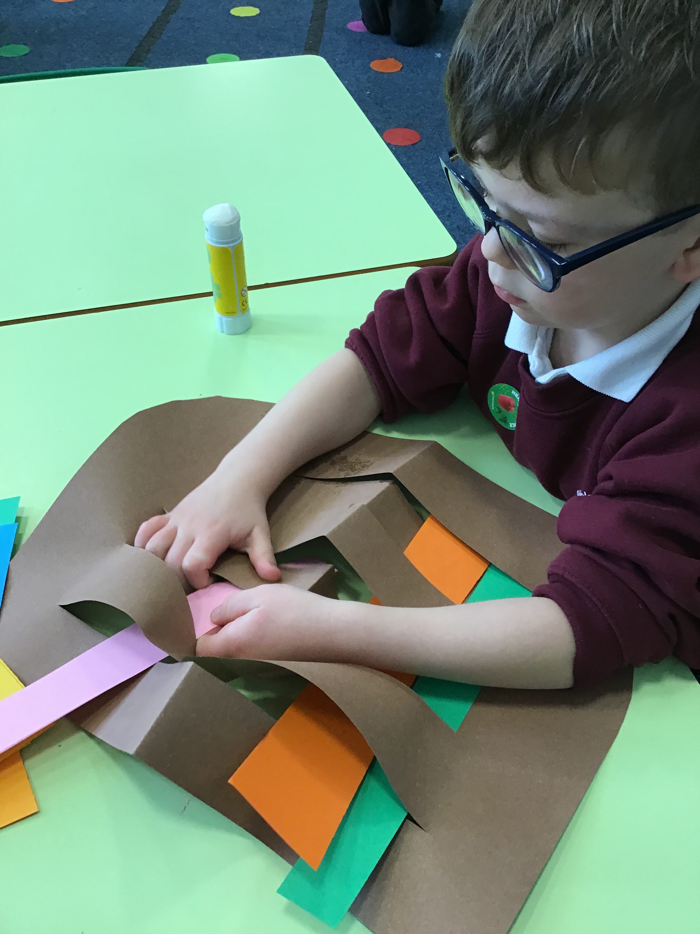 The children had a go at paper weaving to make baskets after reading ‘Handa’s Surprise’. They weaved the strips of paper in and out, going over and under to make colourful baskets.
