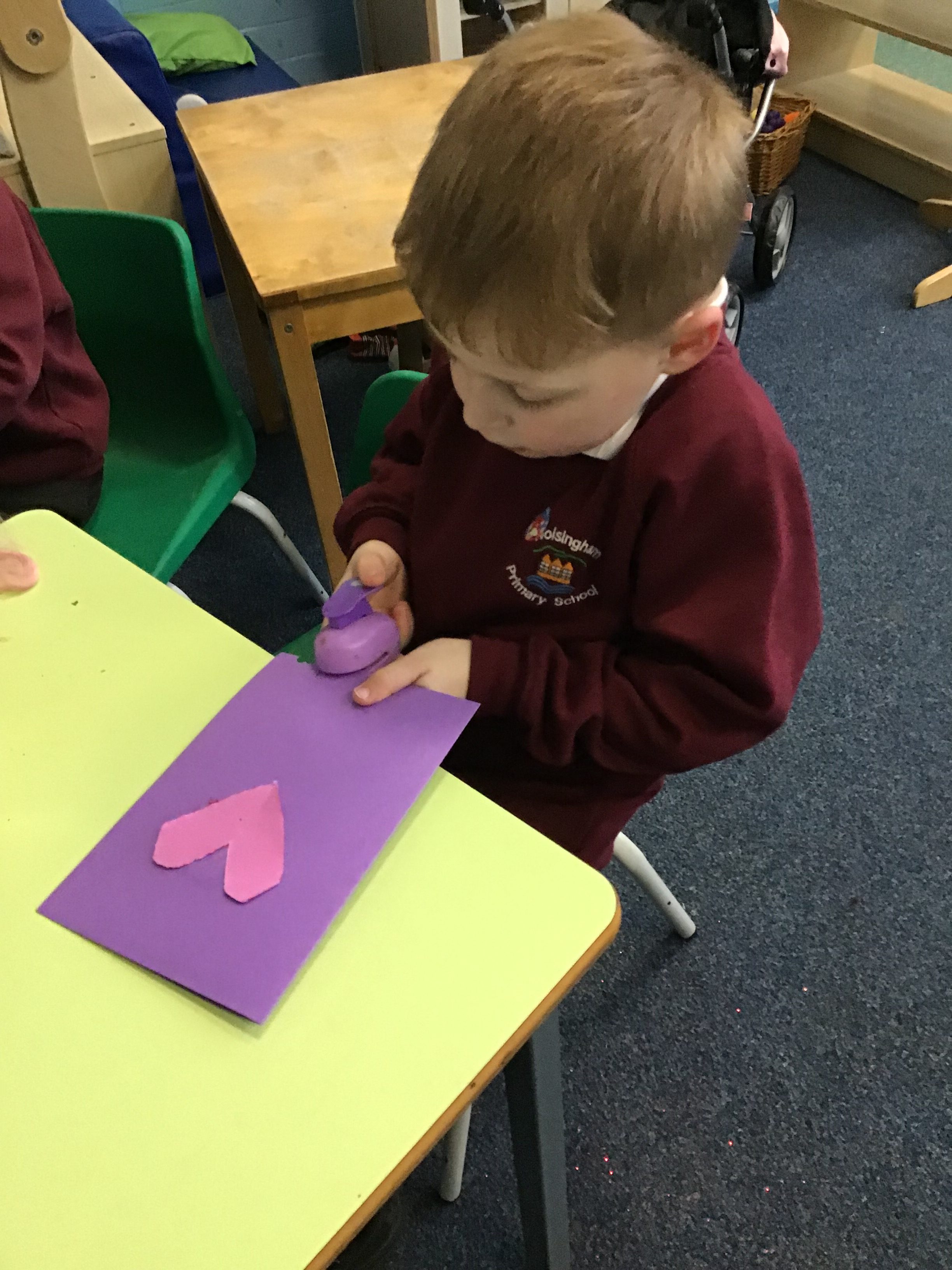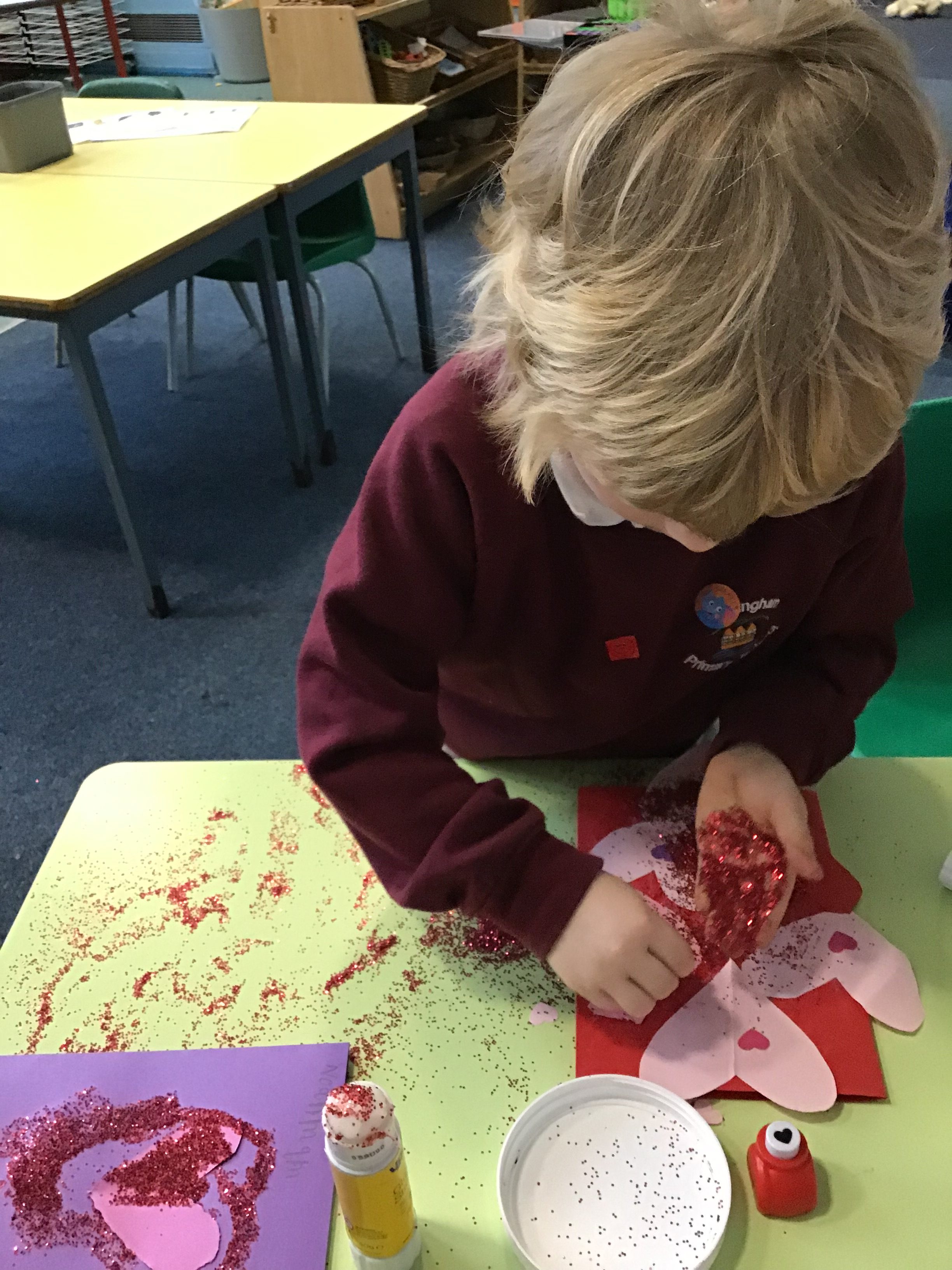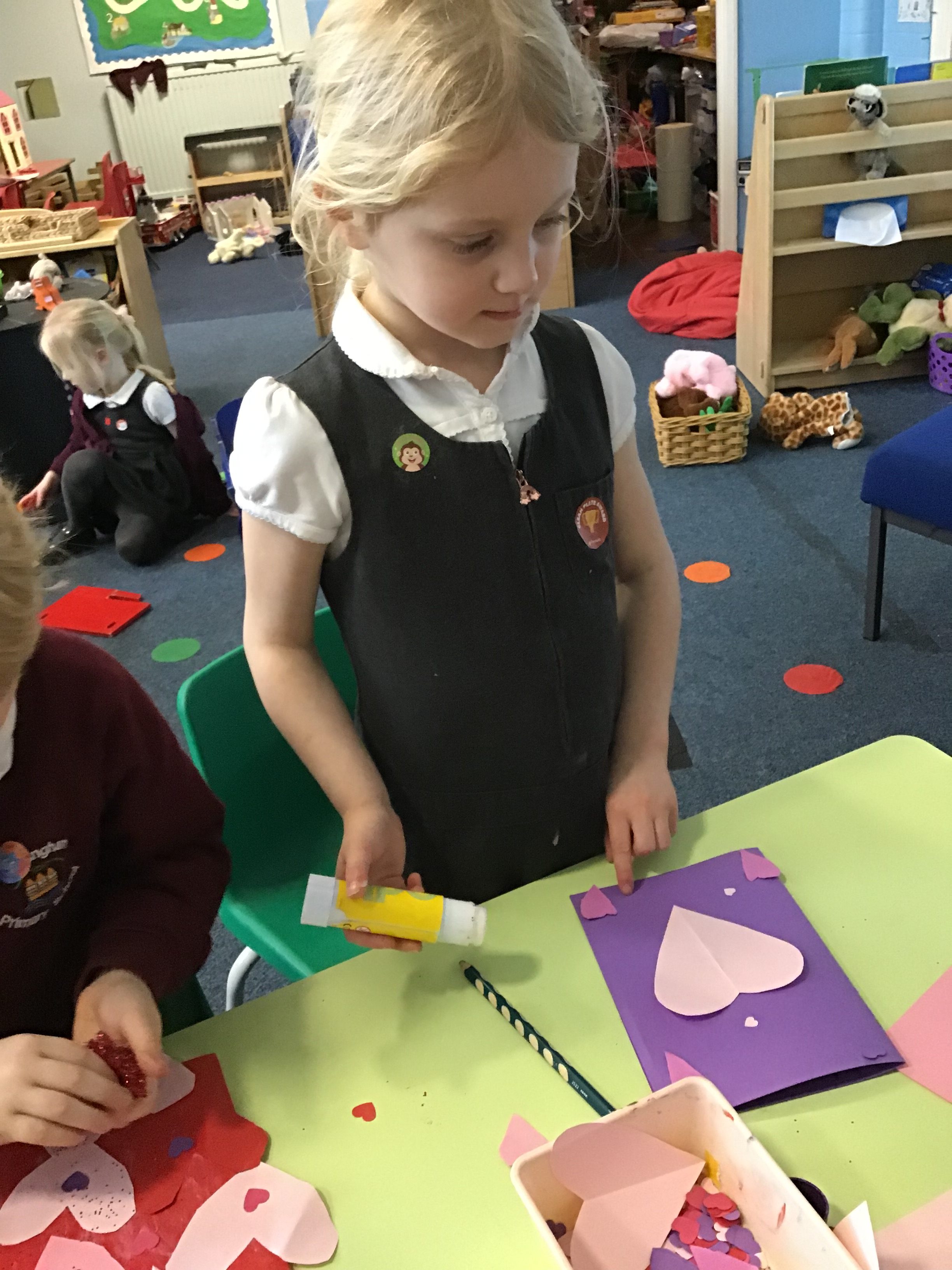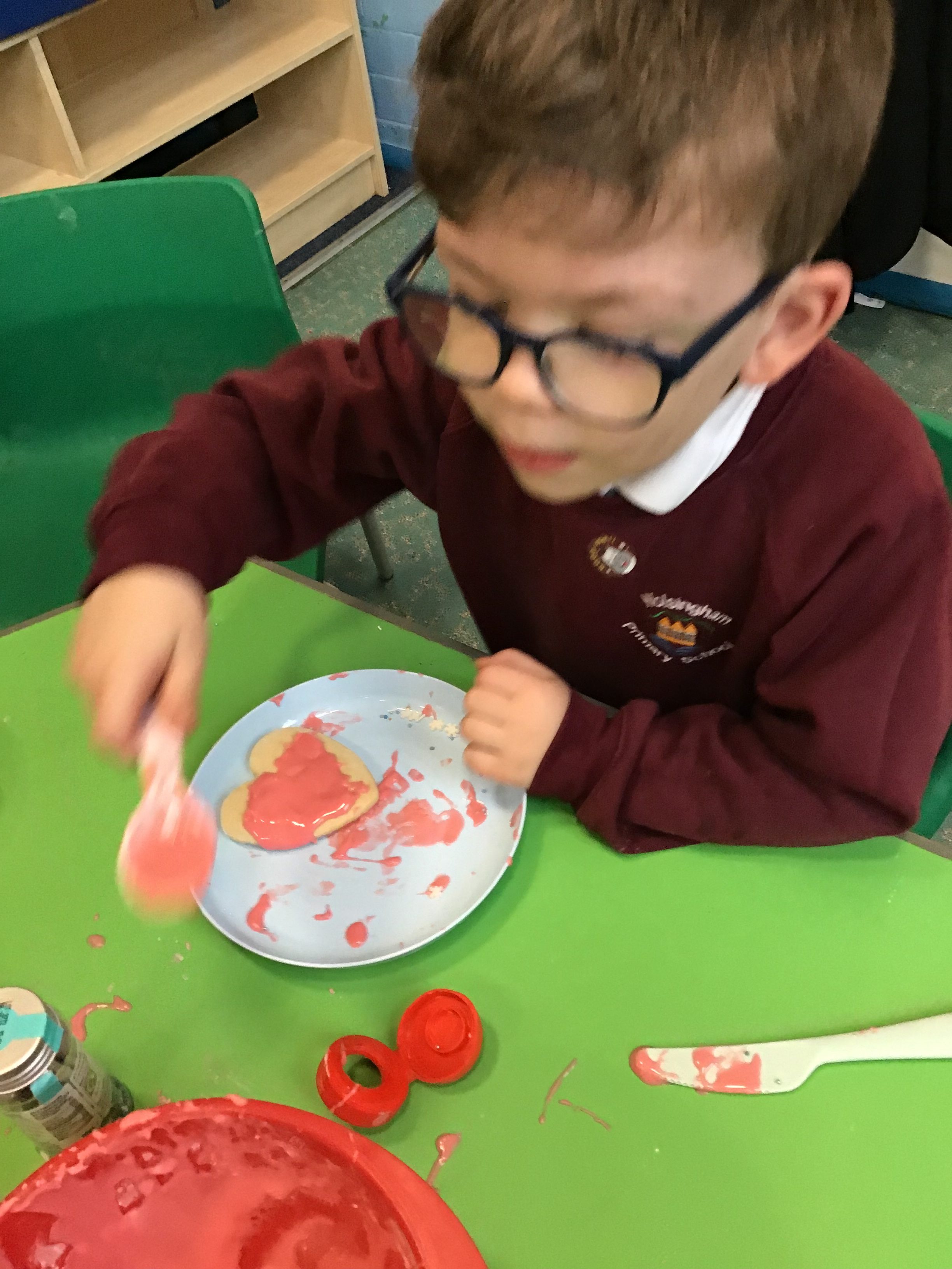 We celebrated Valentine’s Day by making biscuits. We rolled out the dough and used a cutter to make heart-shaped biscuits. We added pink icing and sprinkles and gave them to someone special. The children also made their own cards to give to someone they love.