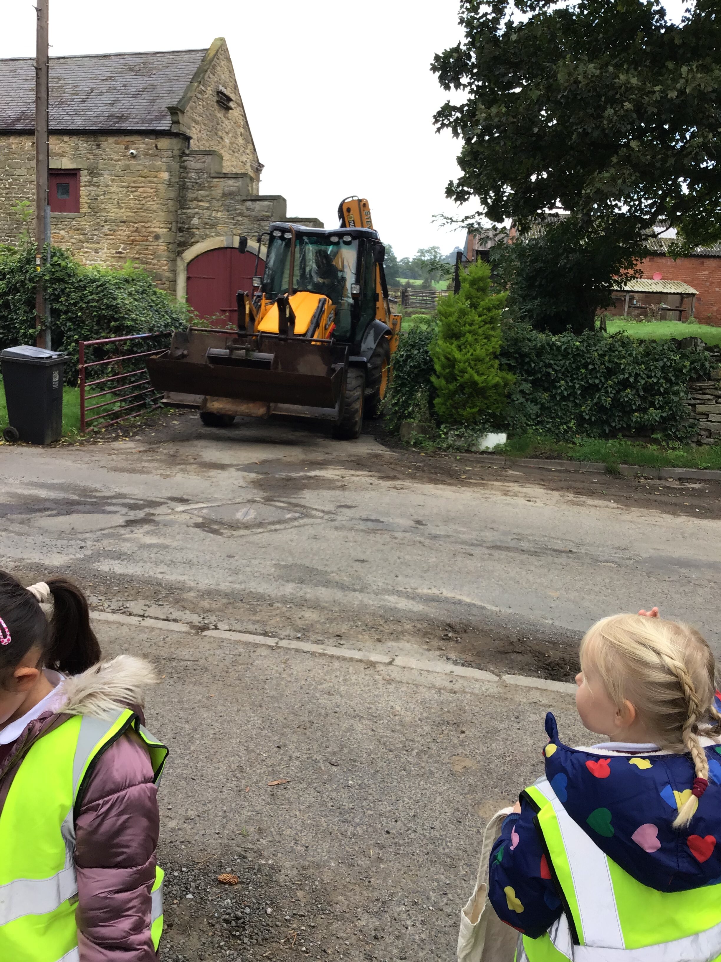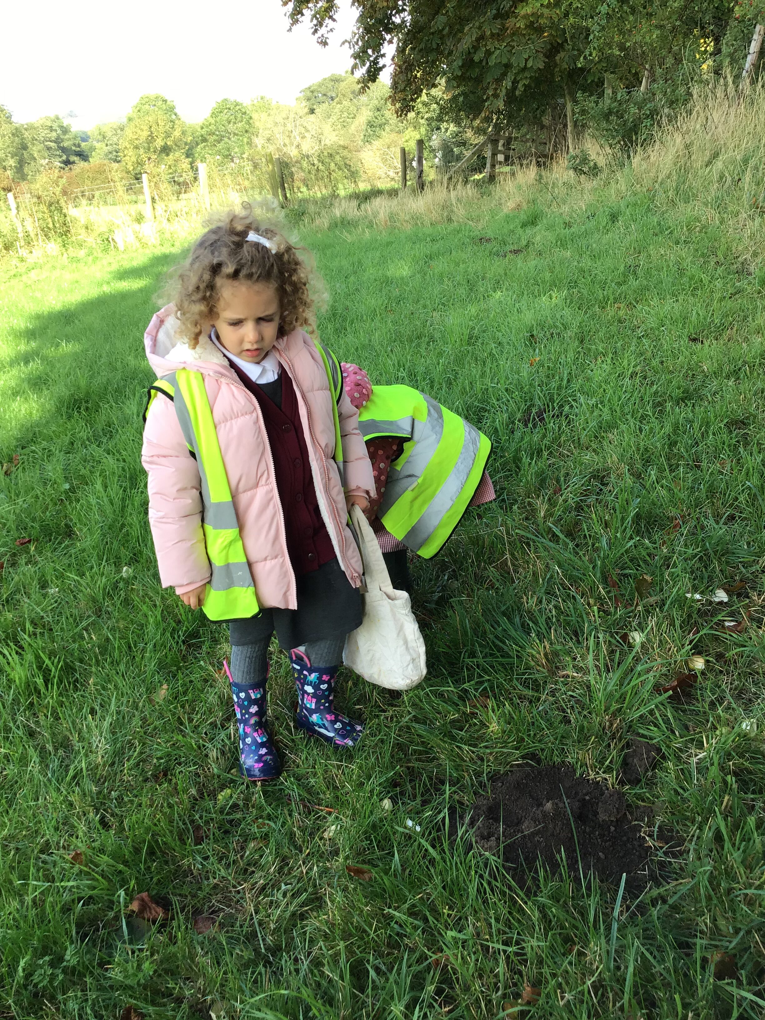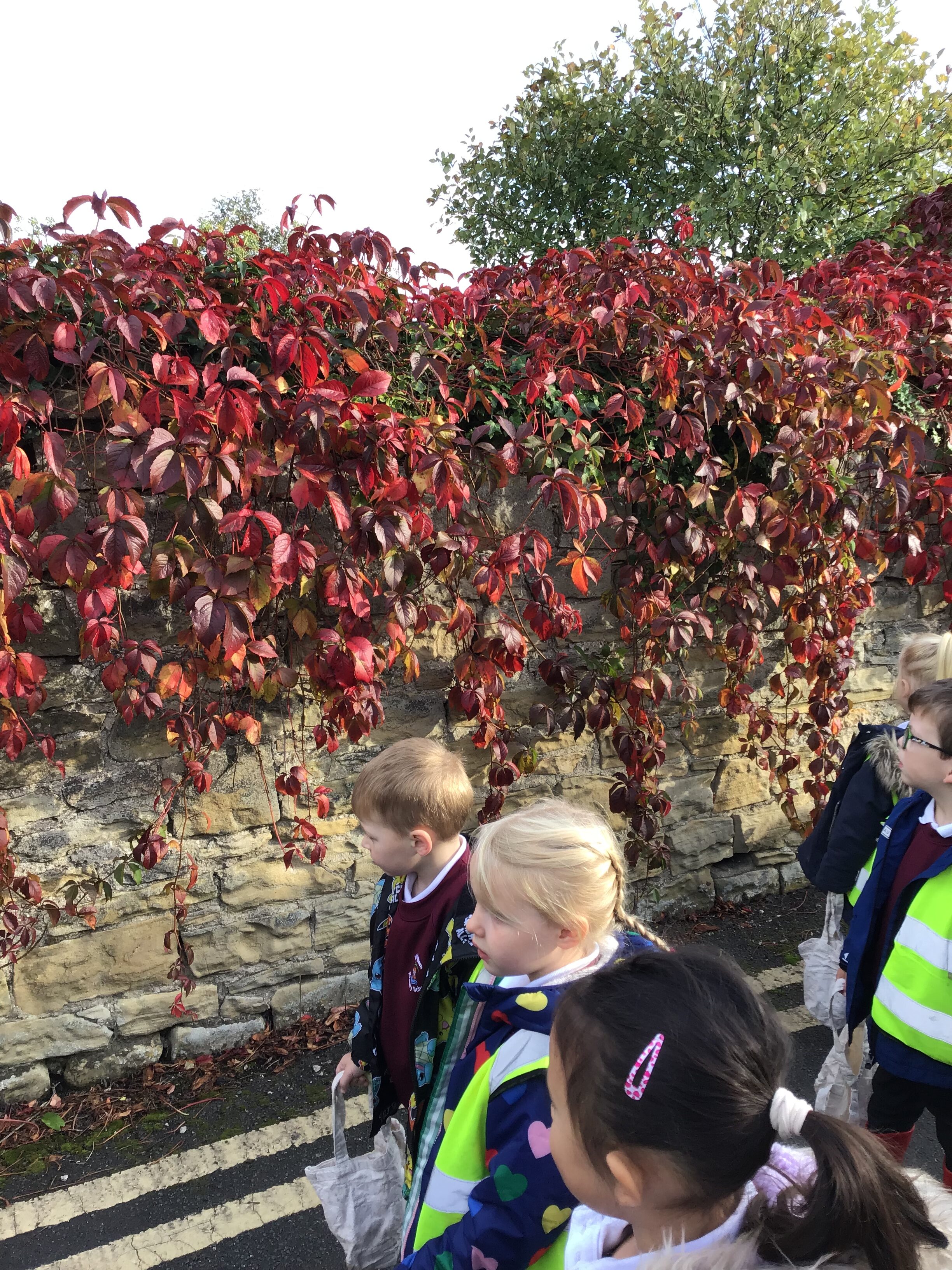 Reception Class went out for a lovely walk this week looking for signs of autumn. They were asked to use their senses of hearing and sight as they walked along. They found lots of different coloured leaves, feathers, berries, apples growing on trees and mushrooms growing on tree stumps. They heard cars, the running water of the stream, a digger, birds squawking, the wind rustling the trees and children playing.