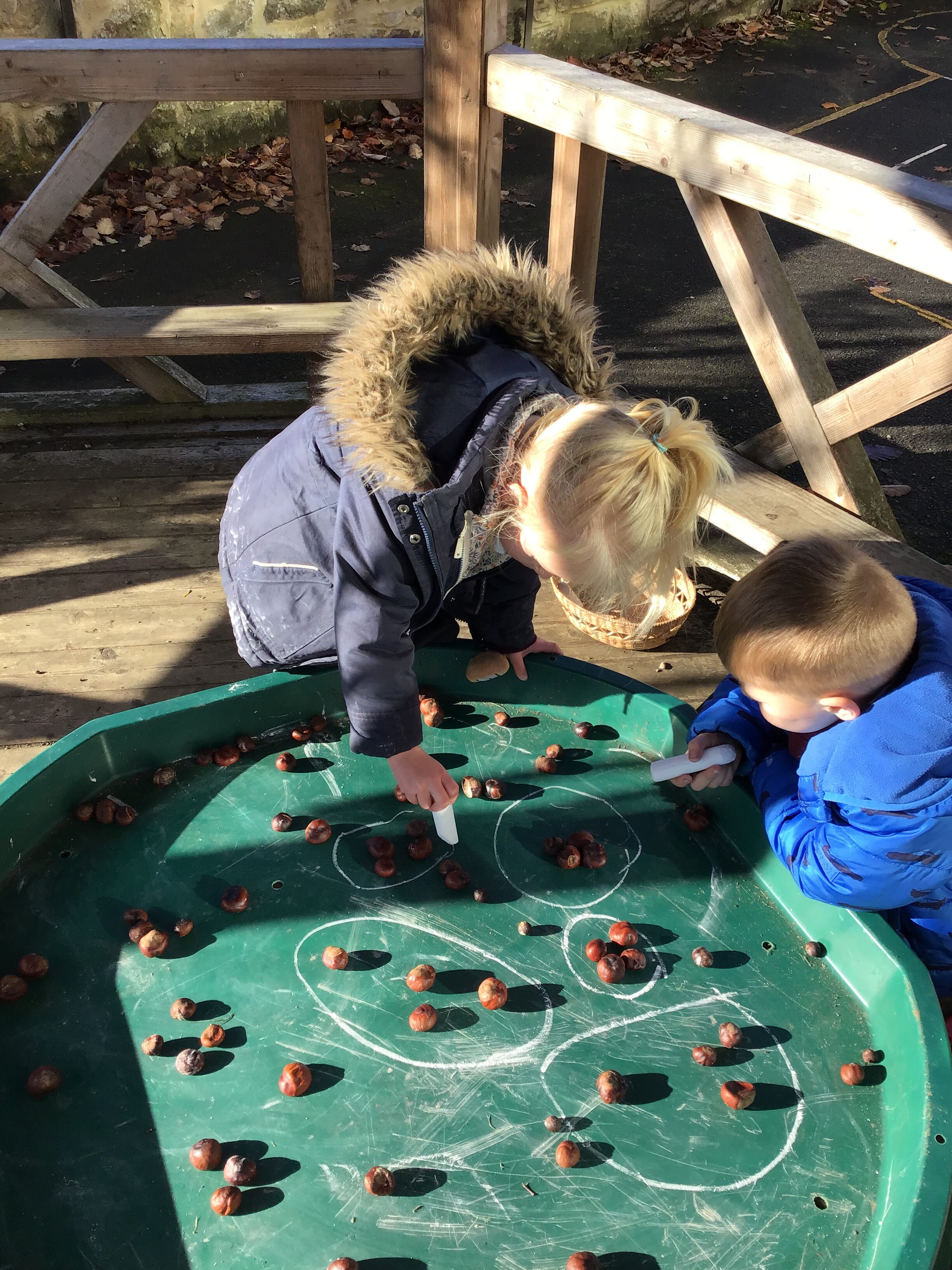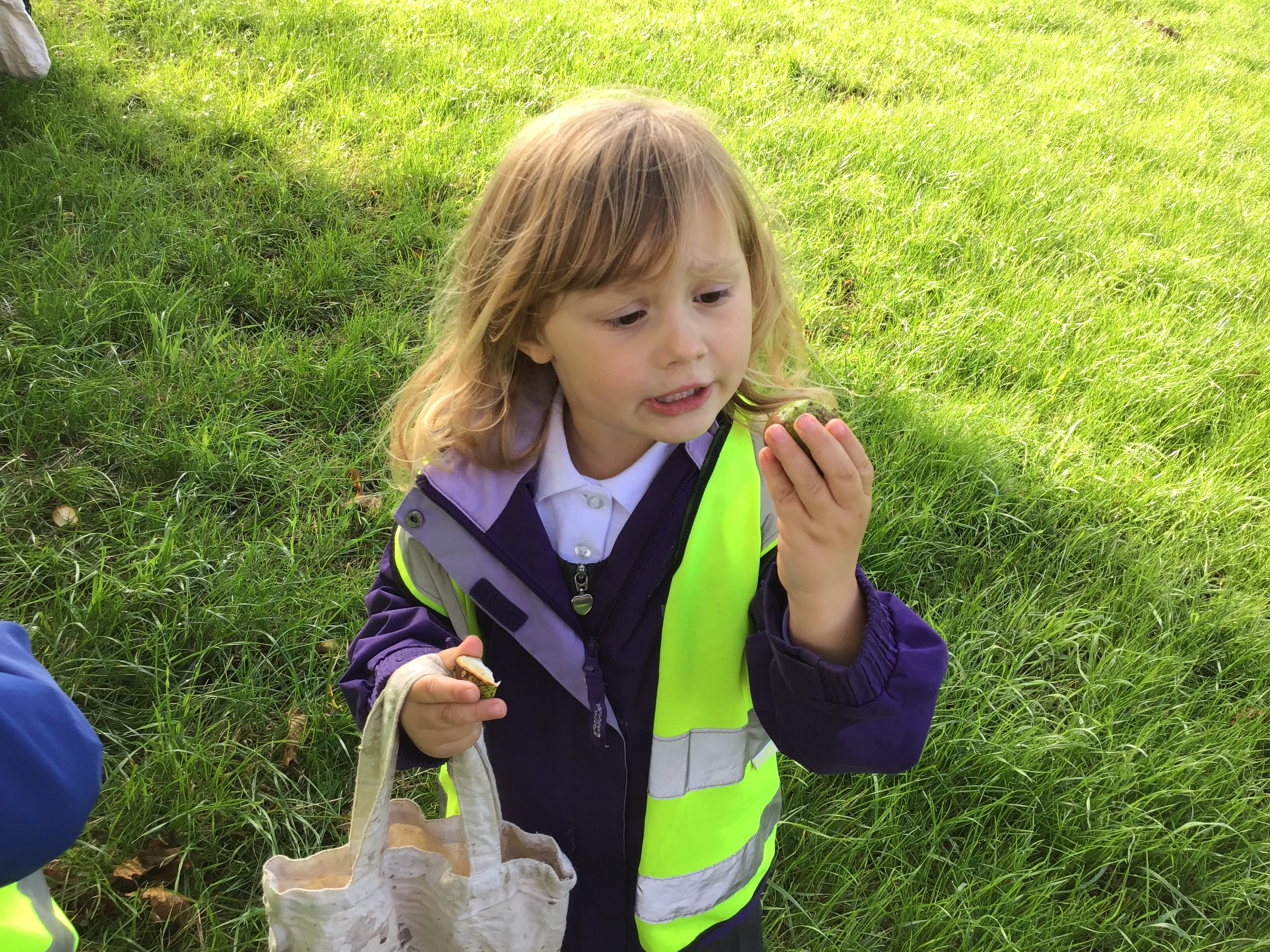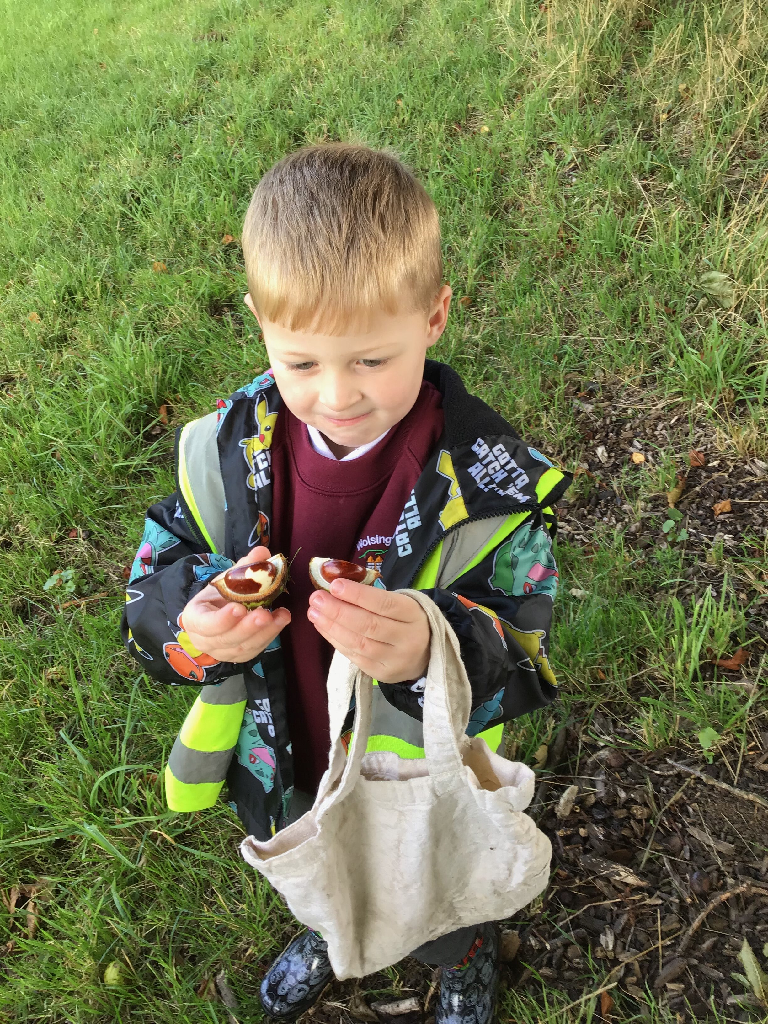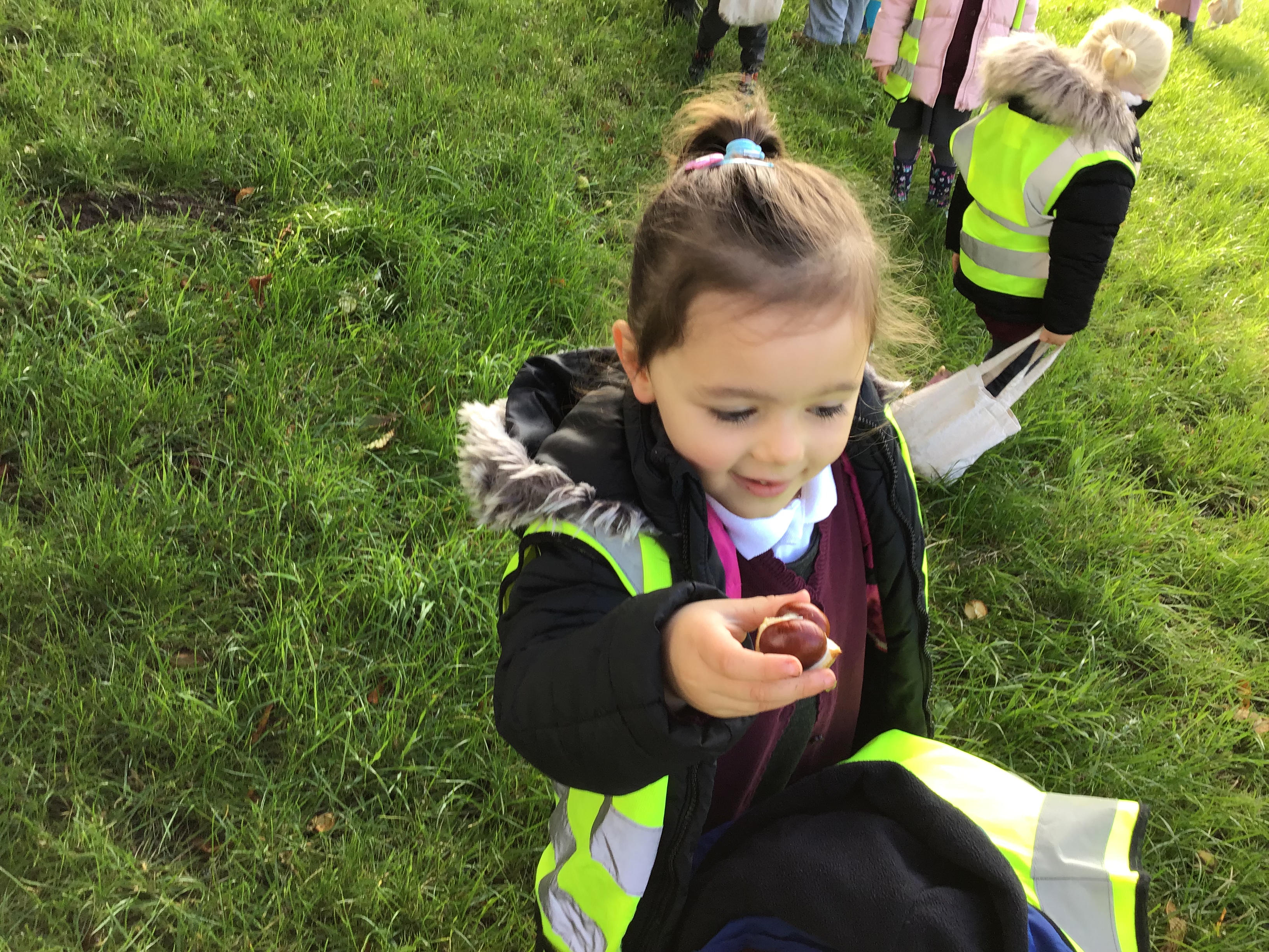 And of course they found lots of conkers and collected them. We talked about the green prickly shells that the conkers are in and then they were amazed by the round, shiny brown conkers inside. Some children even got “doublers” with 2 conkers inside.