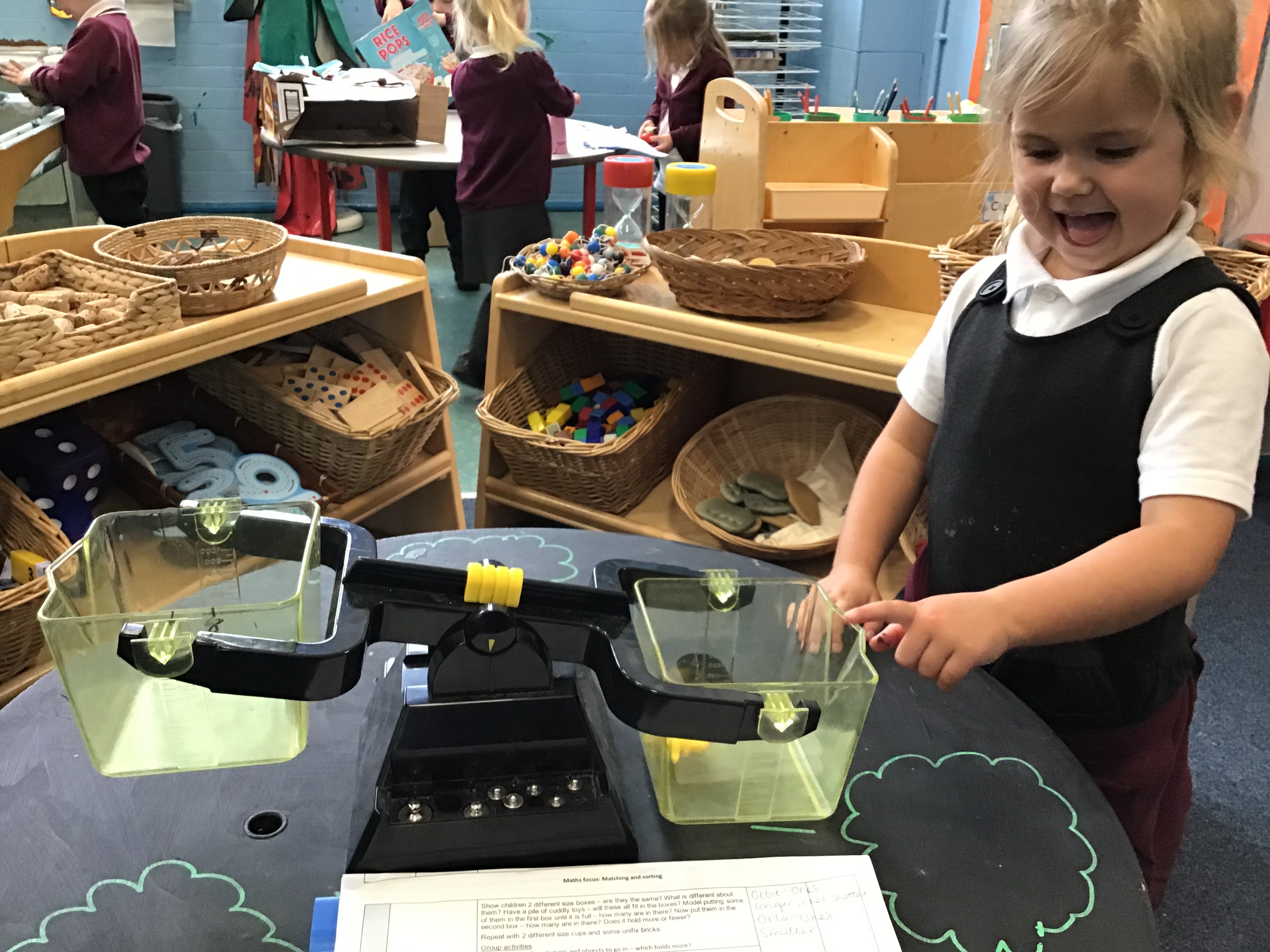 This week in maths, the children have been exploring the concepts of ‘more’ and ‘less’ in different contexts. They compared boxes and filled them with bricks to see which box holds more. They built towers that were ‘taller’ or ‘shorter’ than the one the teacher had made. They used balance scales to compare two objects and see which one weighed more (heavier and lighter).