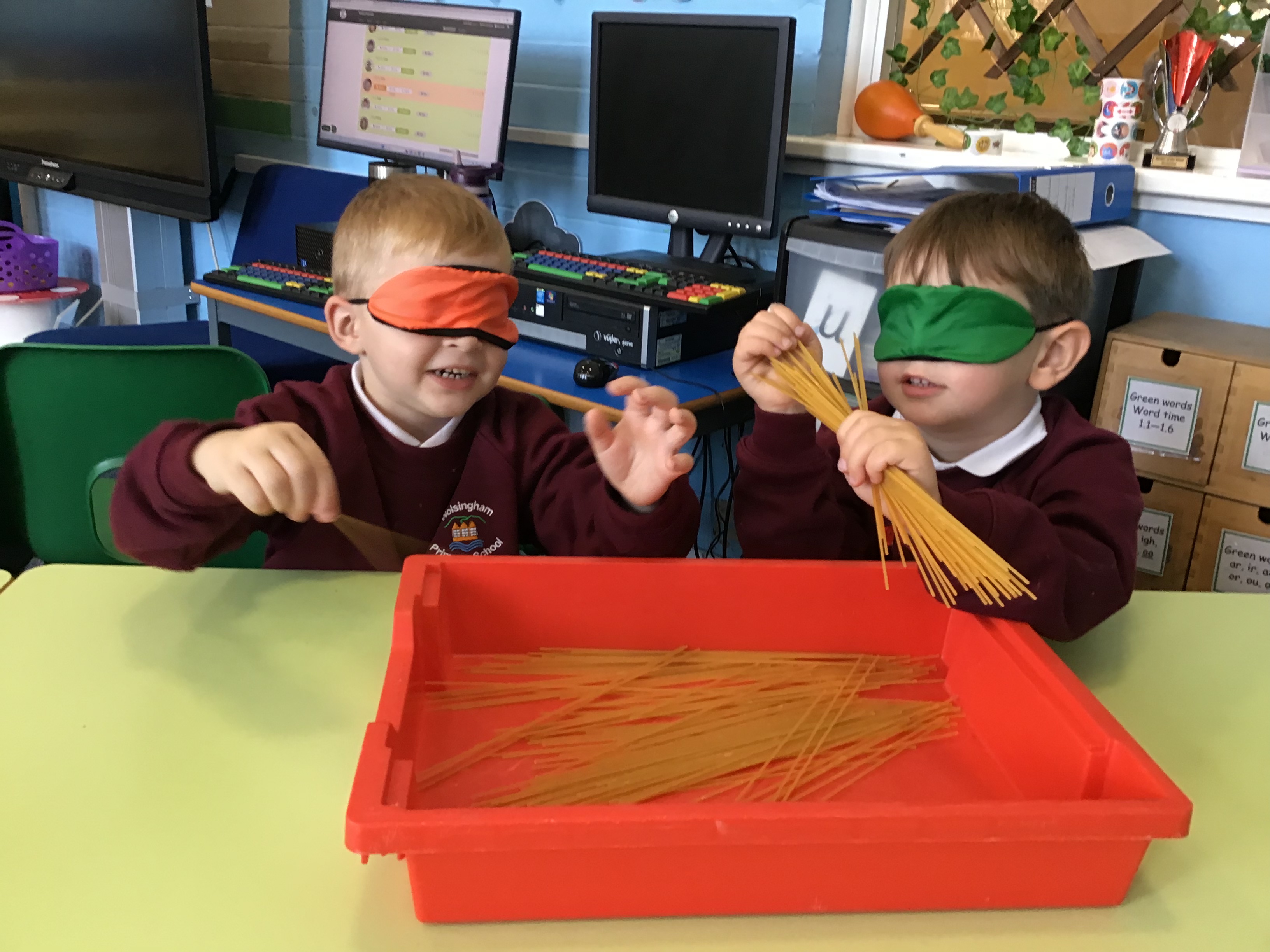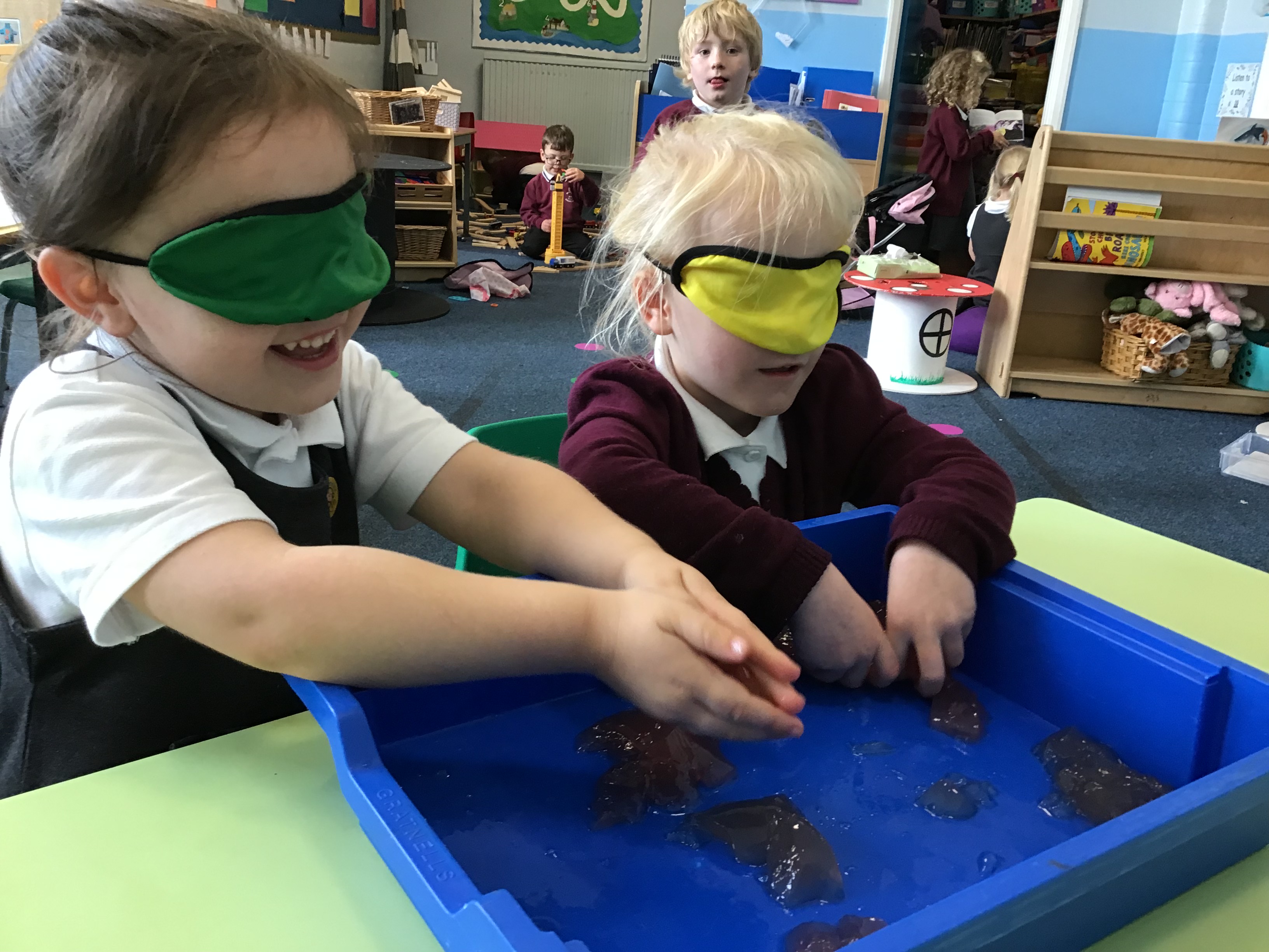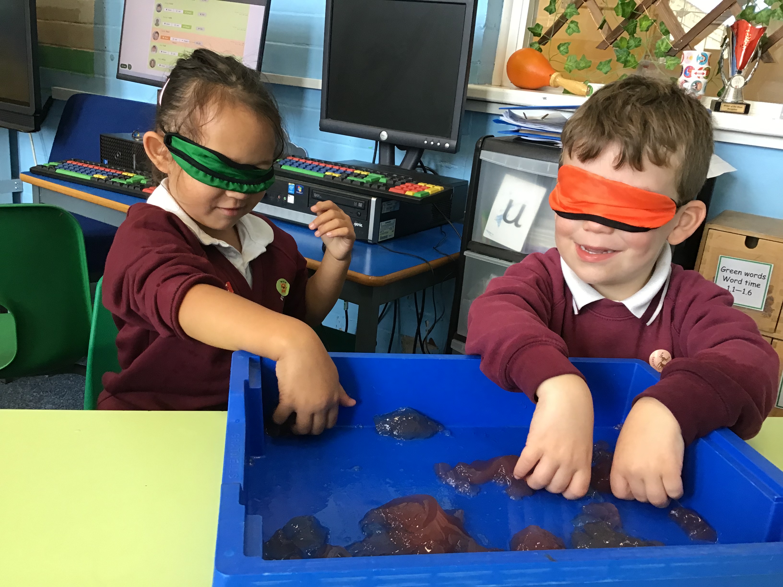 In Reception Class we have been learning to name parts of the body and about the 5 senses. The children had lots of fun using their sense of touch to work out what was in the trays. They used their language skills to describe what they could feel. Here are some examples of what the children said: