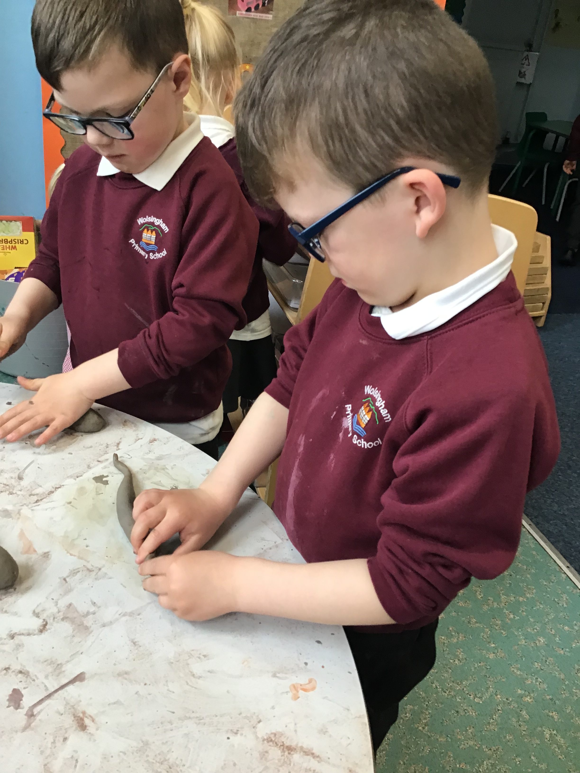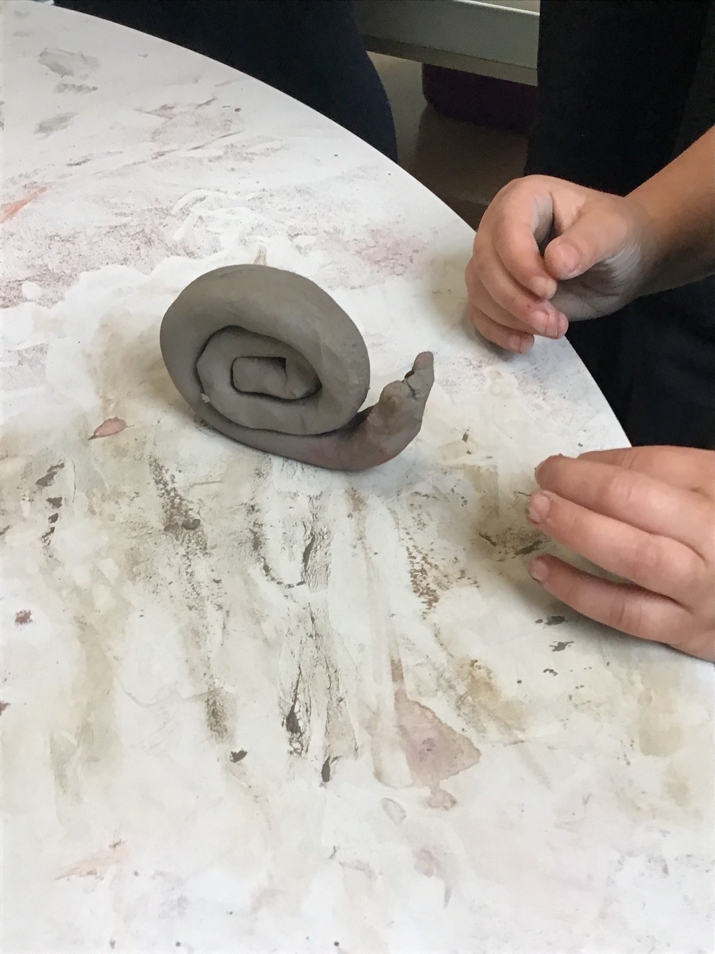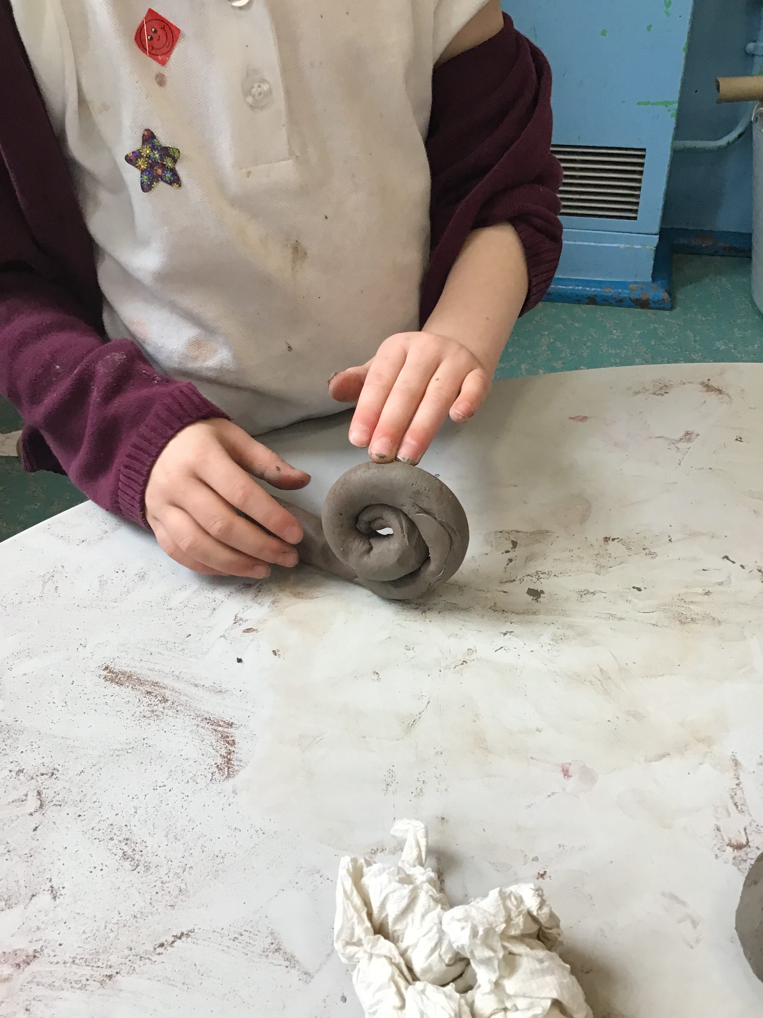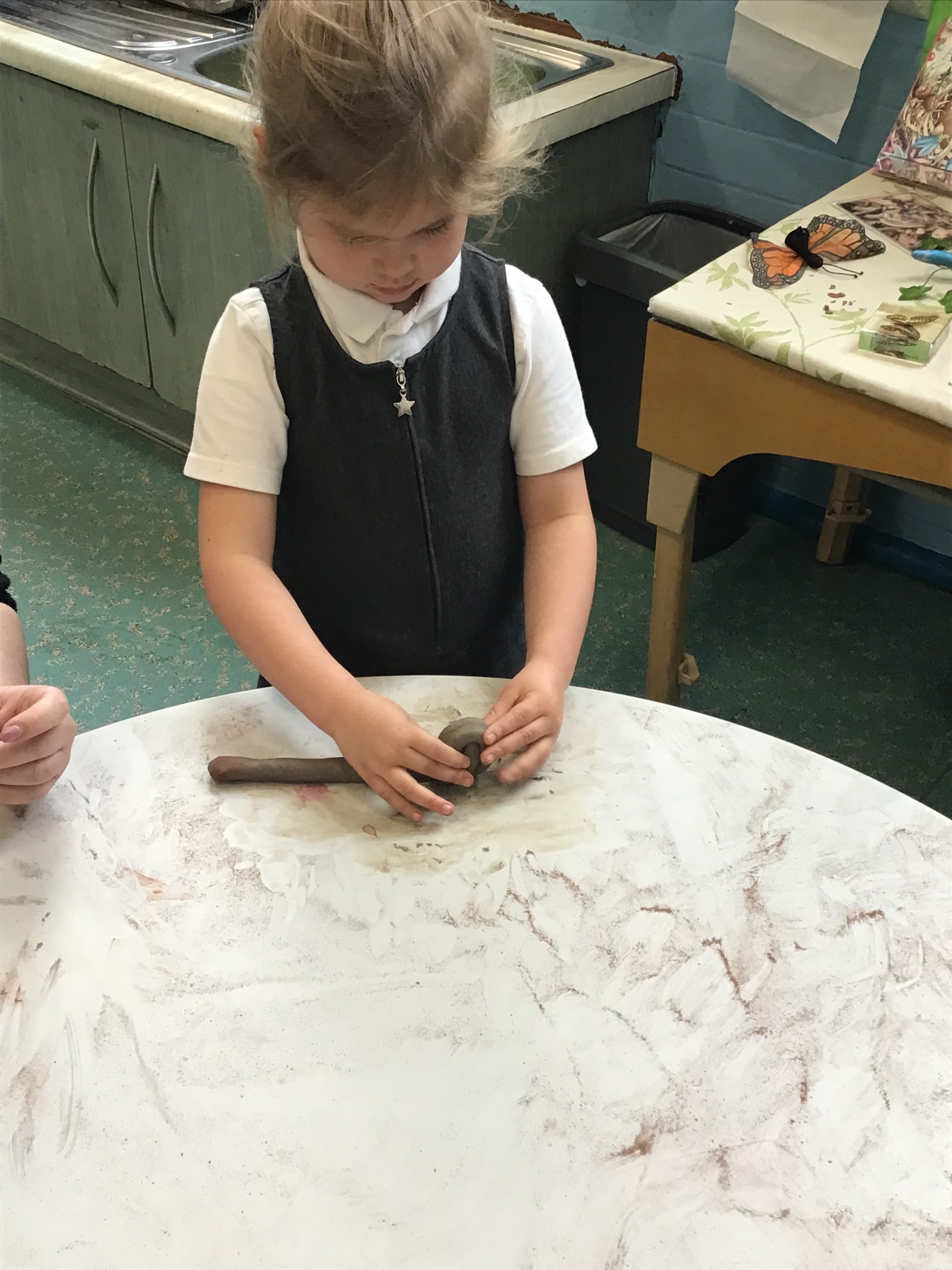 The Reception children made sculptures of snails using clay. They squeezed the clay until it was soft, then they rolled it into a long, thin sausage shape. They curled then curled the dough to create the shell shape and finally pinched the ends to make antennae. Squeezing, rolling and pinching are all actions we practise regularly in our dough disco sessions, as they help build finger strength.