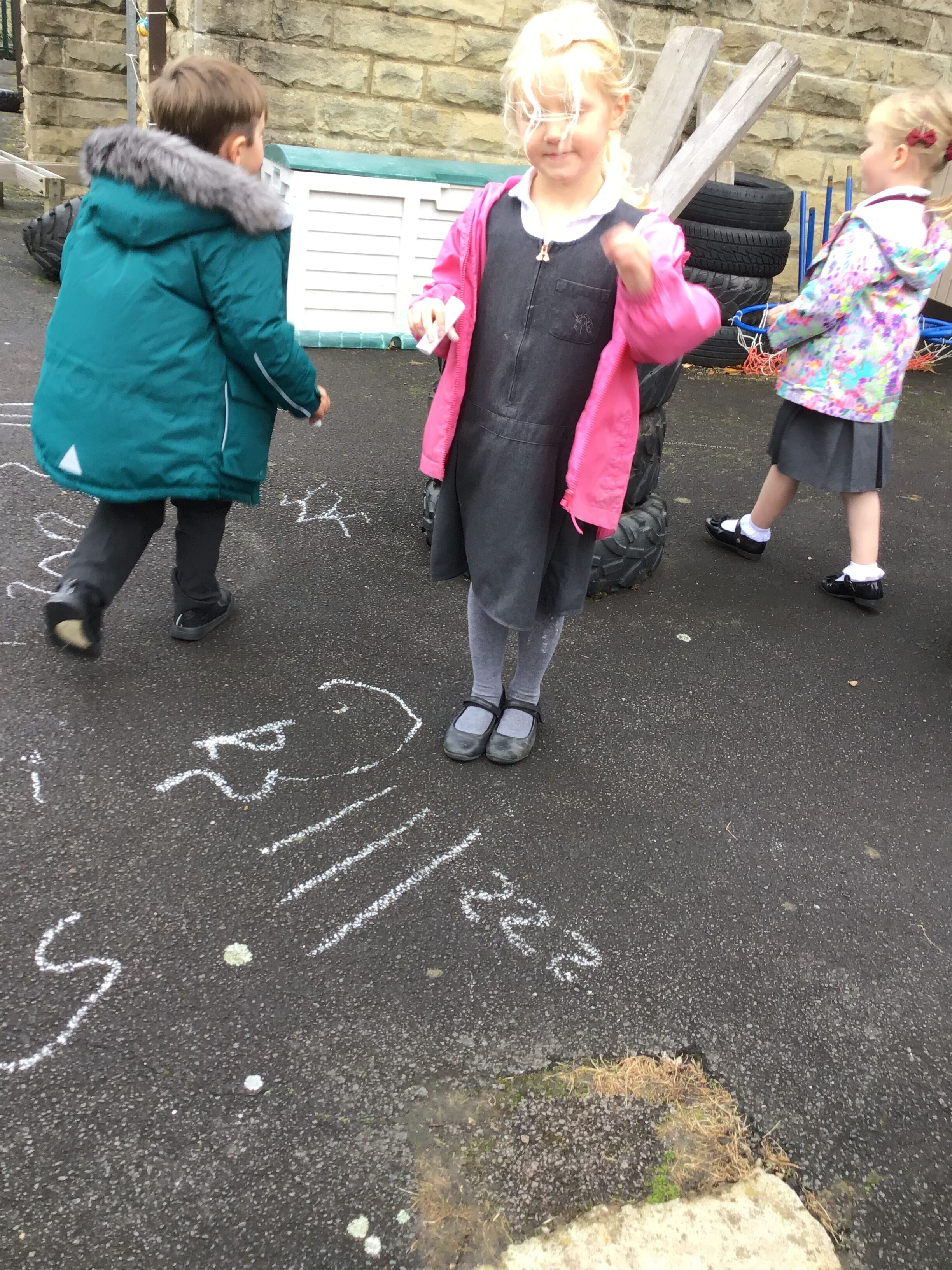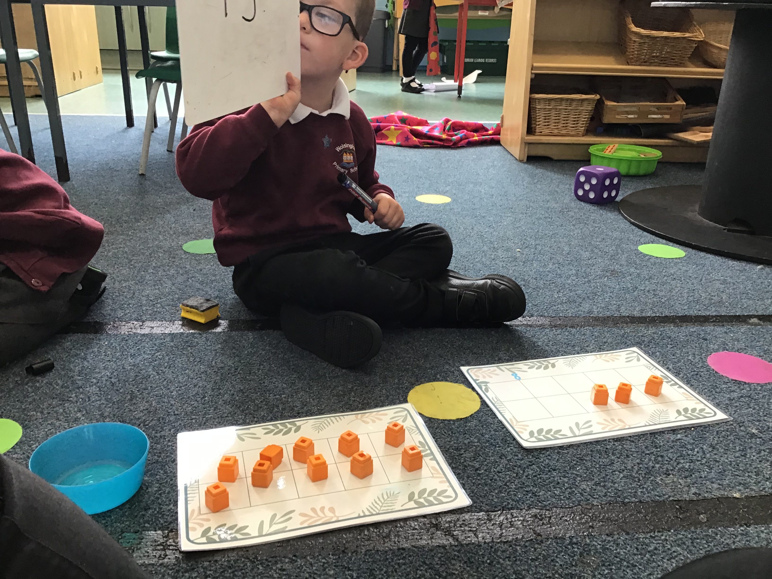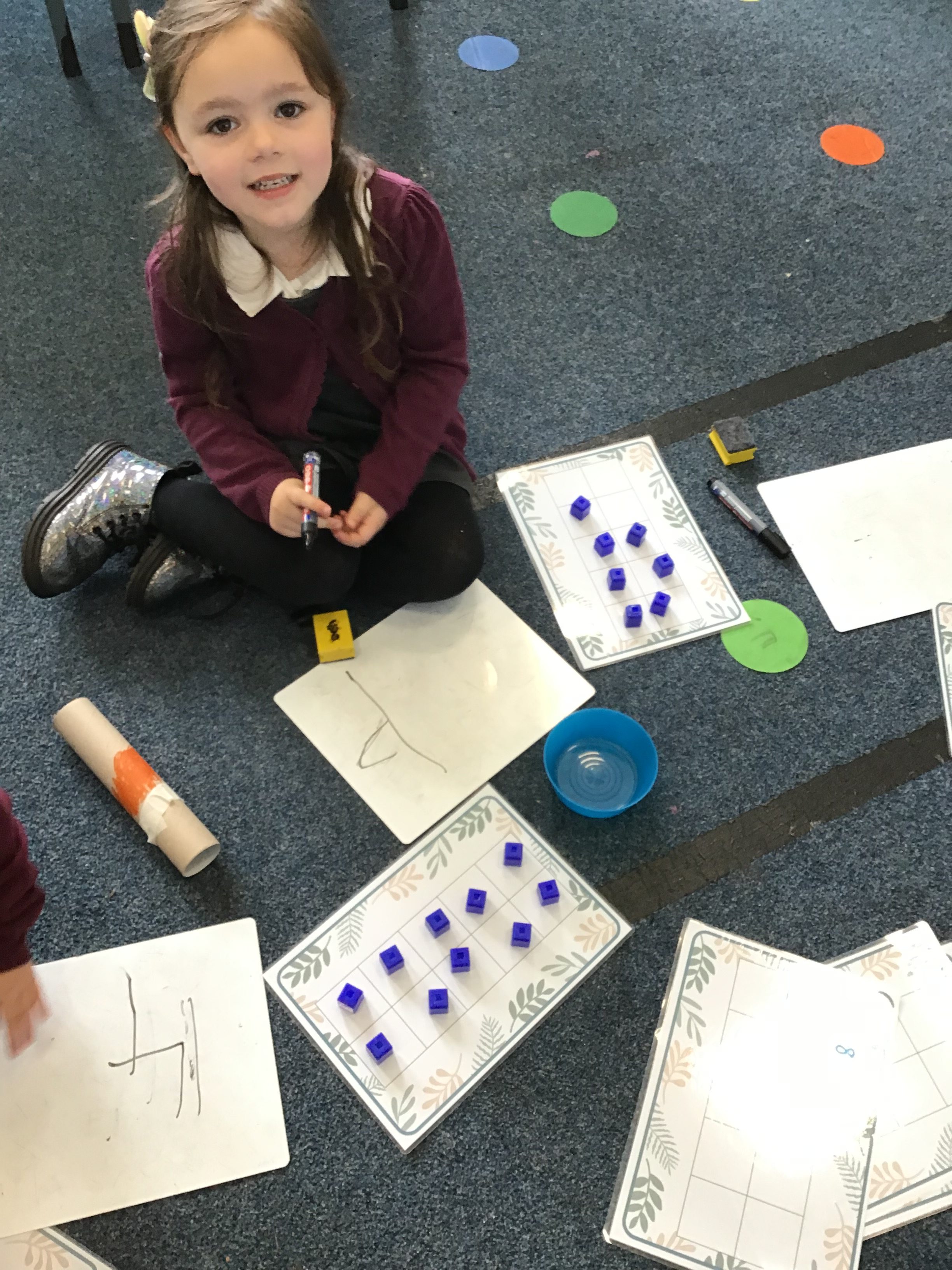 The children have been exploring 5 this week. They have been learning what 5 looks like on a 5 frame and representing 5 in different ways. We used the Ten Town character Fiona Five to practice recognising the numeral 5 and writing it. They also played games to explore the composition of the amount 5, e.g. “3 and 2 make 5”, “4 and 1 make 5” or “2 and 2 and 1 make 5”.