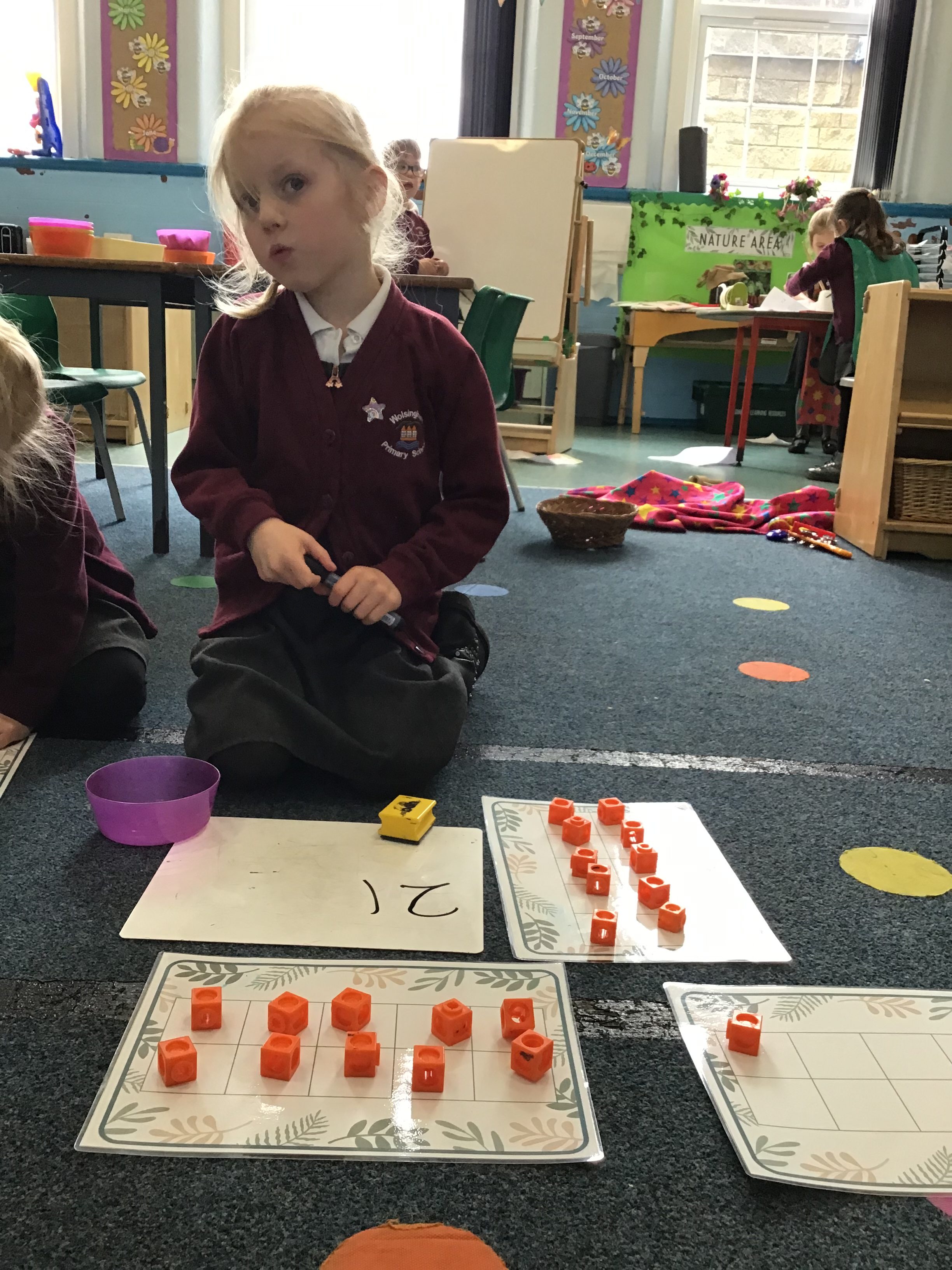 In maths this week, Reception Class have been learning all about 1 and 2. They learnt to recognize the amounts 1 and 2 on sight without counting (this is called subitizing and is a very important skill). They represented the amounts 1 and 2 in different ways. We have also worked on recognizing the numerals 1 and 2 and beginning to write them. We use the Ten Town characters King One and Tommy Two to remember how to form the numerals correctly.