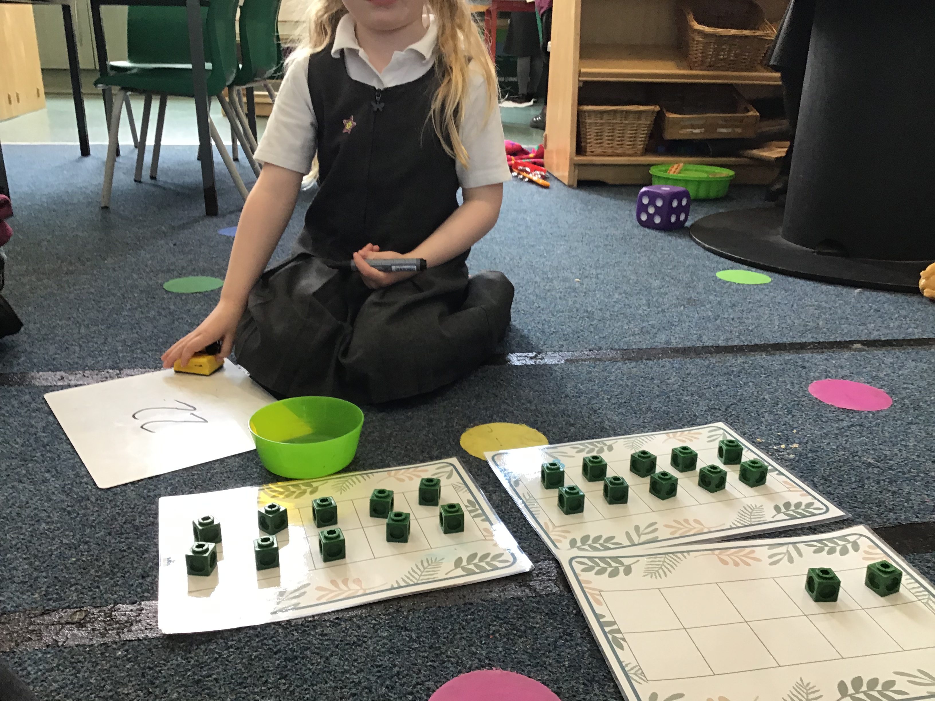 Reception children have started learning about numbers beyond 10. They used ten frames to count large amounts and write the corresponding numbers. For example, 15 is 1 full ten frame and 5 of the next one; 22 is 2 full ten frames and 2 of the next one. The children were given bowls with bears or cubes in. They placed their items on the ten frames and then write the amount by identifying how many full ten frames and how many of the next one.