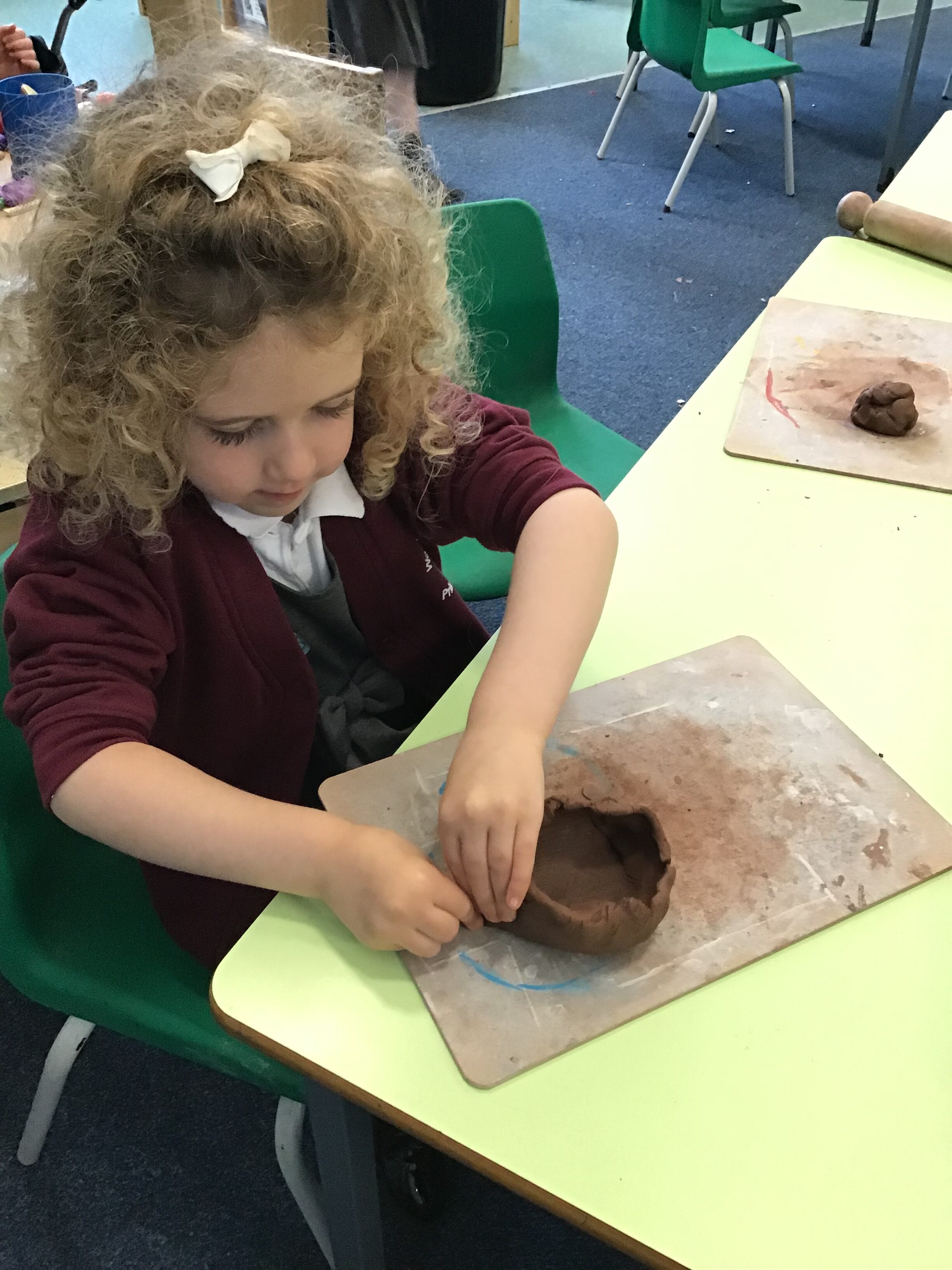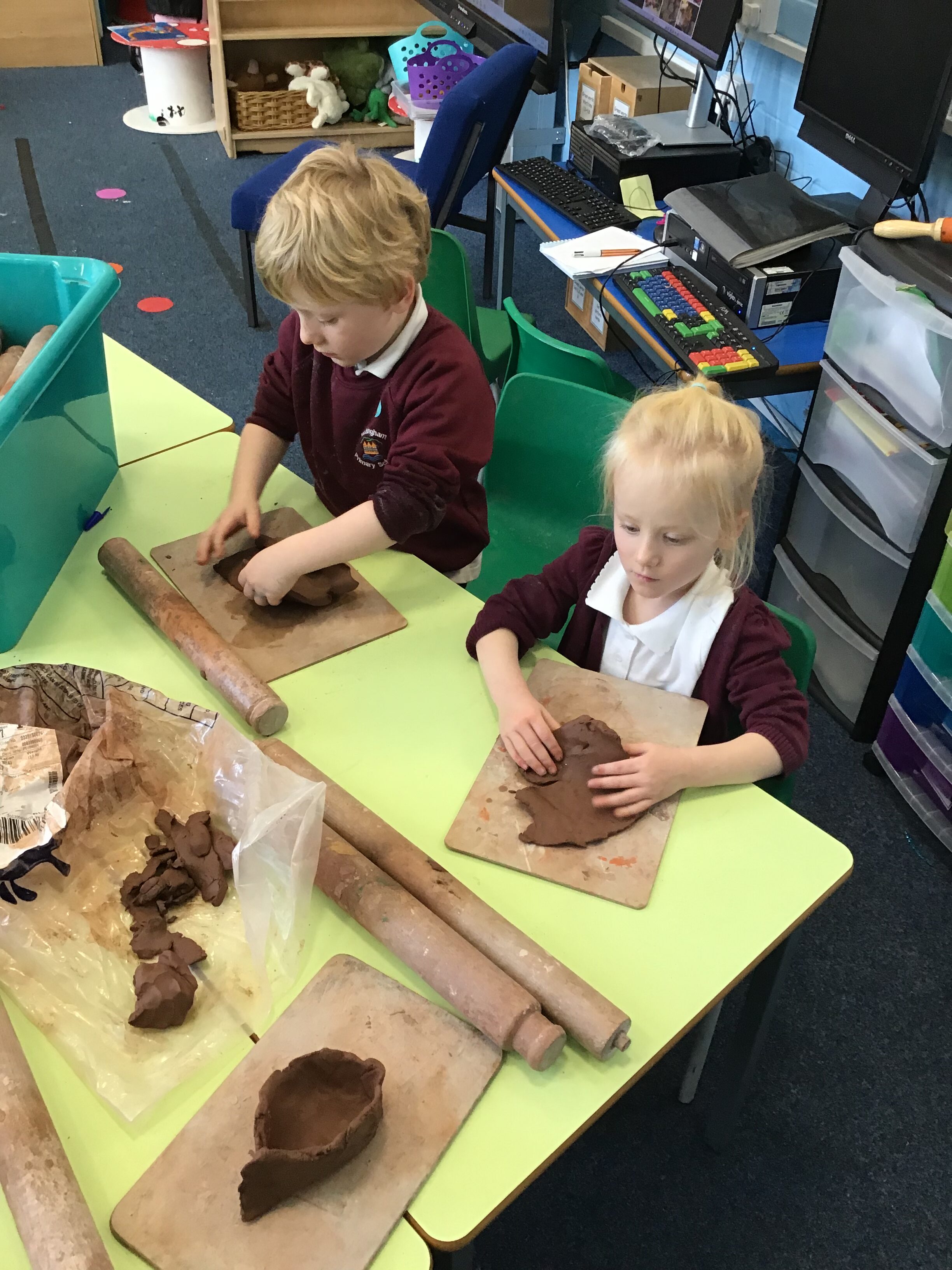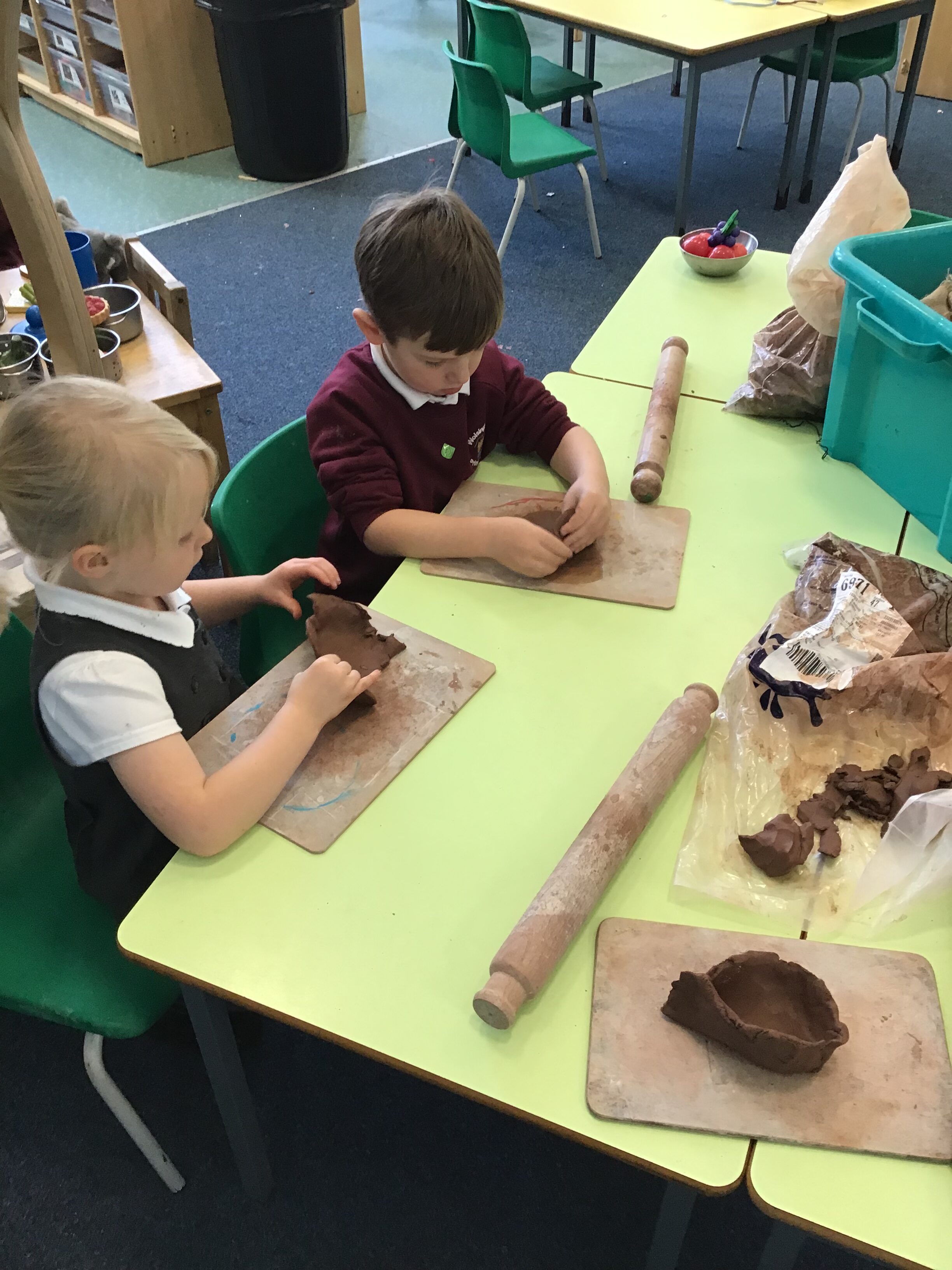 Reception Class learnt about the Hindu festival of Diwali. This festival is also called ‘The Festival of Lights’. People who celebrate Diwali often put lots of little lamps, called diva lamps, in and around their houses. The children used clay to make their own diva lamps. They rolled out the clay then pulled and squeezed it with their fingers to make the shape. The children will paint and decorate the diva lamps when the clay dries.