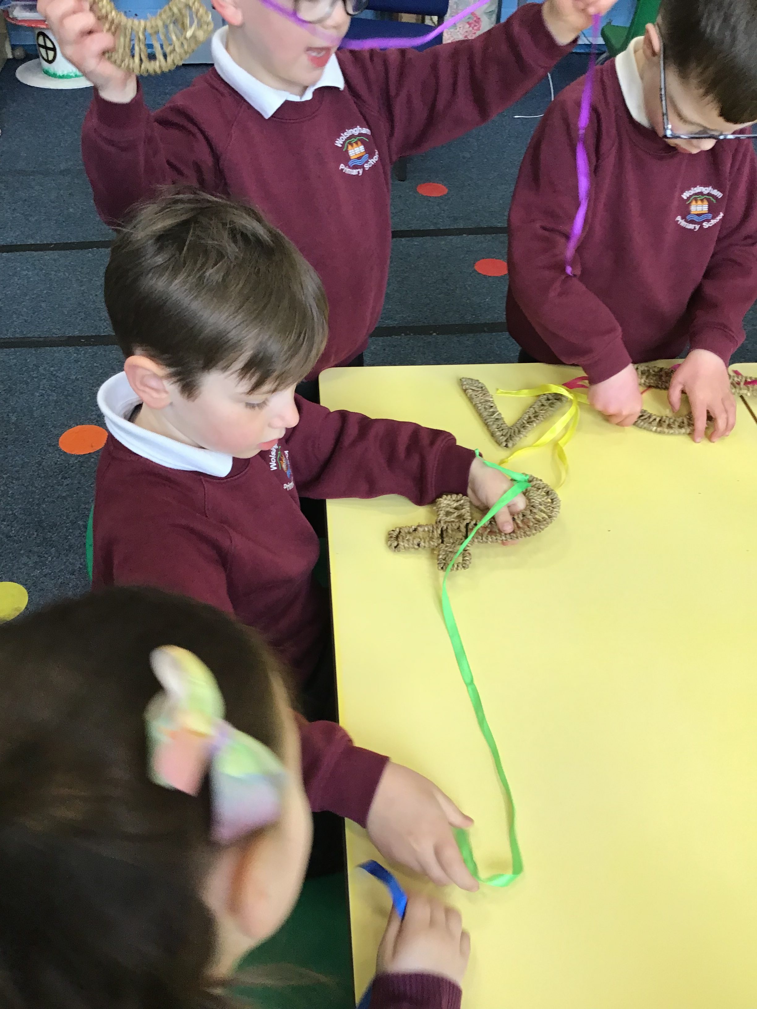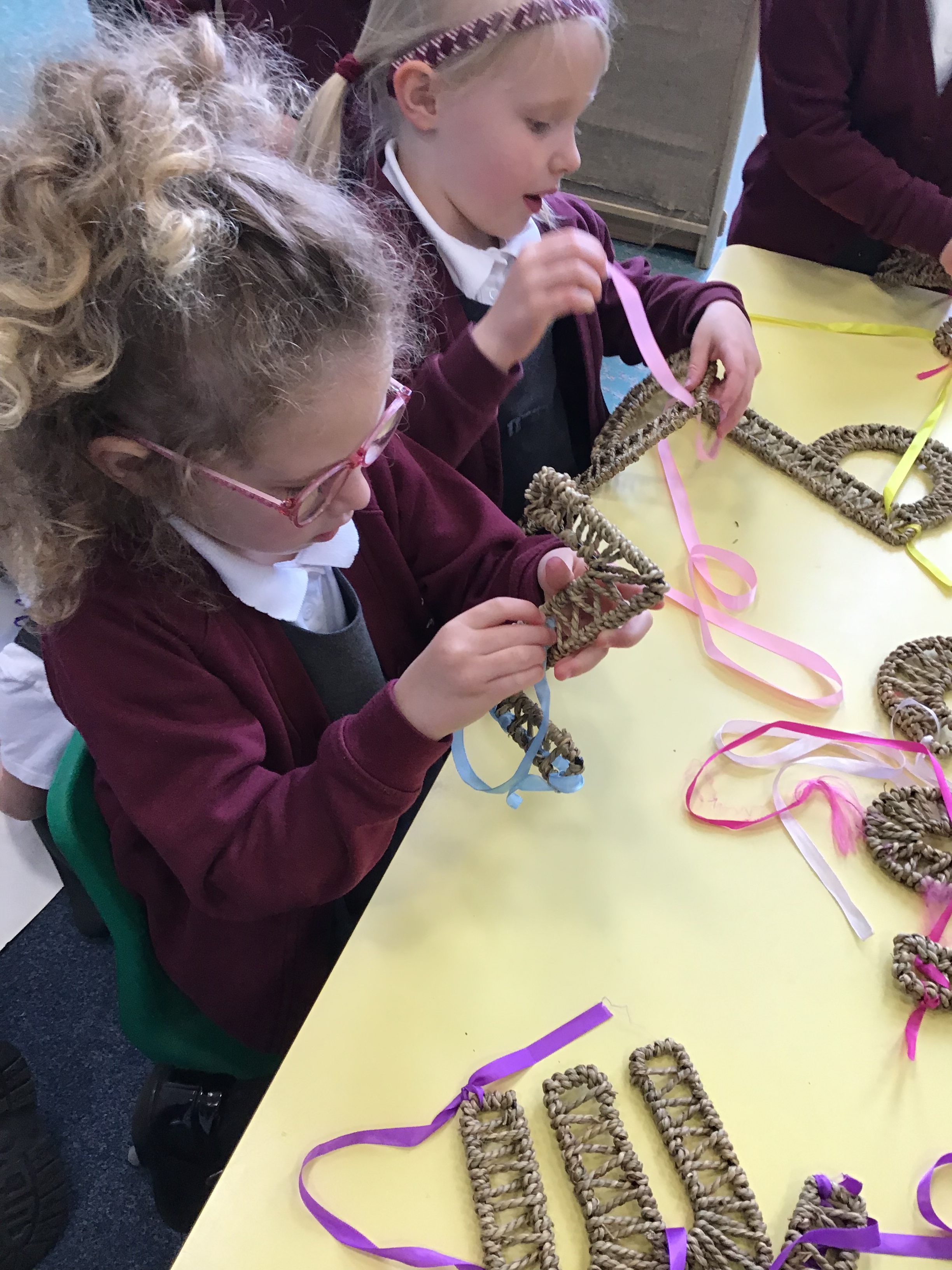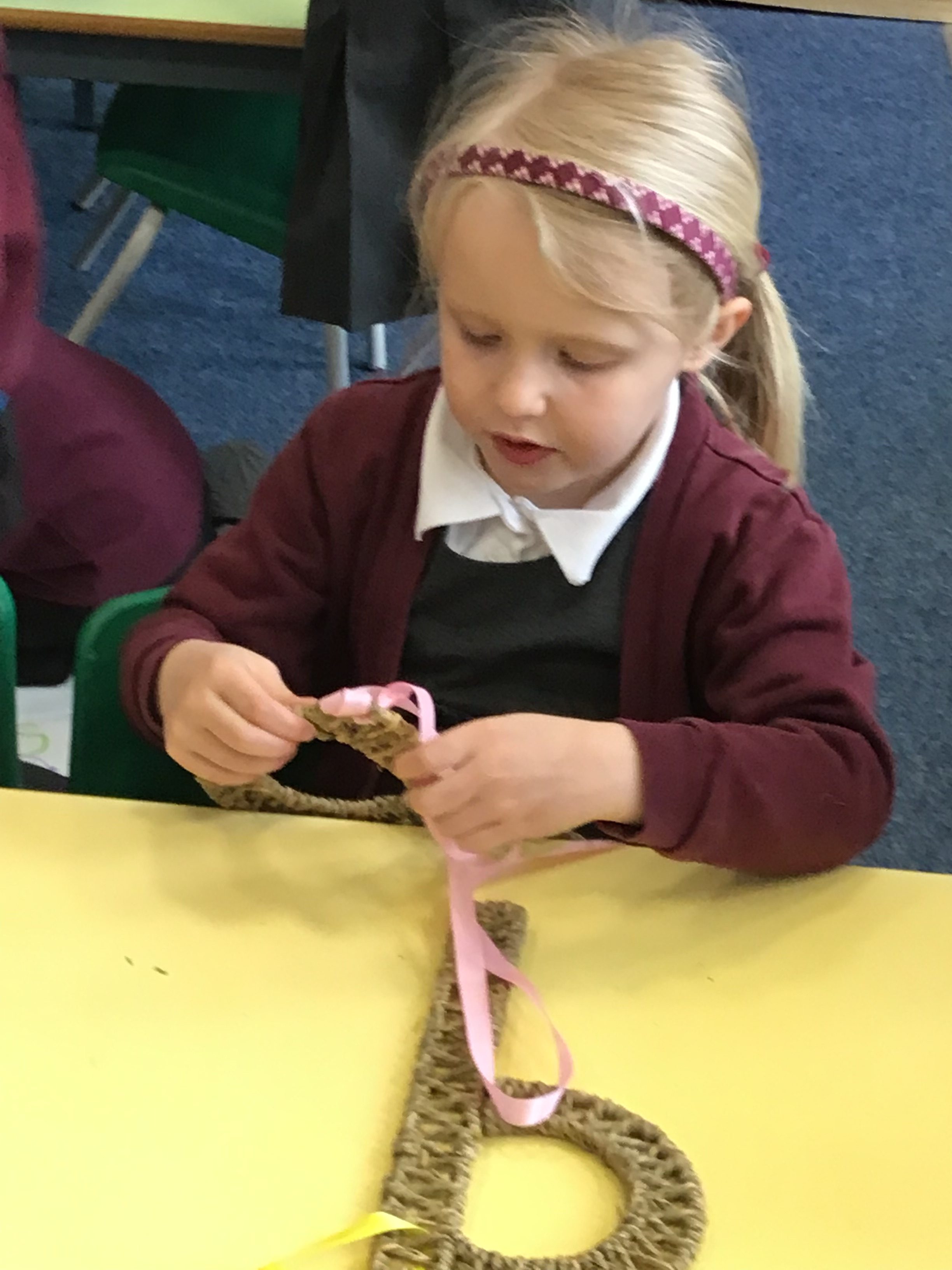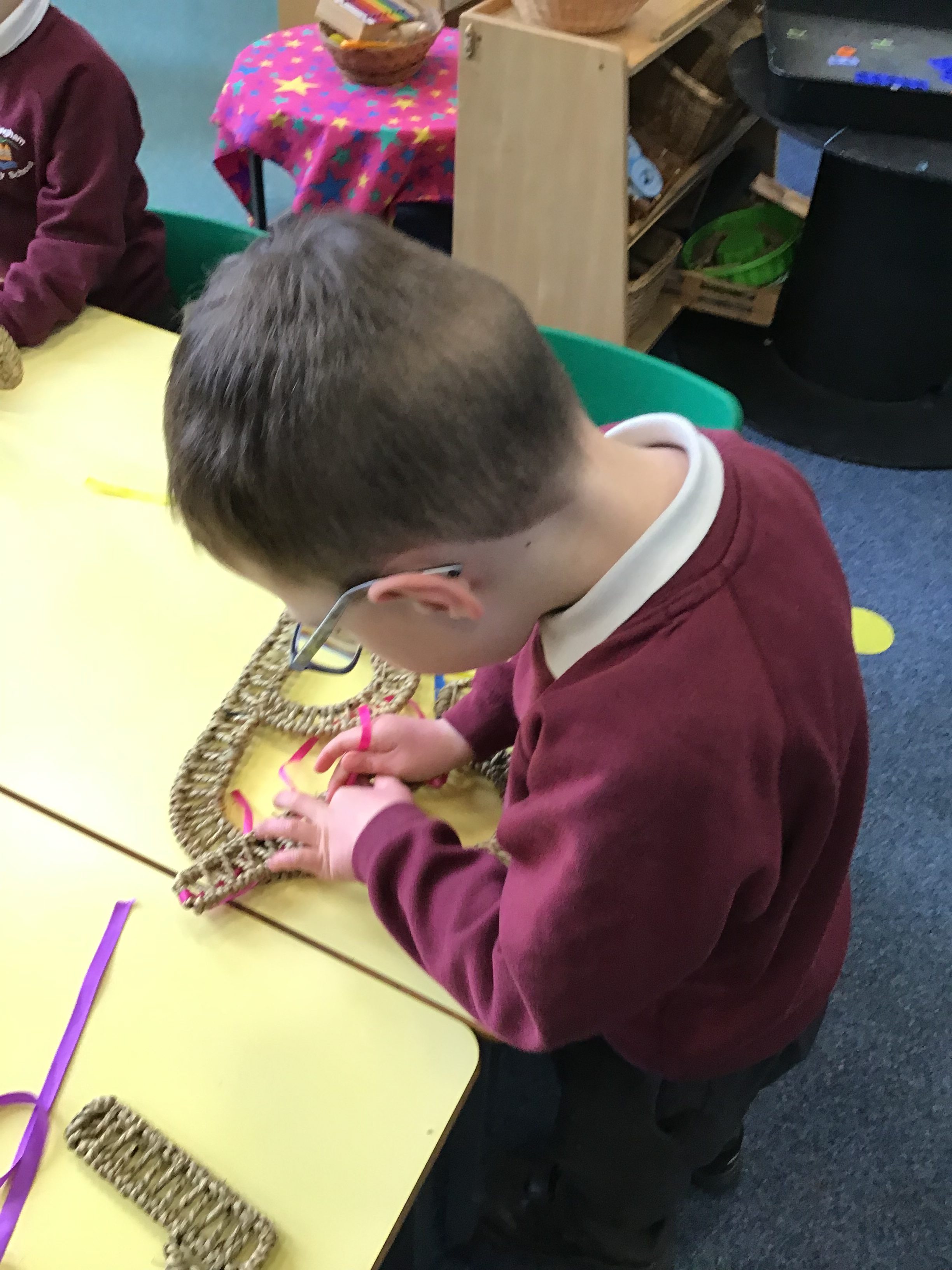 When Reception children enter the classroom each morning, they always have an activity to do that will help develop their fine motor skills. One of the activities is weaving ribbons in and out of wicker letters. It takes a lot of concentration and good hand-eye co-ordination to weave the ribbons up and down.