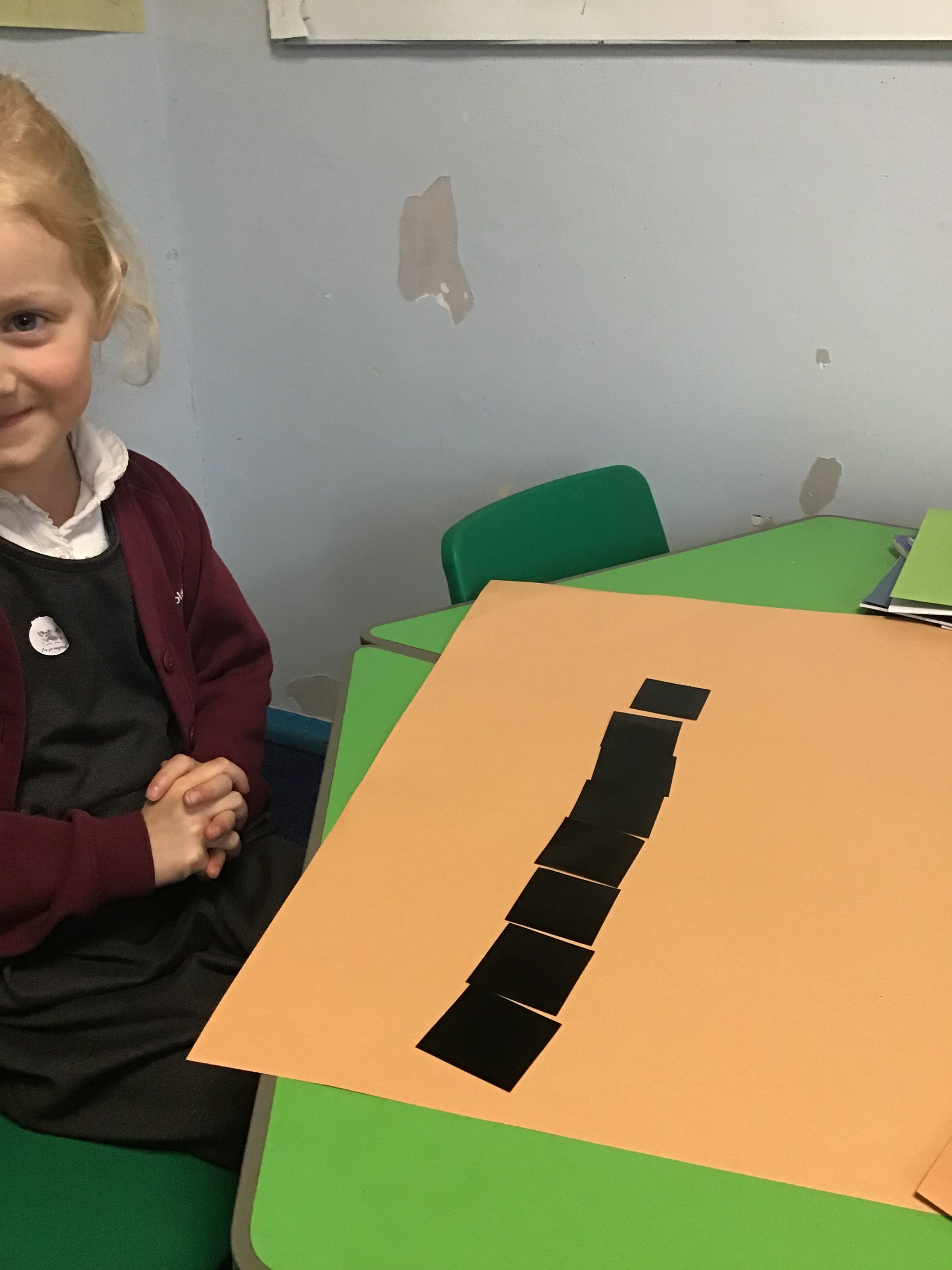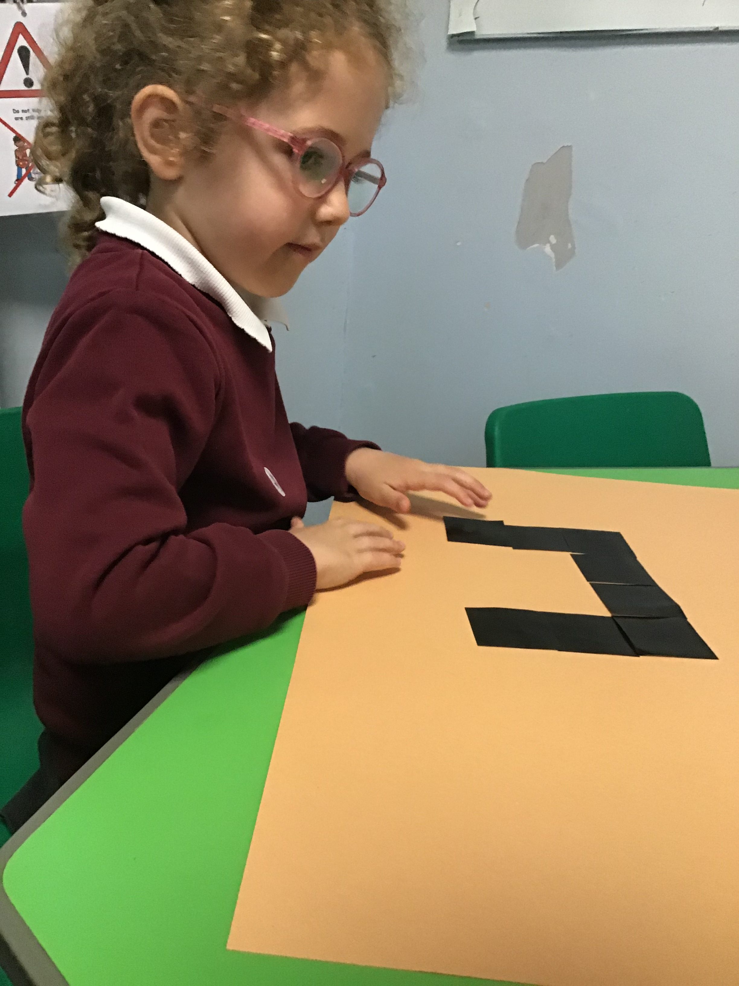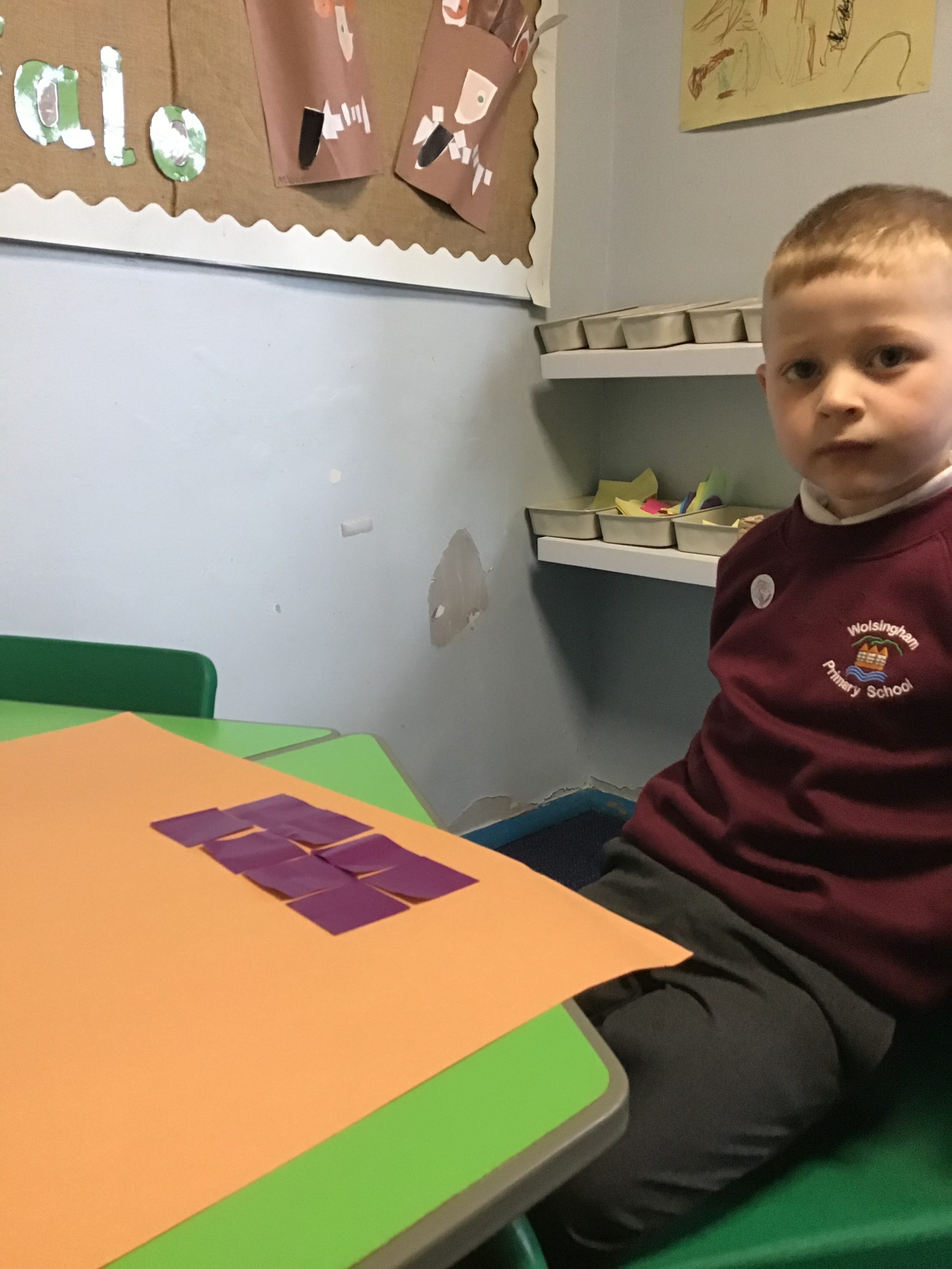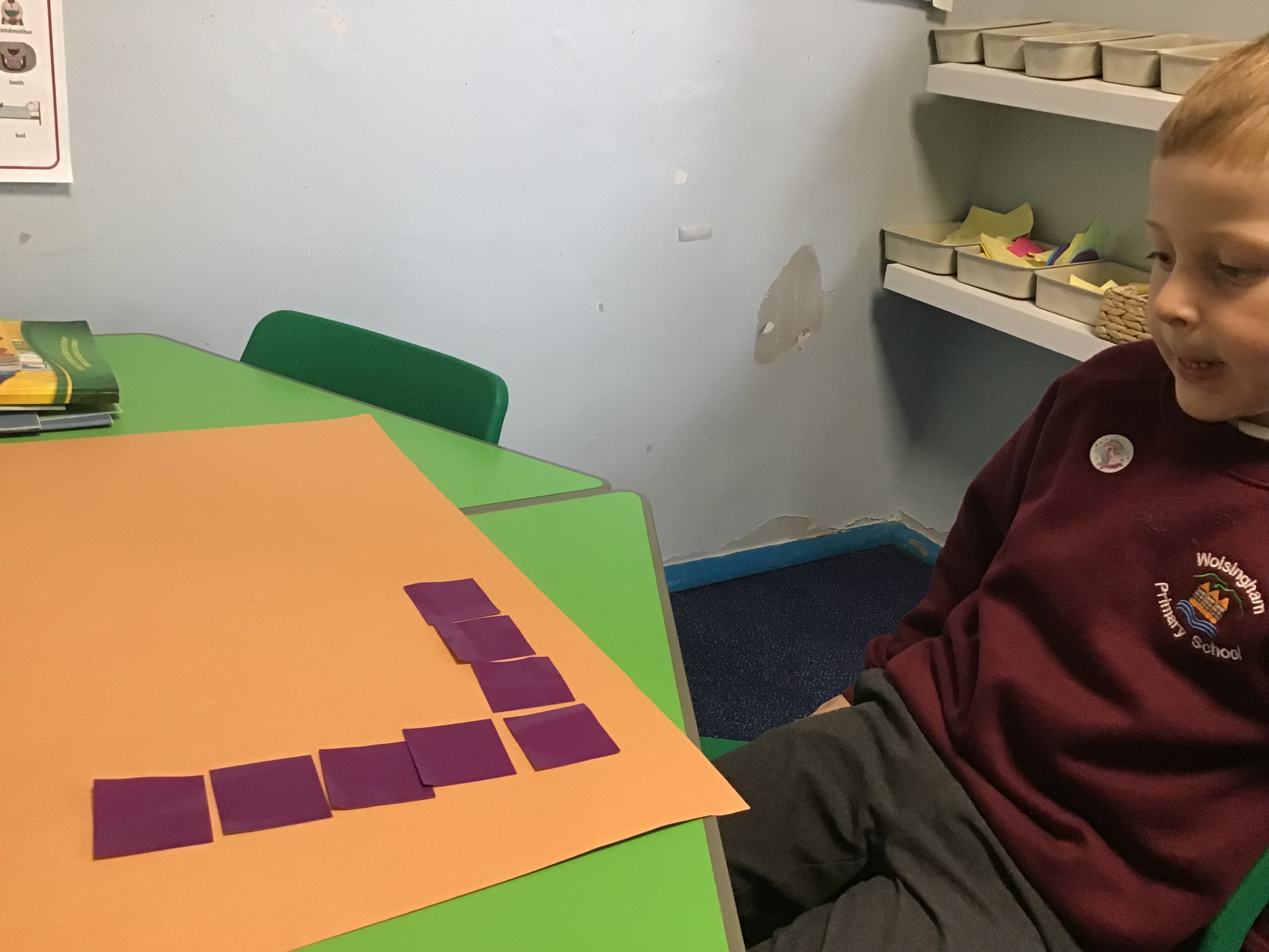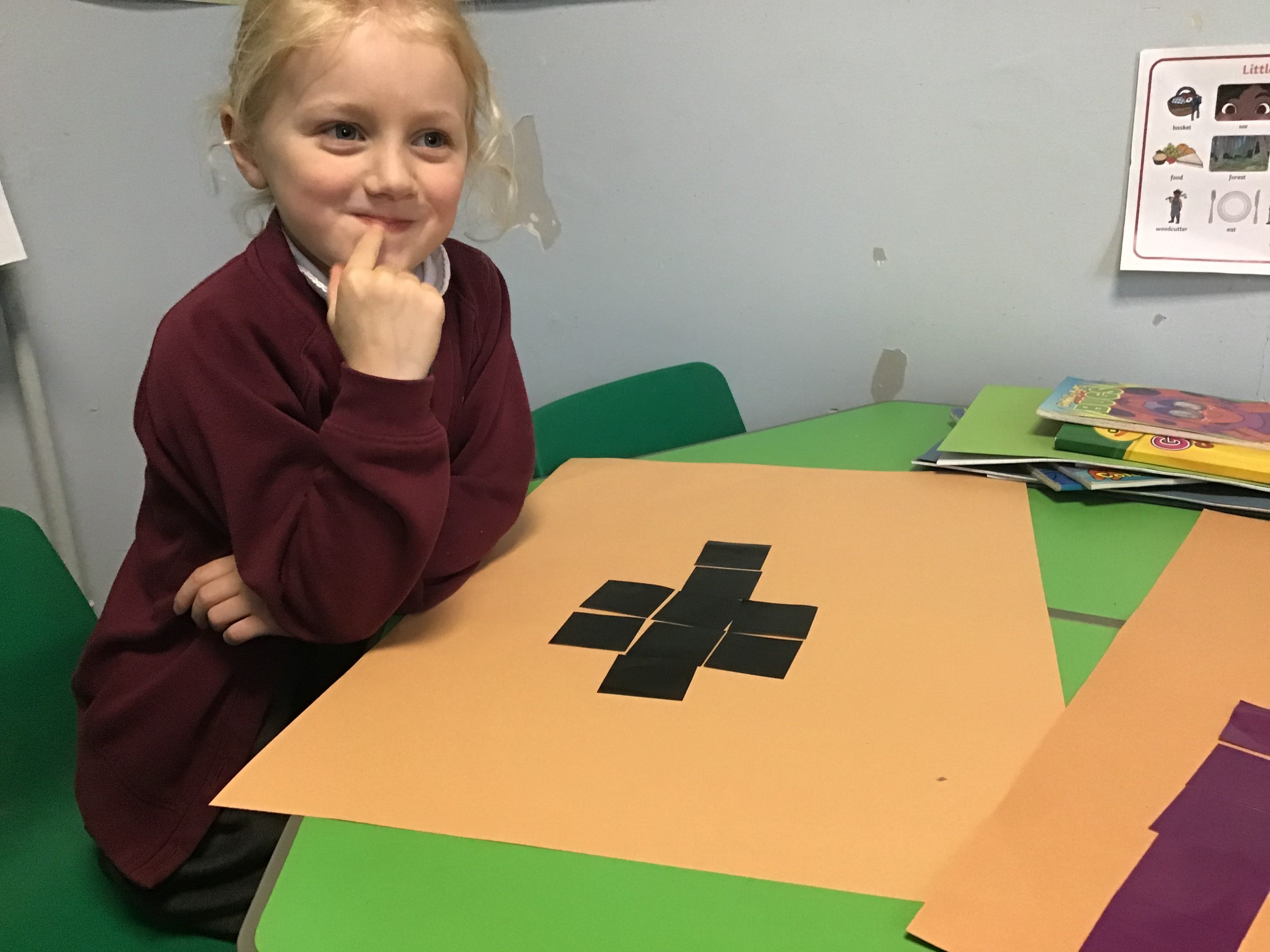They even did some problem-solving with shapes. They were given 8 identical squares and asked to join them together to make shapes. Their knowledge of pattern helped them realise that they could make 2 different rectangles (1 row of 8 or 2 rows of 4). They also made some more complicated shapes (T, L and +) and counted the number of sides their shapes had. It was great fun moving the squares around and exploring what they could make. Here are some photos of the shapes they made.