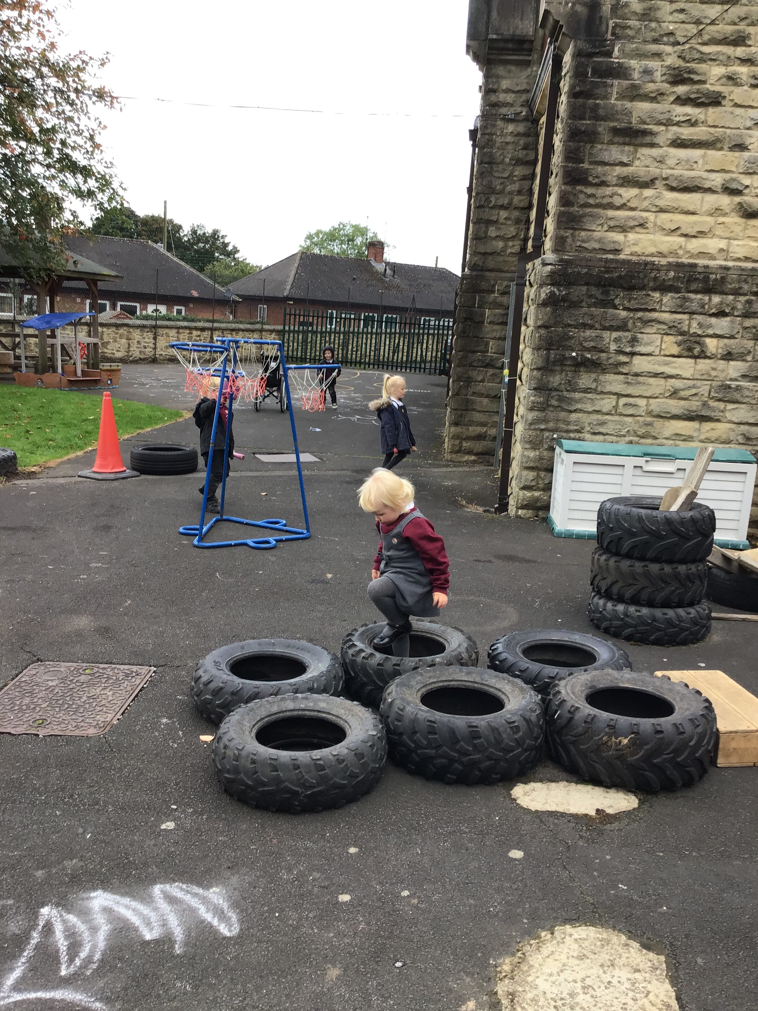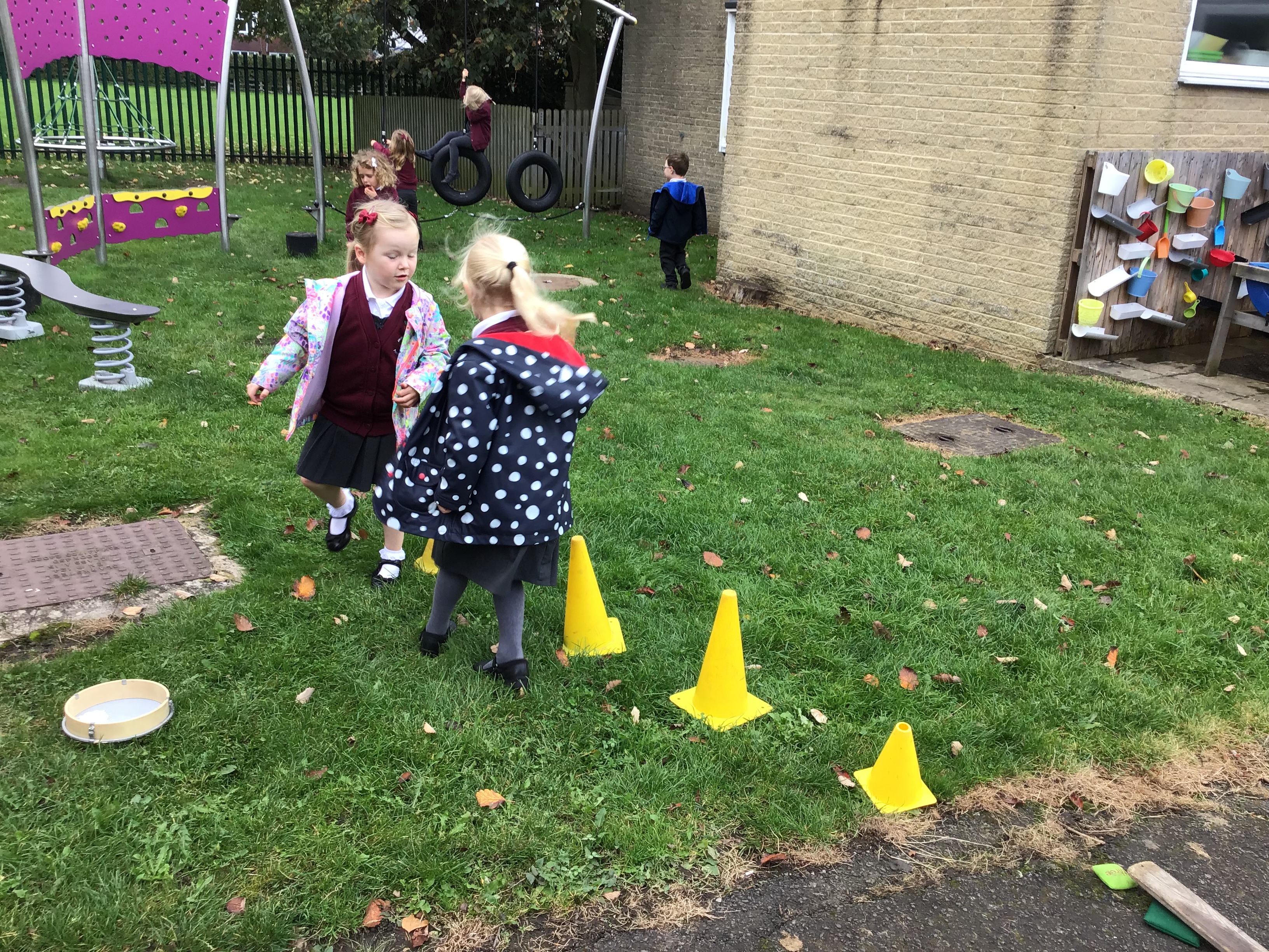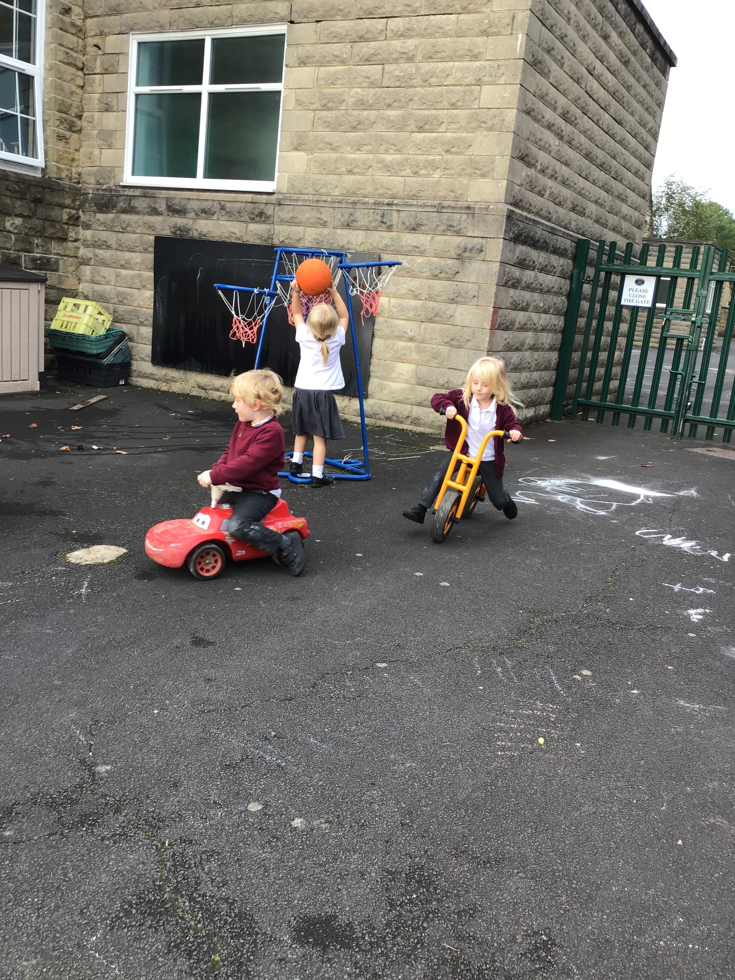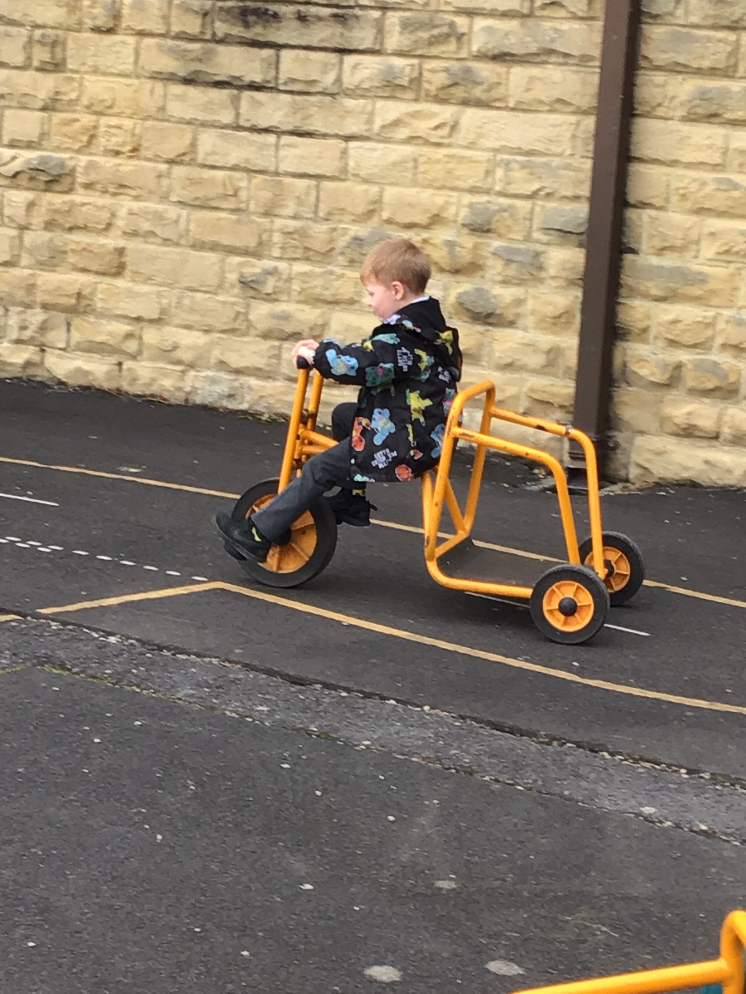 When the children are playing outside, lots of the things they do are helping with their physical development. We have lots of fun pedalling the bikes. When we are pretending to wash the van, those big movements will help us with our writing. We make obstacle courses and enjoy balancing, jumping and crawling.