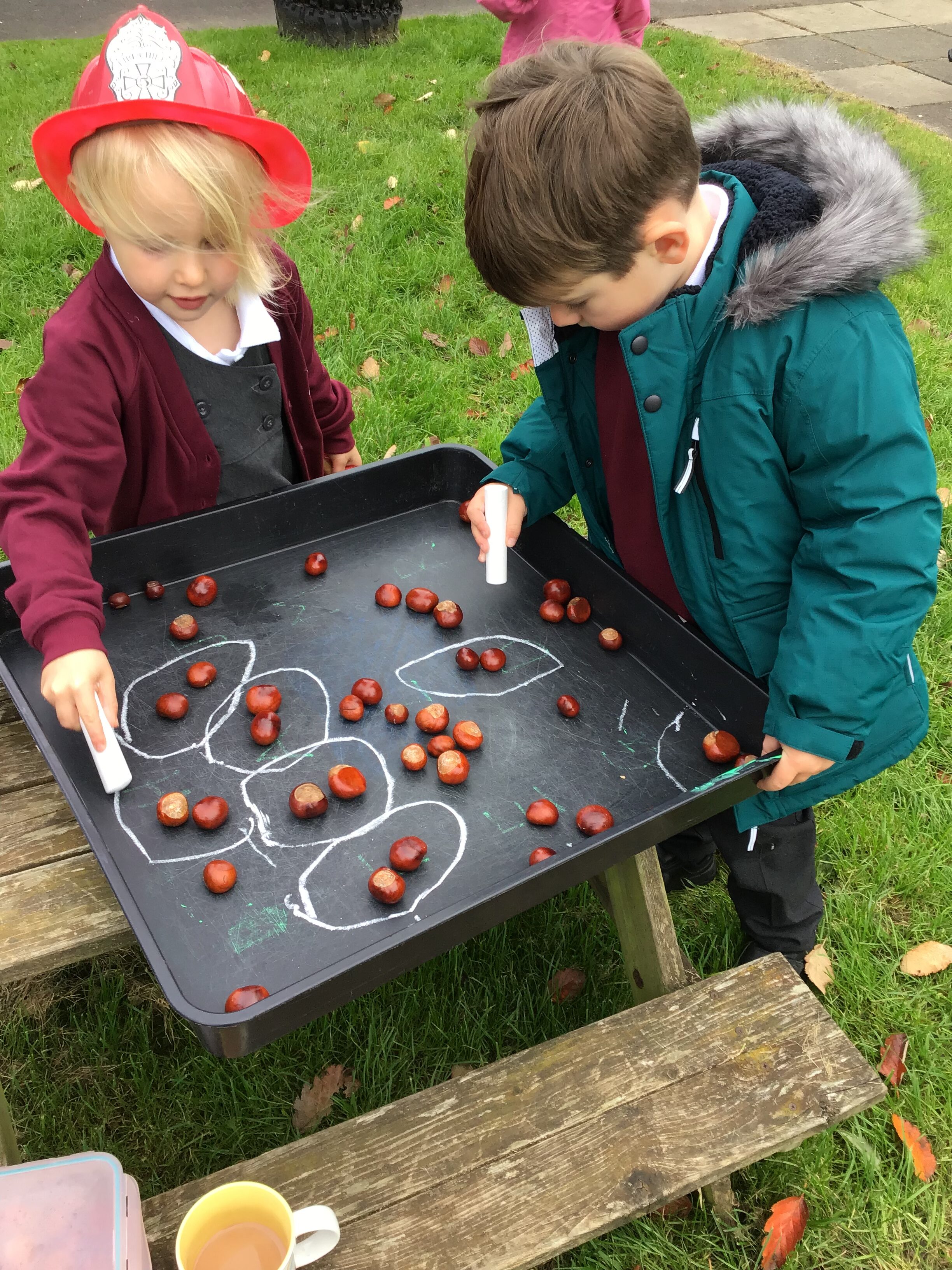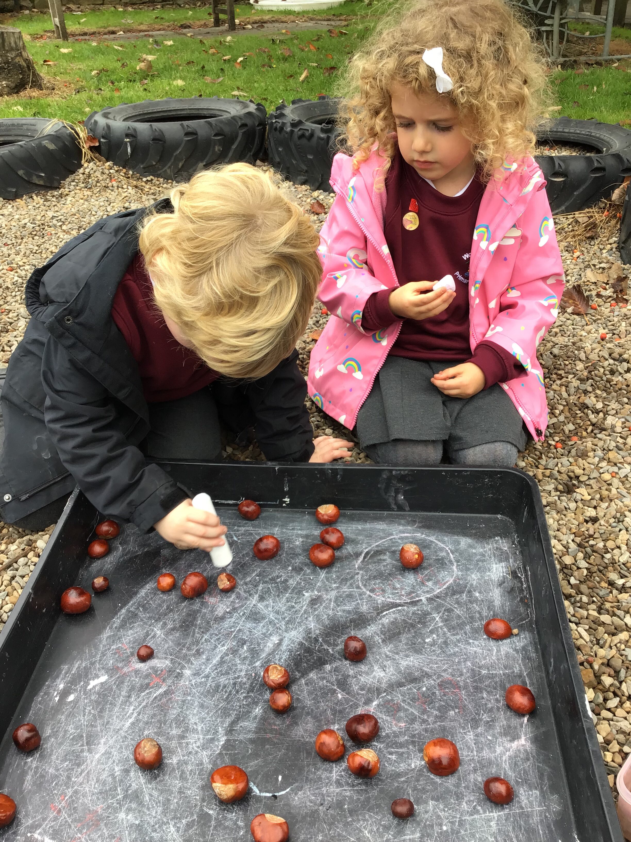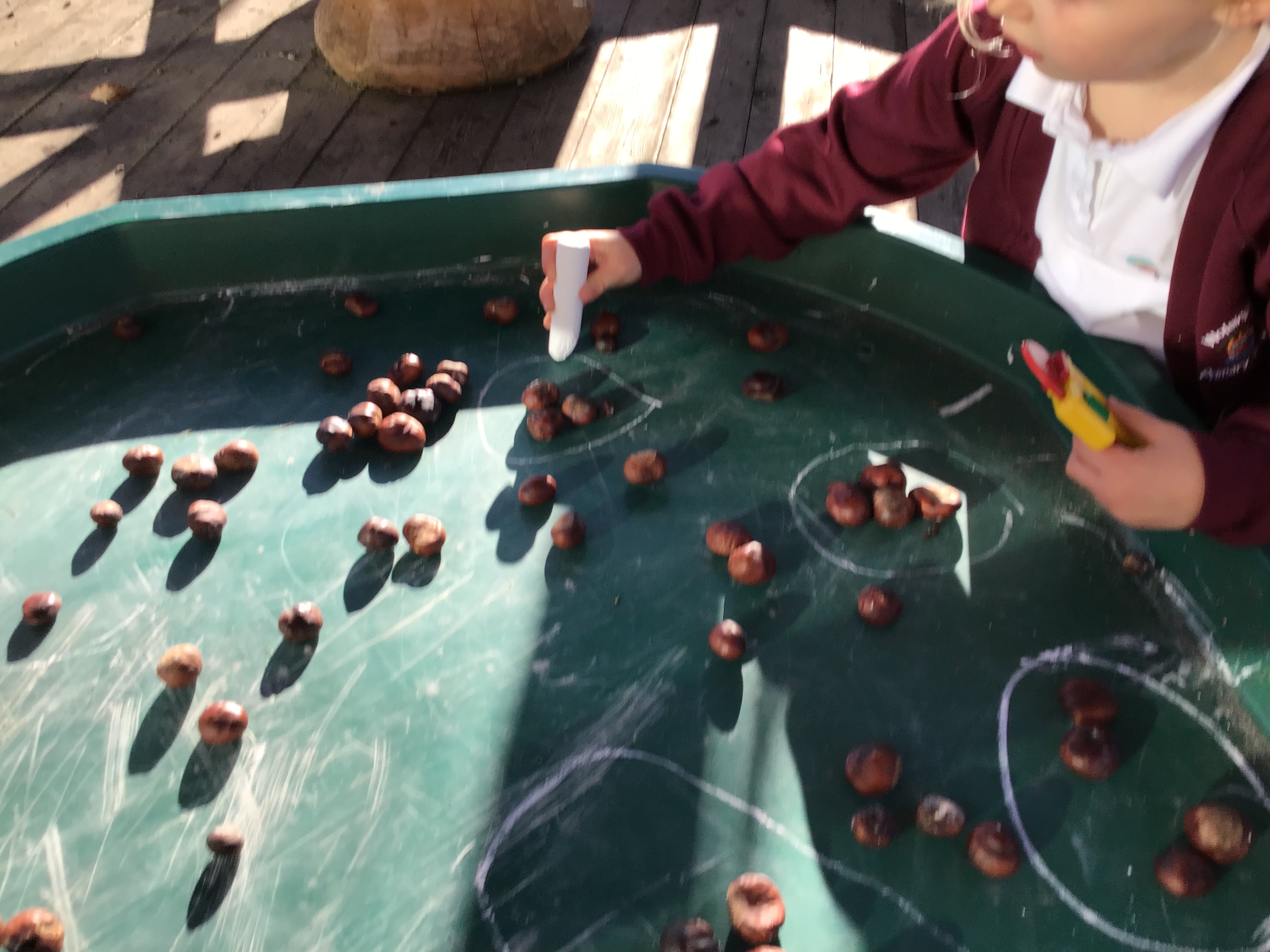 This week we have been learning to recognize the amount 4. We looked at the conkers scattered on the tuff tray and looked for where there were 4. We also practiced recognising and writing the numeral 4 using the Ten Town character Freddy Four.