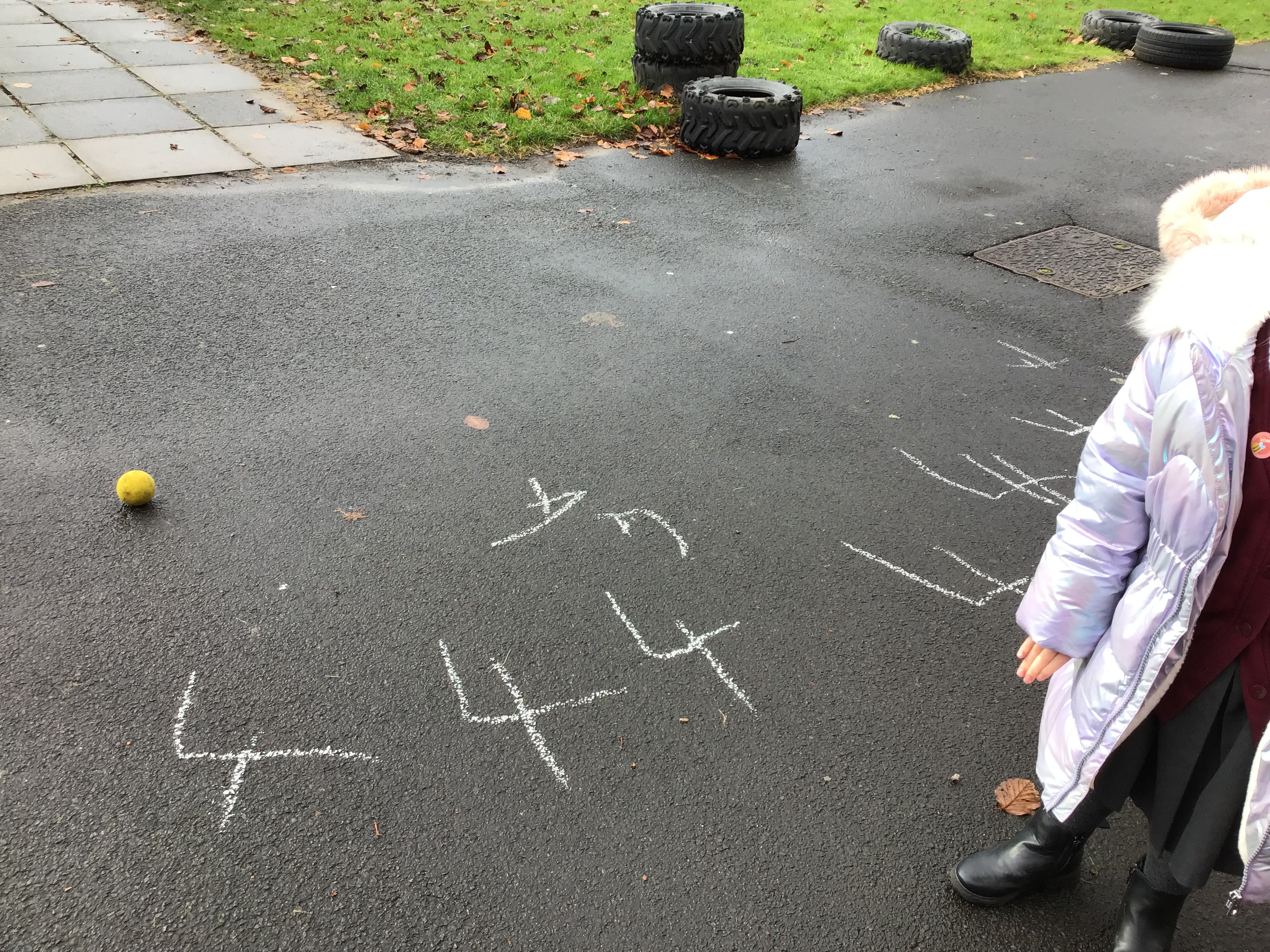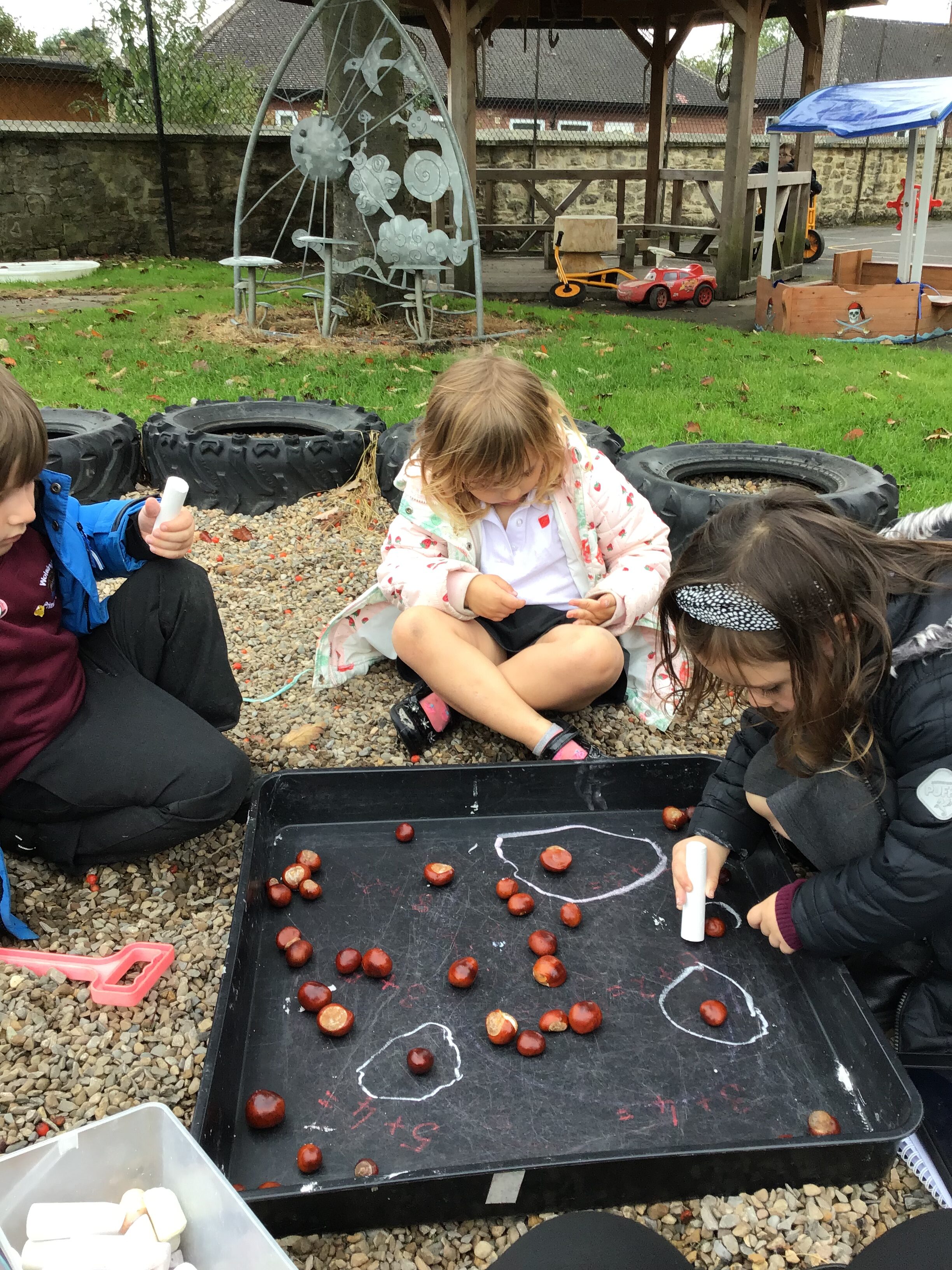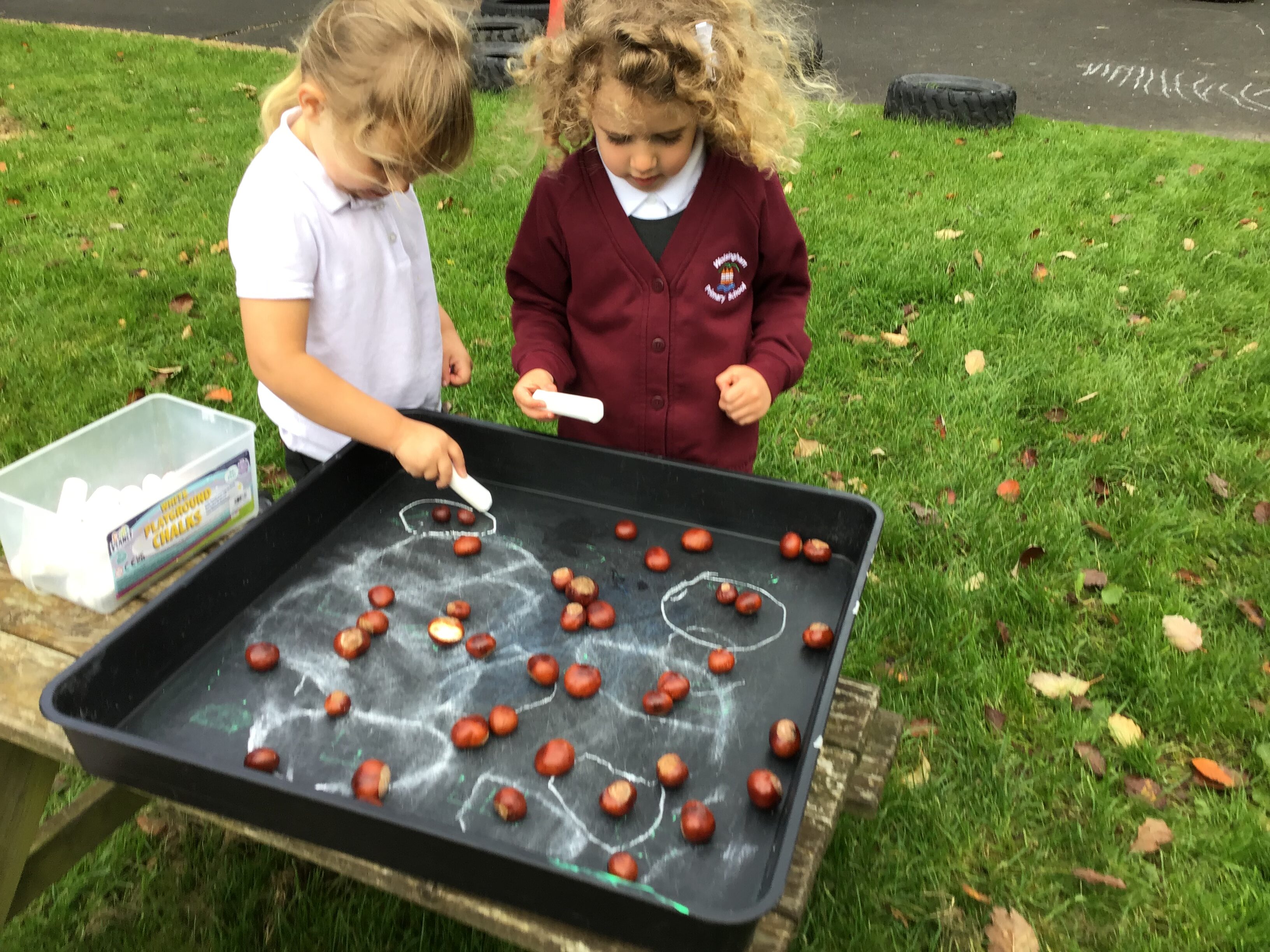 This week we have been learning to recognize the amount 4. We looked at the conkers scattered on the tuff tray and looked for where there were 4. We also practiced recognising and writing the numeral 4 using the Ten Town character Freddy Four.