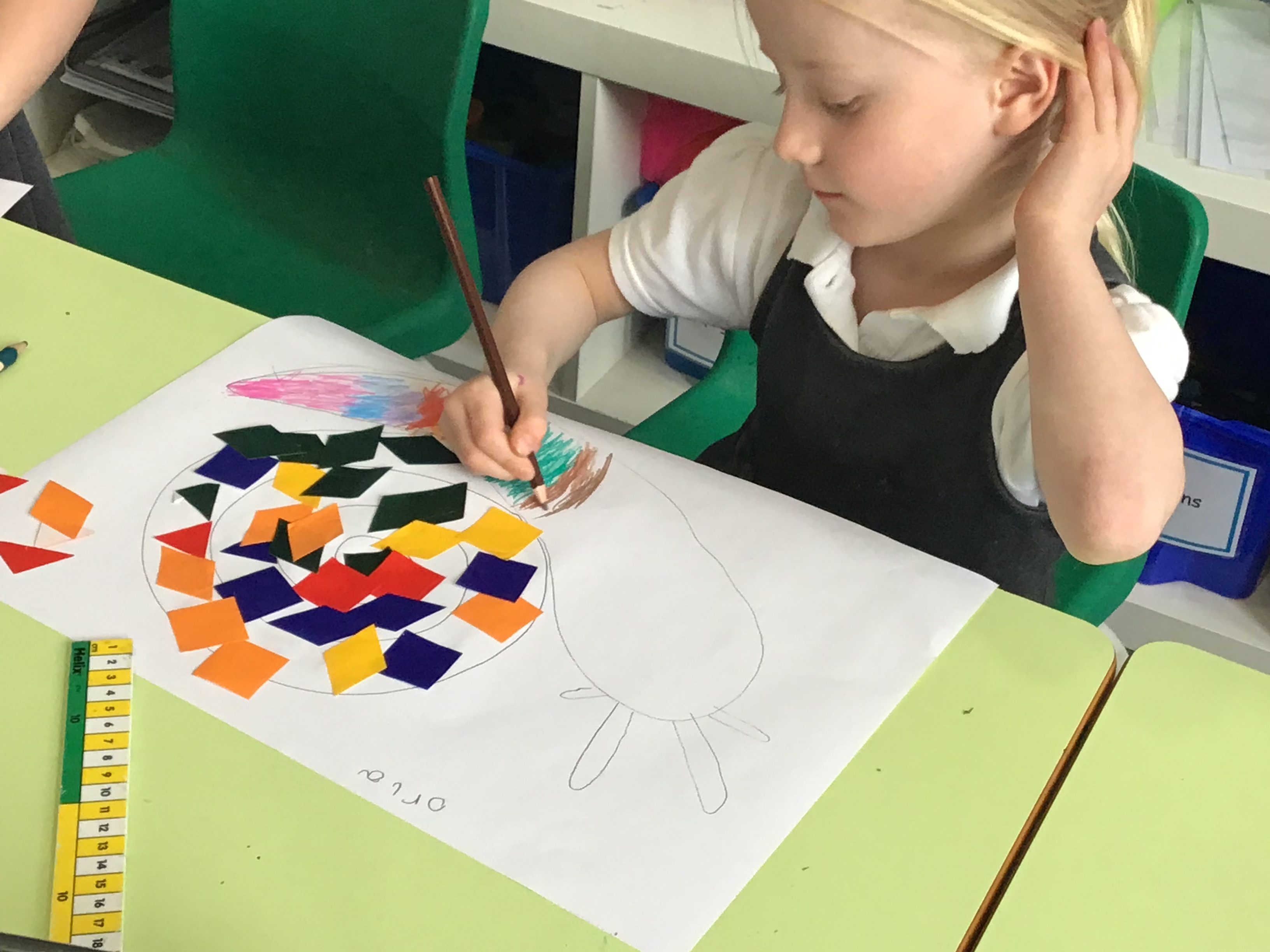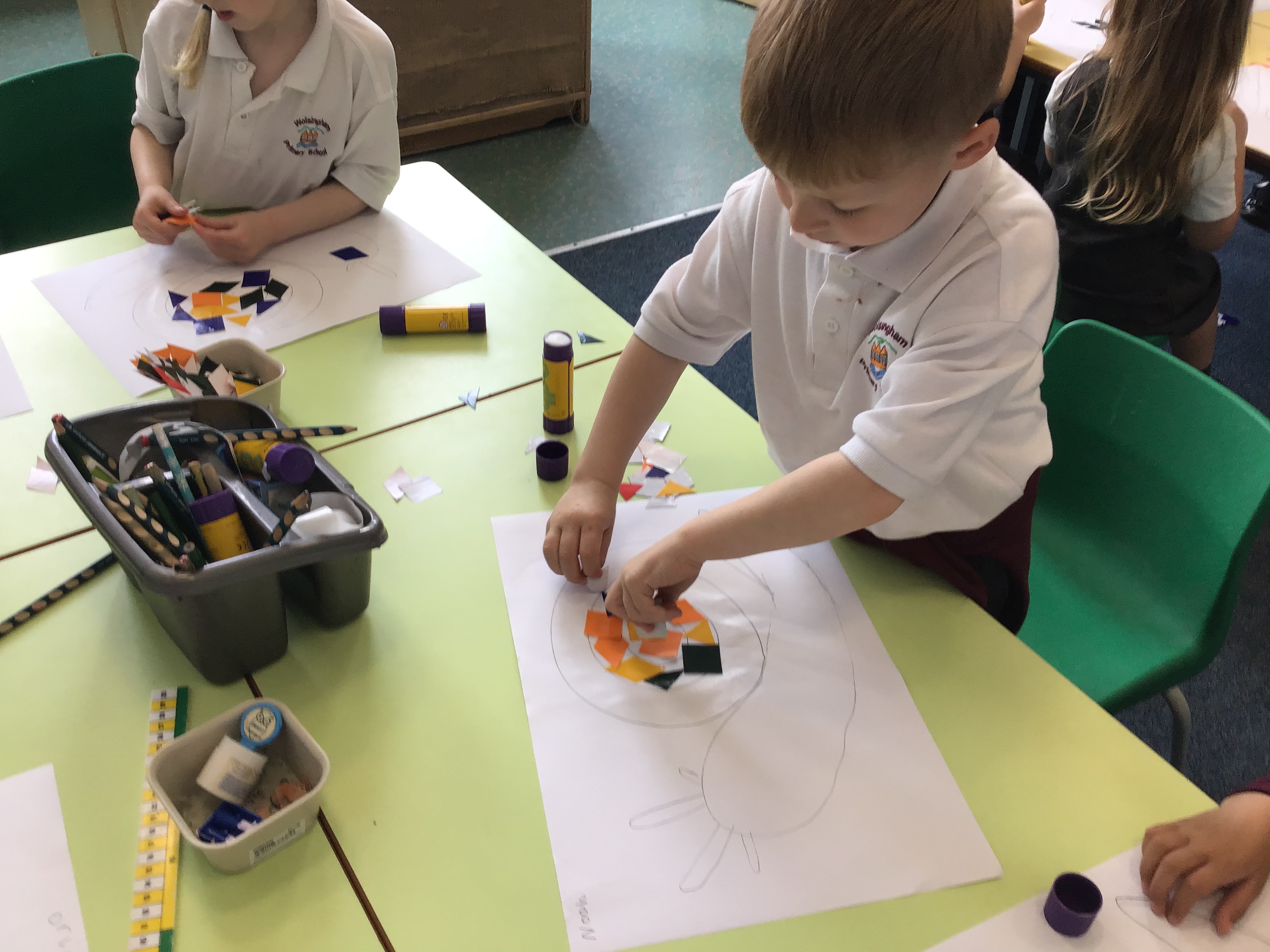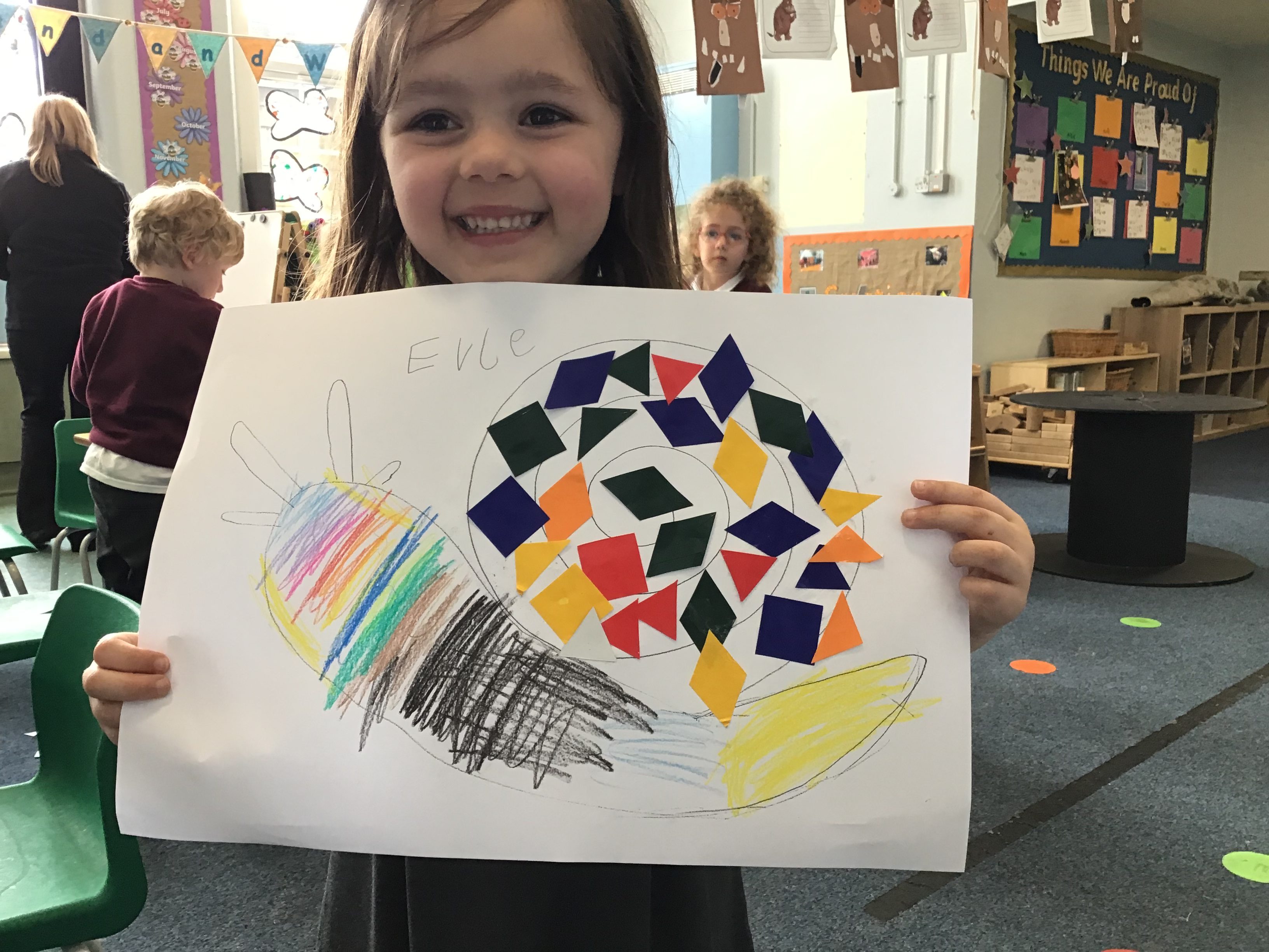 Reception Class have been learning about snails as part of their topic on minibeasts. We looked at the piece of artwork called ‘The Snail’ by Henri Matisse and talked about how he used collage to create his art. The children then did their own snail pictures using collage to make the shell and then colouring the snail’s body. They are very proud of their pieces of artwork.