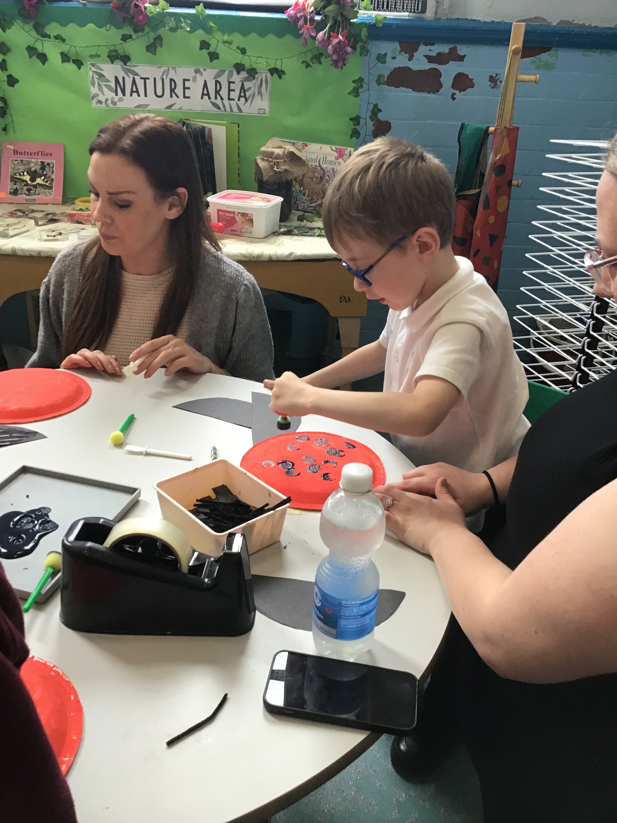 Reception Class had a lovely afternoon working on minibeast themed arts and crafts with their parents and grandparents. They made spiders, ladybirds, dragonflies, snails and caterpillars. They had lots of fun drawing, painting, cutting and gluing to make their creations. The grown-ups had lots of fun too! Thank you to all those who attended.