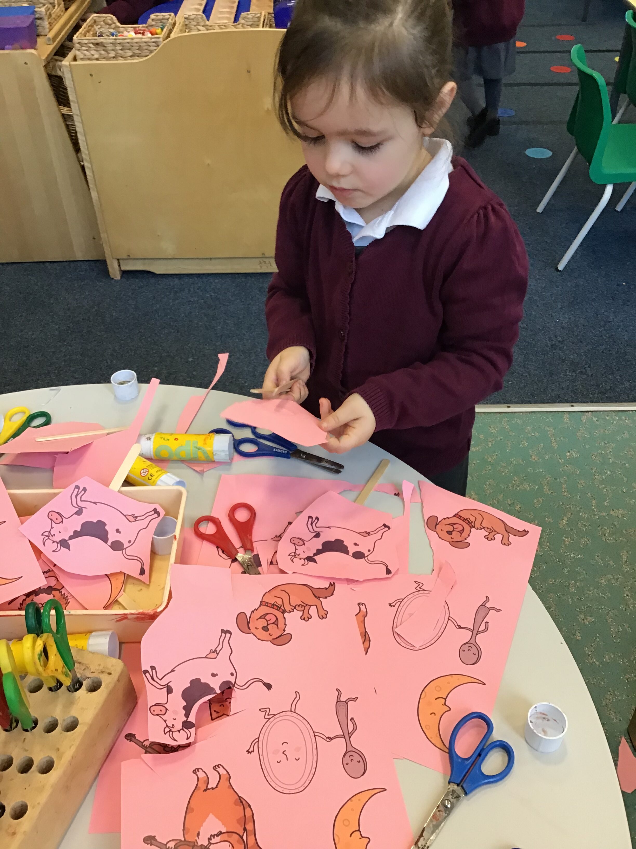 As part of World Nursery Rhyme Week, Reception Class have been doing lots of activities relating to the rhyme ‘Hey Diddle Diddle’. They made stick puppets to act out the rhyme. They did some cutting and sticking to sequence the key events and they wrote rhyming words. The children also did some art work, which will be put together to make a fabulous display in the school hall.