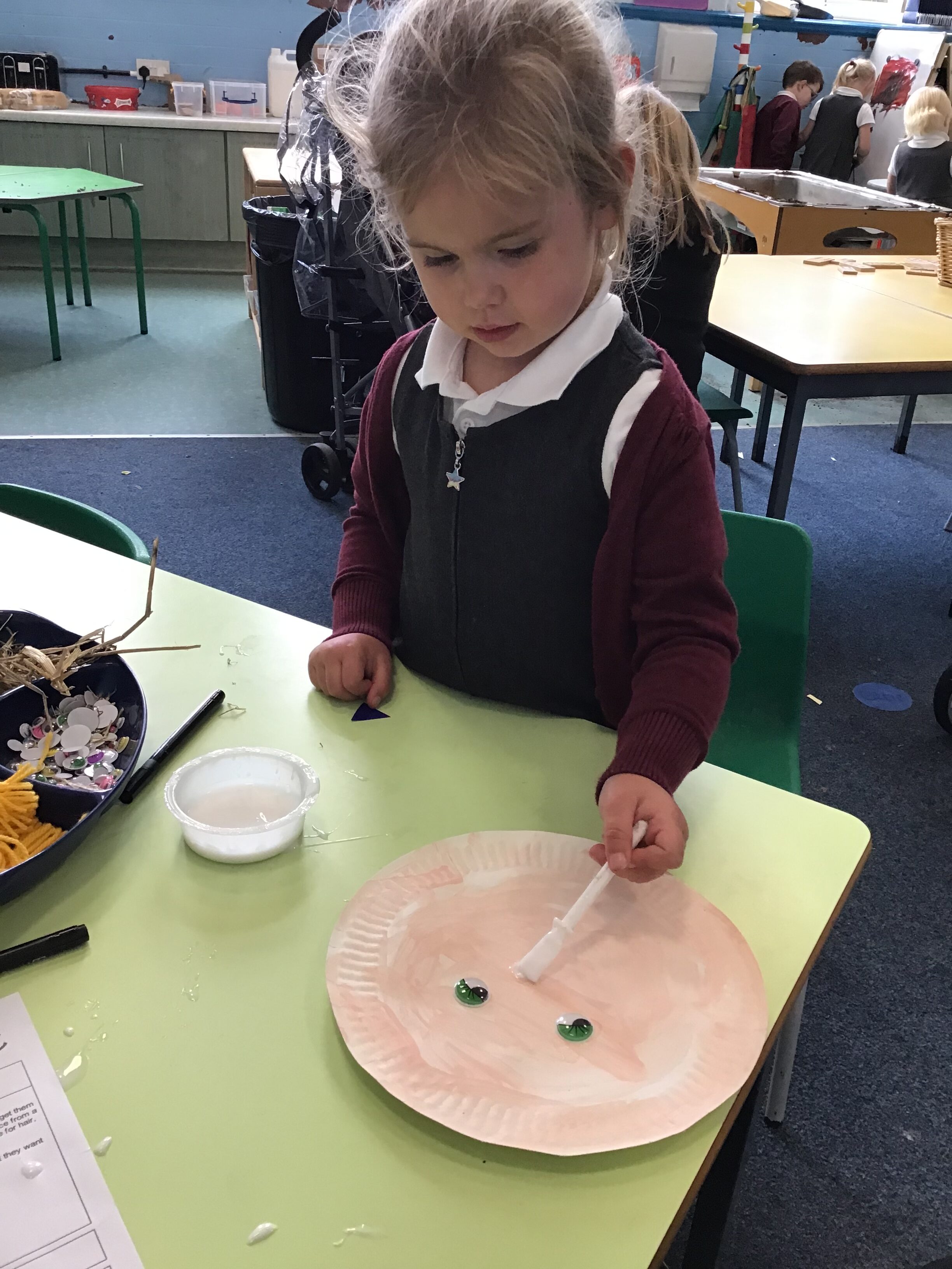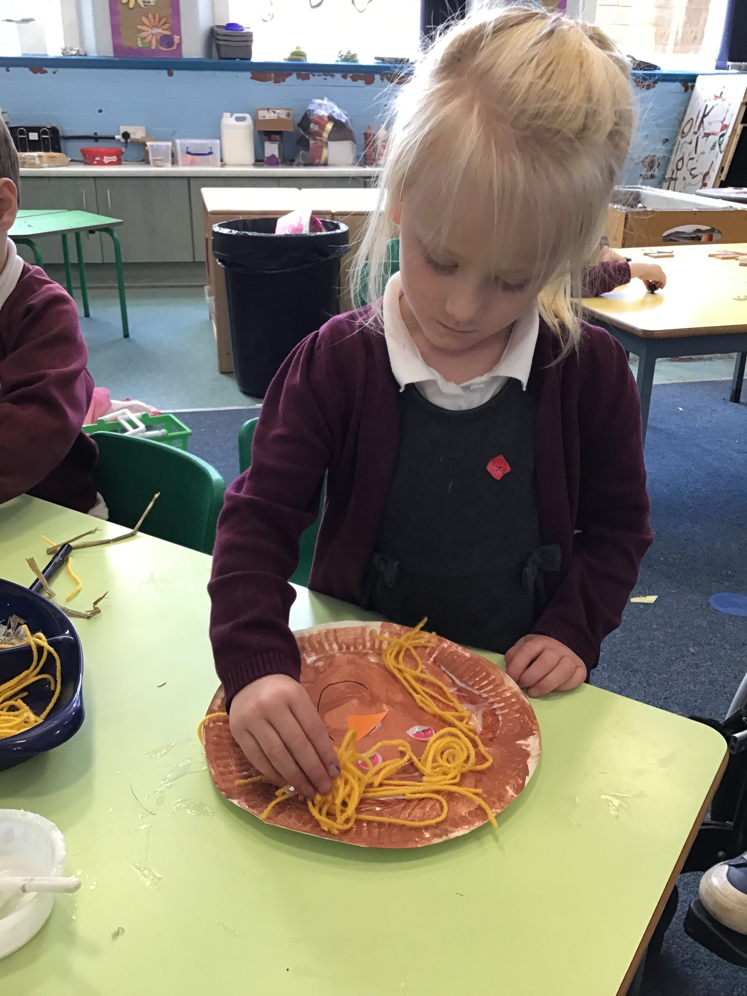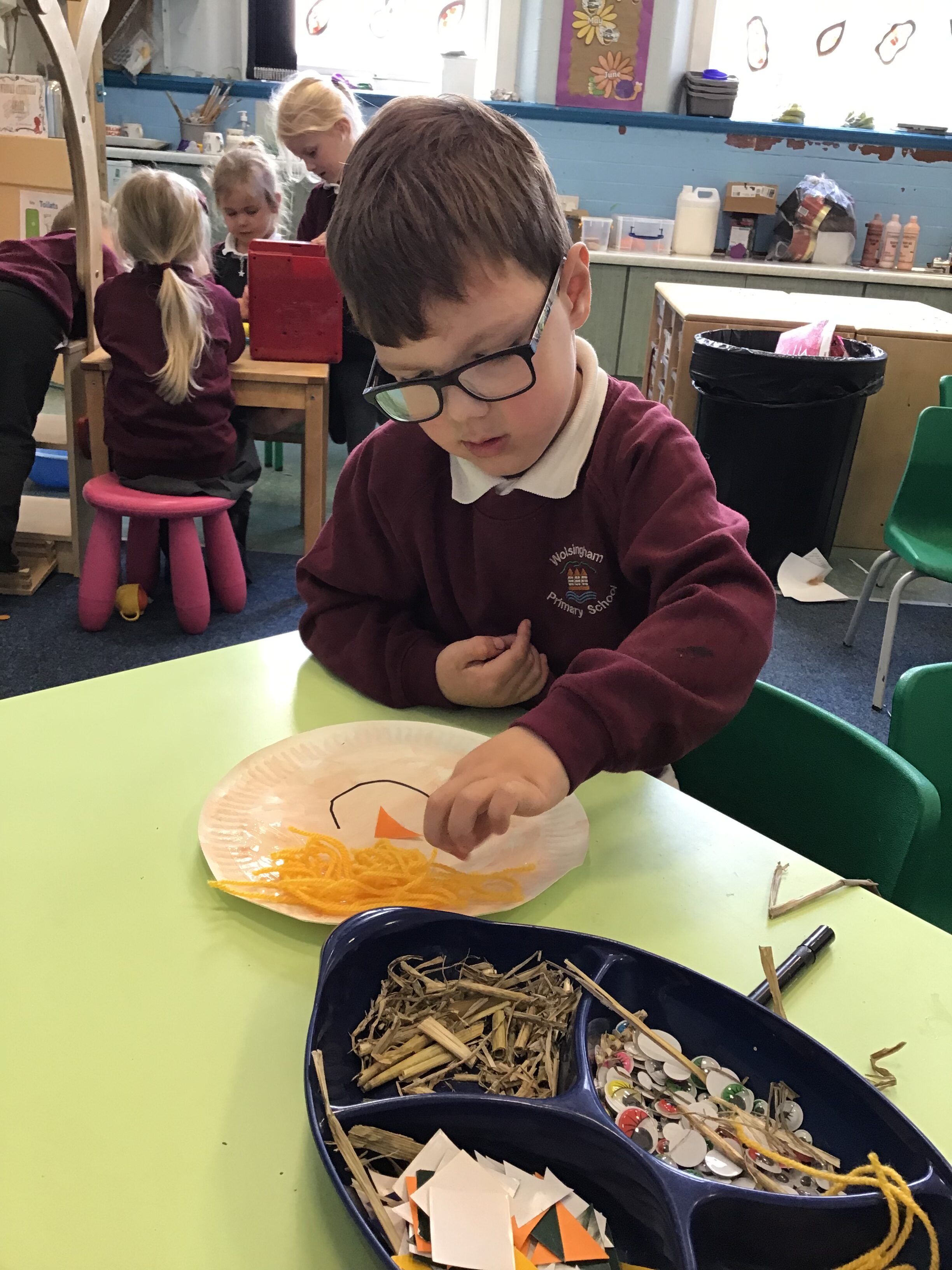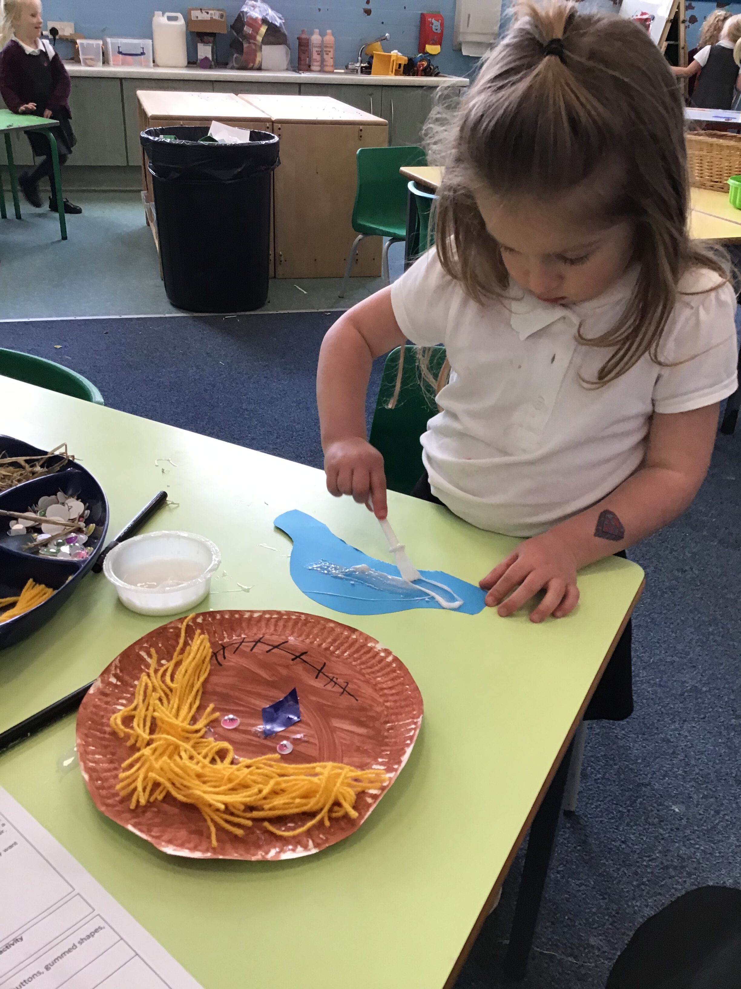 As part of learning about autumn and harvest time, we talked about how important scarecrows are to protect the crops from birds. We read ‘The Scarecrows’ Wedding’ by Julia Donaldson and sang ‘I’m a Dingle Dangle Scarecrow’. Then the children made paper plate scarecrow faces. They chose what colour they wanted to paint the face. Later they carefully selected what materials they wanted to use for the eyes, nose, hair and mouth. They used glue to stick all the bits together. The finished scarecrows look amazing.