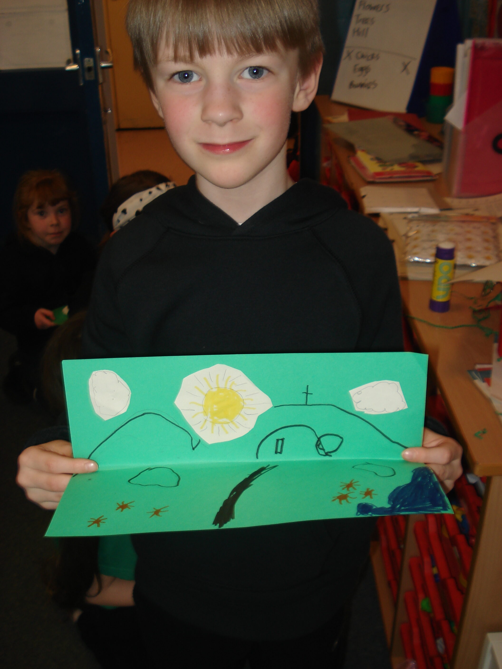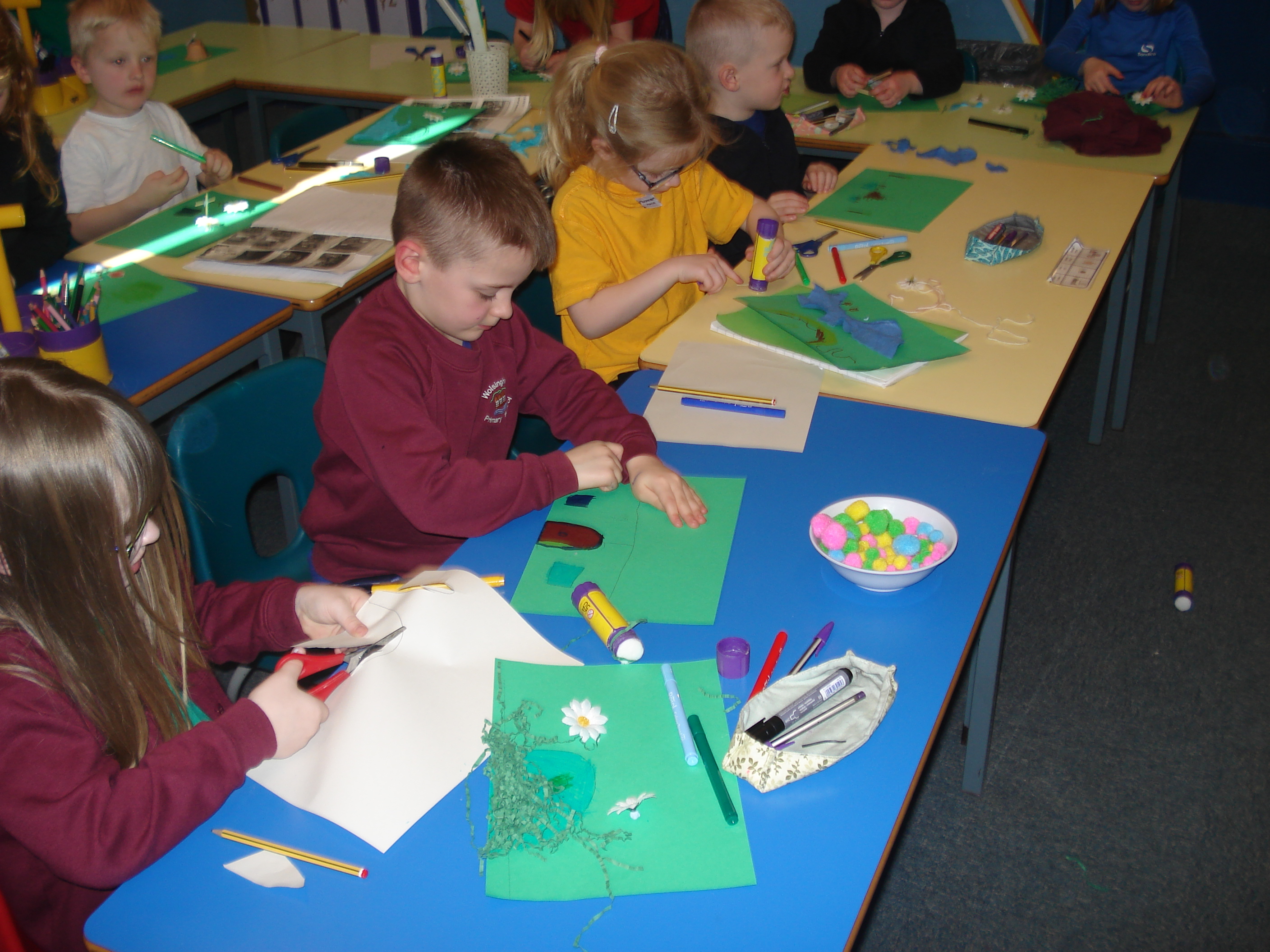 In Class 2, as part of our work in RE, we looked at Easter gardens. We talked about the things you would find in them, a tomb, a cross, trees and flowers. We used different art resources to make our Easter gardens.