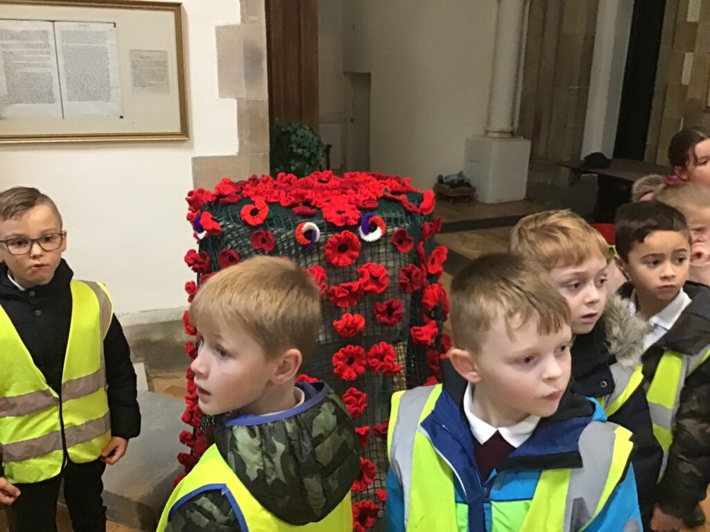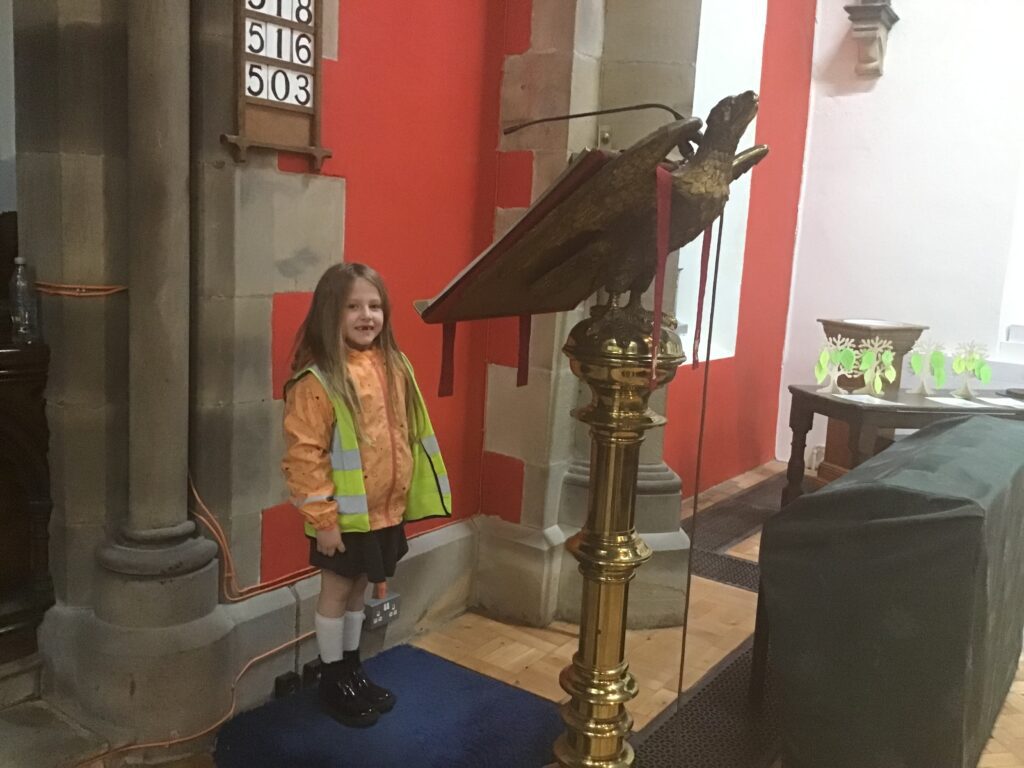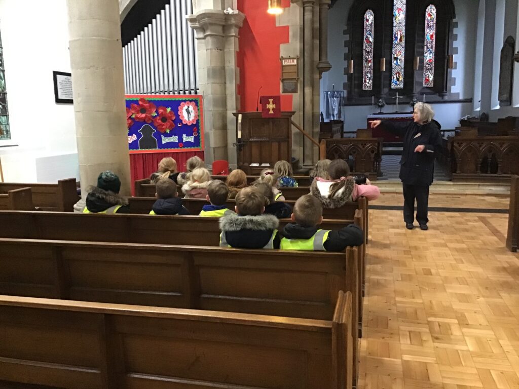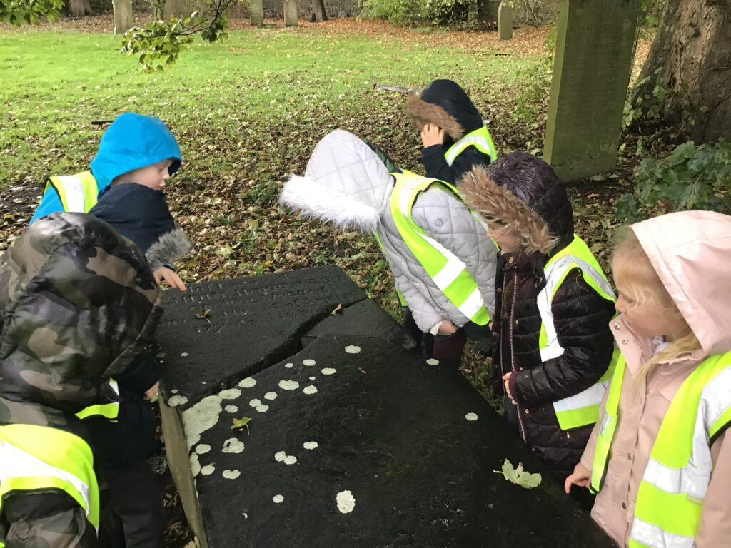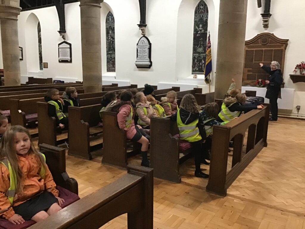 Class 2 visited St. Mary & St. Stephen’s church in Wolsingham as part of their RE work. Some of the children looked at features inside the church such as the altar, the pulpit, the font etc. Some of the children looked at features outside the church such as the bell tower, the clock, and a selection of the graves. They found the grave of a WW1 soldier and the grave of Charles Atwood.