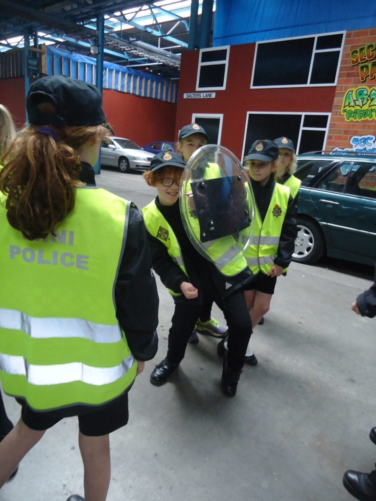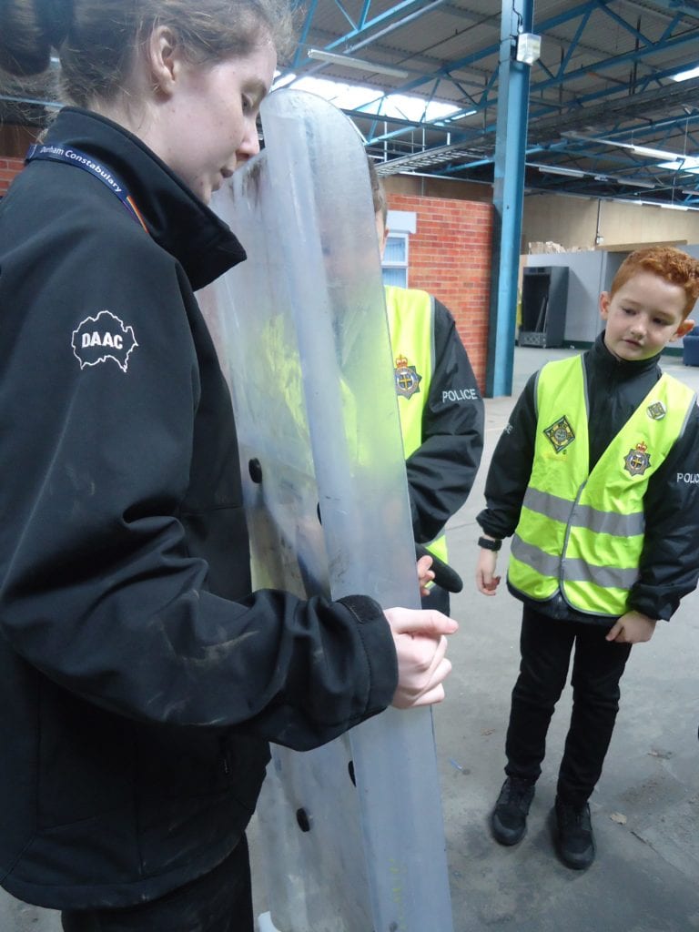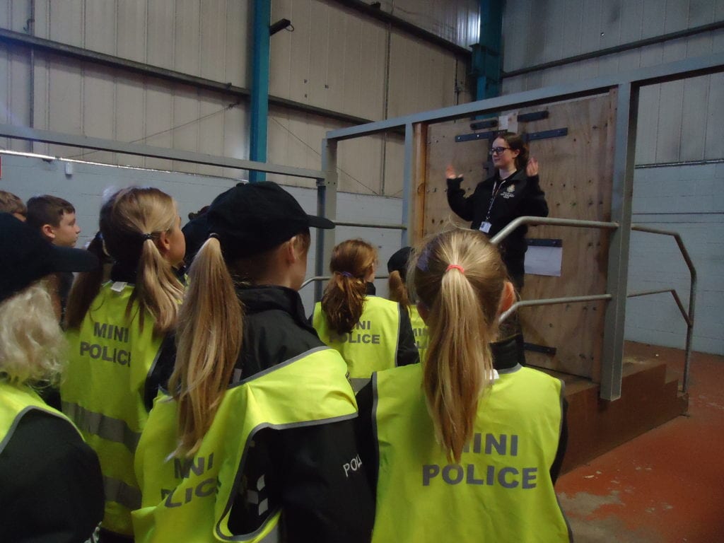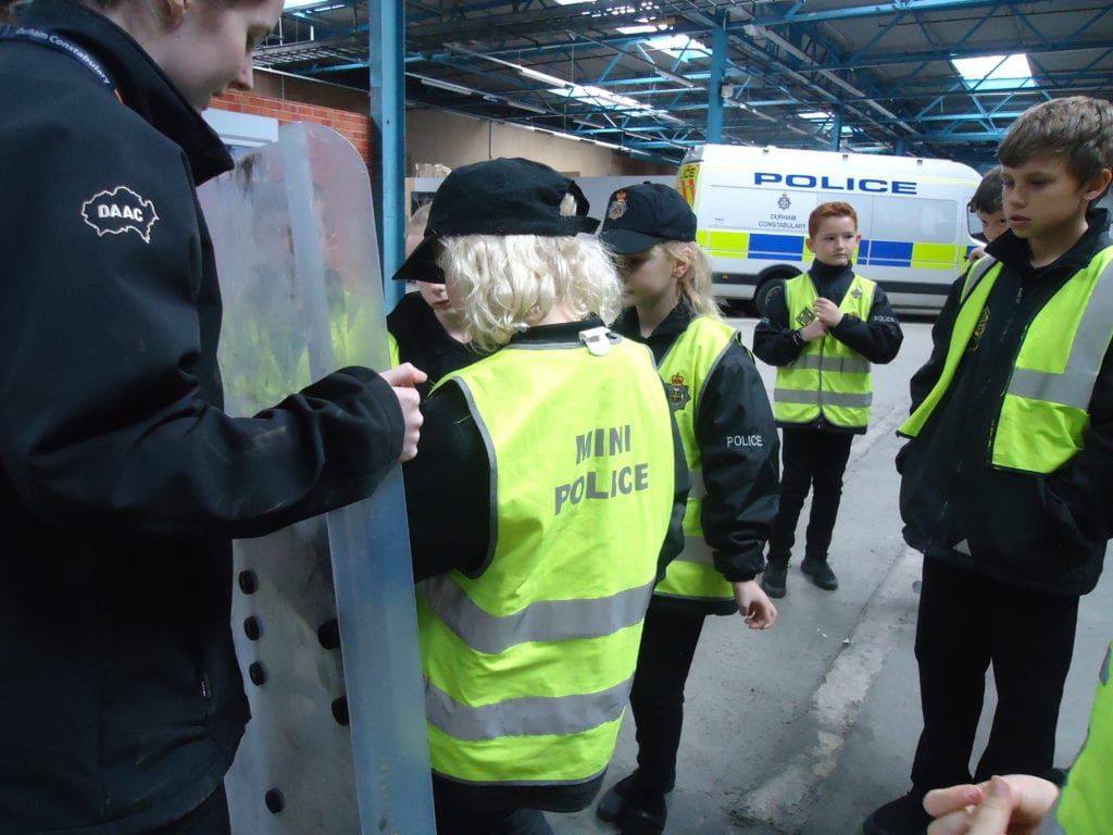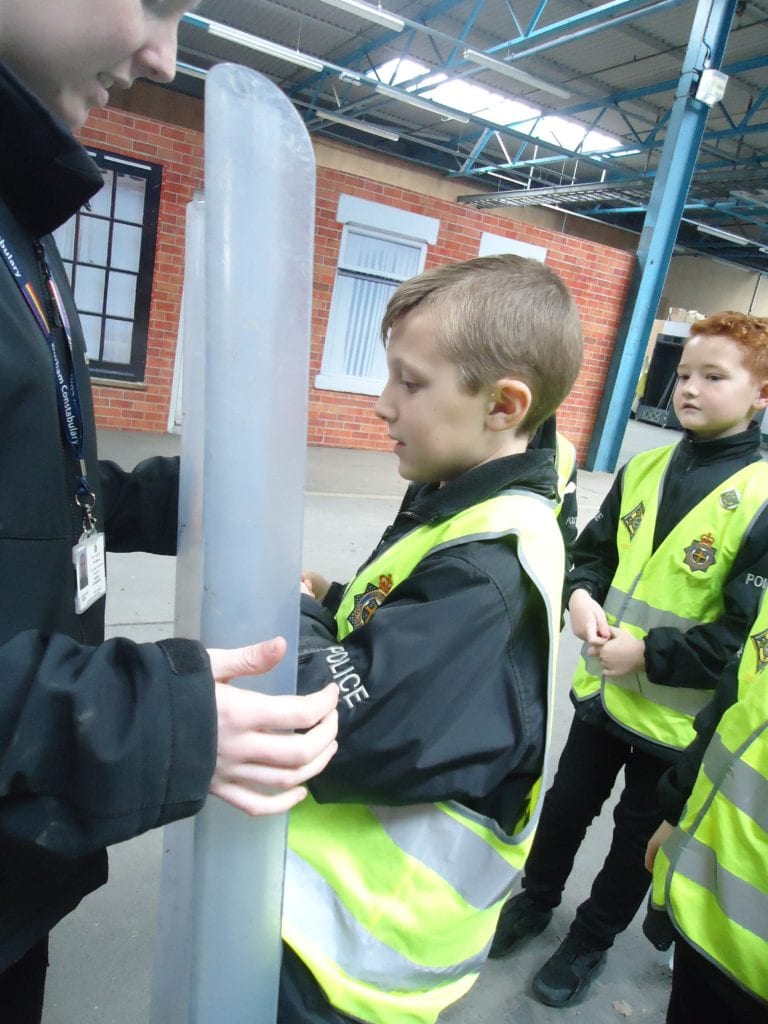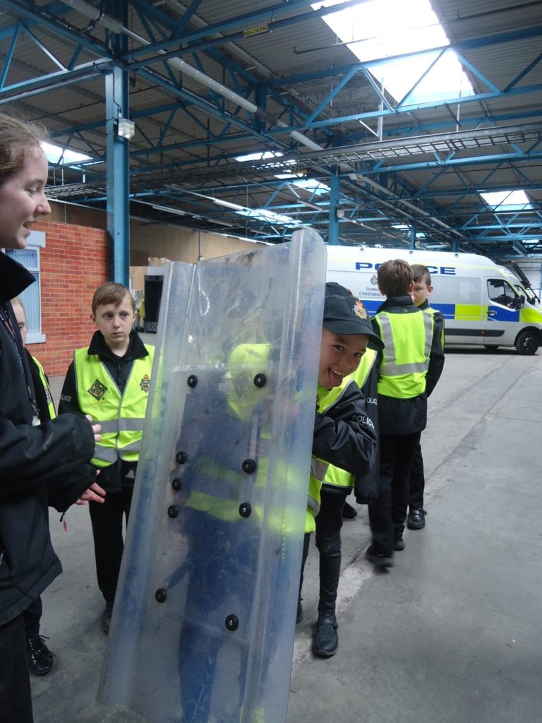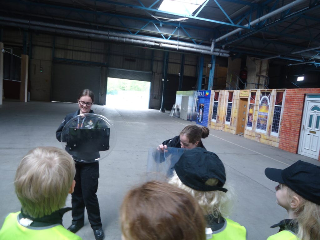 Our Mini Police were lucky enough to visit the Police Support Unit (Riot Training) in Meadowfield this week. This enabled them to get a taste of life as a riot policeman. First they looked at all the different types of doors the police are trained to open using the ‘big red key’, then they moved on to finding out what happens when someone is arrested; from being locked in the back of a police van to the custody room to the cell. They were then able to watch police officers riot training. First they observed how they work in a prison and then on the street. They got the chance to sit in the police riot vans and try out the different riot shields.