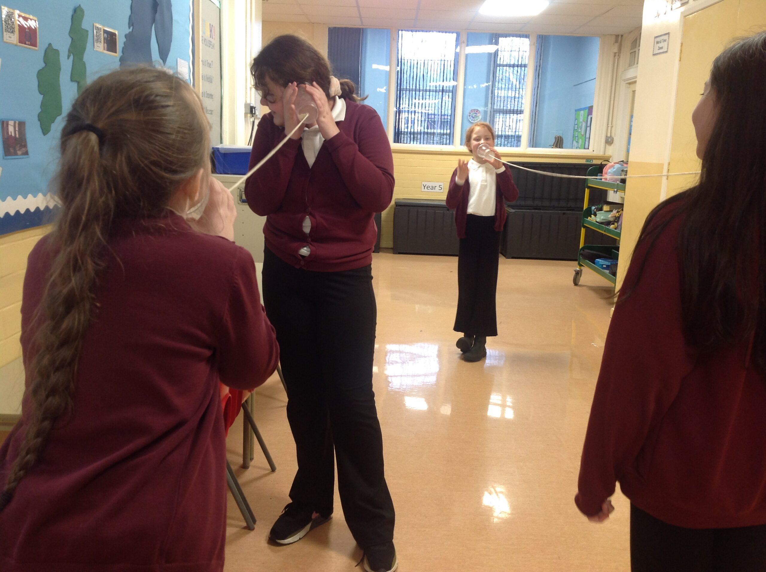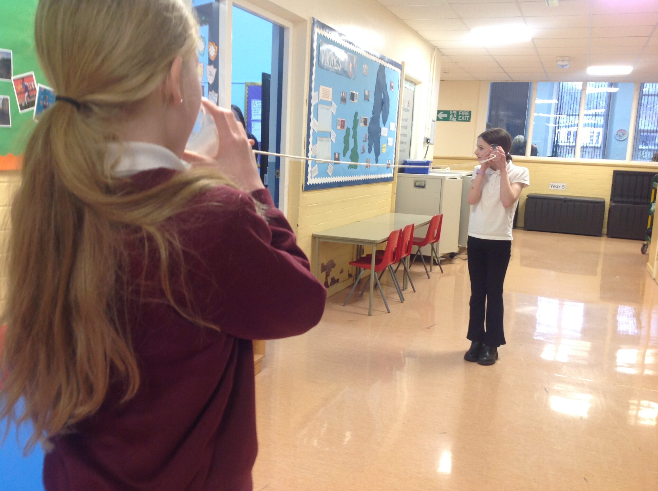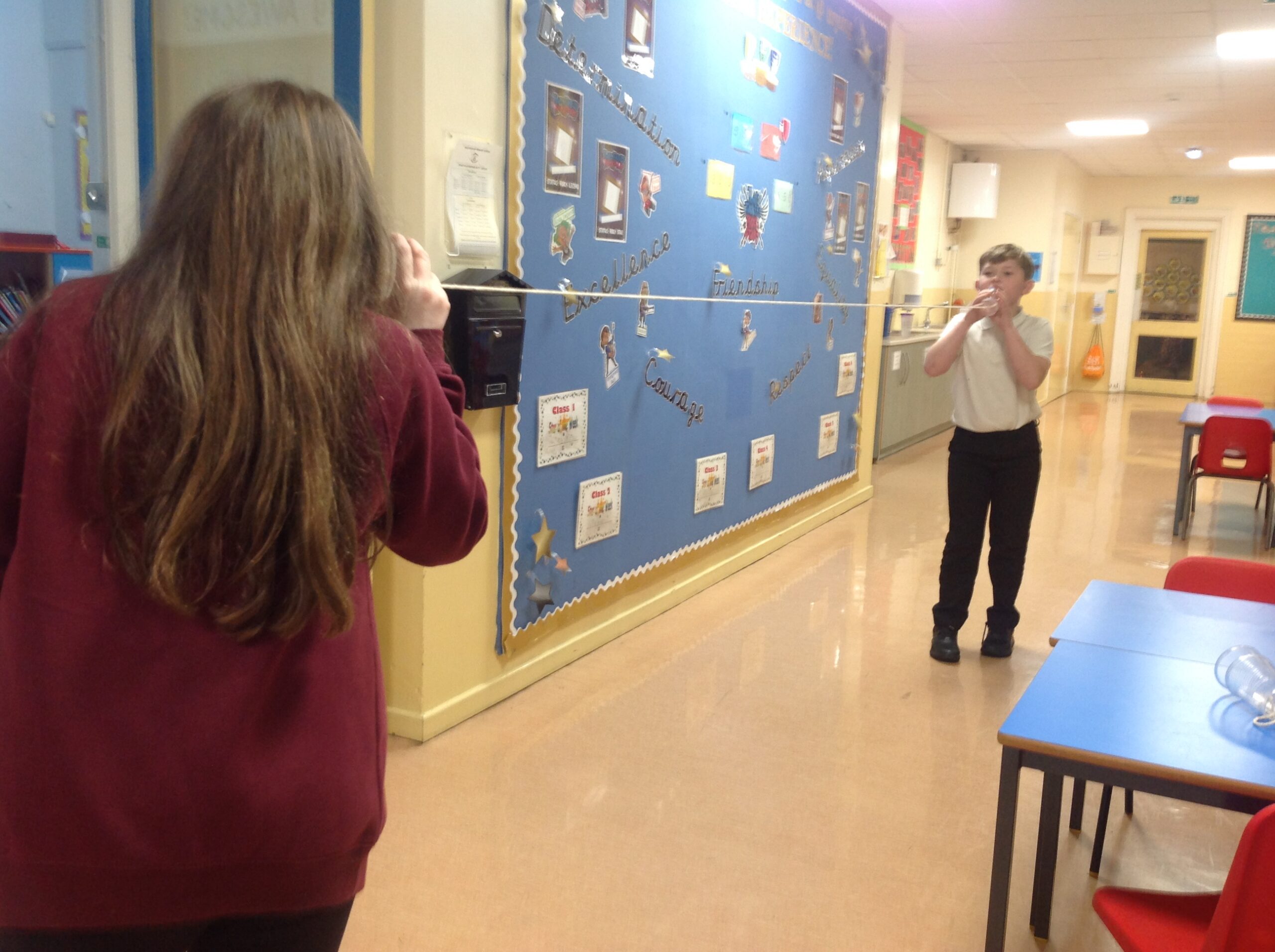 This term, Class 5 are studying ‘Sound’. This week we led an investigation into how the length of string affects how far sound can travel. We found it remarkable that we could hear each other so clearly through the string because the sound waves are travelling alone a solid. We also found that it was much clearer when the string was shorter because it has a shorter distance to travel! Thank you, Willow for taking some photos of us experimenting with them!