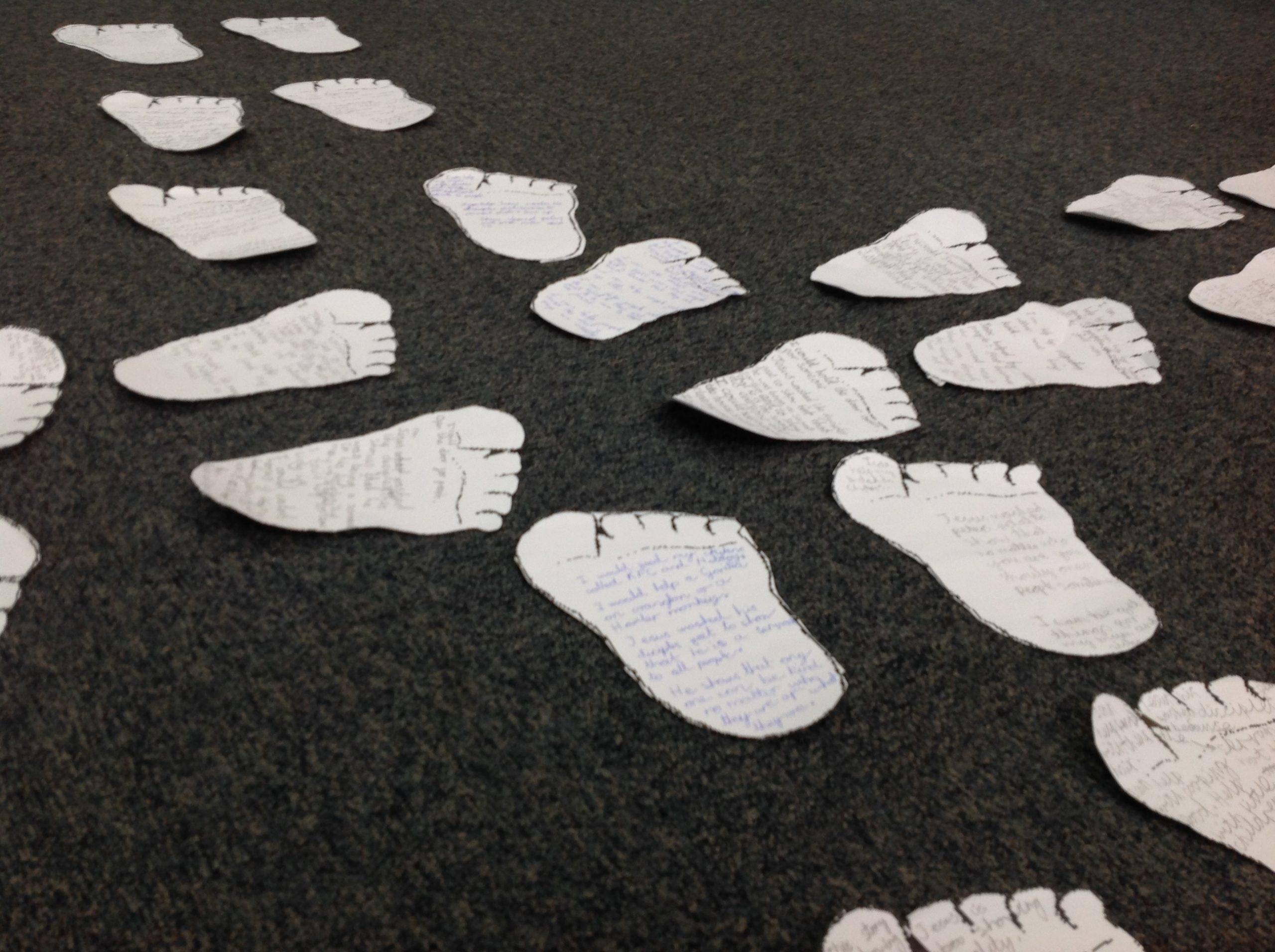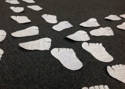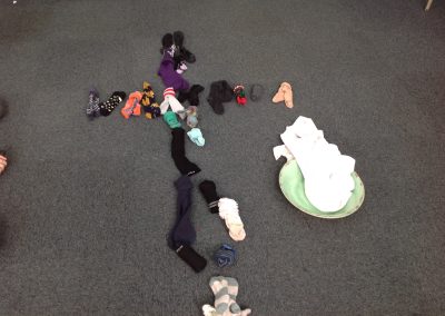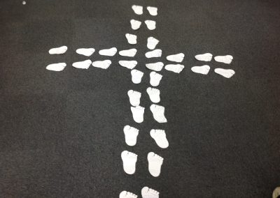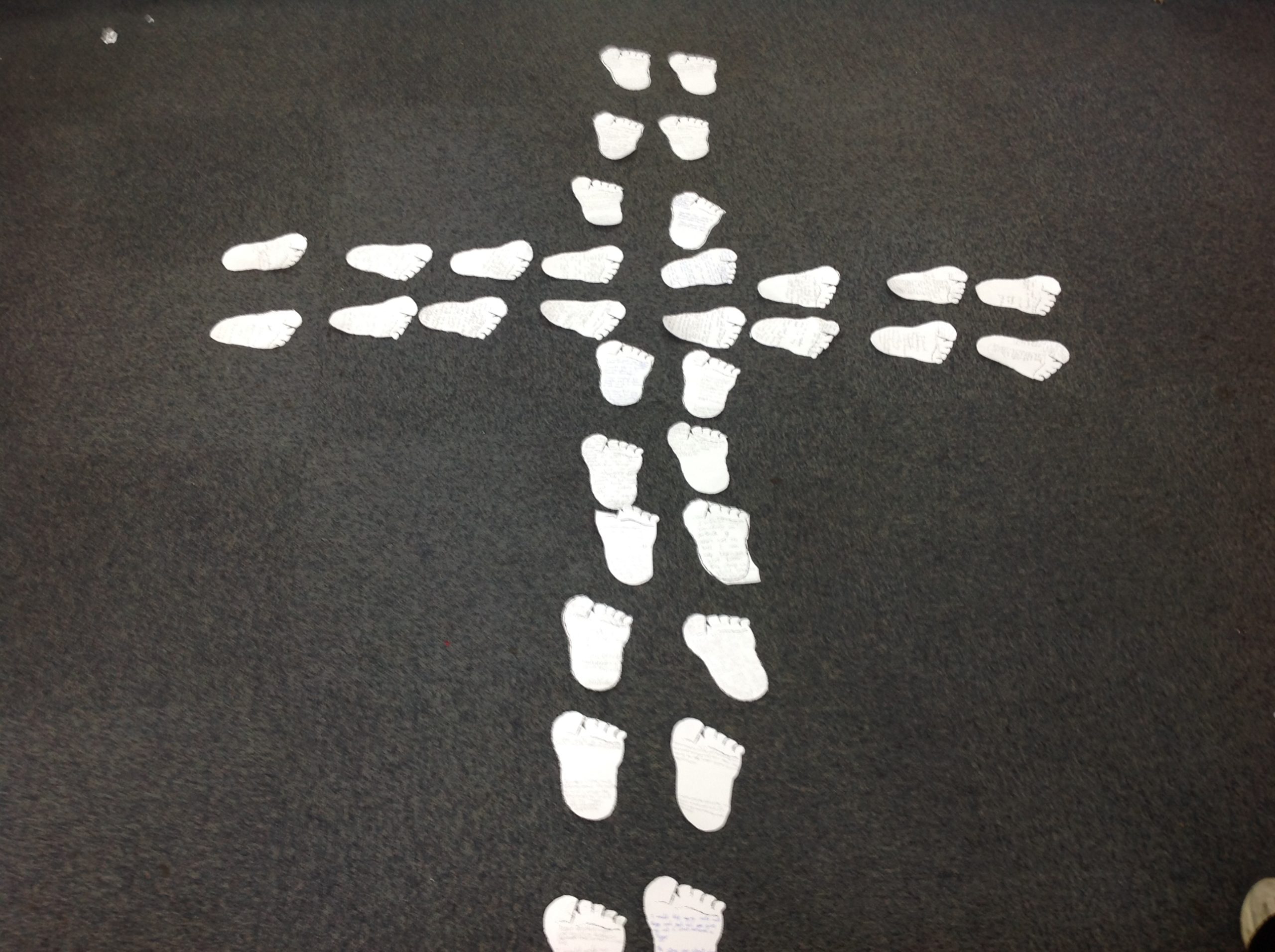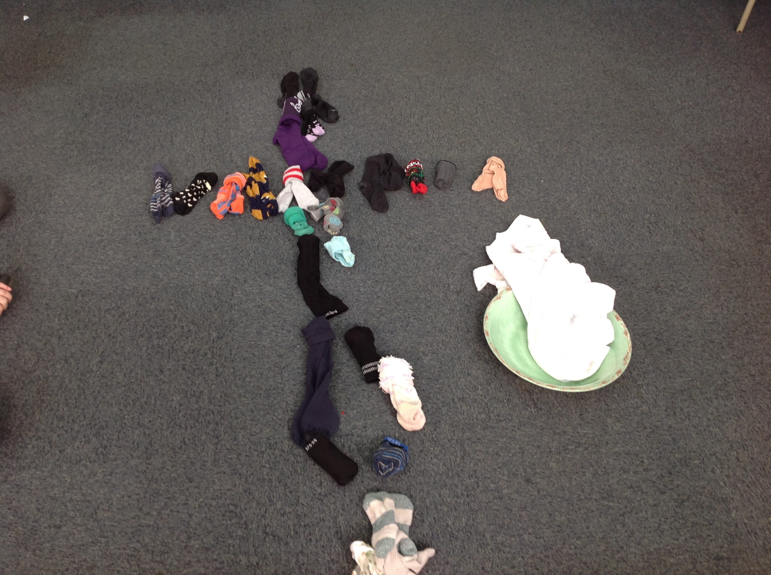 This week, Class 5 learnt about the story of the ‘Washing of the Feet’ as part of their Easter unit. The class were asked to bring in their own pair of socks to symbolise the feet that were washed by Jesus. We laid these in a cross shape on the floor and discussed the meaning of the story. We then wrote up our understanding of the parable on footprints.